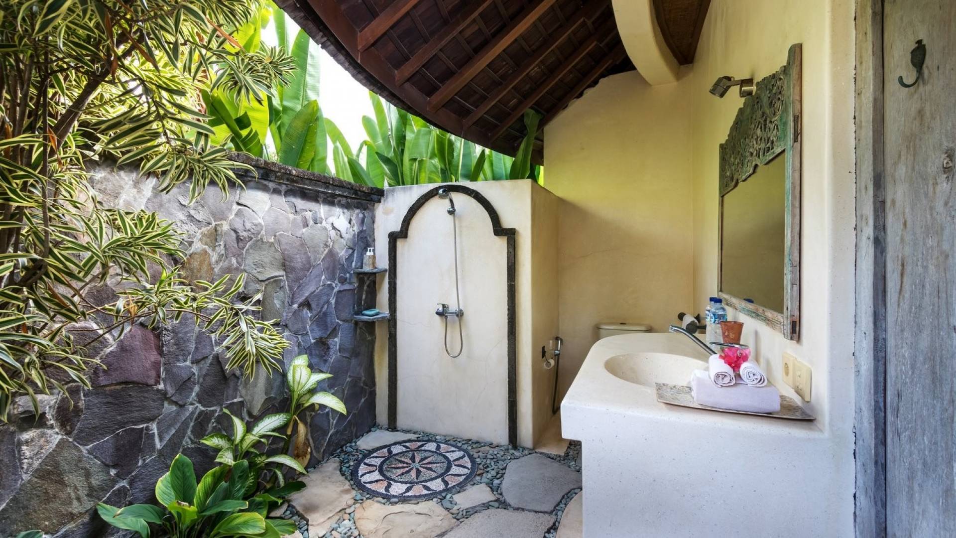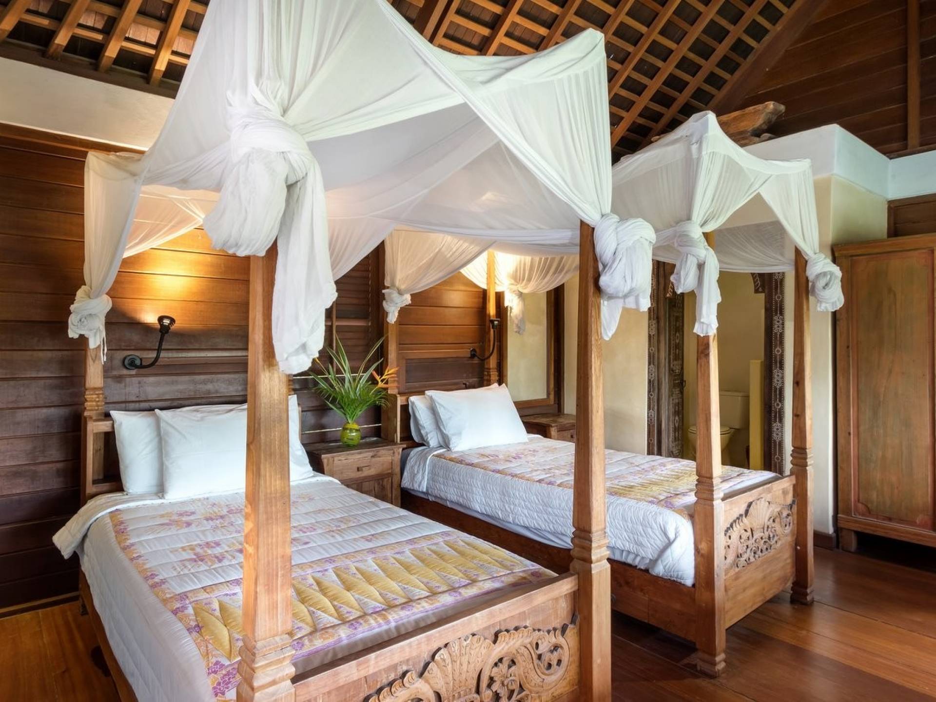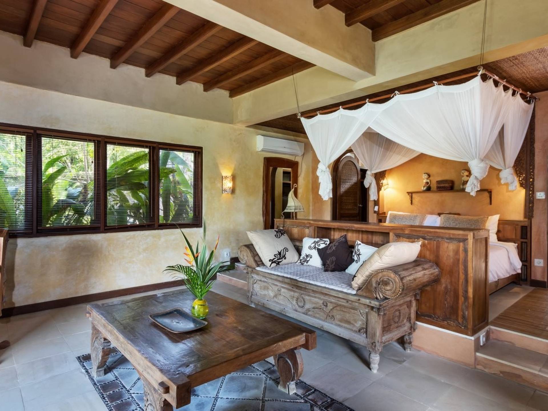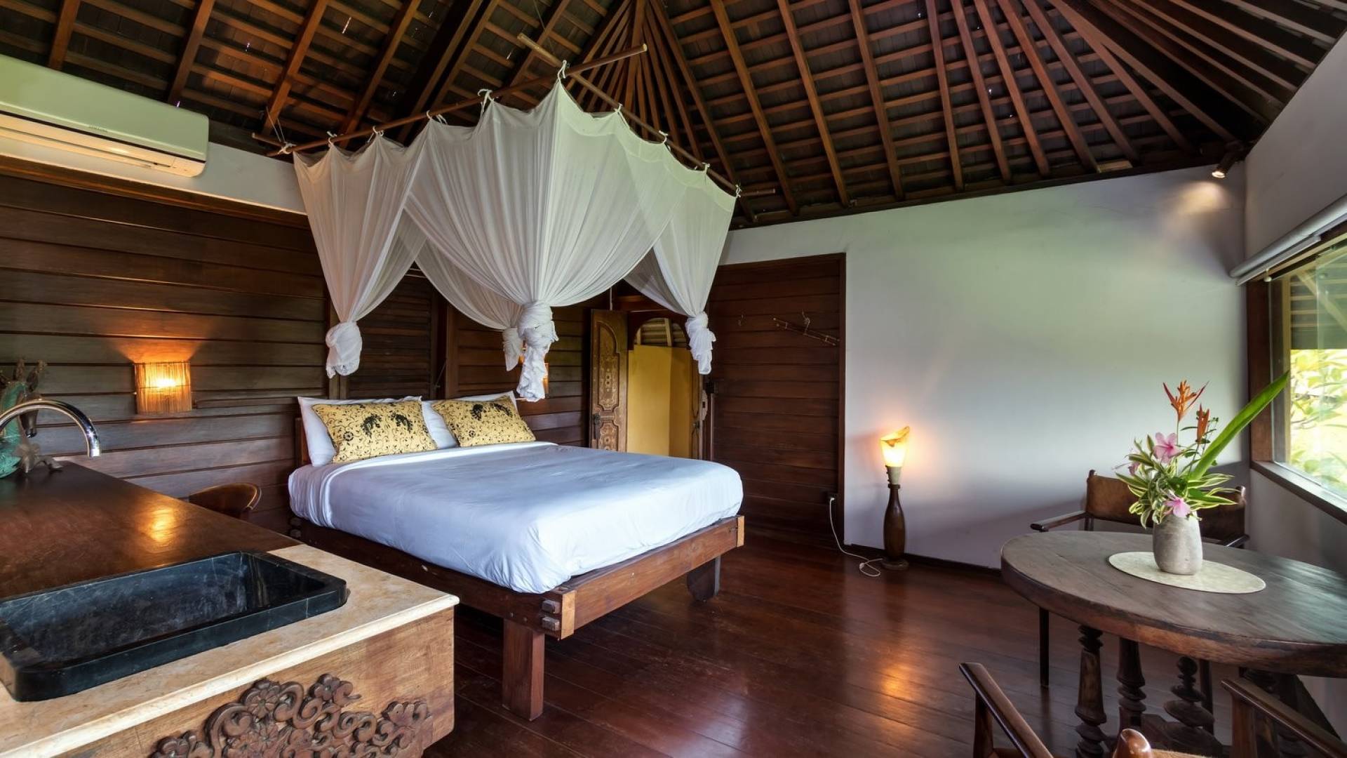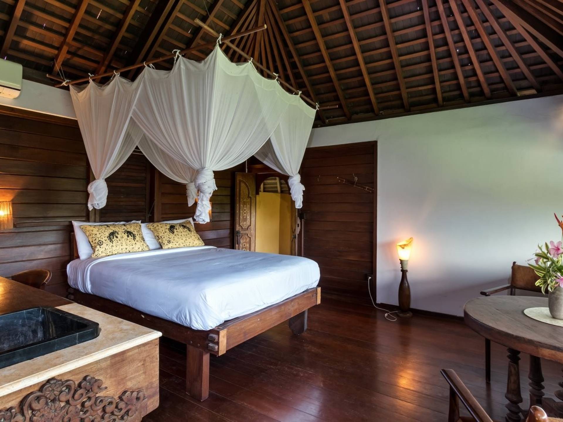 Villa Bungadesa bietet wunderschöne traditionelle indonesische Häuser, darunter ein javanisches Joglo und ein South Sulawesi Toraja House. Wunderschöne Teakholzmöbel und faszinierende traditionelle Kunstwerke verleihen dem Wohnzimmer einen rustikalen Charme und eine raffinierte Atmosphäre. Versteckt im Joglo-Pavillon mit seinem charakteristischen hohen Holzdach, ist das Design zum Garten hin offen und lässt frische Luft zirkulieren. Vorne steht ein Esstisch aus Teakholz für bis zu 10 Personen.