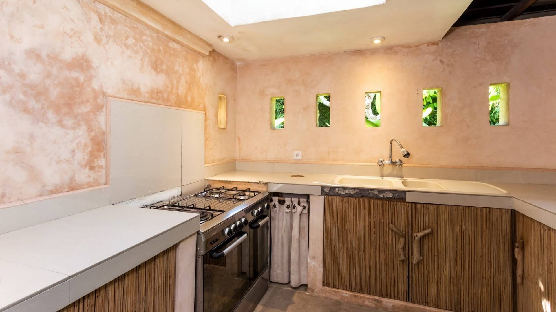 Weiter hinten befindet sich ein super bequemes L-förmiges Sofa, auf dem Sie es sich mit einem Buch gemütlich machen oder Filme auf dem großen Flachbild-Sat-TV mit DVD-Player ansehen können. An der Seite befindet sich eine überdachte offene Terrasse, die mit einem runden Tisch und 8 Stühlen ausgestattet ist, ideal zum Essen im Freien mit Köstlichkeiten vom BBQ-Grill. Der 1700 m2 große Garten ist atemberaubend schön und absolut tropisch, bepflanzt mit hoch aufragenden Palmen, duftenden Frangipani-Bäumen und üppigerem tropischem Grün.