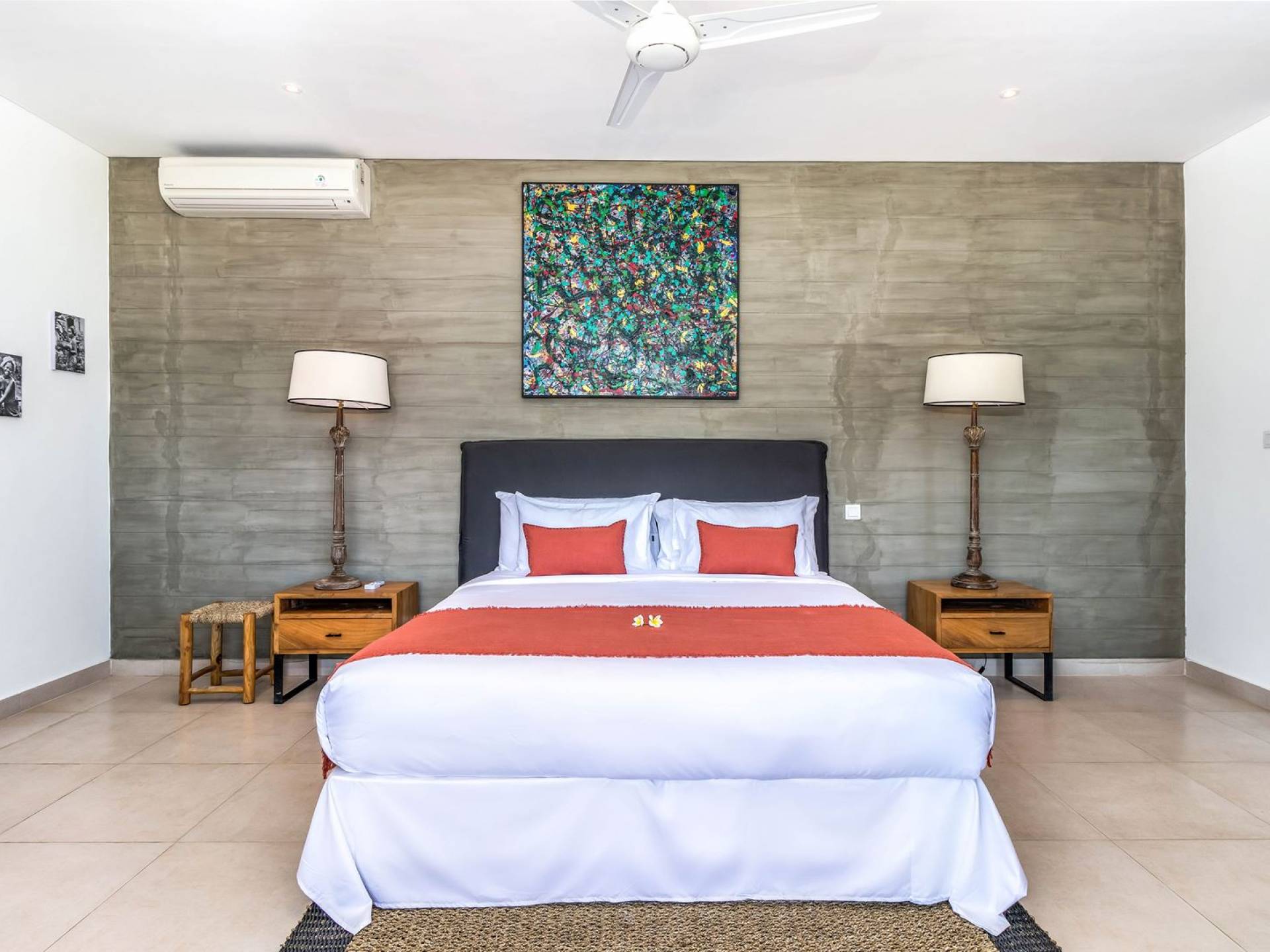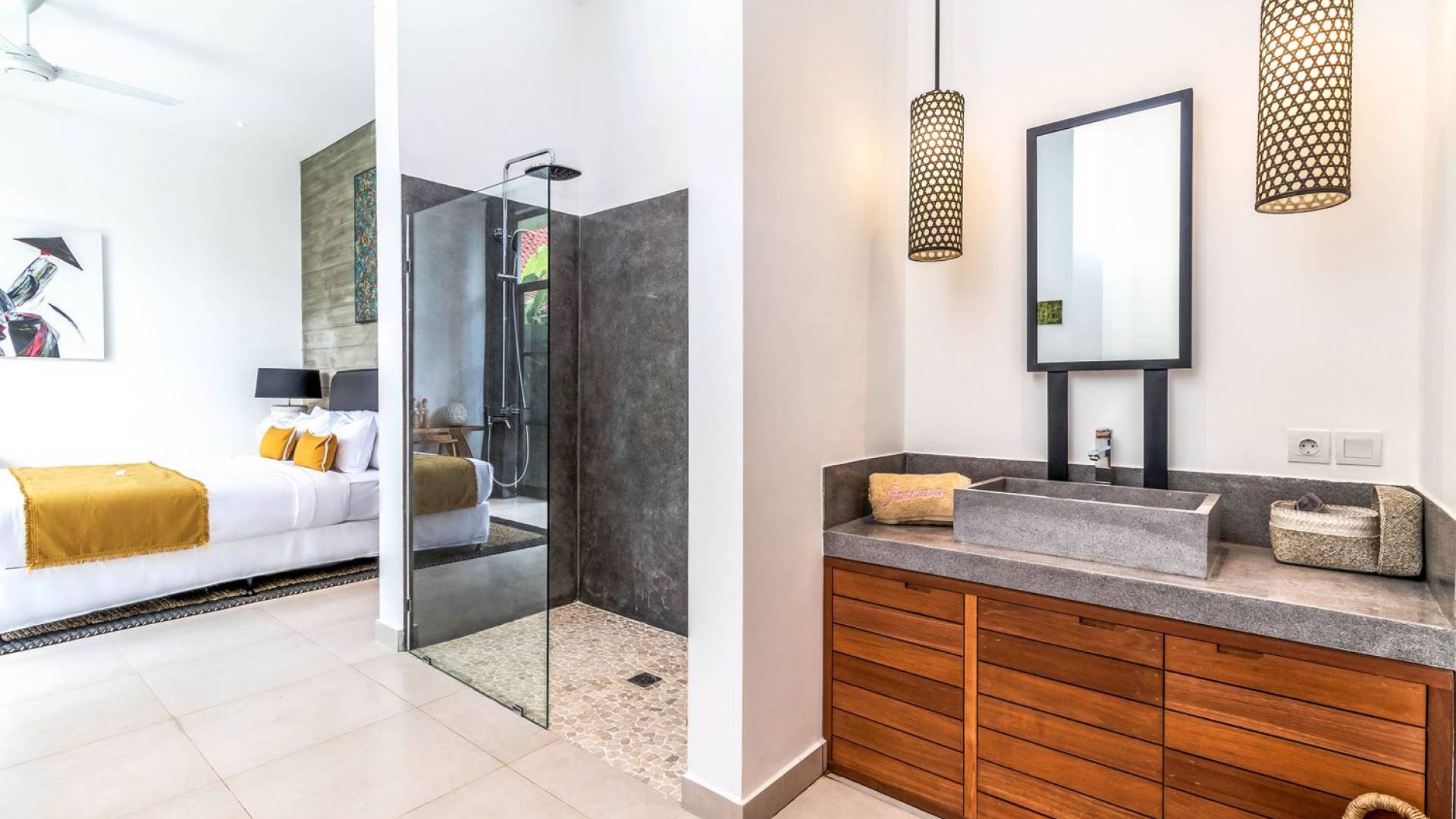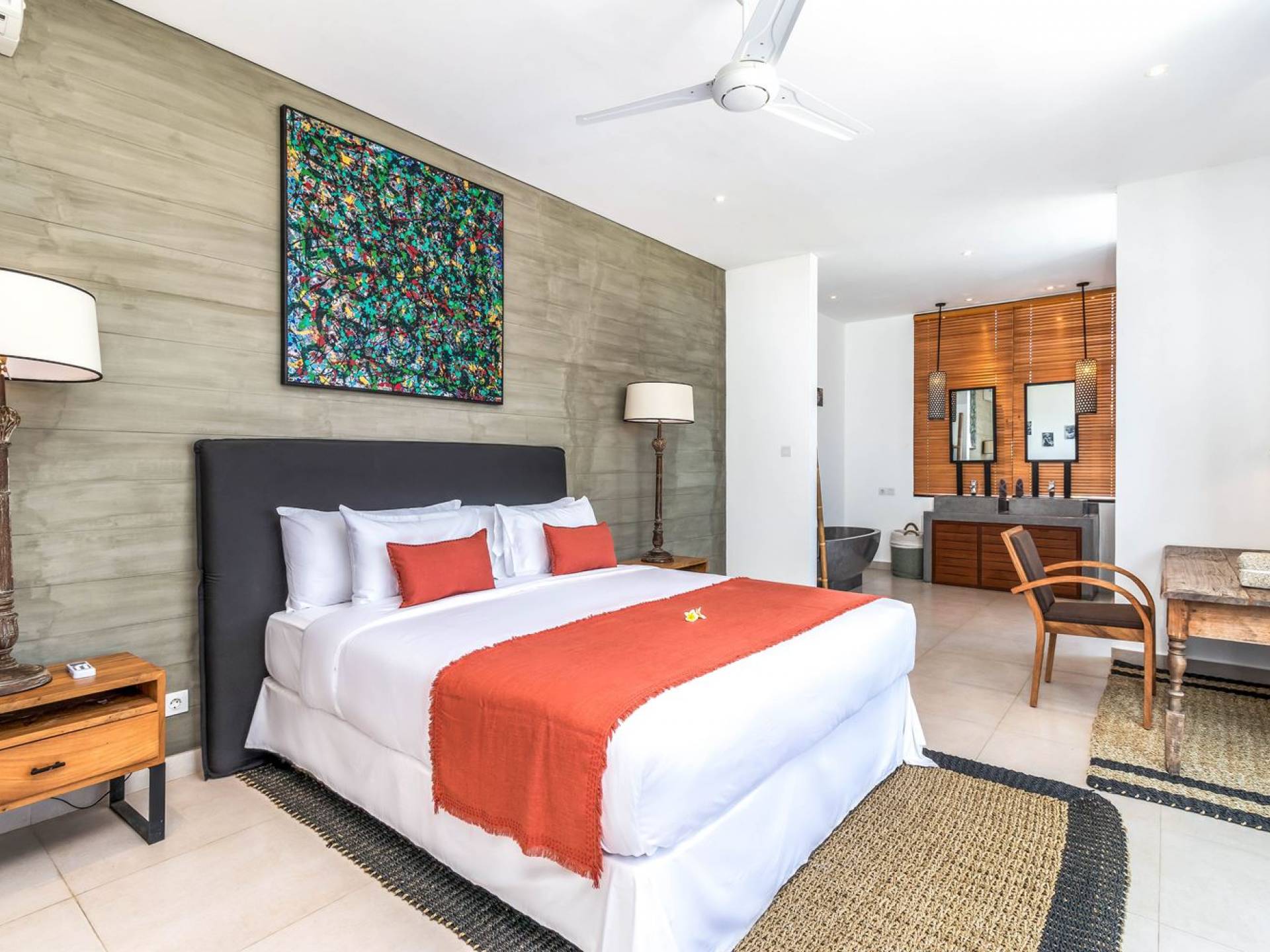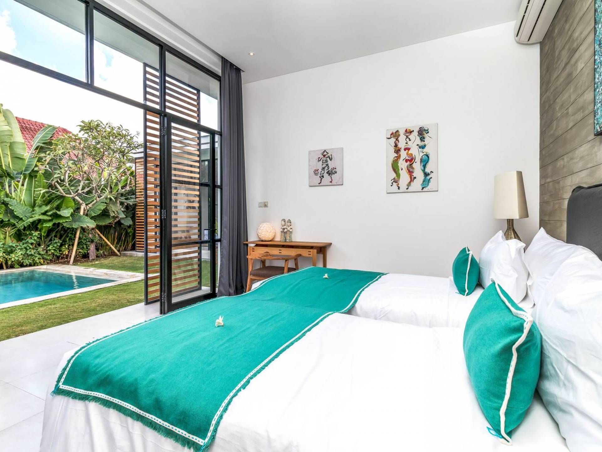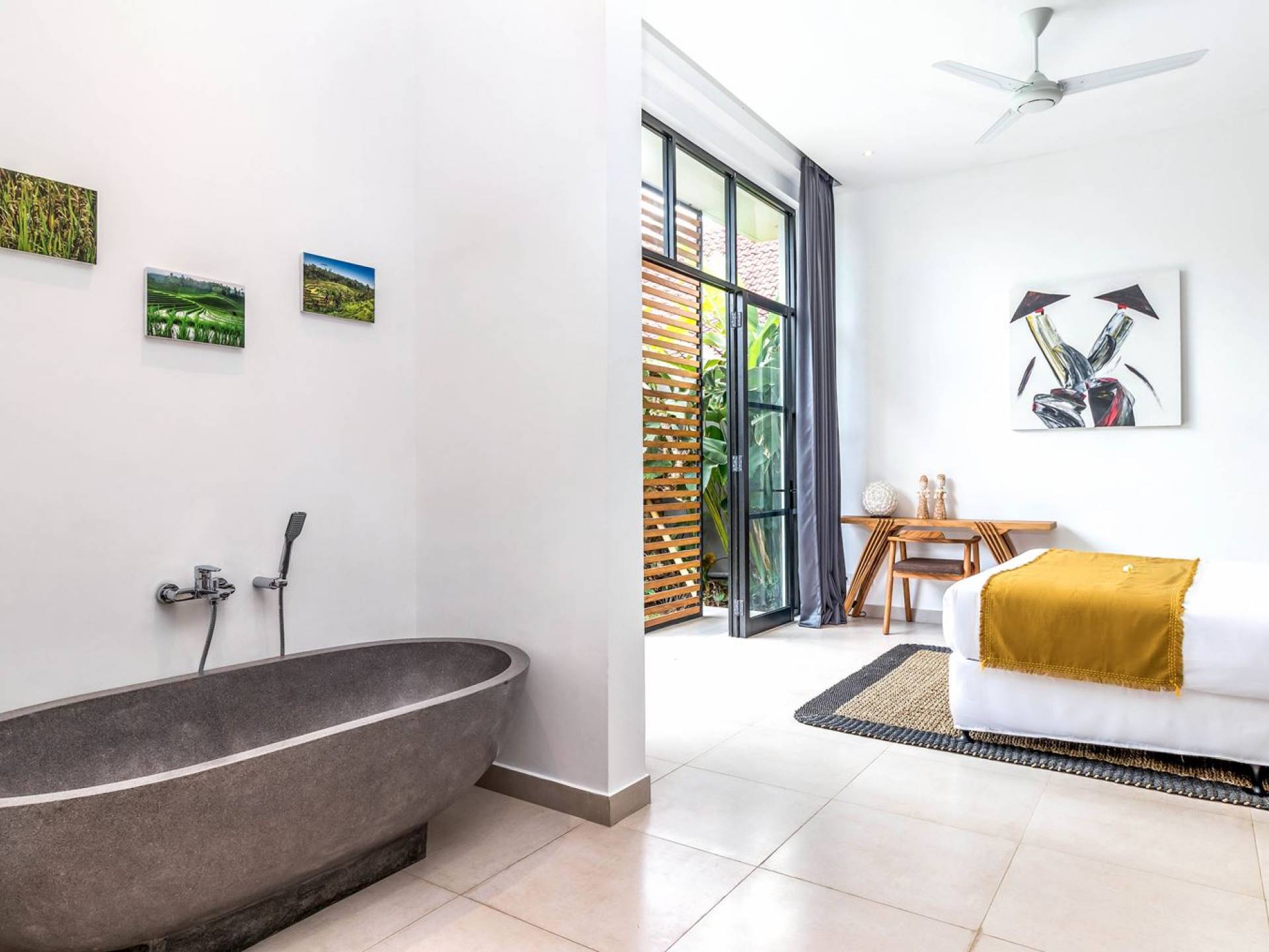 Villa Jaanuva Canggu ist eine Villa mit 3 Schlafzimmern, mit 1 Hauptsuite im ersten Stock (angrenzend an die Sonnenuntergangsterrasse) und 2 Schlafzimmern im Erdgeschoss, die sich öffnen zum Garten- und Poolbereich. Lust auf morgendliches Schwimmen, irgendjemand? Die Master-Suite ist sehr geräumig und mit einem Kingsize-Bett, einem Schreibtisch und Kleiderschränken mit Safe ausgestattet. Das eigene Badezimmer ist ebenfalls geräumig und verfügt über eine große Badewanne und eine entspannende Regendusche. Unten gibt es ein Schlafzimmer mit einem Kingsize-Bett und ein kleineres Schlafzimmer mit zwei Einzelbetten. Beide Zimmer sind klimatisiert und verfügen jeweils über ein eigenes Badezimmer, von dem eines über eine Badewanne verfügt. Alle Zimmer sind mit Safes zur Aufbewahrung wertvoller Gegenstände ausgestattet. Gäste, die in den Zimmern im Erdgeschoss wohnen, können morgens als erstes aufwachen und fast direkt in den Pool springen – alles, was man tun muss, ist, diese Glastüren zu öffnen. Darum geht es doch im Urlaub, nicht wahr?