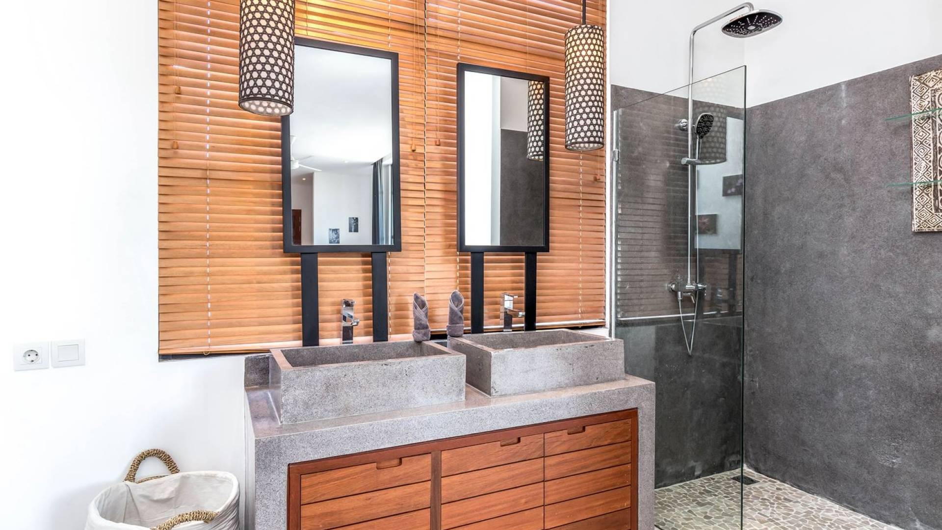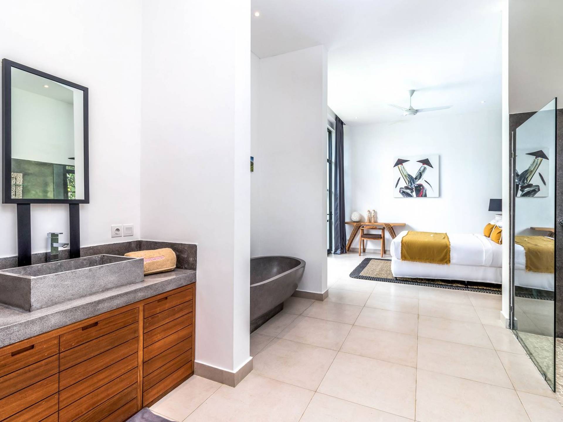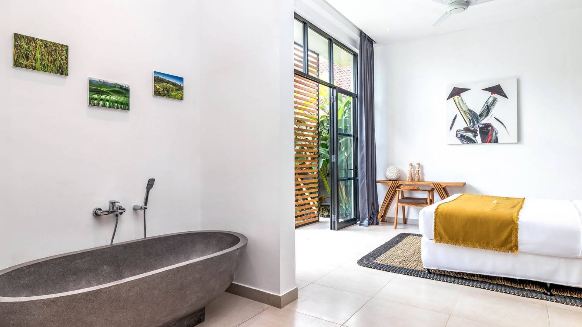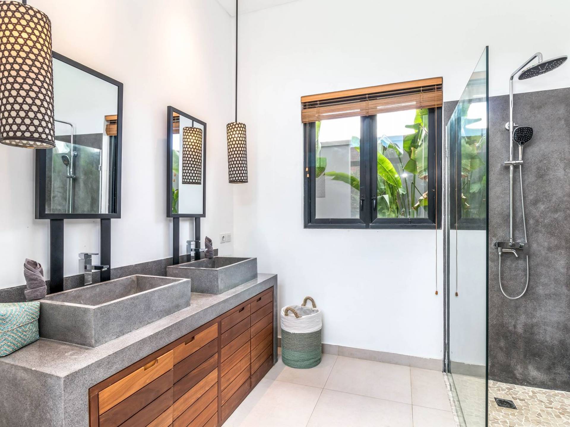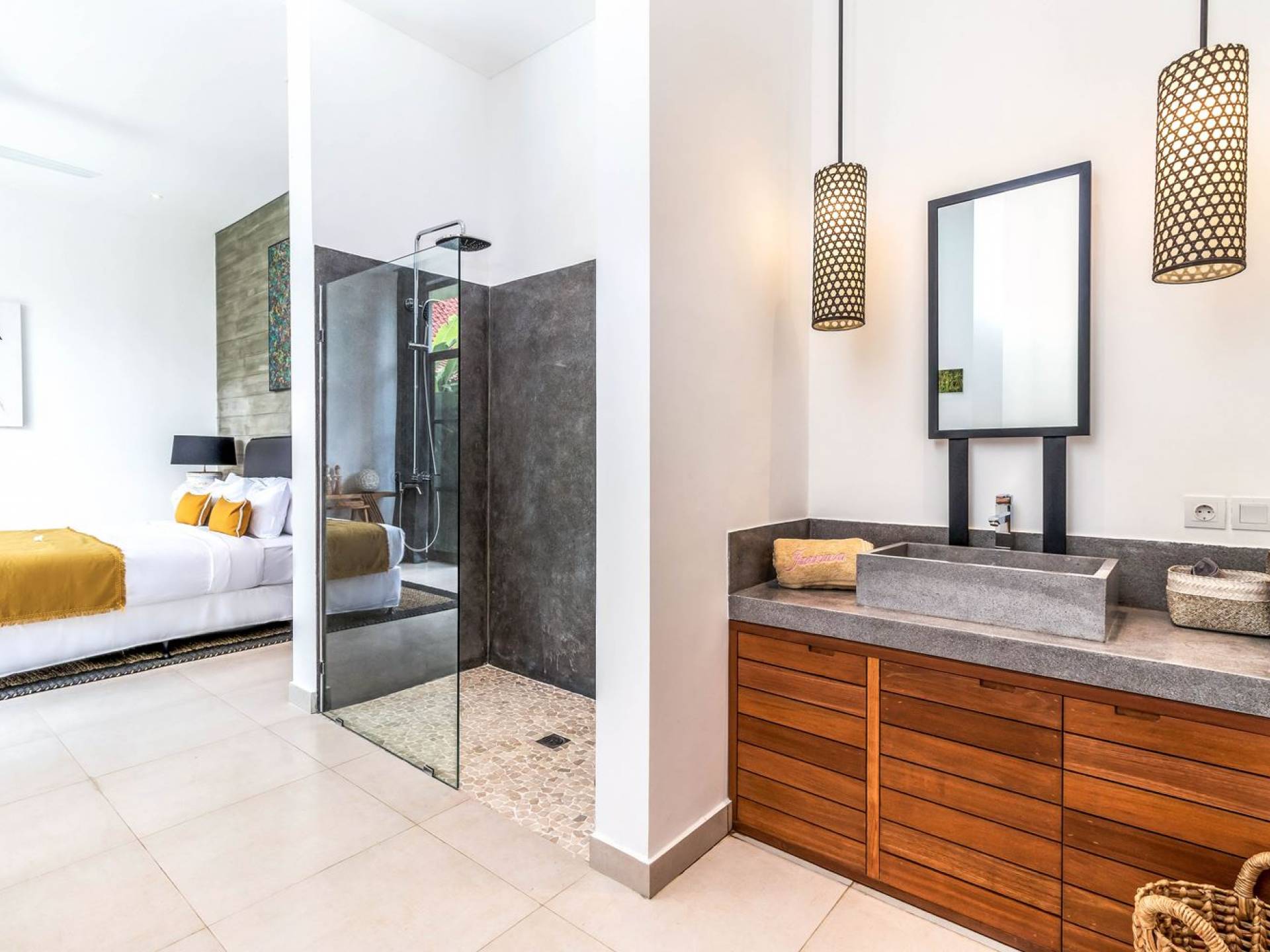 Villa Jaanuva Canggu ist eine Villa mit 3 Schlafzimmern, mit 1 Hauptsuite im ersten Stock (angrenzend an die Sonnenuntergangsterrasse) und 2 Schlafzimmern im Erdgeschoss, die sich öffnen zum Garten- und Poolbereich. Lust auf morgendliches Schwimmen, irgendjemand? Die Master-Suite ist sehr geräumig und mit einem Kingsize-Bett, einem Schreibtisch und Kleiderschränken mit Safe ausgestattet. Das eigene Badezimmer ist ebenfalls geräumig und verfügt über eine große Badewanne und eine entspannende Regendusche. Unten gibt es ein Schlafzimmer mit einem Kingsize-Bett und ein kleineres Schlafzimmer mit zwei Einzelbetten. Beide Zimmer sind klimatisiert und verfügen jeweils über ein eigenes Badezimmer, von dem eines über eine Badewanne verfügt. Alle Zimmer sind mit Safes zur Aufbewahrung wertvoller Gegenstände ausgestattet. Gäste, die in den Zimmern im Erdgeschoss wohnen, können morgens als erstes aufwachen und fast direkt in den Pool springen – alles, was man tun muss, ist, diese Glastüren zu öffnen. Darum geht es doch im Urlaub, nicht wahr?