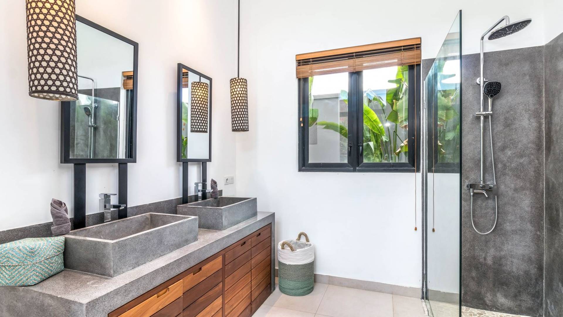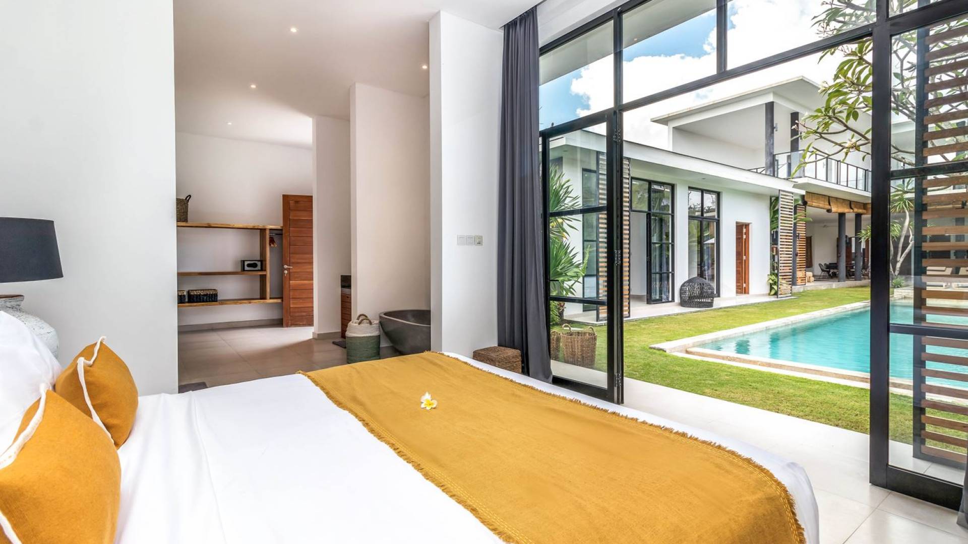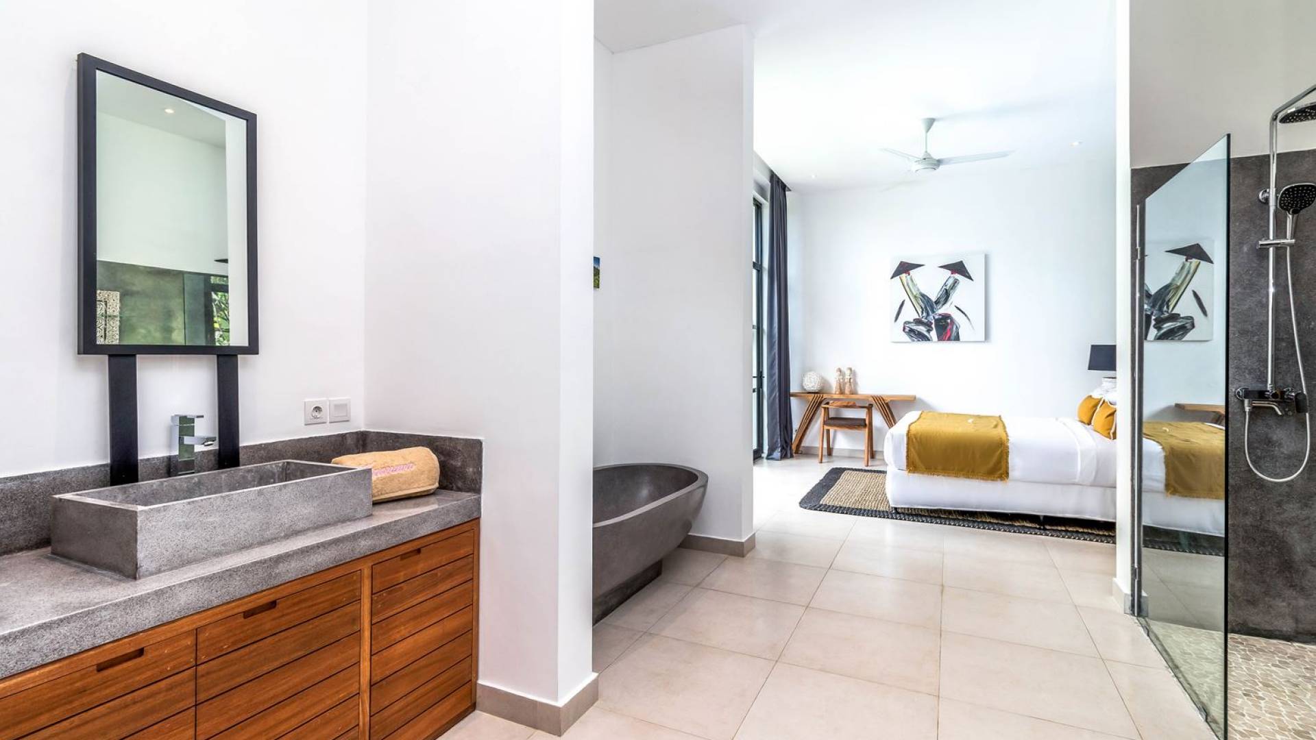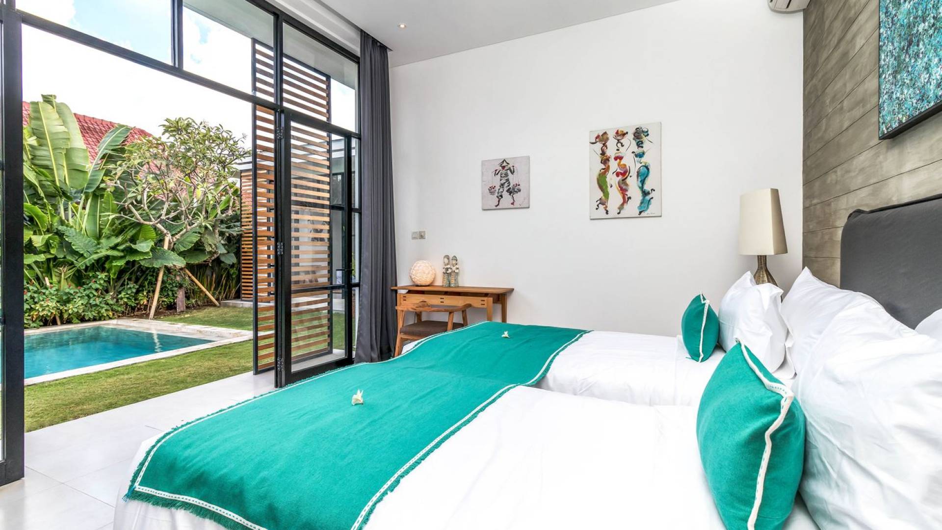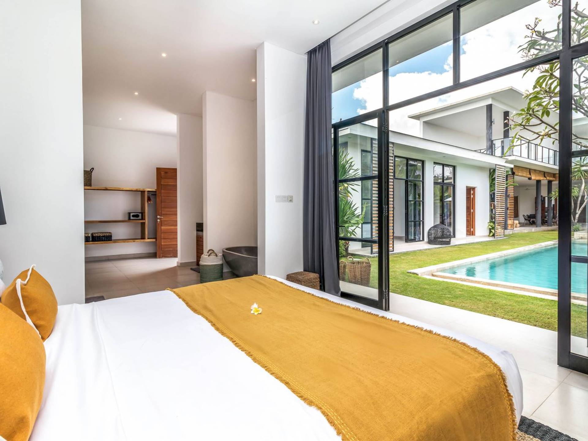 Villa Jaanuva Canggu ist eine Villa mit 3 Schlafzimmern, mit 1 Hauptsuite im ersten Stock (angrenzend an die Sonnenuntergangsterrasse) und 2 Schlafzimmern im Erdgeschoss, die sich öffnen zum Garten- und Poolbereich. Lust auf morgendliches Schwimmen, irgendjemand? Die Master-Suite ist sehr geräumig und mit einem Kingsize-Bett, einem Schreibtisch und Kleiderschränken mit Safe ausgestattet. Das eigene Badezimmer ist ebenfalls geräumig und verfügt über eine große Badewanne und eine entspannende Regendusche. Unten gibt es ein Schlafzimmer mit einem Kingsize-Bett und ein kleineres Schlafzimmer mit zwei Einzelbetten. Beide Zimmer sind klimatisiert und verfügen jeweils über ein eigenes Badezimmer, von dem eines über eine Badewanne verfügt. Alle Zimmer sind mit Safes zur Aufbewahrung wertvoller Gegenstände ausgestattet. Gäste, die in den Zimmern im Erdgeschoss wohnen, können morgens als erstes aufwachen und fast direkt in den Pool springen – alles, was man tun muss, ist, diese Glastüren zu öffnen. Darum geht es doch im Urlaub, nicht wahr?