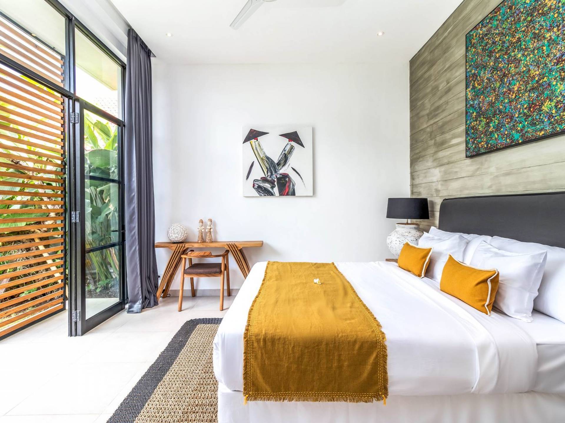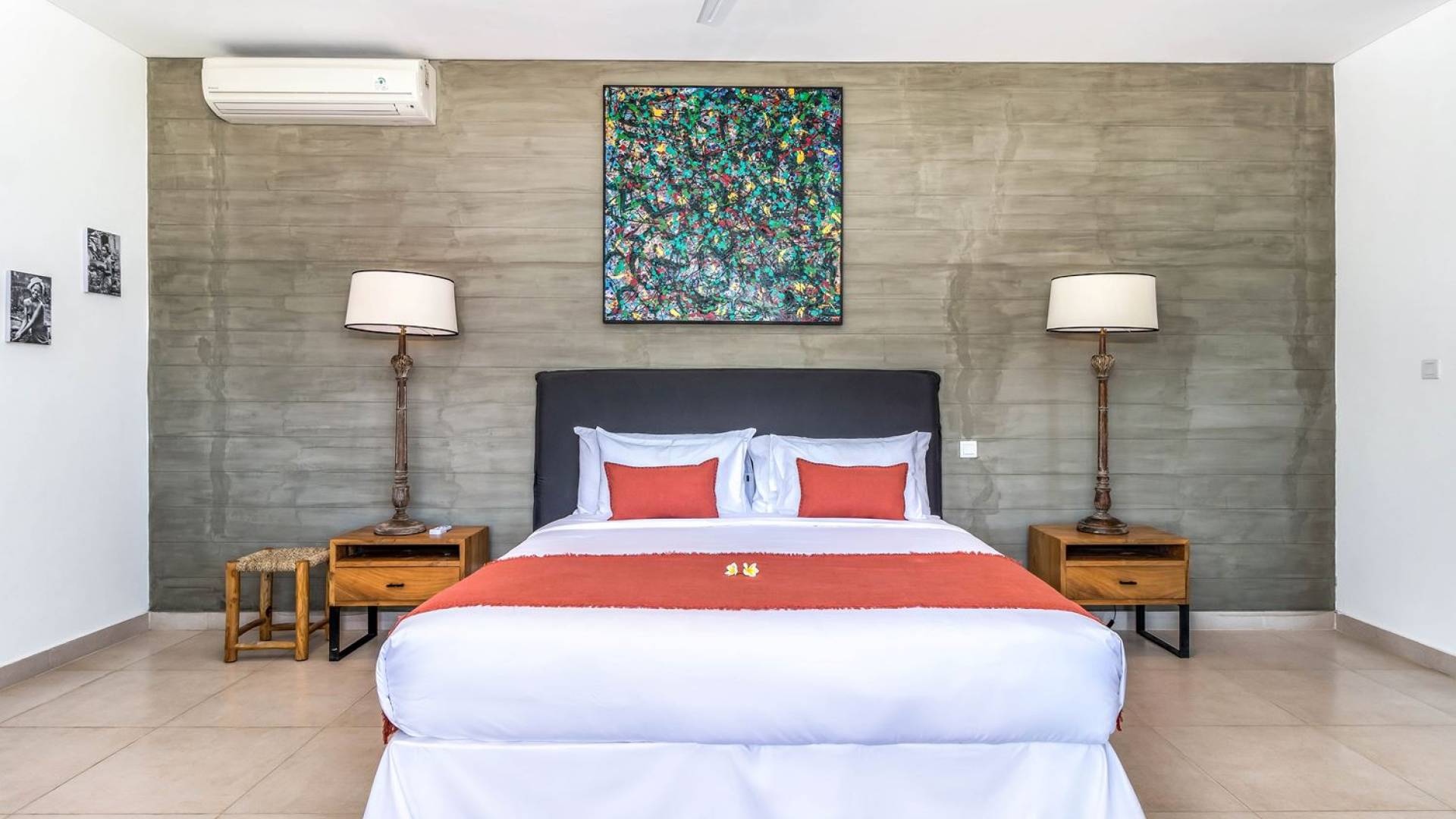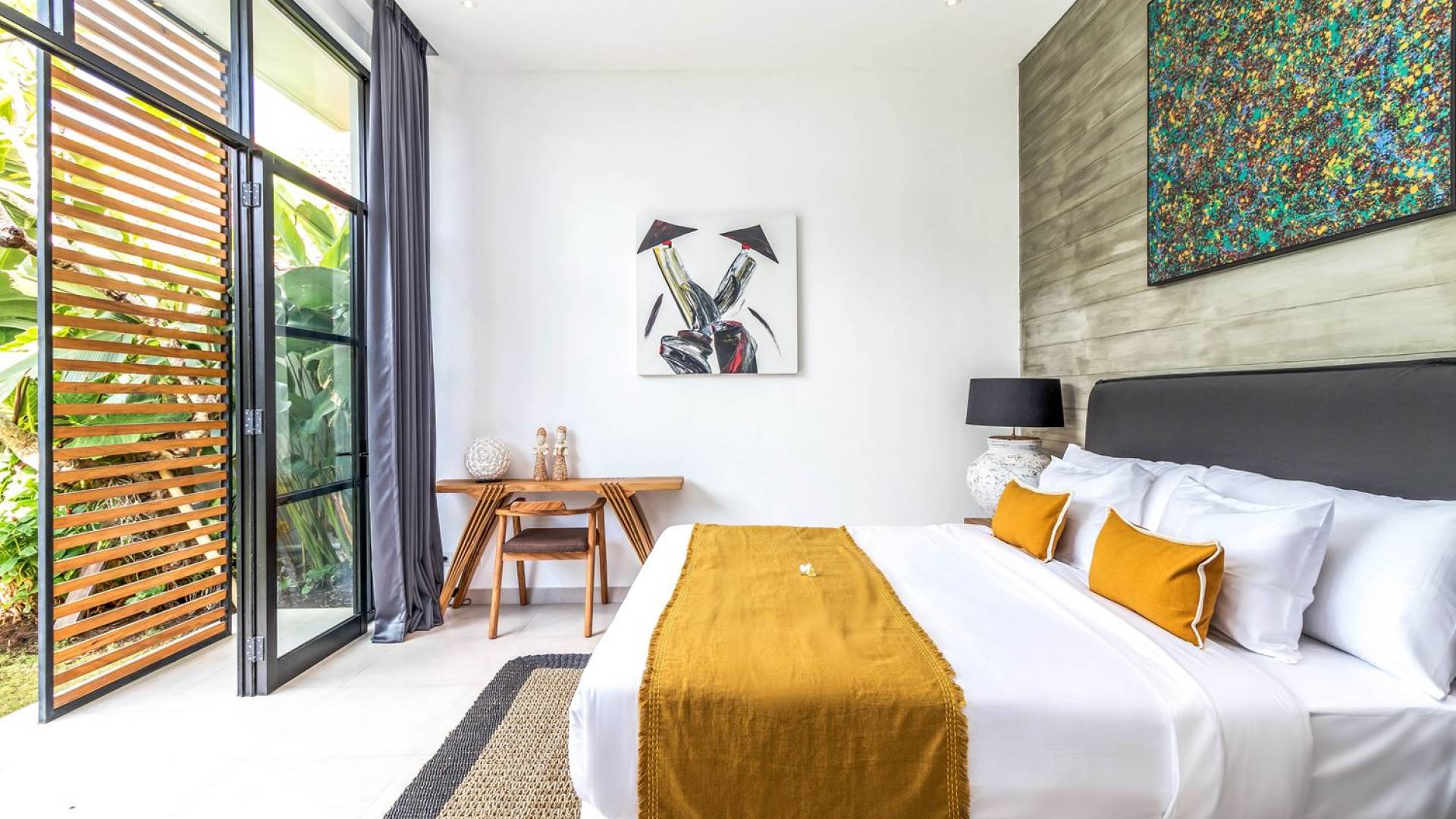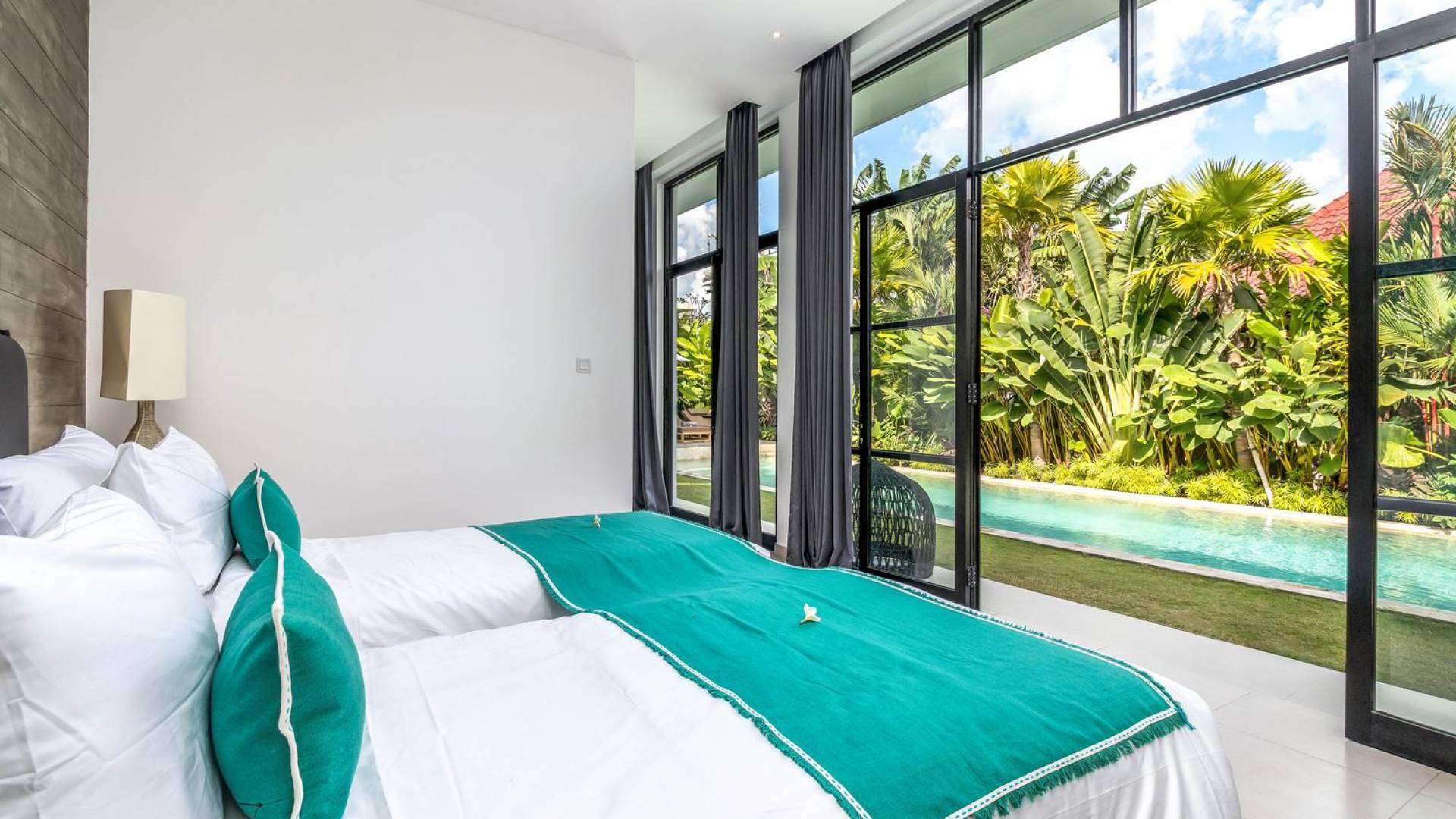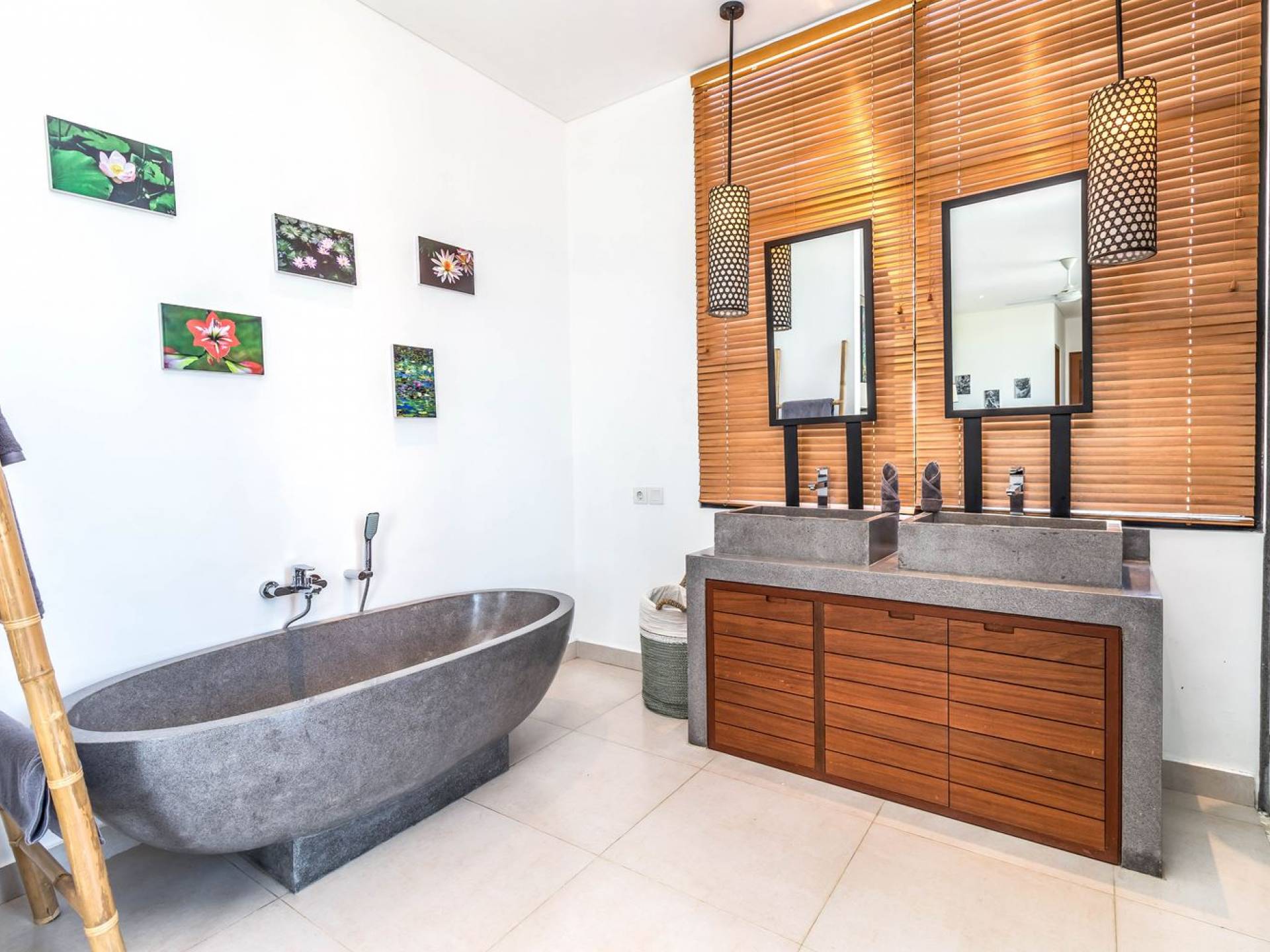 Villa Jaanuva Canggu ist eine Villa mit 3 Schlafzimmern, mit 1 Hauptsuite im ersten Stock (angrenzend an die Sonnenuntergangsterrasse) und 2 Schlafzimmern im Erdgeschoss, die sich öffnen zum Garten- und Poolbereich. Lust auf morgendliches Schwimmen, irgendjemand? Die Master-Suite ist sehr geräumig und mit einem Kingsize-Bett, einem Schreibtisch und Kleiderschränken mit Safe ausgestattet. Das eigene Badezimmer ist ebenfalls geräumig und verfügt über eine große Badewanne und eine entspannende Regendusche. Unten gibt es ein Schlafzimmer mit einem Kingsize-Bett und ein kleineres Schlafzimmer mit zwei Einzelbetten. Beide Zimmer sind klimatisiert und verfügen jeweils über ein eigenes Badezimmer, von dem eines über eine Badewanne verfügt. Alle Zimmer sind mit Safes zur Aufbewahrung wertvoller Gegenstände ausgestattet. Gäste, die in den Zimmern im Erdgeschoss wohnen, können morgens als erstes aufwachen und fast direkt in den Pool springen – alles, was man tun muss, ist, diese Glastüren zu öffnen. Darum geht es doch im Urlaub, nicht wahr?
