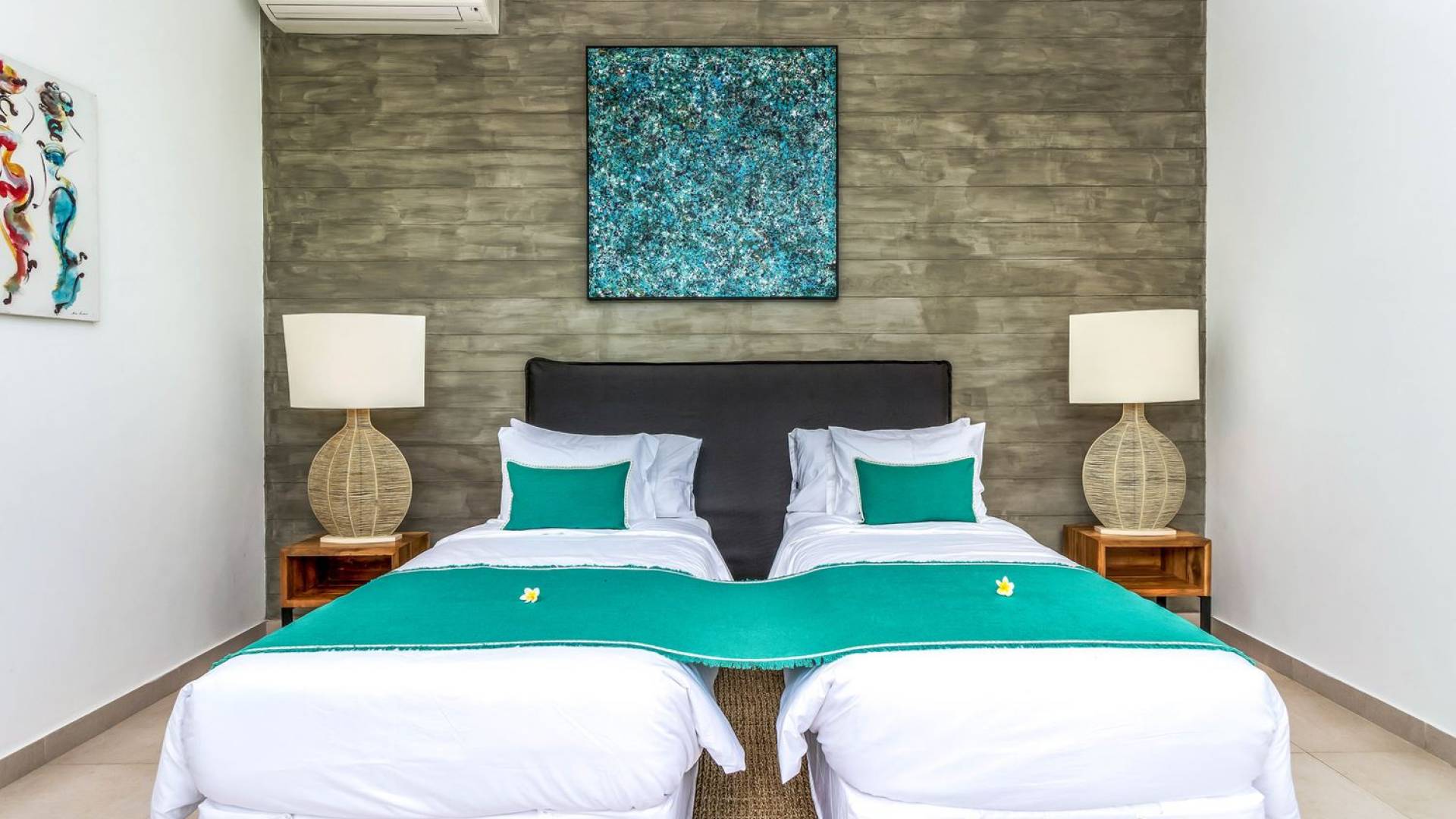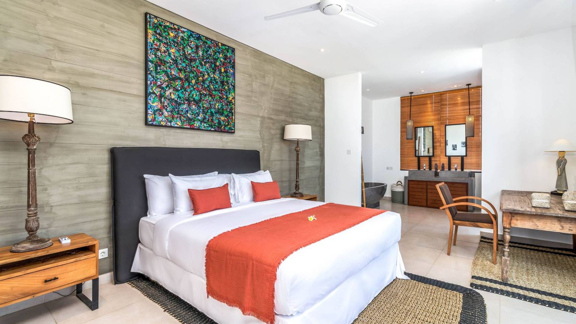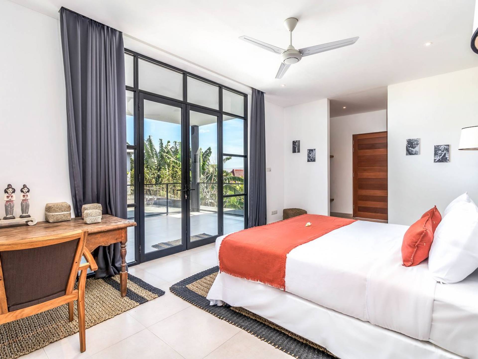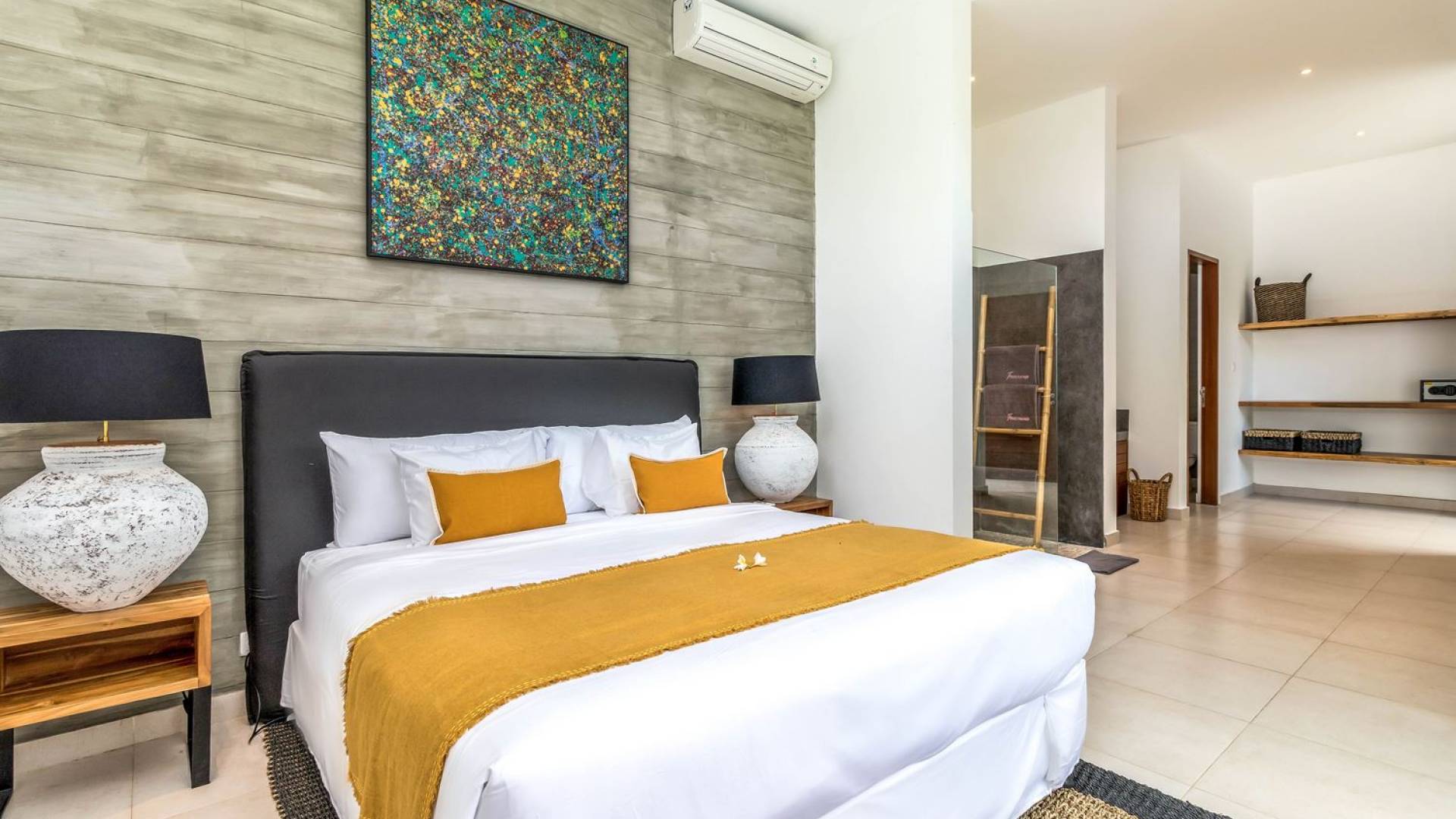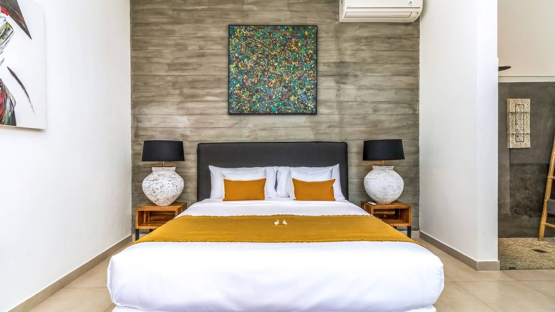 Villa Jaanuva Canggu ist eine Villa mit 3 Schlafzimmern, mit 1 Hauptsuite im ersten Stock (angrenzend an die Sonnenuntergangsterrasse) und 2 Schlafzimmern im Erdgeschoss, die sich öffnen zum Garten- und Poolbereich. Lust auf morgendliches Schwimmen, irgendjemand? Die Master-Suite ist sehr geräumig und mit einem Kingsize-Bett, einem Schreibtisch und Kleiderschränken mit Safe ausgestattet. Das eigene Badezimmer ist ebenfalls geräumig und verfügt über eine große Badewanne und eine entspannende Regendusche. Unten gibt es ein Schlafzimmer mit einem Kingsize-Bett und ein kleineres Schlafzimmer mit zwei Einzelbetten. Beide Zimmer sind klimatisiert und verfügen jeweils über ein eigenes Badezimmer, von dem eines über eine Badewanne verfügt. Alle Zimmer sind mit Safes zur Aufbewahrung wertvoller Gegenstände ausgestattet. Gäste, die in den Zimmern im Erdgeschoss wohnen, können morgens als erstes aufwachen und fast direkt in den Pool springen – alles, was man tun muss, ist, diese Glastüren zu öffnen. Darum geht es doch im Urlaub, nicht wahr?