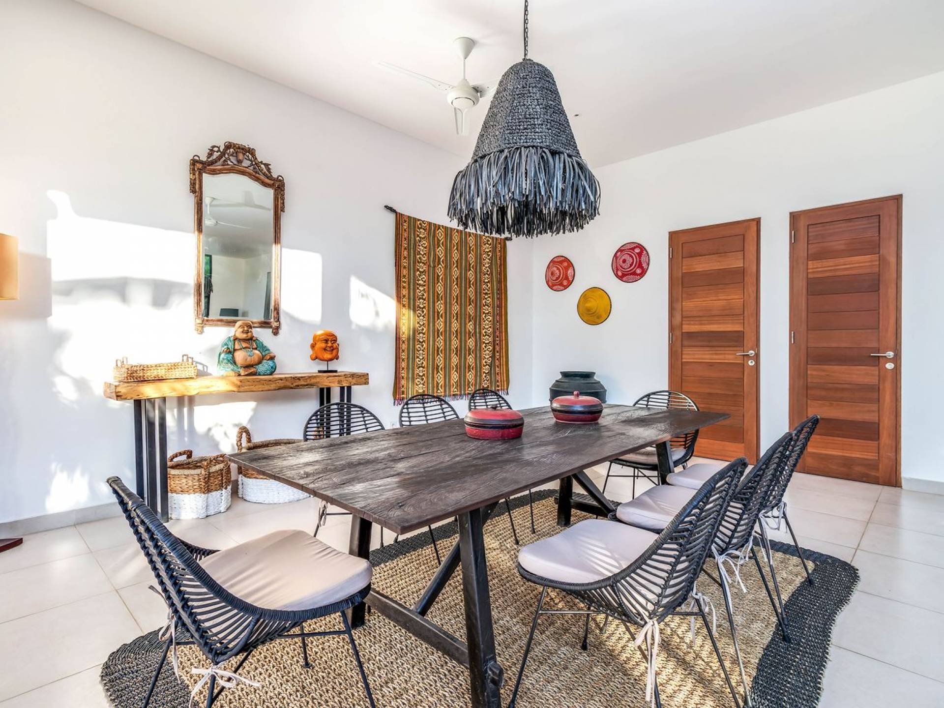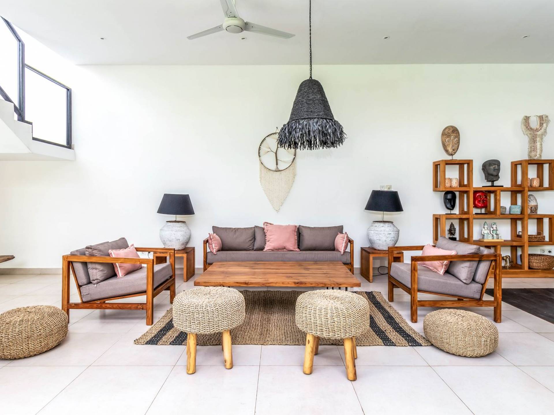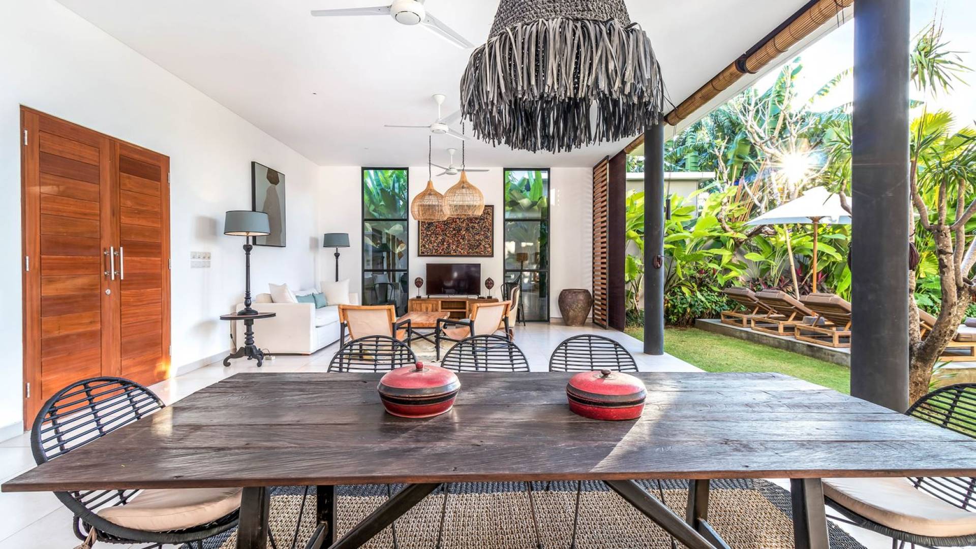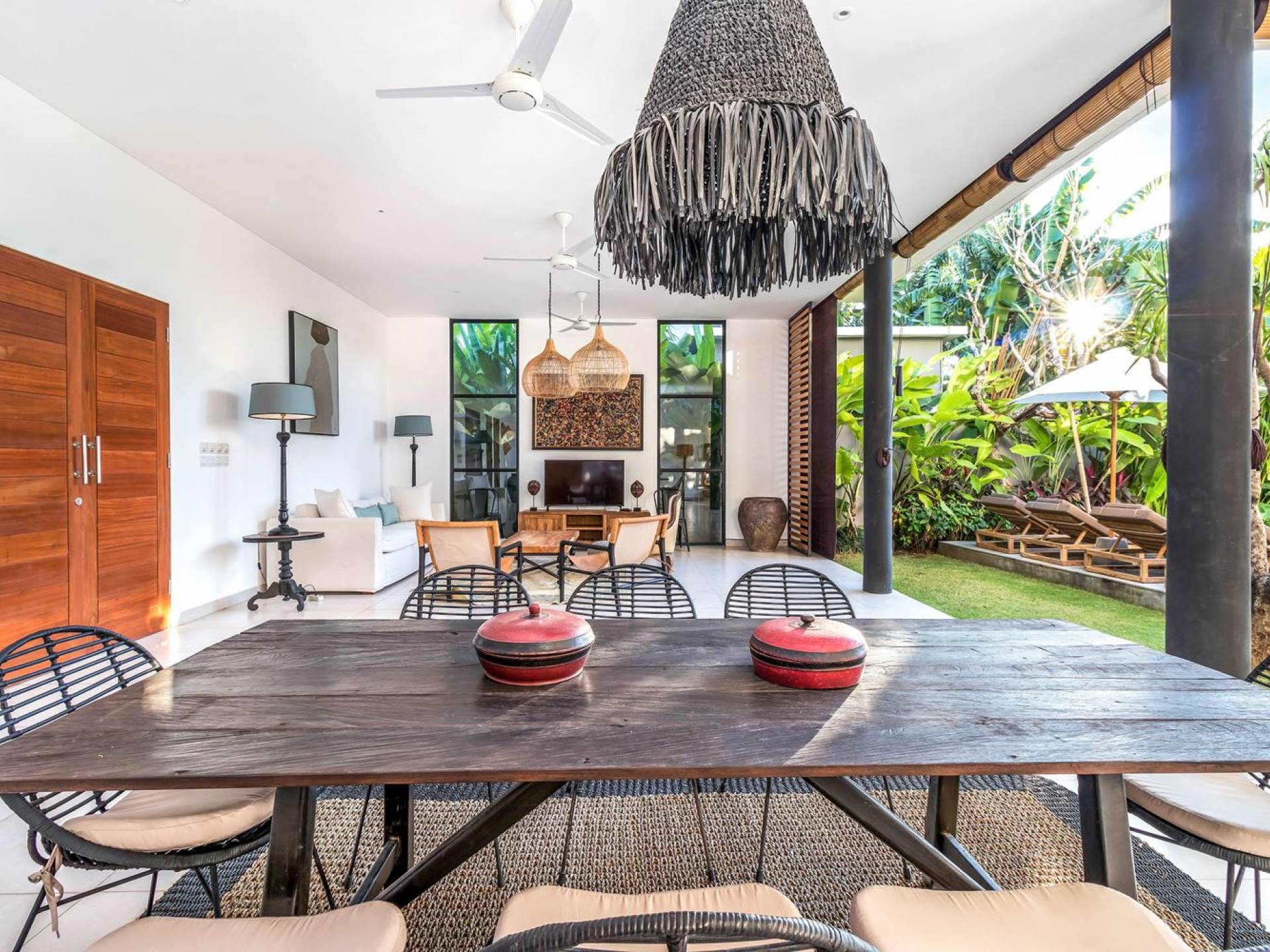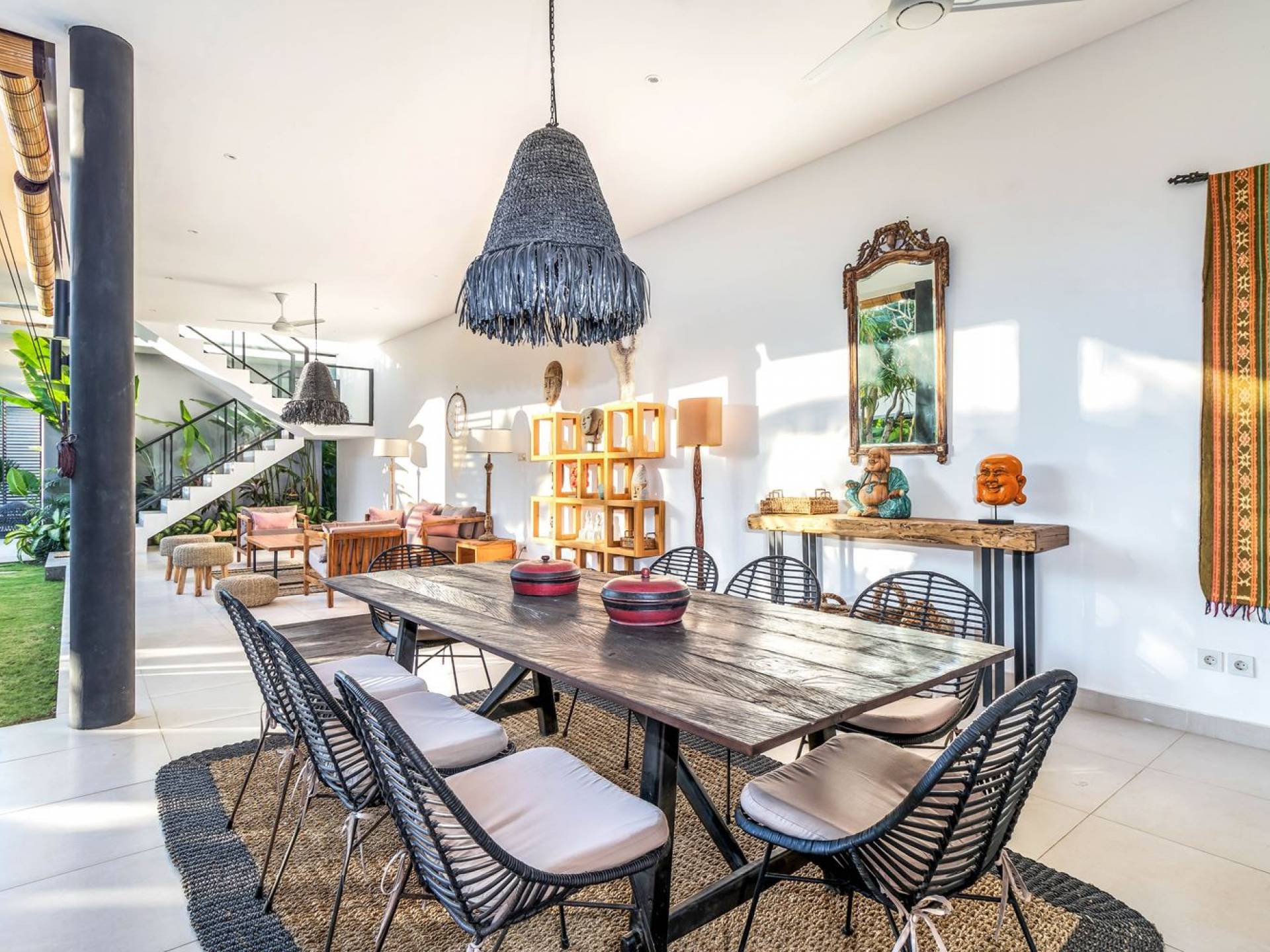 Das Design ist offen und bietet die schönsten Ausblicke auf den Garten. Rattanteppiche, traditionelle Artefakte und wunderschöne Textilien – Sie wissen, dass Sie sich an einem exotischen und sonnigen tropischen Ort befinden, okay! Es gibt 2 Sitzbereiche, einer ist perfekt für einen Drink mit Freunden und der Familie, während Sie den Kindern dabei zusehen, wie sie sich im Pool vergnügen. Das andere ist für gemütliche Abende in der Villa gedacht und schaut sich Filme auf dem Flachbildfernseher an. In der Mitte dieser beiden Loungebereiche steht der hübsche Esstisch für 8 Personen. Die Küche ist separat und mit allem ausgestattet, was eine moderne Küche braucht, einschließlich eines Ofens.