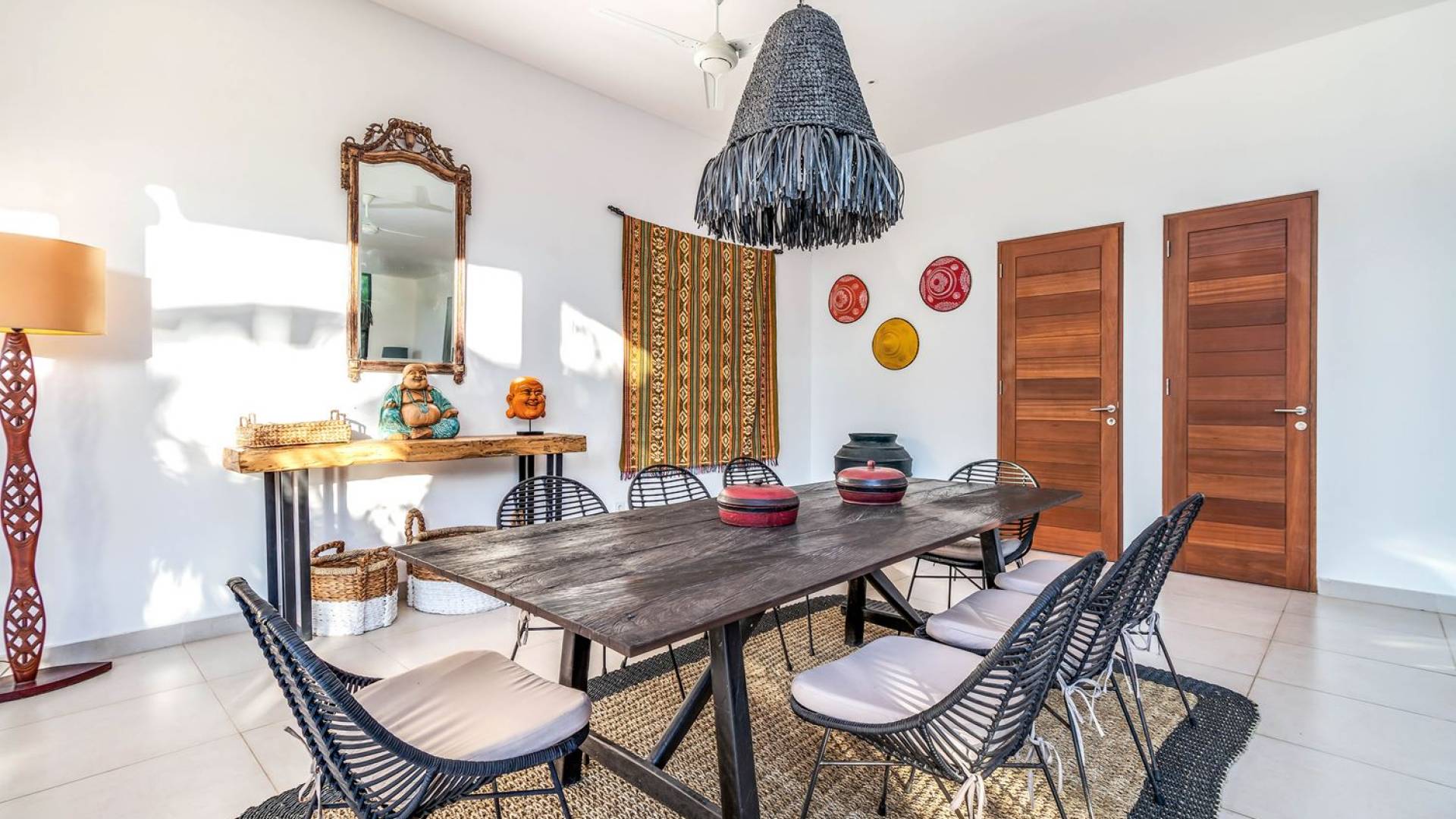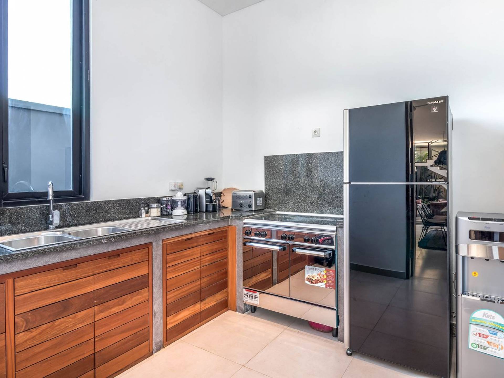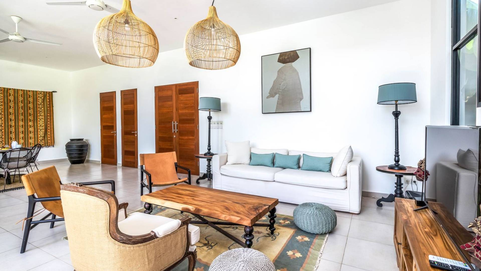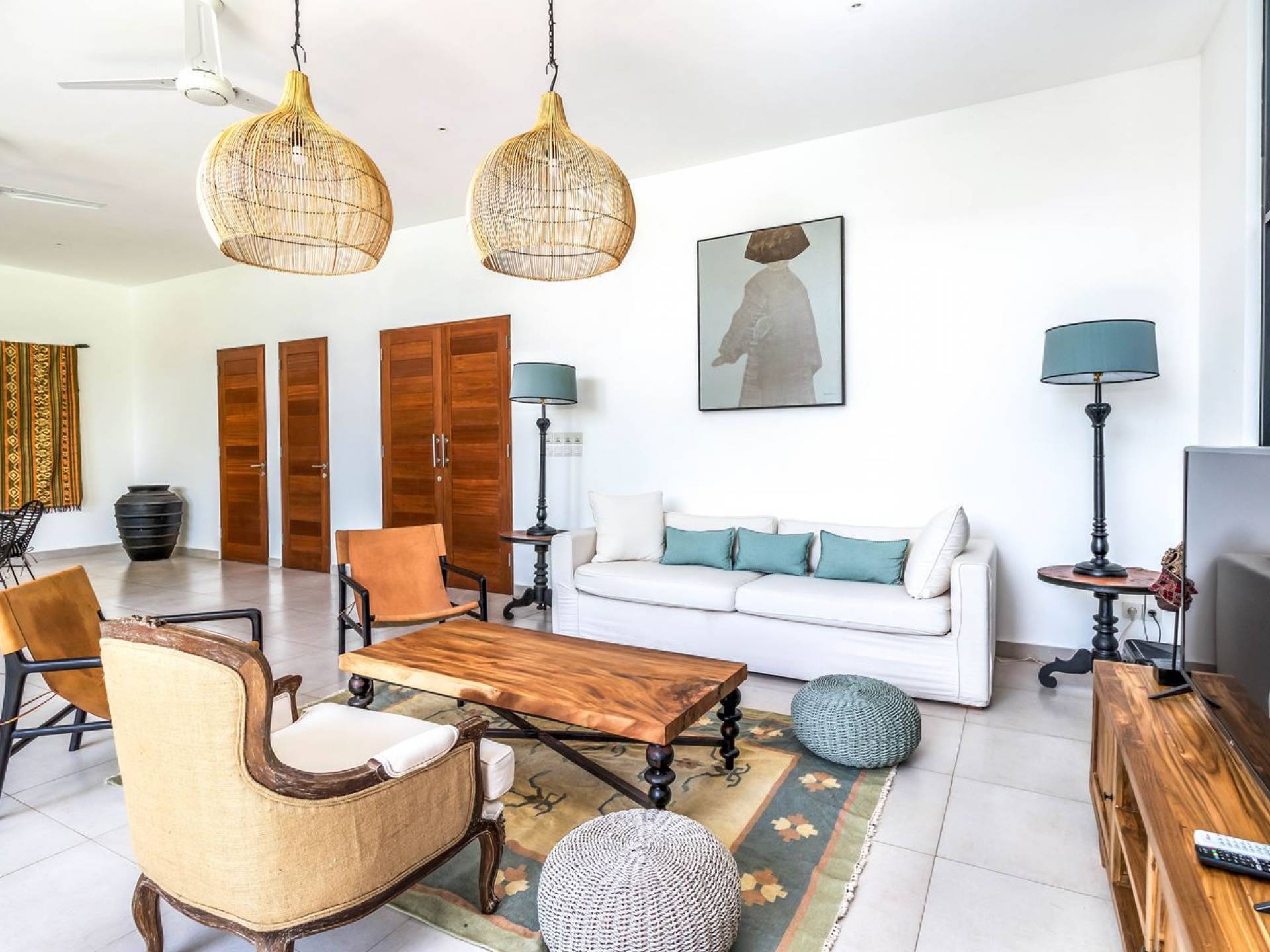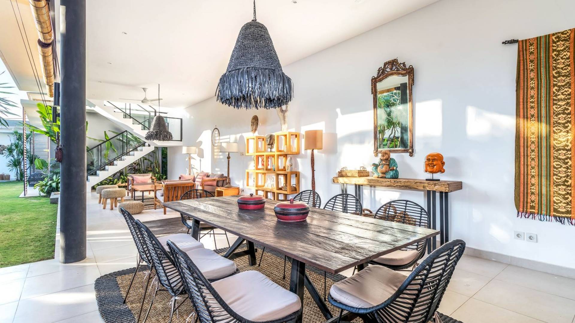 Das Design ist offen und bietet die schönsten Ausblicke auf den Garten. Rattanteppiche, traditionelle Artefakte und wunderschöne Textilien – Sie wissen, dass Sie sich an einem exotischen und sonnigen tropischen Ort befinden, okay! Es gibt 2 Sitzbereiche, einer ist perfekt für einen Drink mit Freunden und der Familie, während Sie den Kindern dabei zusehen, wie sie sich im Pool vergnügen. Das andere ist für gemütliche Abende in der Villa gedacht und schaut sich Filme auf dem Flachbildfernseher an. In der Mitte dieser beiden Loungebereiche steht der hübsche Esstisch für 8 Personen. Die Küche ist separat und mit allem ausgestattet, was eine moderne Küche braucht, einschließlich eines Ofens.