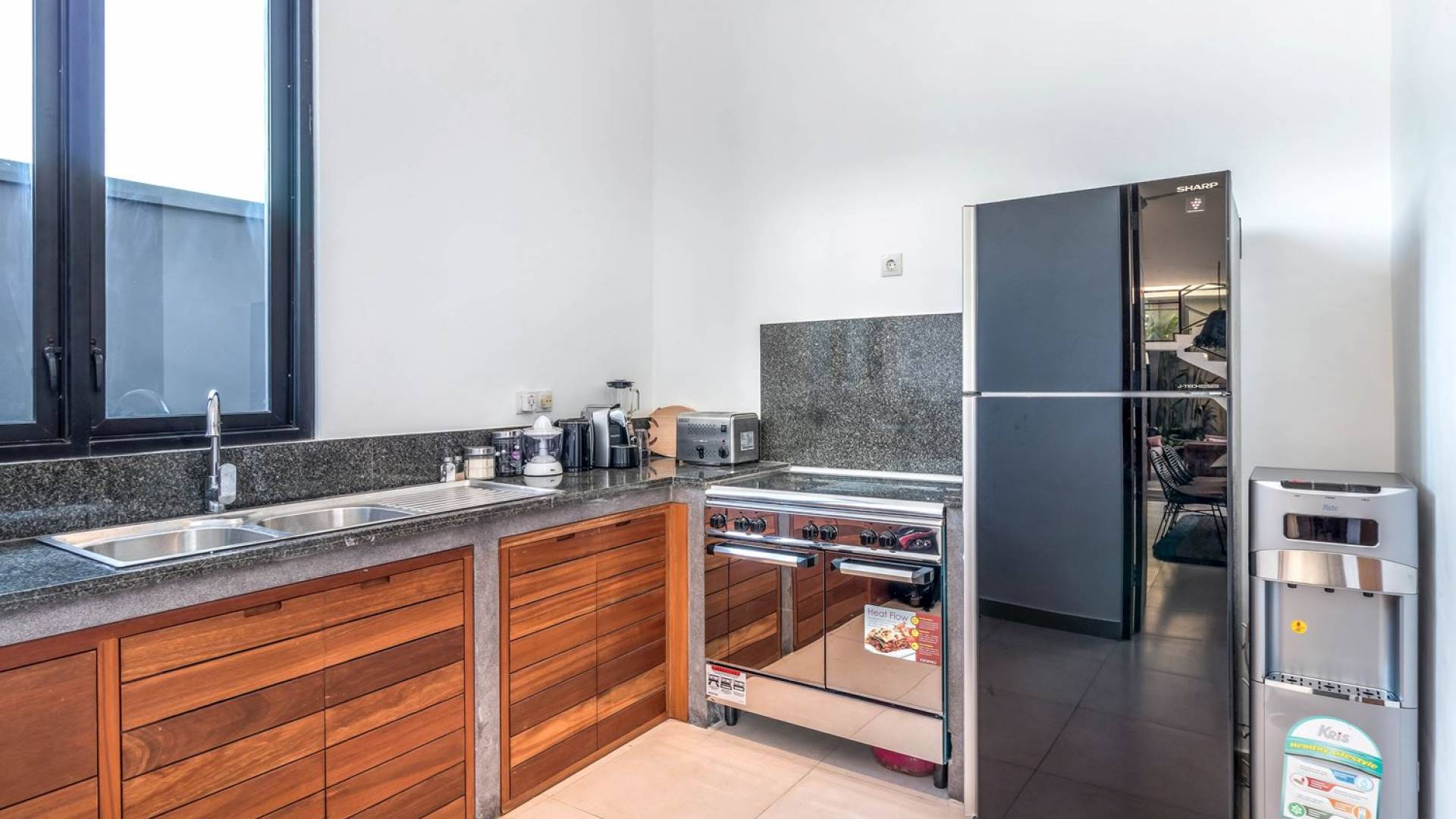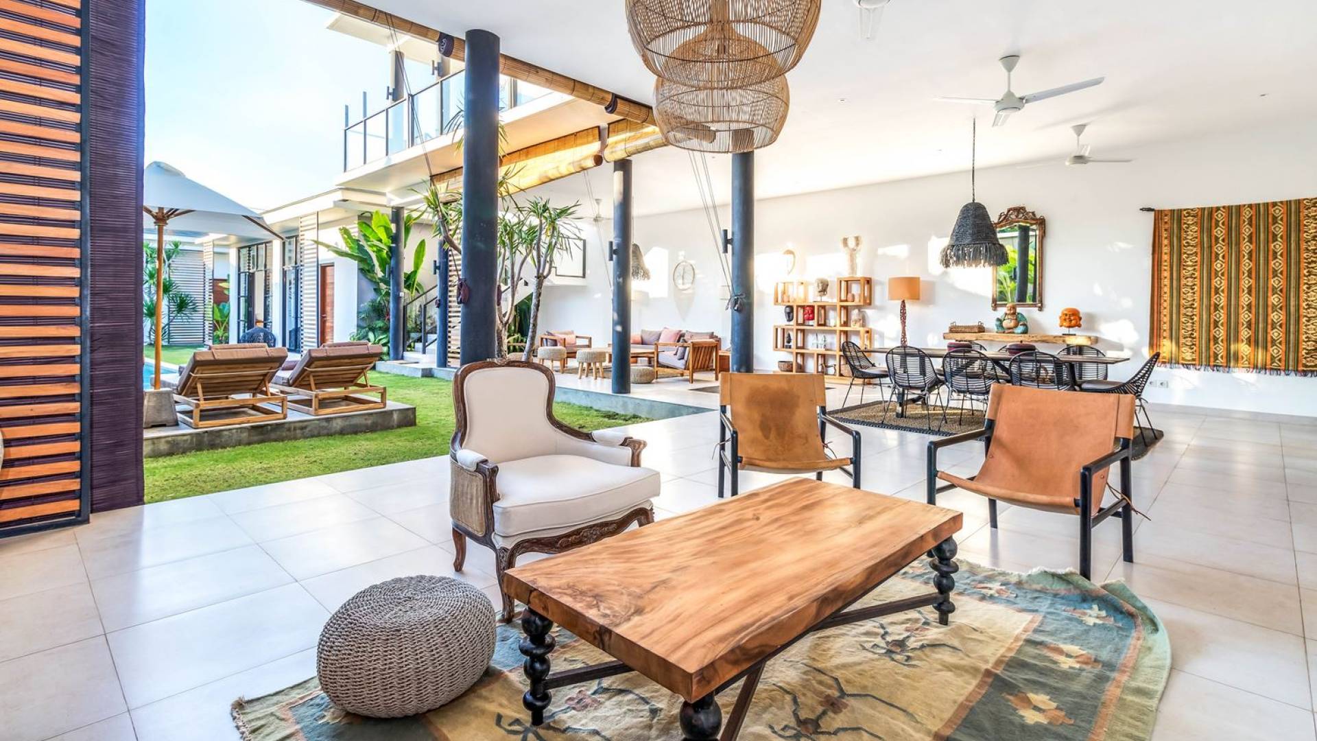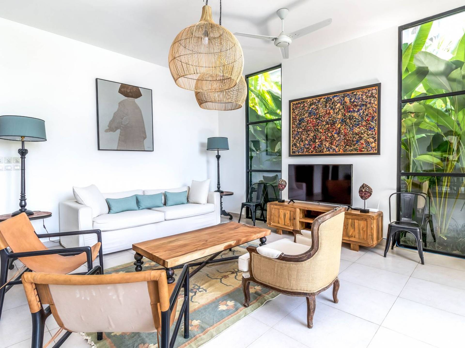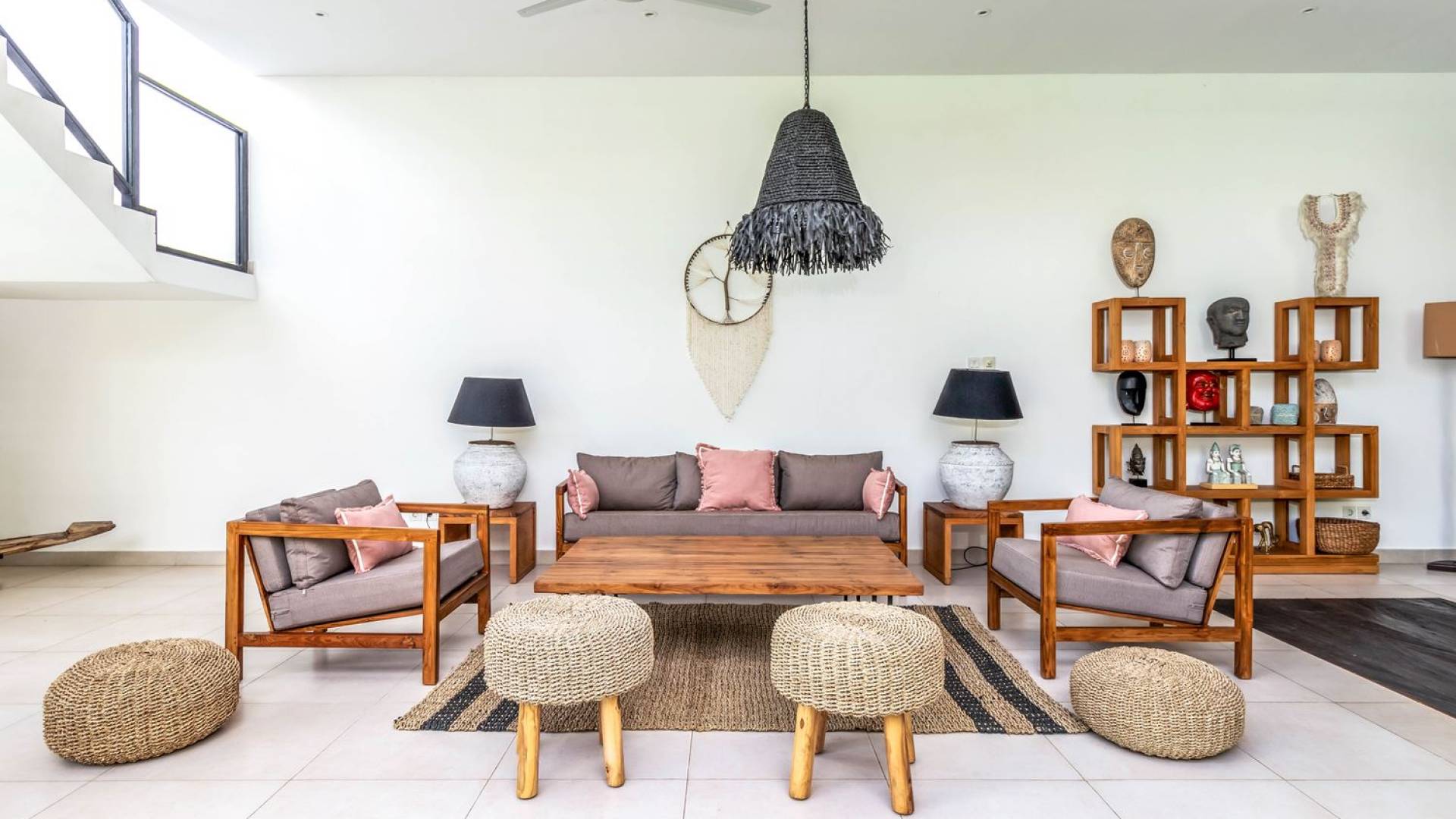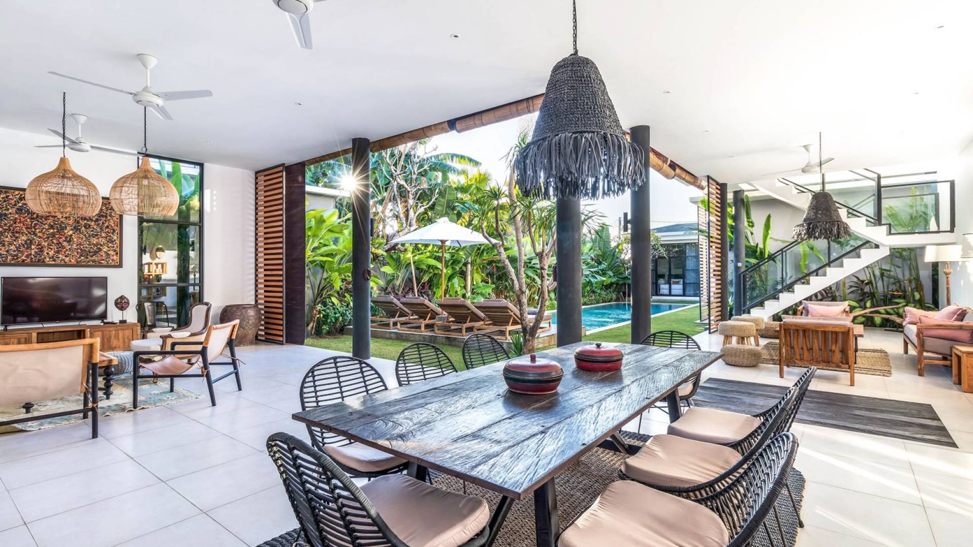Das Design ist offen und bietet die schönsten Ausblicke auf den Garten. Rattanteppiche, traditionelle Artefakte und wunderschöne Textilien – Sie wissen, dass Sie sich an einem exotischen und sonnigen tropischen Ort befinden, okay! Es gibt 2 Sitzbereiche, einer ist perfekt für einen Drink mit Freunden und der Familie, während Sie den Kindern dabei zusehen, wie sie sich im Pool vergnügen. Das andere ist für gemütliche Abende in der Villa gedacht und schaut sich Filme auf dem Flachbildfernseher an. In der Mitte dieser beiden Loungebereiche steht der hübsche Esstisch für 8 Personen. Die Küche ist separat und mit allem ausgestattet, was eine moderne Küche braucht, einschließlich eines Ofens.
