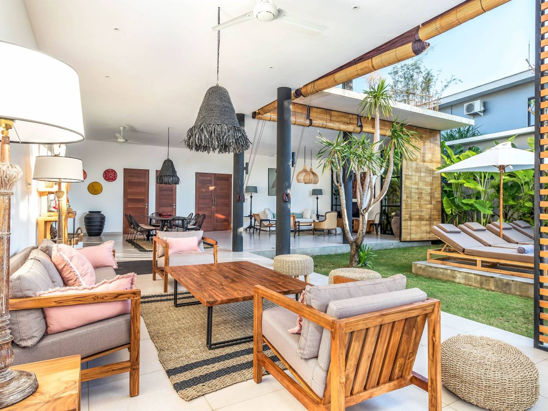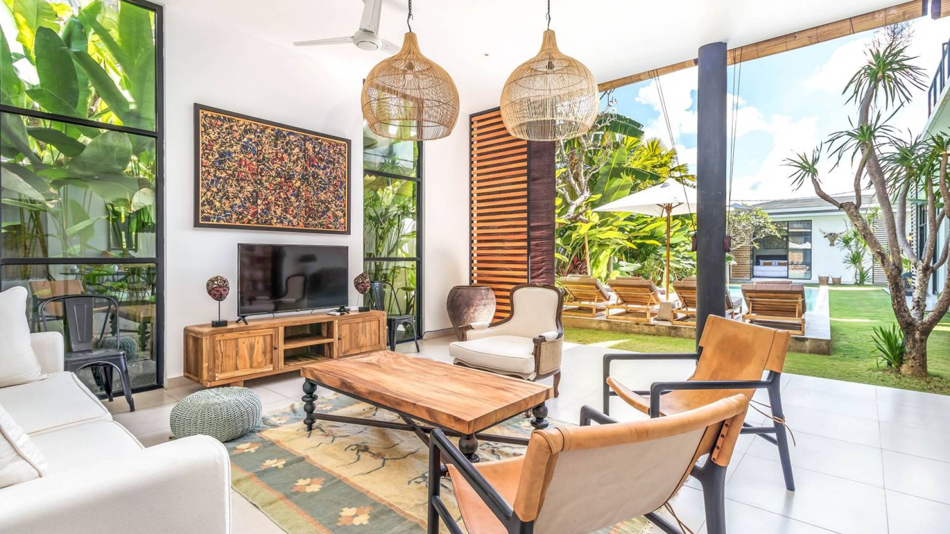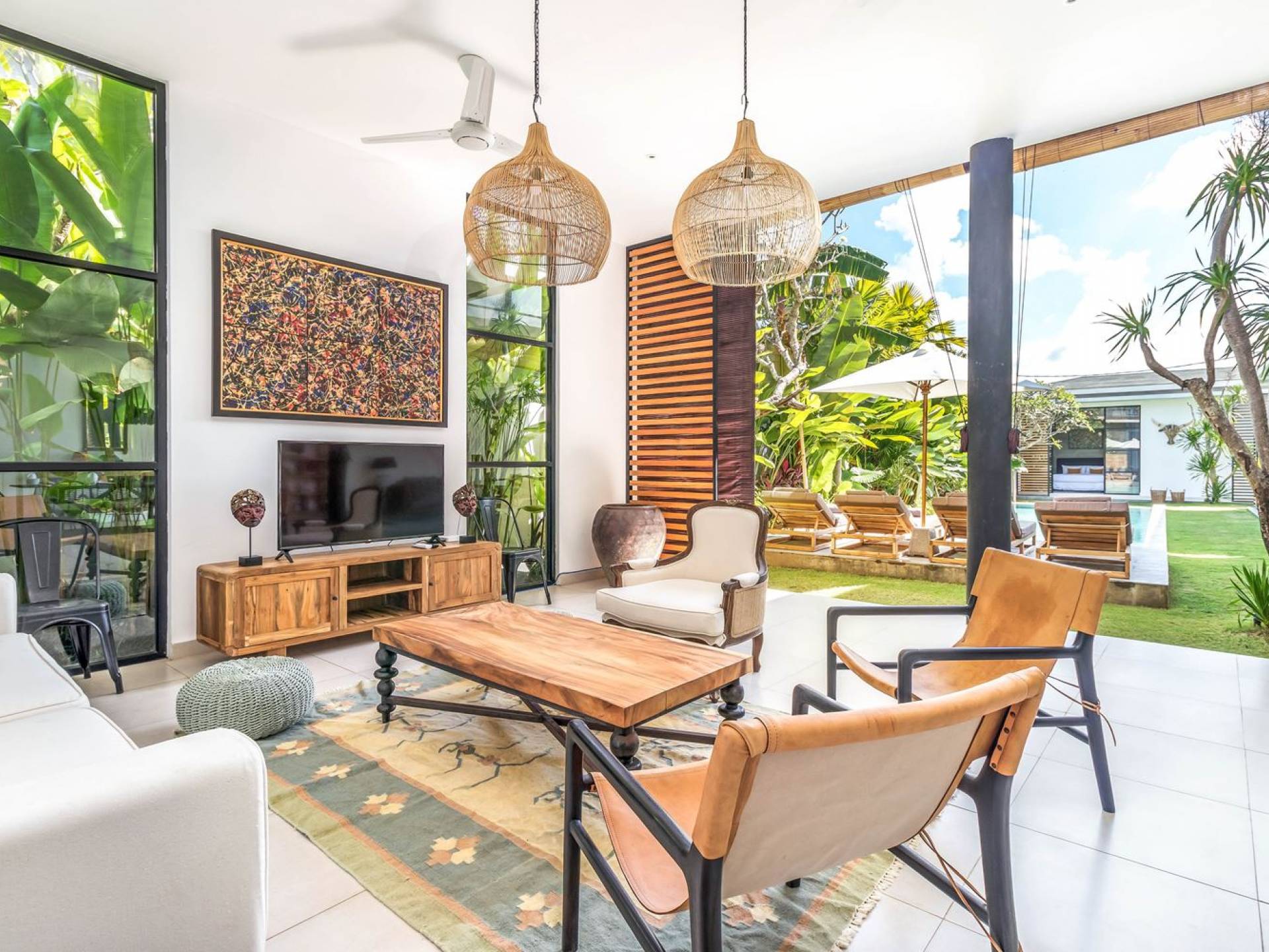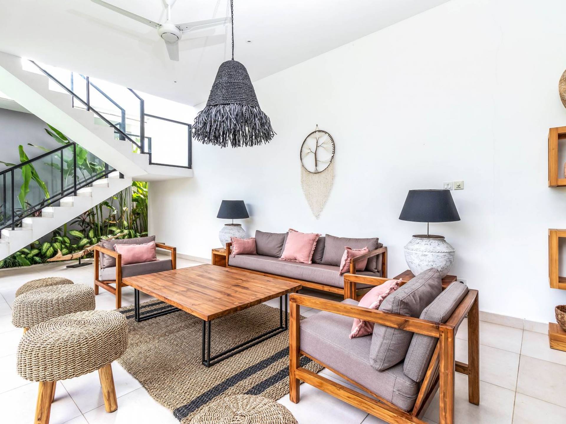 Villa Jaanuva Canggu ist tropisch wie es nur sein kann! Die Villa liegt strandnah im begehrten Canggu und ist dennoch sehr erschwinglich. Was könnte man mehr brauchen? Der Garten ist sonnig und üppig grün und verfügt über einen wunderschönen privaten Pool, der mit grünen Natursteinen gefliest ist, ein erhöhtes Sonnendeck mit 4 luxuriösen Tagesbetten und einen Sonnenschirm, der Schatten spendet für diejenigen, die sich für den Tag genug gebräunt haben. Der Pool hat einen flachen Bereich, in dem Kinder mit Wasser spielen können, und eine Rasenfläche mit sonnigen und schattigen Bereichen verläuft entlang des Pools. Tropisches Grün ist auf der anderen Seite des Pools gepflanzt und trägt zur paradiesischen Atmosphäre der Villa bei. Darüber hinaus verfügt die Villa Jaanuva über eine Sonnenterrasse im Obergeschoss, auf der Sie sitzen und eine Flasche Wein mit Ihren Lieben teilen können. Das Wohnzimmer ist geräumig und vom tropischen Inselleben inspiriert.