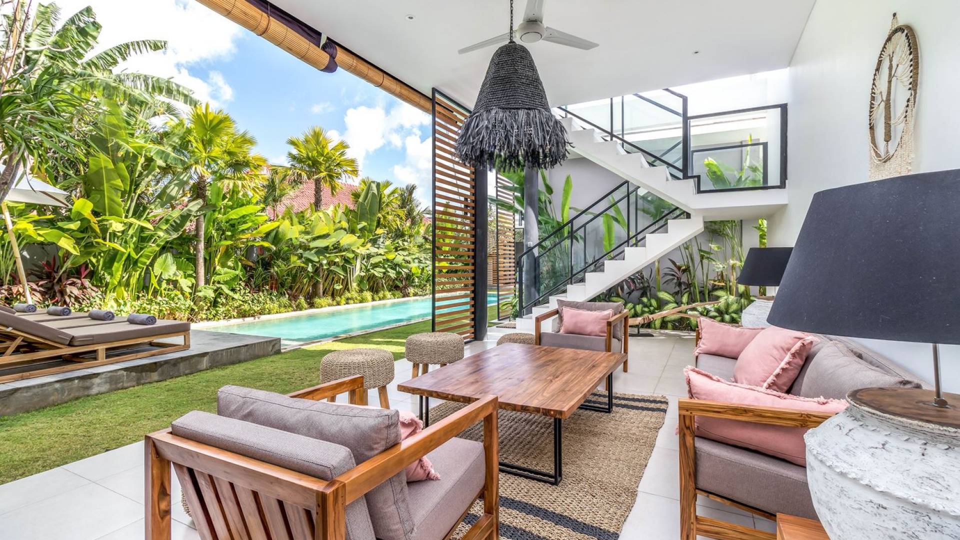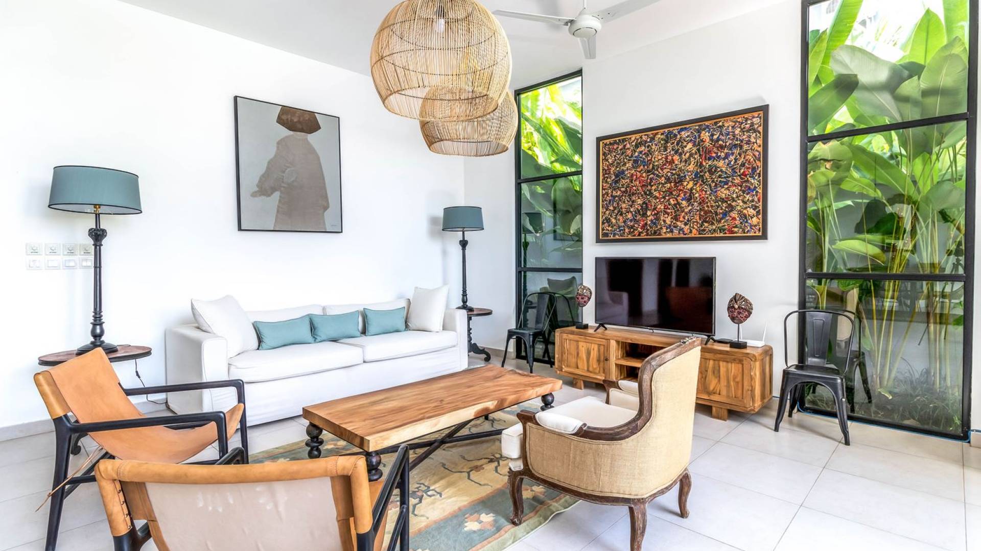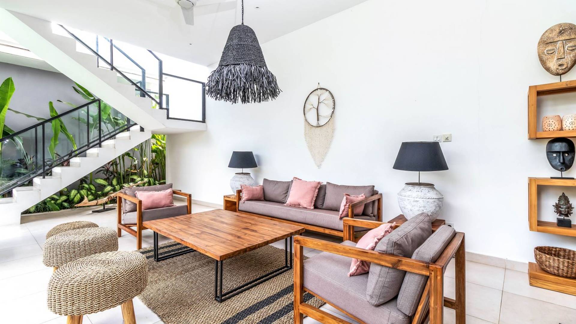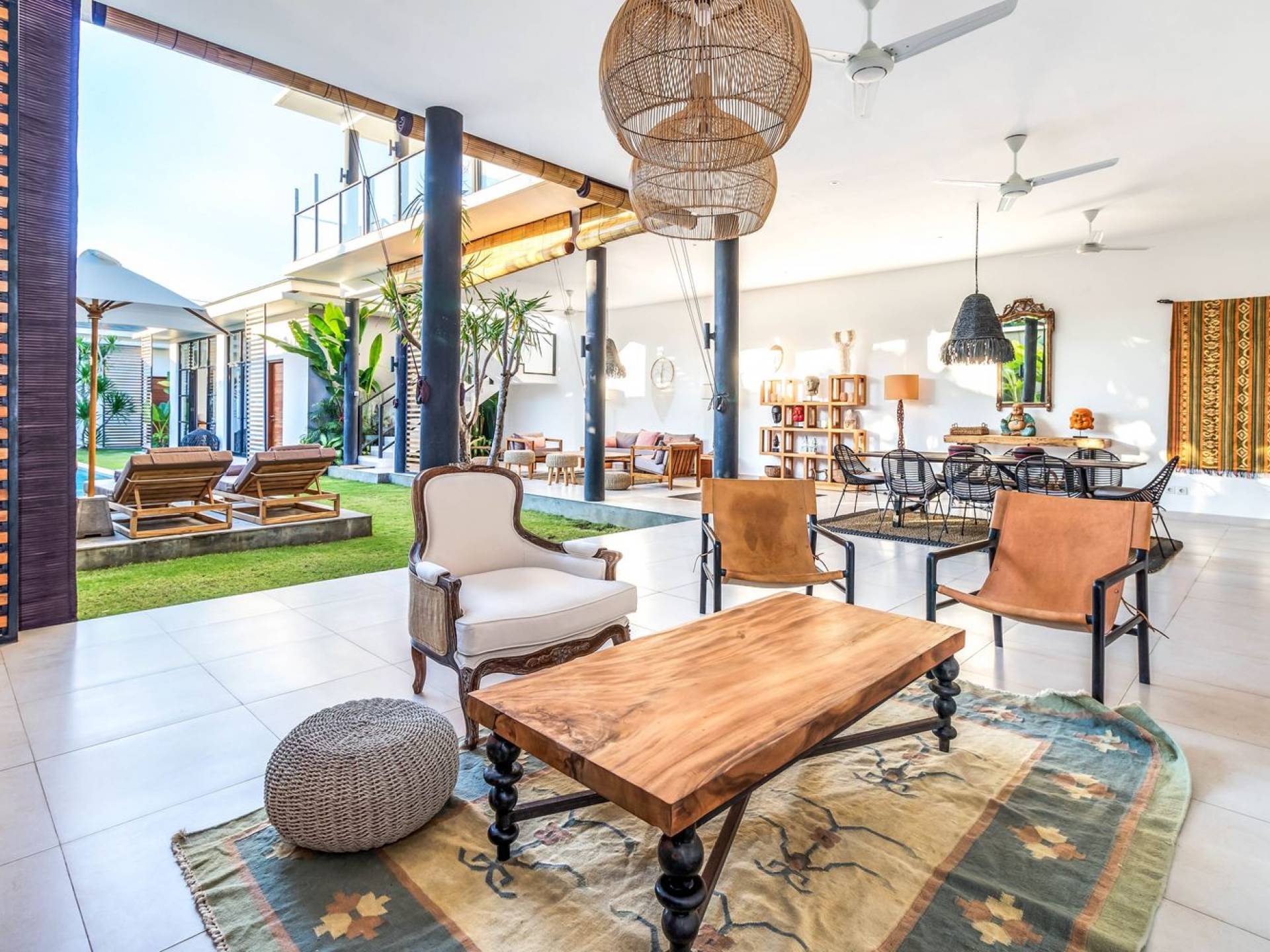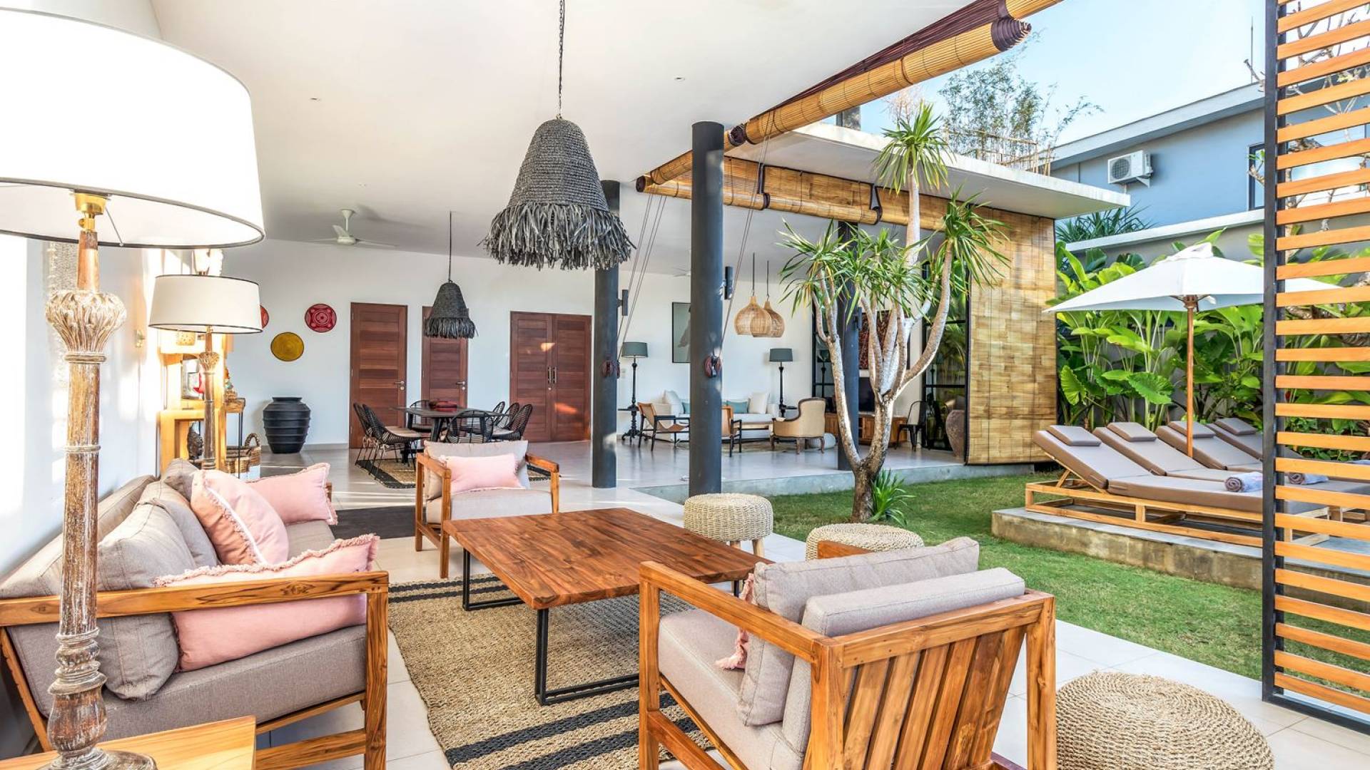 Villa Jaanuva Canggu ist tropisch wie es nur sein kann! Die Villa liegt strandnah im begehrten Canggu und ist dennoch sehr erschwinglich. Was könnte man mehr brauchen? Der Garten ist sonnig und üppig grün und verfügt über einen wunderschönen privaten Pool, der mit grünen Natursteinen gefliest ist, ein erhöhtes Sonnendeck mit 4 luxuriösen Tagesbetten und einen Sonnenschirm, der Schatten spendet für diejenigen, die sich für den Tag genug gebräunt haben. Der Pool hat einen flachen Bereich, in dem Kinder mit Wasser spielen können, und eine Rasenfläche mit sonnigen und schattigen Bereichen verläuft entlang des Pools. Tropisches Grün ist auf der anderen Seite des Pools gepflanzt und trägt zur paradiesischen Atmosphäre der Villa bei. Darüber hinaus verfügt die Villa Jaanuva über eine Sonnenterrasse im Obergeschoss, auf der Sie sitzen und eine Flasche Wein mit Ihren Lieben teilen können. Das Wohnzimmer ist geräumig und vom tropischen Inselleben inspiriert.