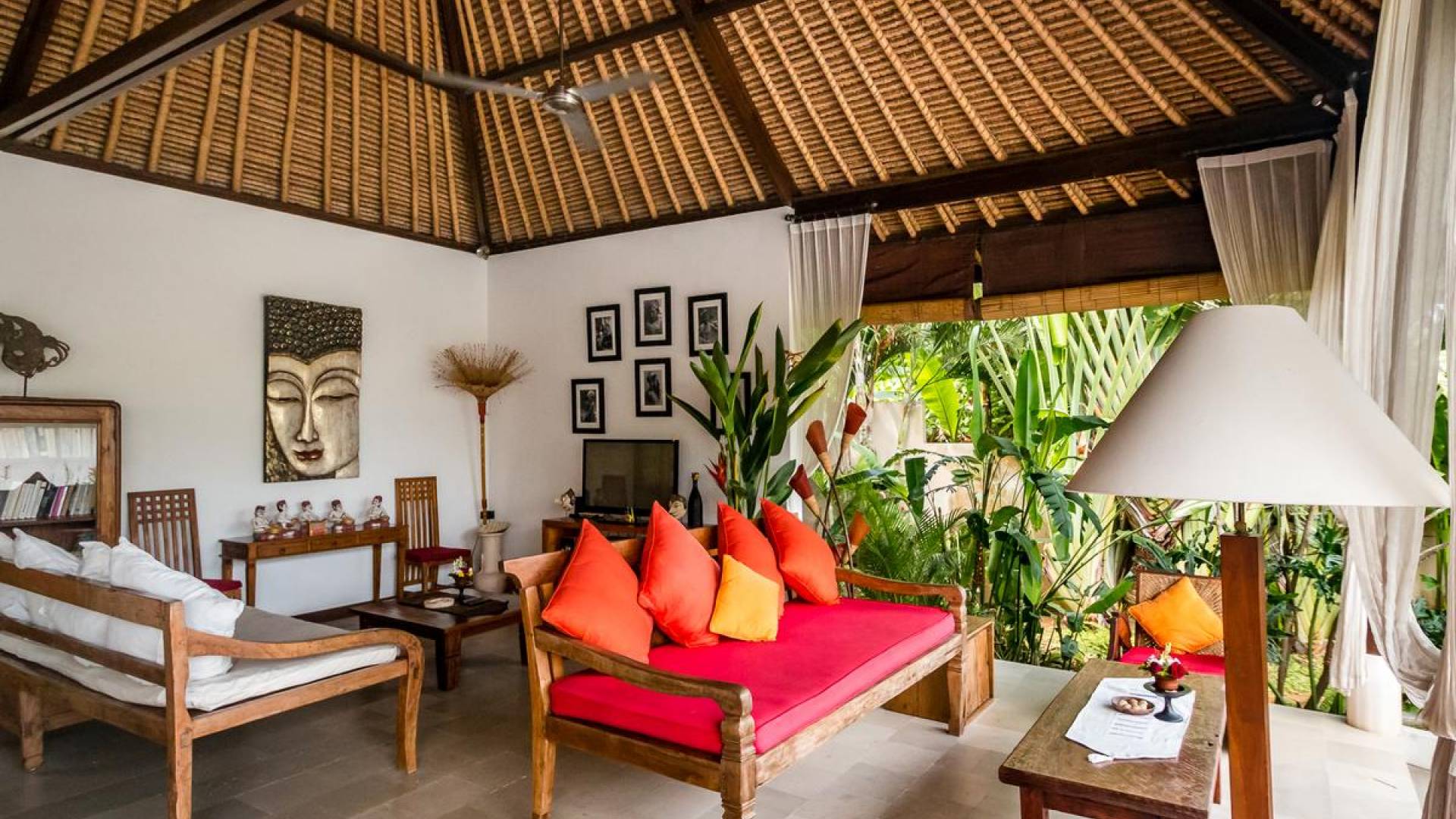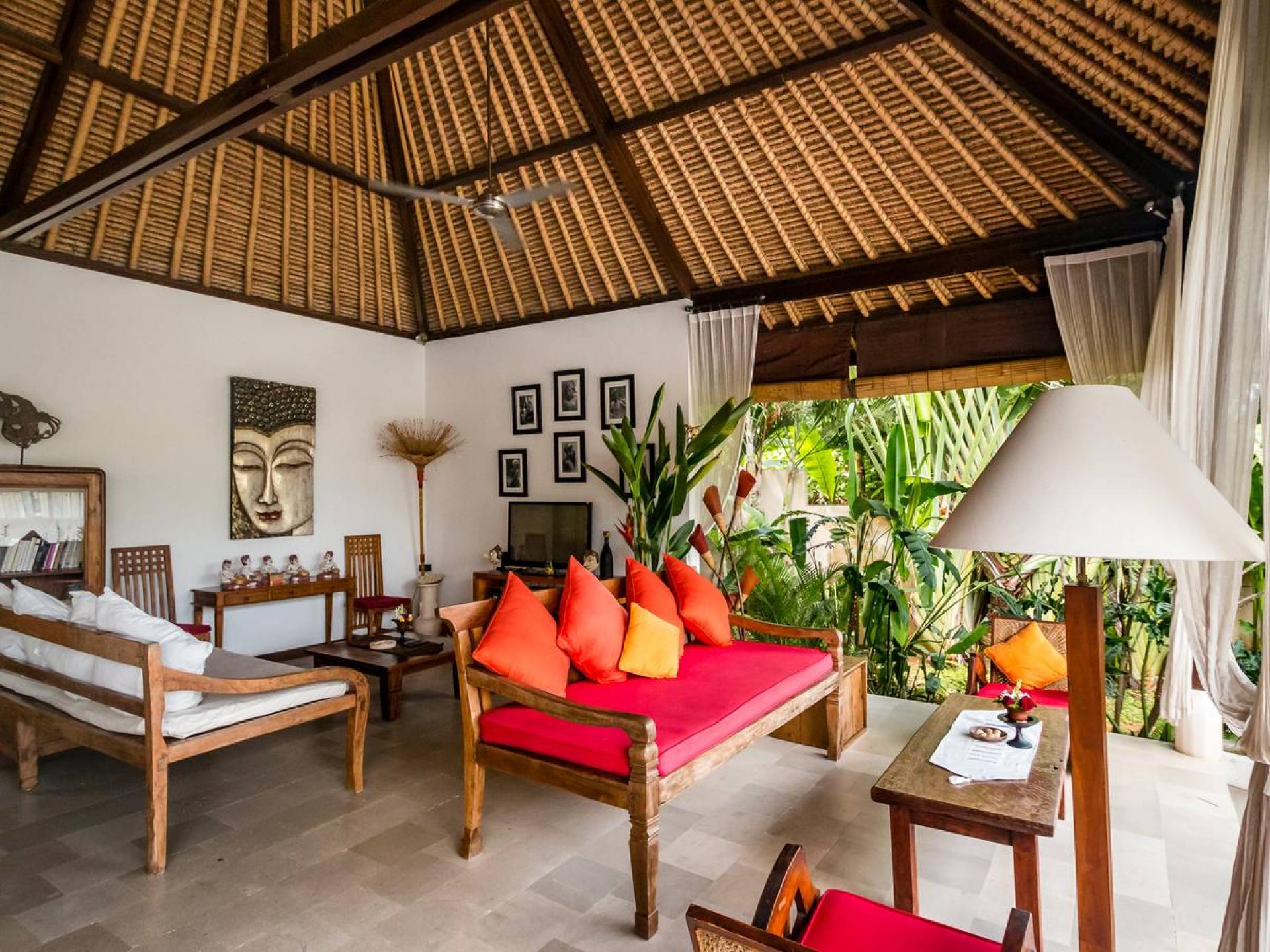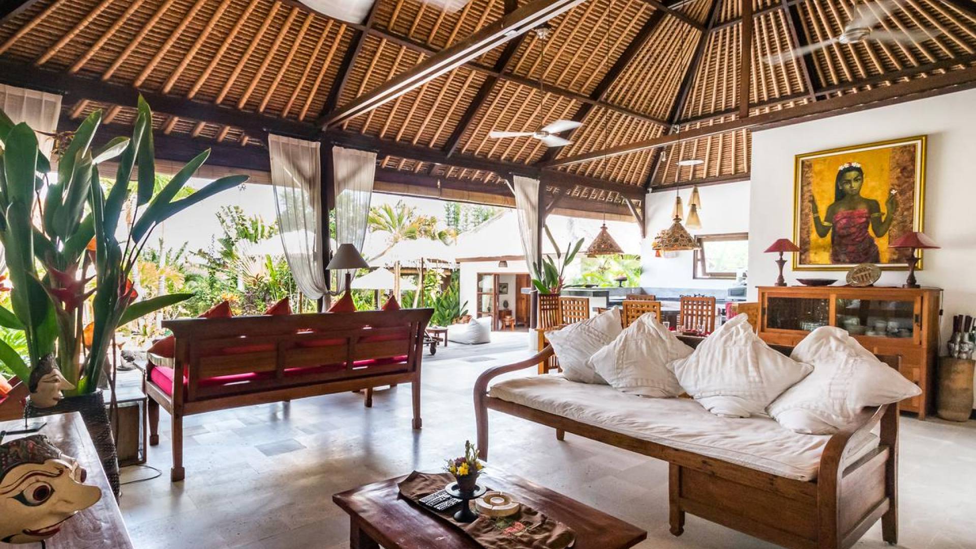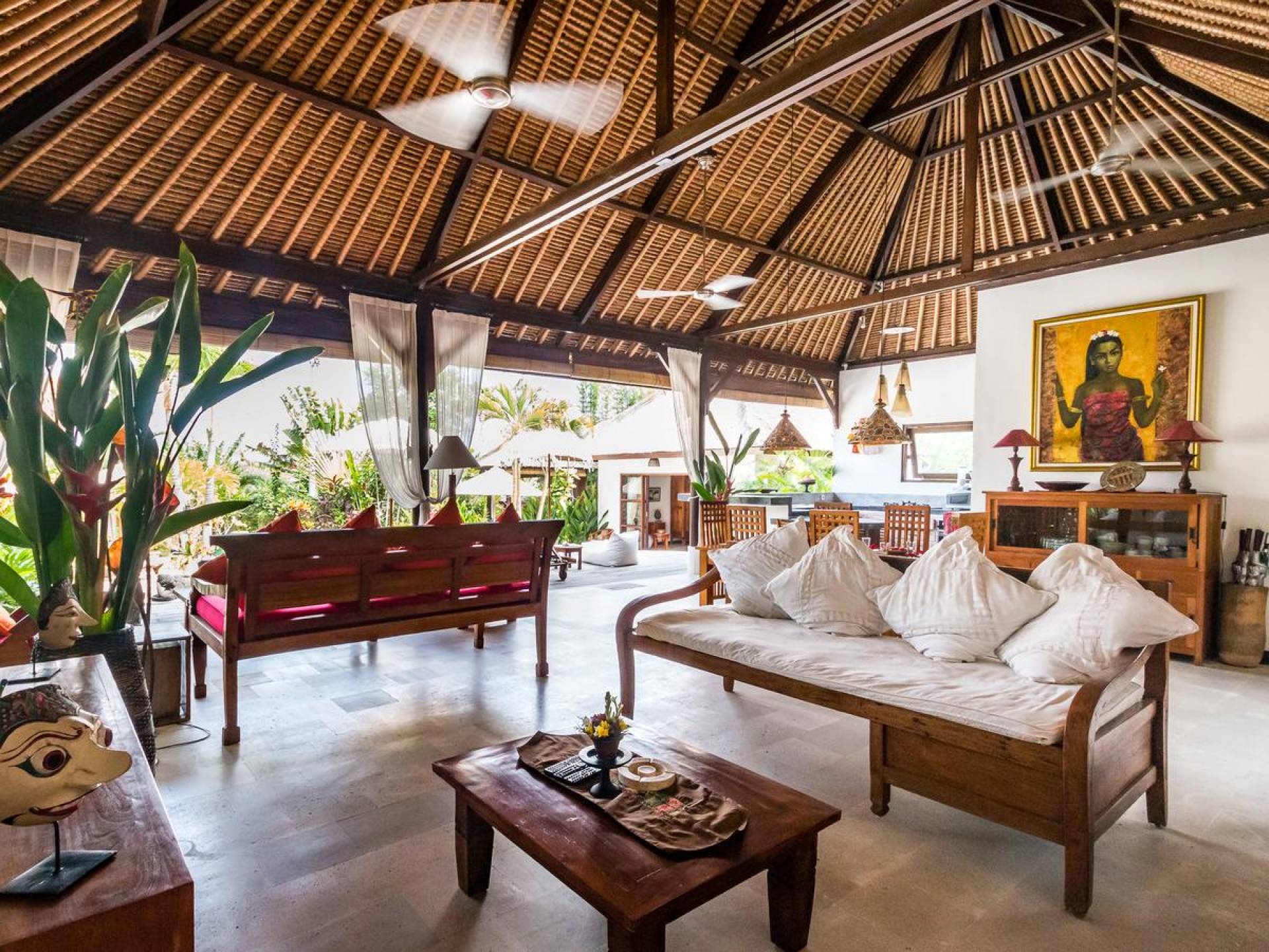 Bei Ihrer Ankunft in der Villa Tibu Indah Canggu werden Sie von einer handgefertigten Ganesha-Statue begrüßt, die von üppigem exotischem Grün umgeben ist, bevor Sie den traditionellen offenen Wohnpavillon betreten. Der Pavillon hat ein hohes, hoch aufragendes Strohdach mit Blick auf den tropischen Garten, in dem ein privater Swimmingpool glitzert und die perfekte Inselatmosphäre für einen wunderschönen Urlaub schafft. Die rustikale Inneneinrichtung bietet faszinierende Stammeskunst und schöne antike Möbel mit traditionellen balinesischen Holzschnitzereien. Das balinesische Sofa mit knallroten Kissen ist tagsüber ein gemütlicher Ort, um sich zurückzulehnen und einfach den Blick über den schönen tropischen Garten zu genießen, während Sie sich abends in einer zweiten Sofalounge mit einem Flachbildschirm versammeln können Fernseher mit DVD-Player zum gemeinsamen Anschauen von Filmen am Abend.