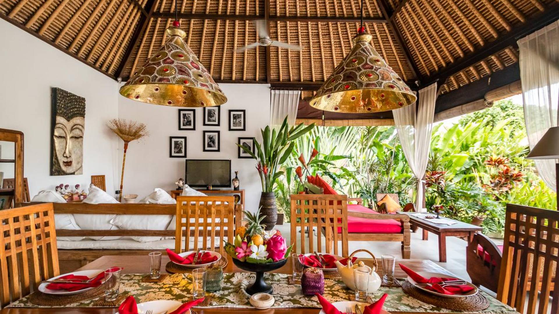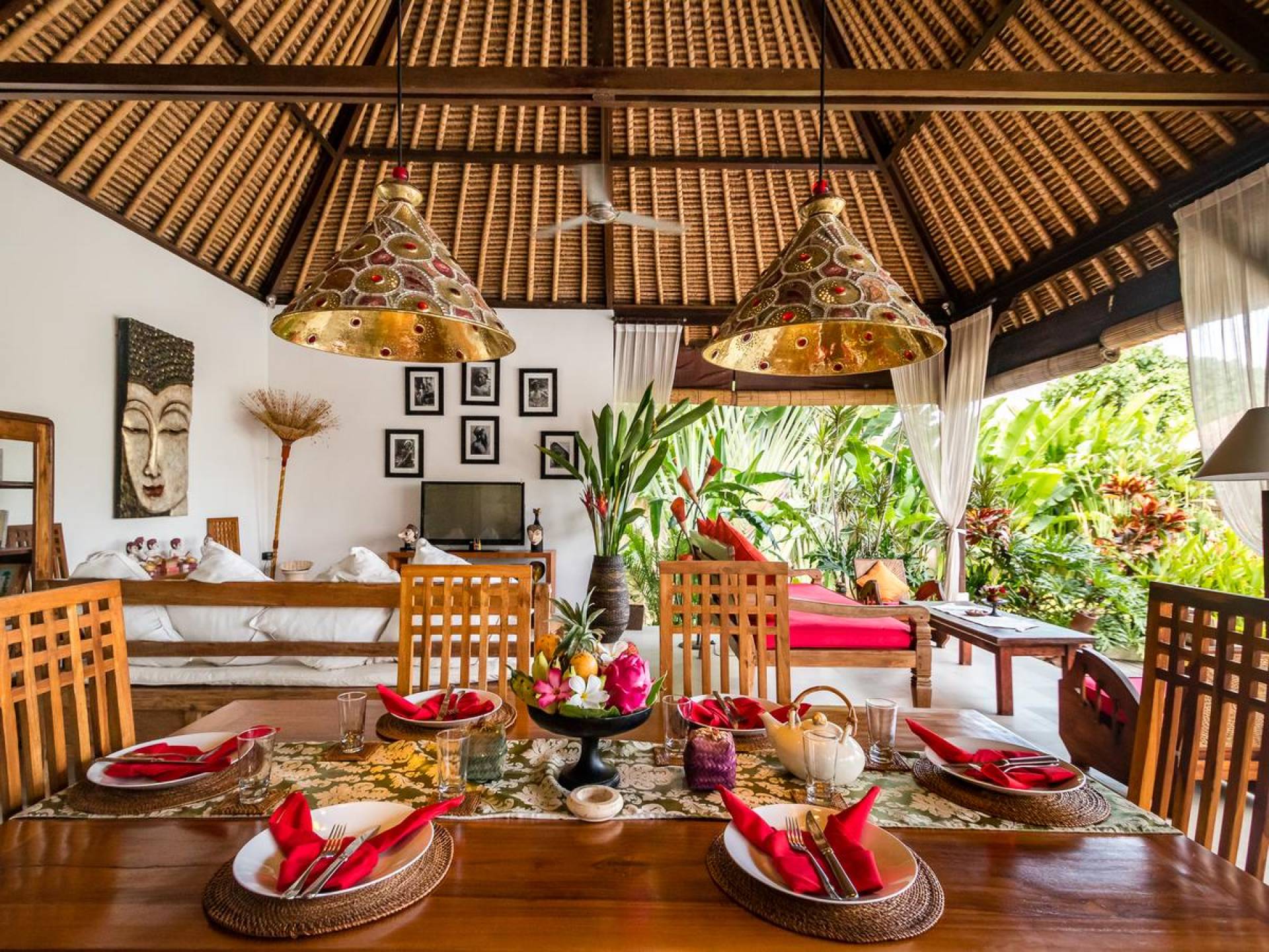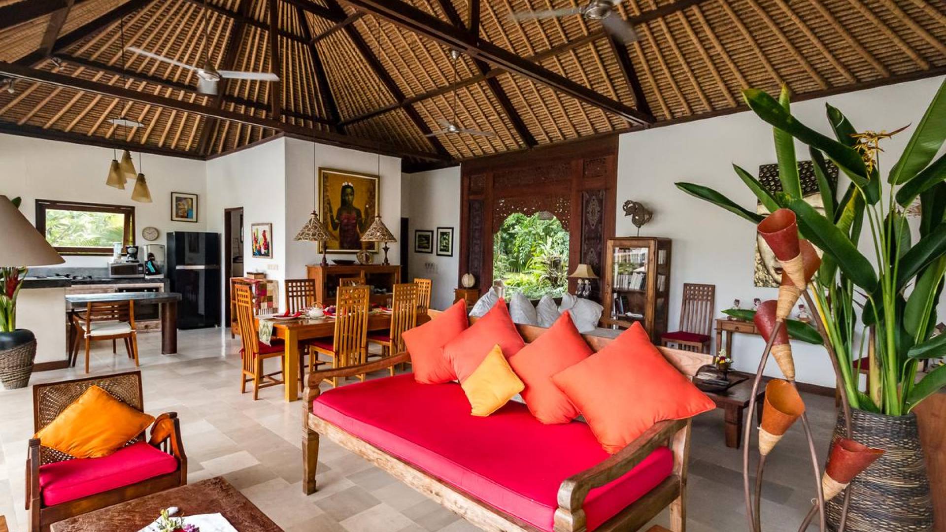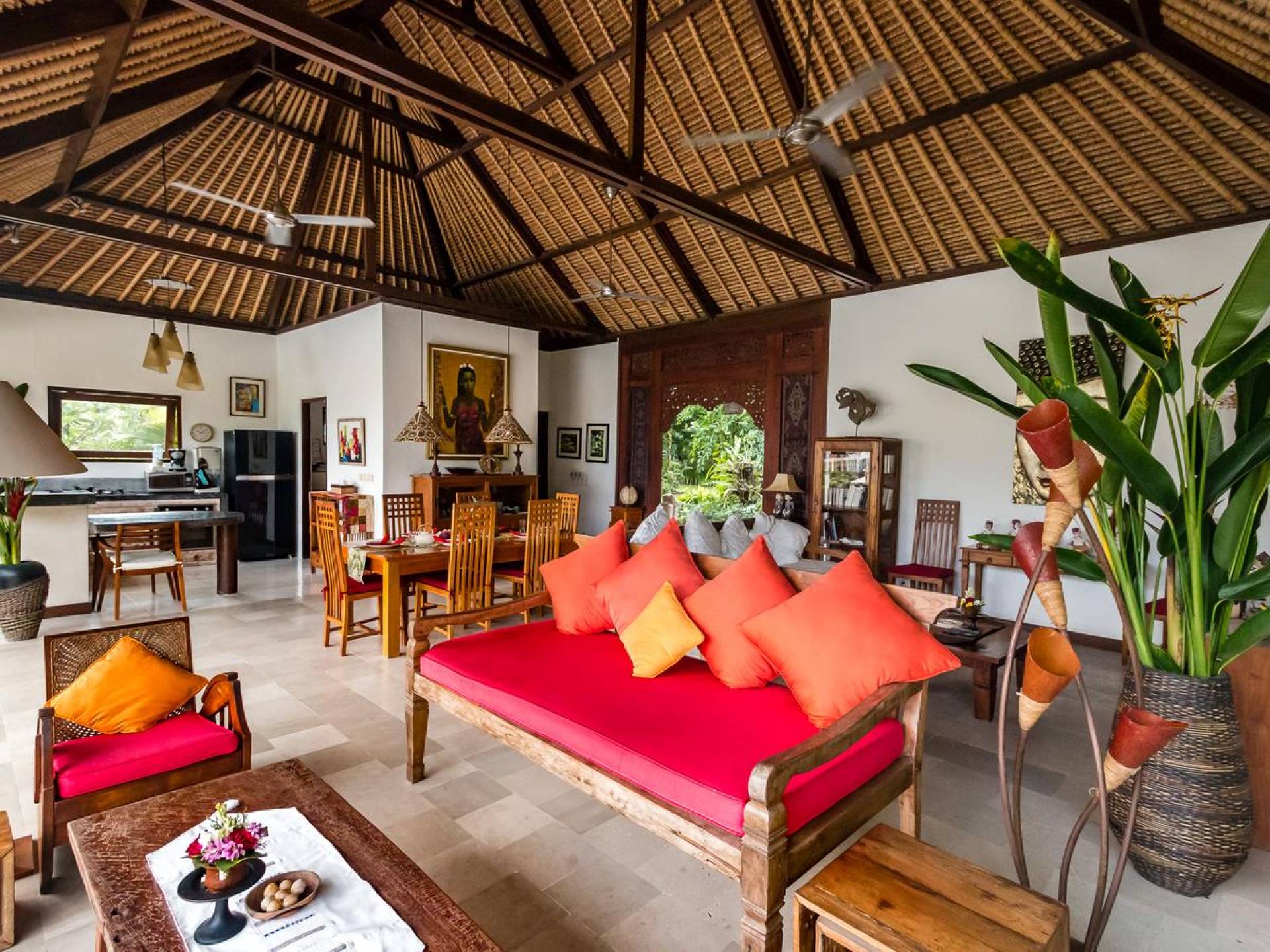 Bei Ihrer Ankunft in der Villa Tibu Indah Canggu werden Sie von einer handgefertigten Ganesha-Statue begrüßt, die von üppigem exotischem Grün umgeben ist, bevor Sie den traditionellen offenen Wohnpavillon betreten. Der Pavillon hat ein hohes, hoch aufragendes Strohdach mit Blick auf den tropischen Garten, in dem ein privater Swimmingpool glitzert und die perfekte Inselatmosphäre für einen wunderschönen Urlaub schafft. Die rustikale Inneneinrichtung bietet faszinierende Stammeskunst und schöne antike Möbel mit traditionellen balinesischen Holzschnitzereien. Das balinesische Sofa mit knallroten Kissen ist tagsüber ein gemütlicher Ort, um sich zurückzulehnen und einfach den Blick über den schönen tropischen Garten zu genießen, während Sie sich abends in einer zweiten Sofalounge mit einem Flachbildschirm versammeln können Fernseher mit DVD-Player zum gemeinsamen Anschauen von Filmen am Abend.