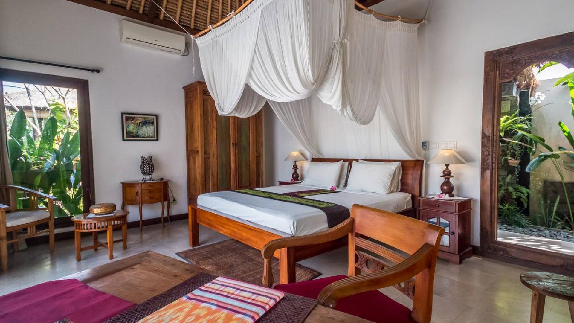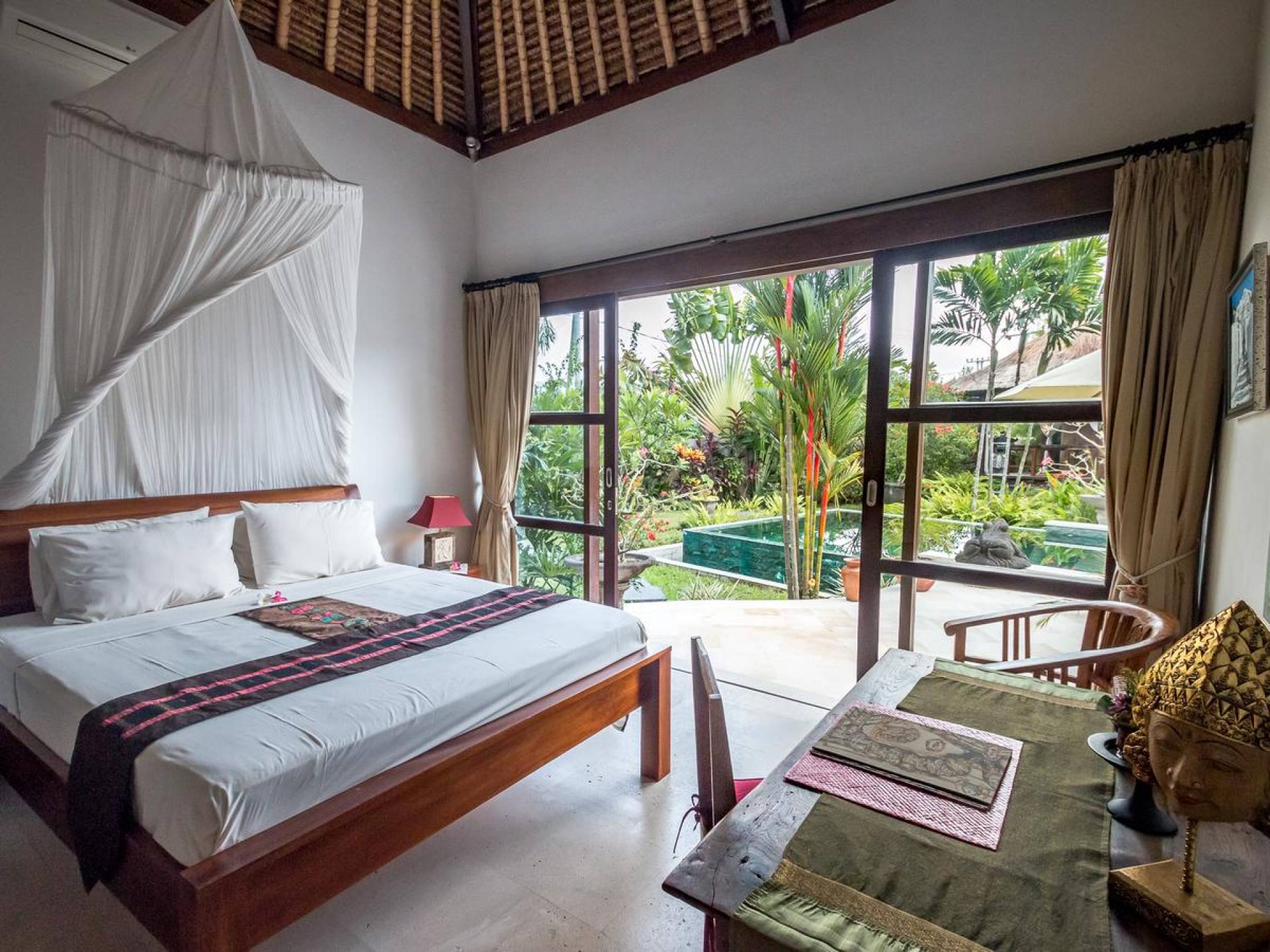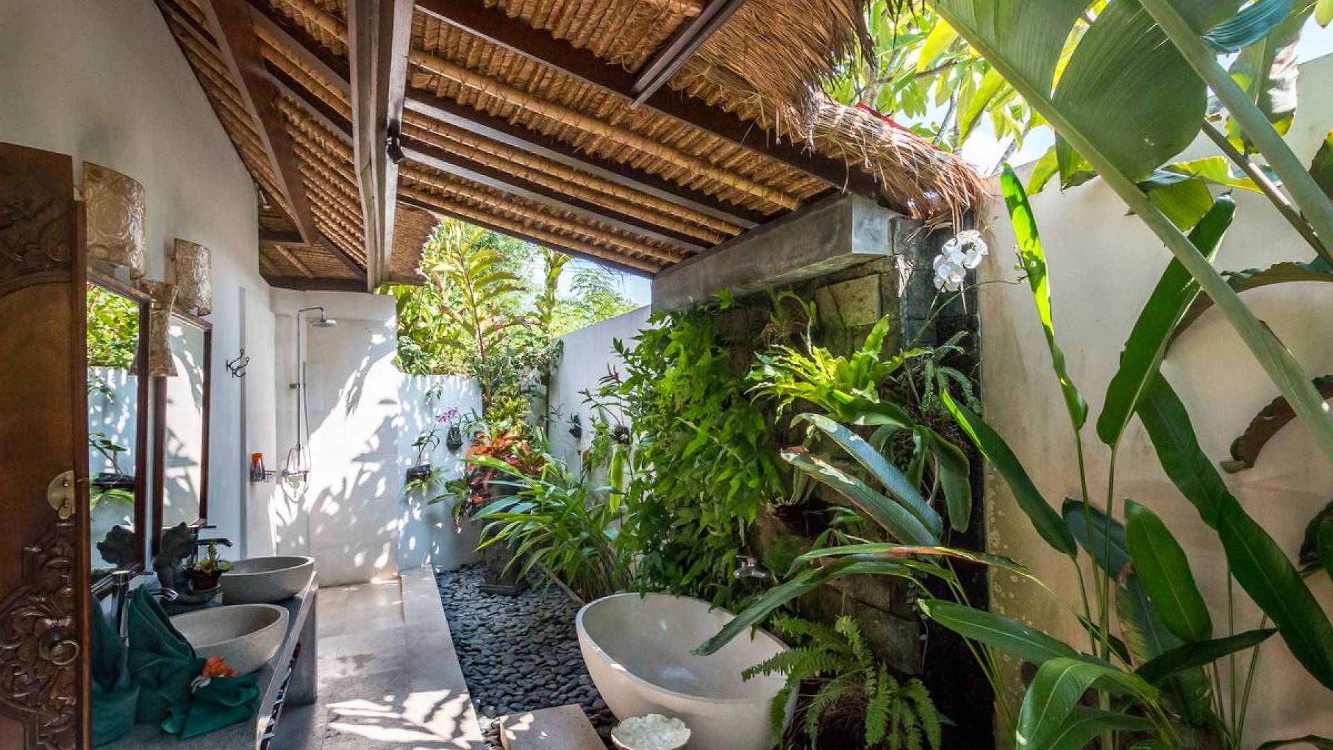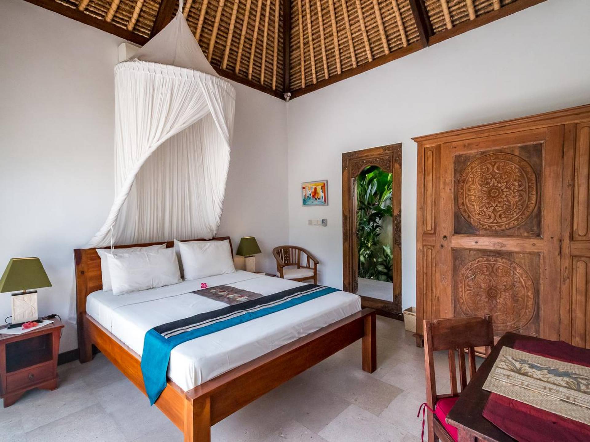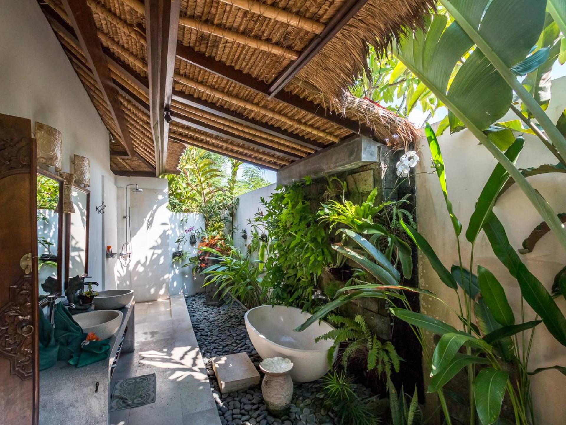 Bei Ihrer Ankunft in der Villa Tibu Indah Canggu werden Sie von einer handgefertigten Ganesha-Statue begrüßt, die von üppigem exotischem Grün umgeben ist, bevor Sie den traditionellen offenen Wohnpavillon betreten. Der Pavillon hat ein hohes, hoch aufragendes Strohdach mit Blick auf den tropischen Garten, in dem ein privater Swimmingpool glitzert und die perfekte Inselatmosphäre für einen wunderschönen Urlaub schafft. Die rustikale Inneneinrichtung bietet faszinierende Stammeskunst und schöne antike Möbel mit traditionellen balinesischen Holzschnitzereien. Das balinesische Sofa mit knallroten Kissen ist tagsüber ein gemütlicher Ort, um sich zurückzulehnen und einfach den Blick über den schönen tropischen Garten zu genießen, während Sie sich abends in einer zweiten Sofalounge mit einem Flachbildschirm versammeln können Fernseher mit DVD-Player zum gemeinsamen Anschauen von Filmen am Abend.