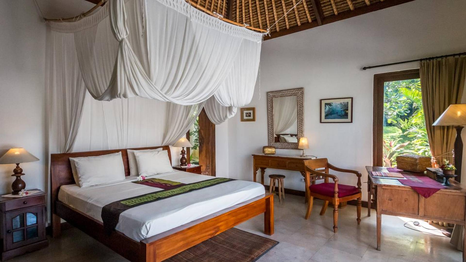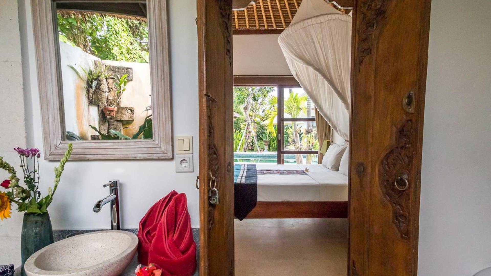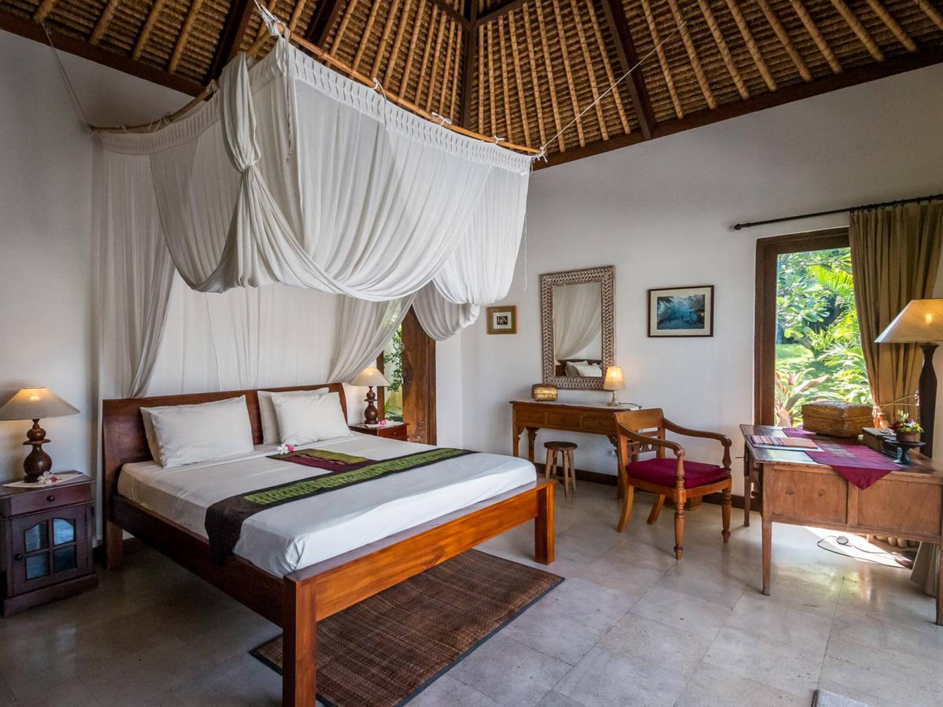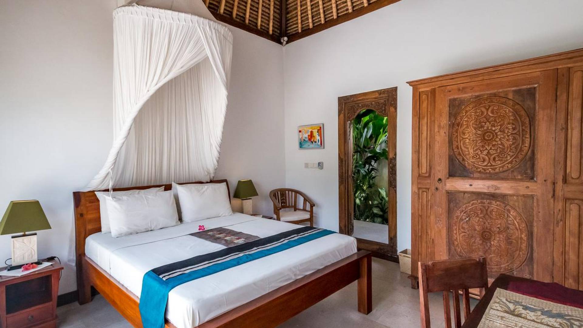 Bei Ihrer Ankunft in der Villa Tibu Indah Canggu werden Sie von einer handgefertigten Ganesha-Statue begrüßt, die von üppigem exotischem Grün umgeben ist, bevor Sie den traditionellen offenen Wohnpavillon betreten. Der Pavillon hat ein hohes, hoch aufragendes Strohdach mit Blick auf den tropischen Garten, in dem ein privater Swimmingpool glitzert und die perfekte Inselatmosphäre für einen wunderschönen Urlaub schafft. Die rustikale Inneneinrichtung bietet faszinierende Stammeskunst und schöne antike Möbel mit traditionellen balinesischen Holzschnitzereien. Das balinesische Sofa mit knallroten Kissen ist tagsüber ein gemütlicher Ort, um sich zurückzulehnen und einfach den Blick über den schönen tropischen Garten zu genießen, während Sie sich abends in einer zweiten Sofalounge mit einem Flachbildschirm versammeln können Fernseher mit DVD-Player zum gemeinsamen Anschauen von Filmen am Abend.