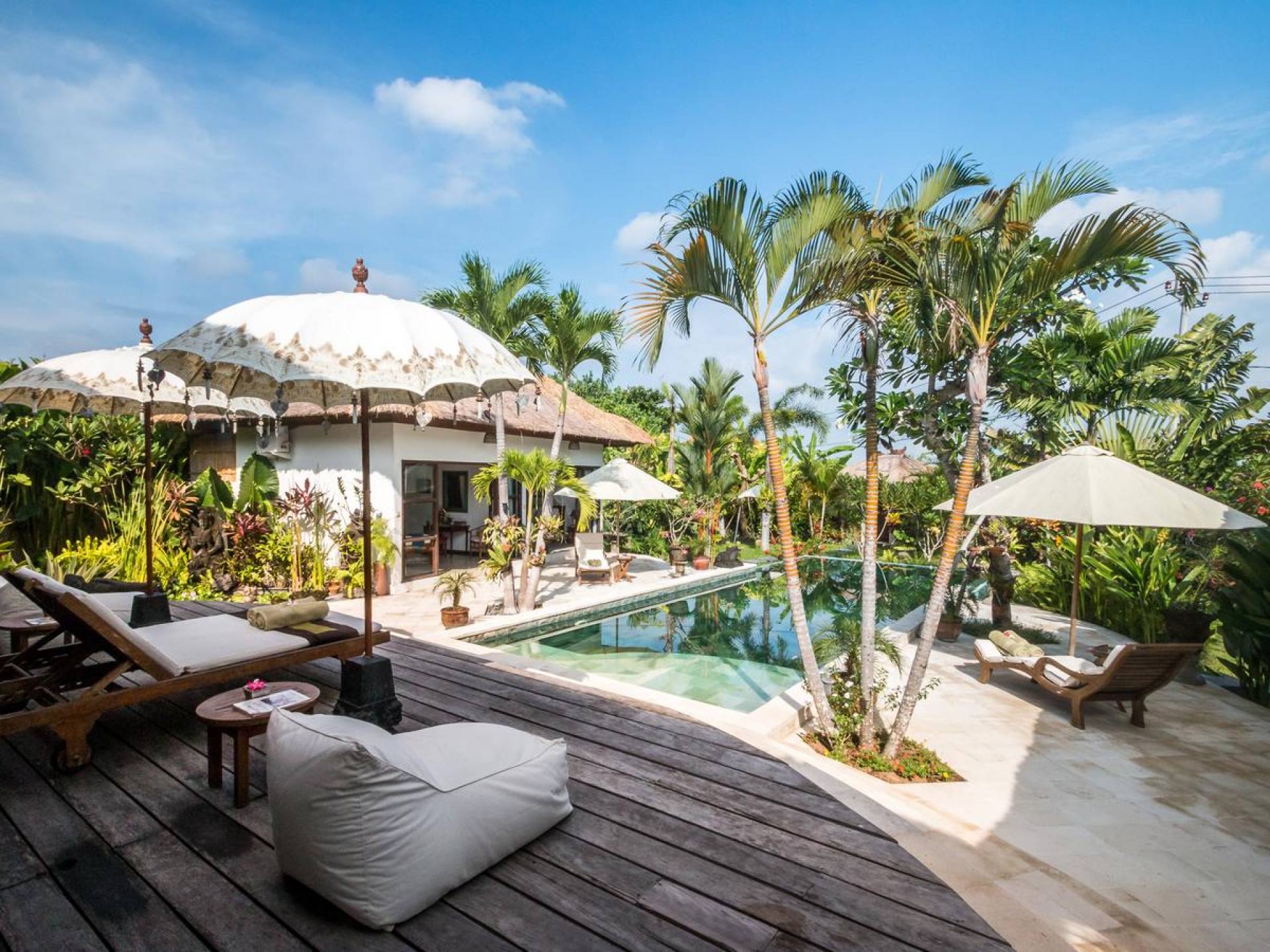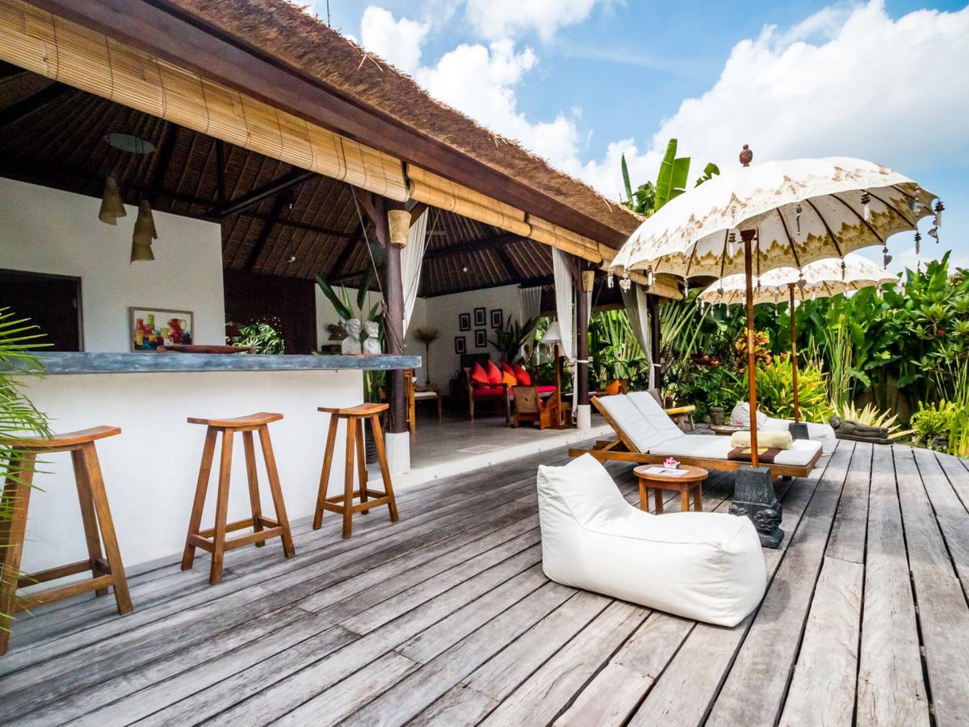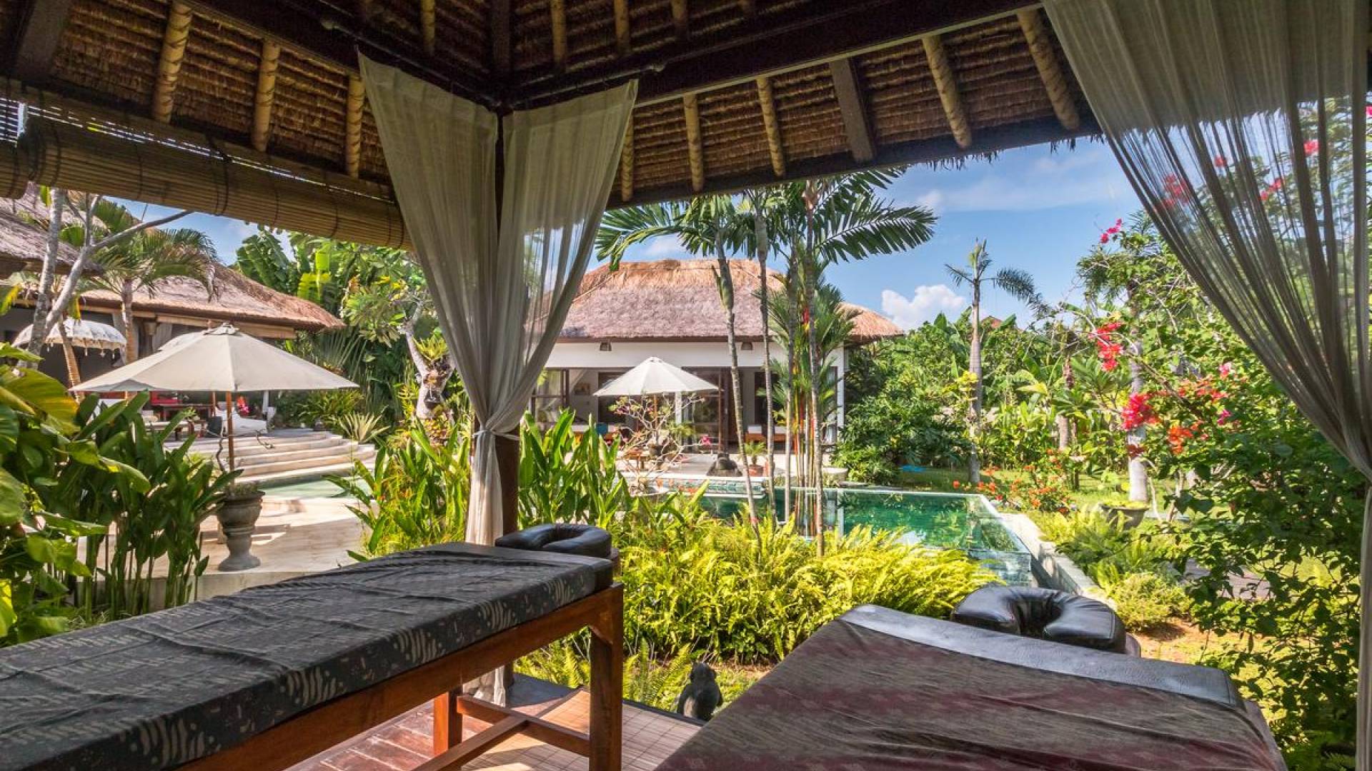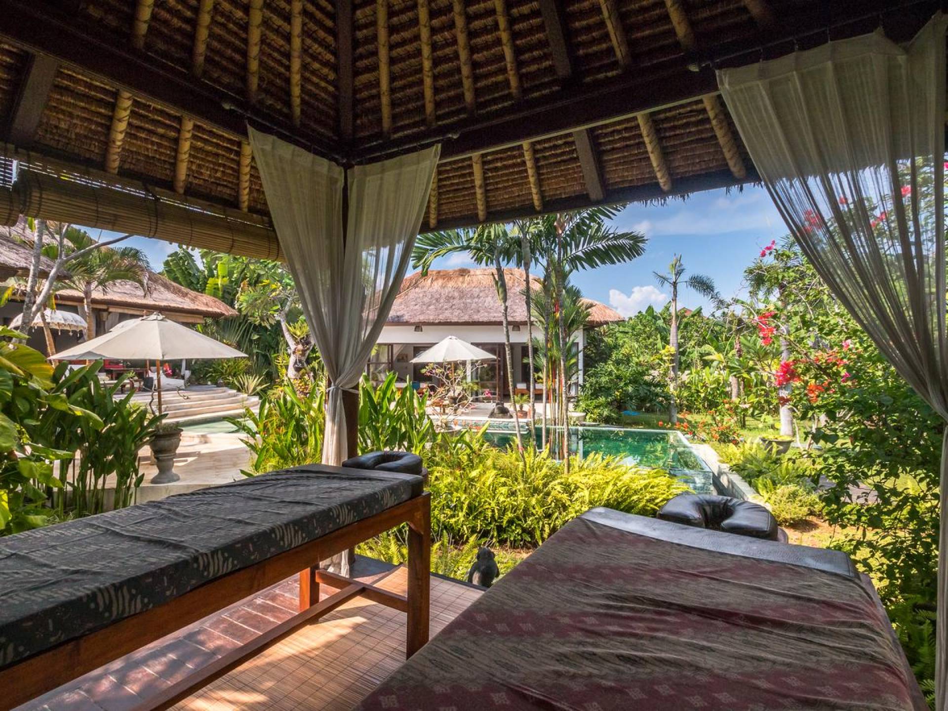 Der hölzerne Esstisch für sechs Personen ist perfekt zum Essen und Trinken bei guten Gesprächen und Essen, während die Küchenfensterbar mit Hockern draußen auf der Veranda einen schönen, ungezwungenen Treffpunkt zum Beisammensitzen und ein paar kalte Bintang-Biere bietet am Nachmittag, da die Kinder fröhlich in den Pool springen und wieder herausspringen können. Der atemberaubende Infinity-Pool ist von Sonnenliegen für diejenigen umgeben, die sich bräunen möchten, und bequemen Tagesbetten, die von charmanten traditionellen balinesischen Sonnenschirmen beschattet werden. Der Pavillon ist der perfekte Ort, um sich zu entspannen und der Hitze mit etwas aus der Bücherbibliothek der Villa zu entfliehen, und im privaten Spa-Pavillon, der irgendwo zwischen tropischem Grün versteckt ist, können Sie sich bei einer entspannenden balinesischen Massage erholen.