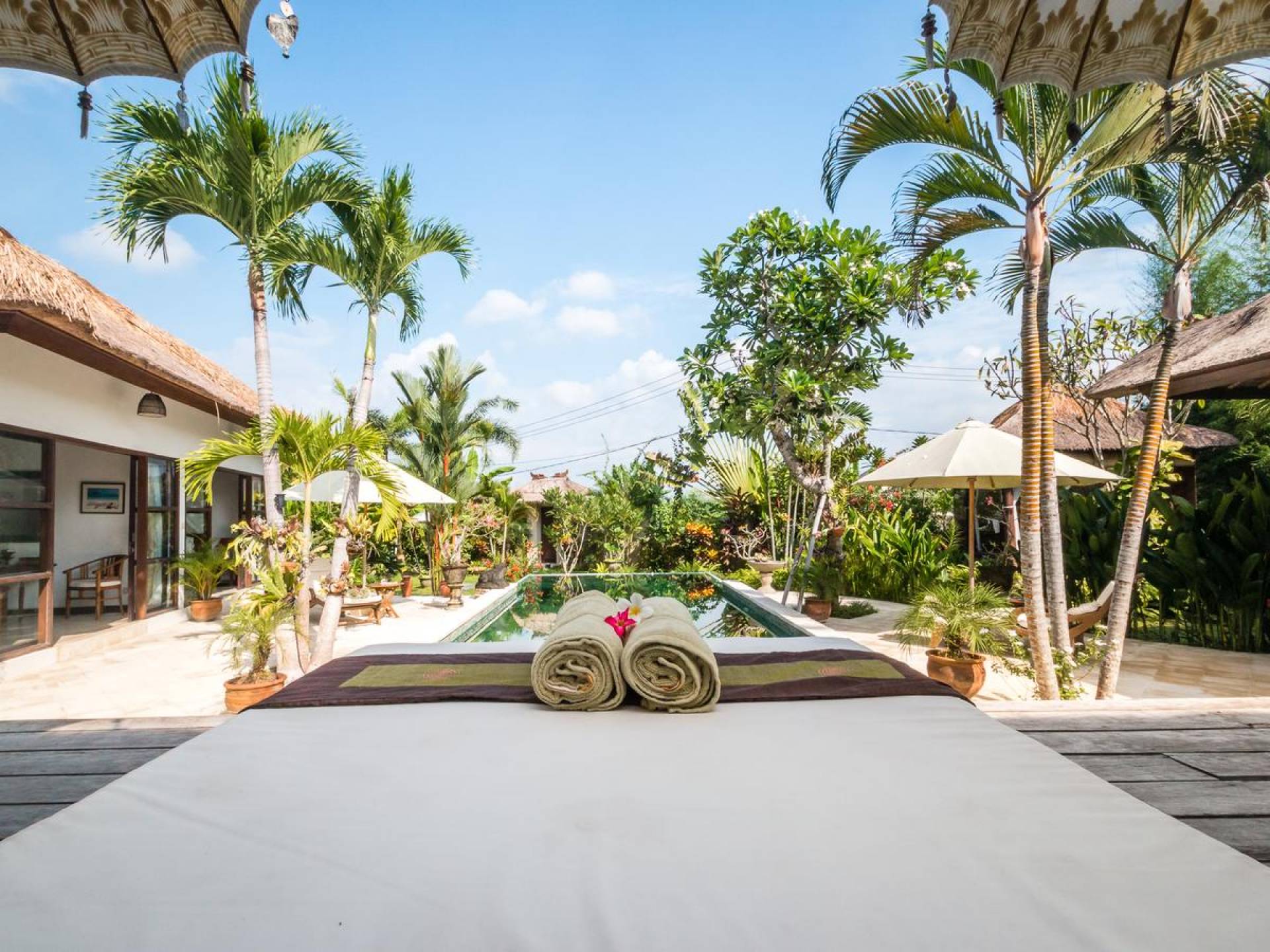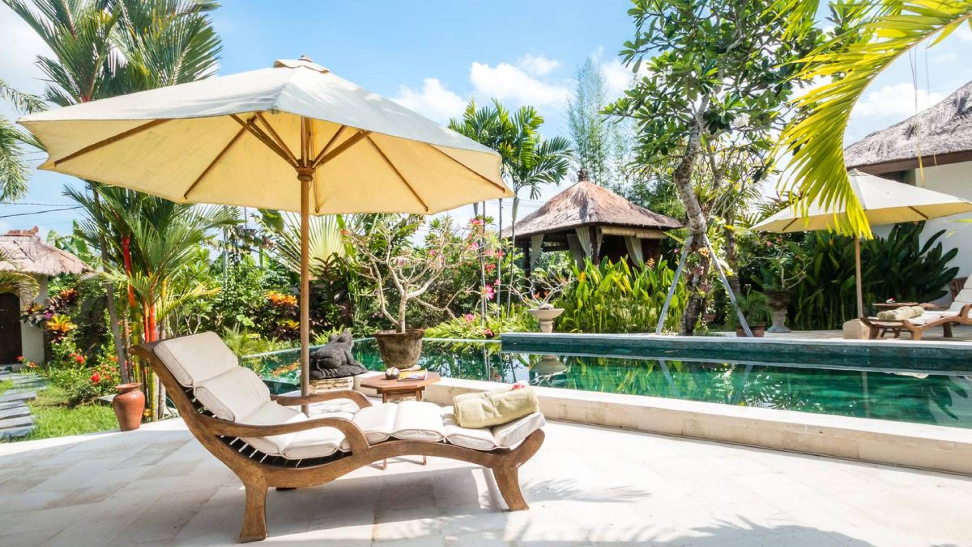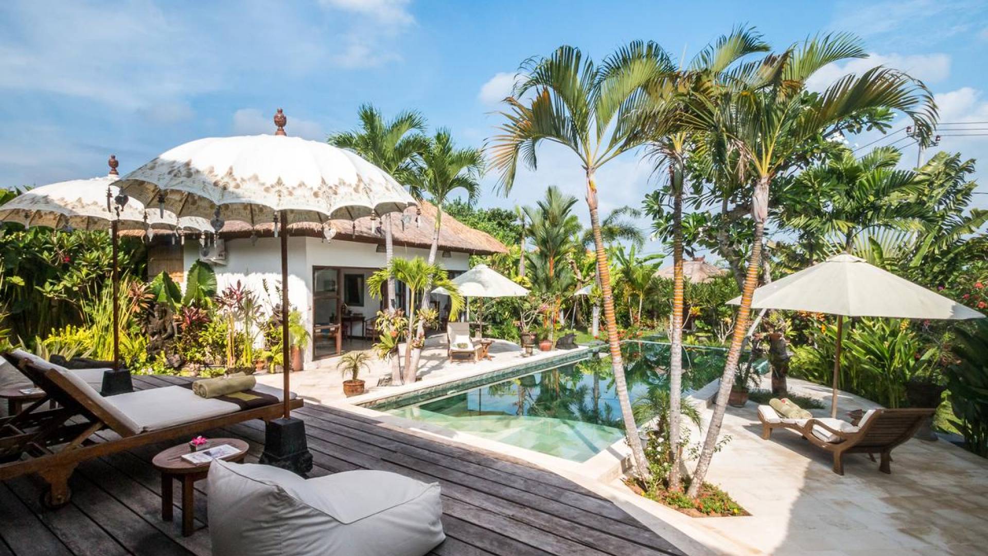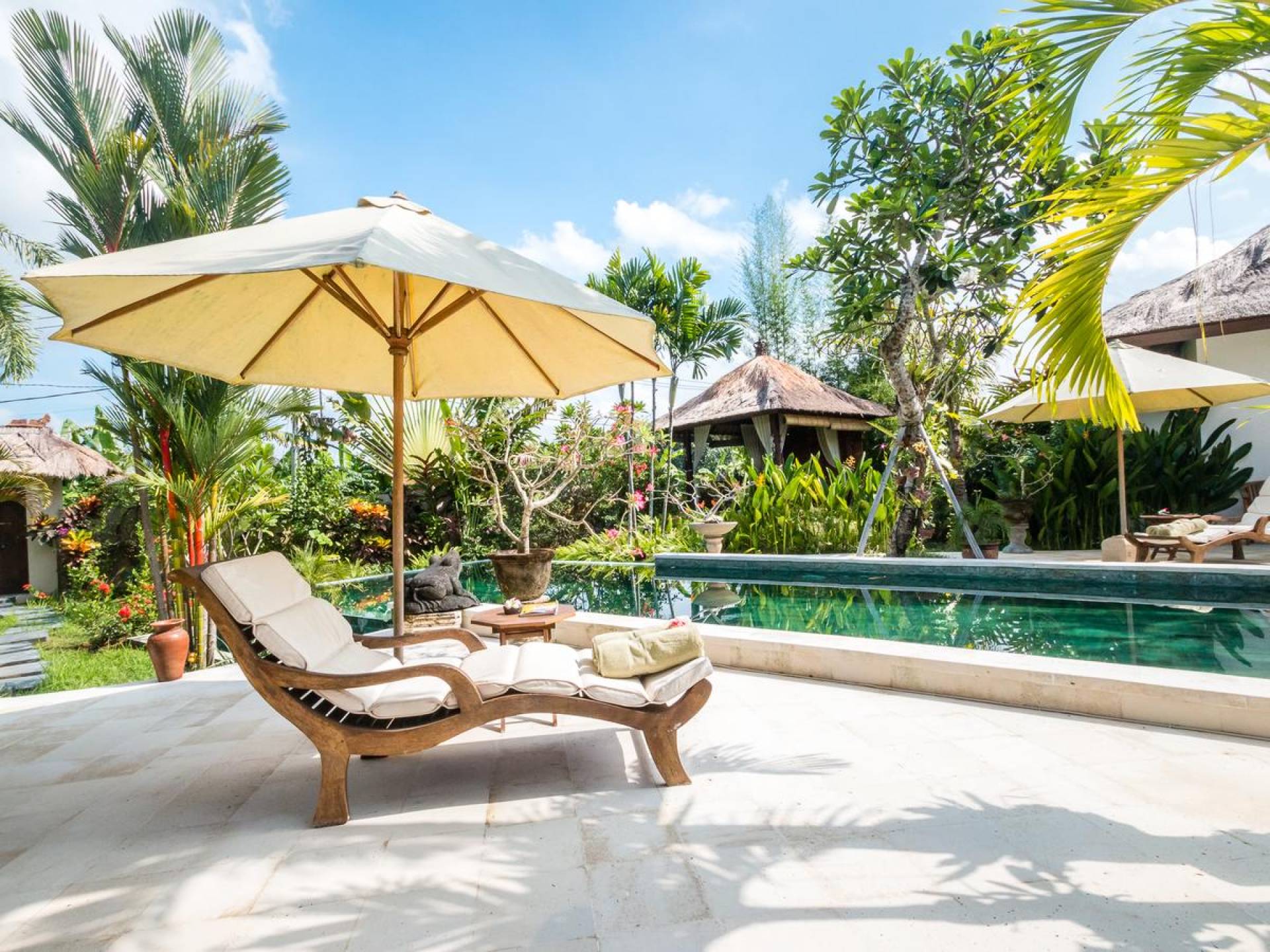 Der hölzerne Esstisch für sechs Personen ist perfekt zum Essen und Trinken bei guten Gesprächen und Essen, während die Küchenfensterbar mit Hockern draußen auf der Veranda einen schönen, ungezwungenen Treffpunkt zum Beisammensitzen und ein paar kalte Bintang-Biere bietet am Nachmittag, da die Kinder fröhlich in den Pool springen und wieder herausspringen können. Der atemberaubende Infinity-Pool ist von Sonnenliegen für diejenigen umgeben, die sich bräunen möchten, und bequemen Tagesbetten, die von charmanten traditionellen balinesischen Sonnenschirmen beschattet werden. Der Pavillon ist der perfekte Ort, um sich zu entspannen und der Hitze mit etwas aus der Bücherbibliothek der Villa zu entfliehen, und im privaten Spa-Pavillon, der irgendwo zwischen tropischem Grün versteckt ist, können Sie sich bei einer entspannenden balinesischen Massage erholen.