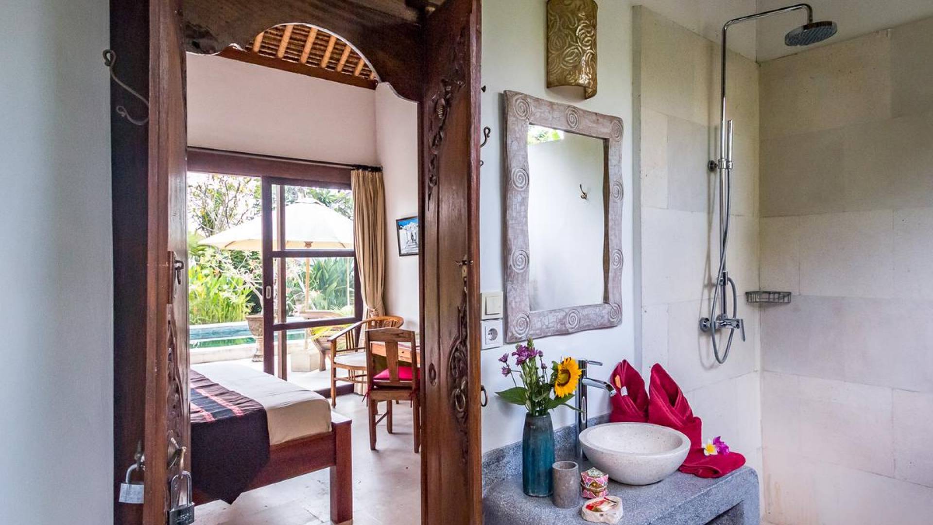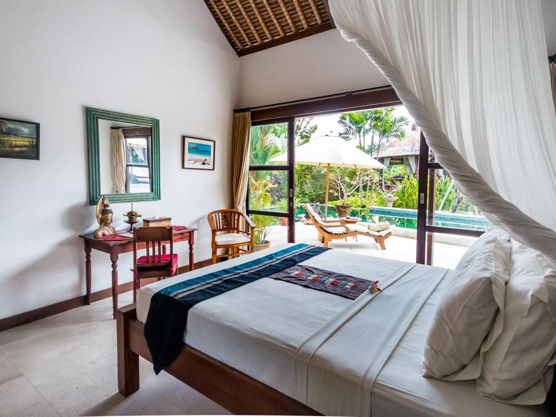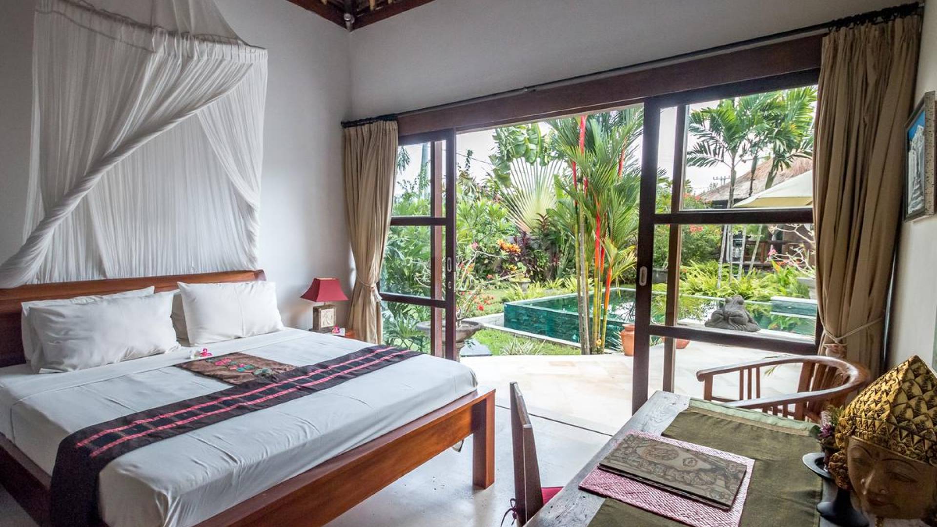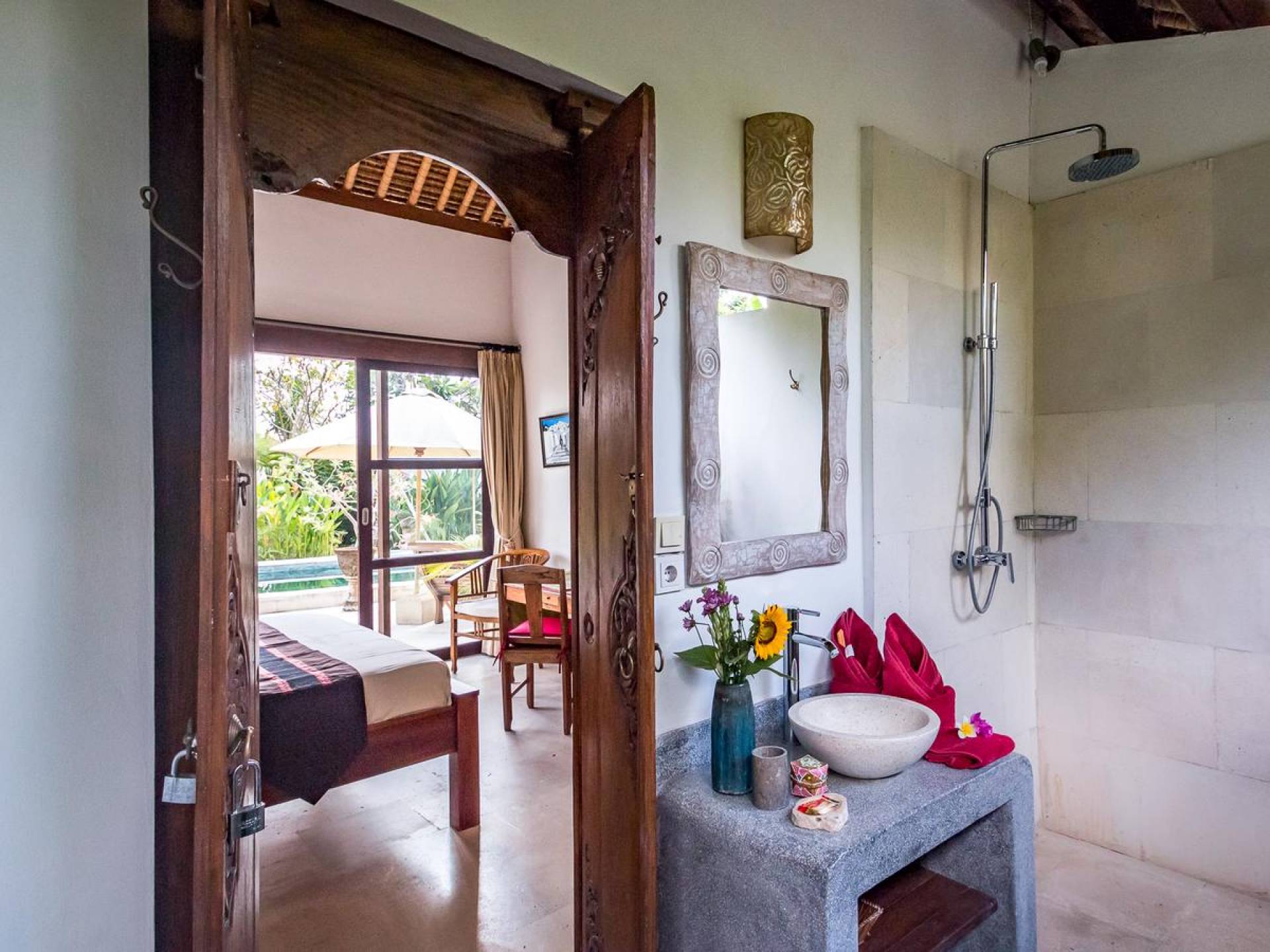 Der hölzerne Esstisch für sechs Personen ist perfekt zum Essen und Trinken bei guten Gesprächen und Essen, während die Küchenfensterbar mit Hockern draußen auf der Veranda einen schönen, ungezwungenen Treffpunkt zum Beisammensitzen und ein paar kalte Bintang-Biere bietet am Nachmittag, da die Kinder fröhlich in den Pool springen und wieder herausspringen können. Der atemberaubende Infinity-Pool ist von Sonnenliegen für diejenigen umgeben, die sich bräunen möchten, und bequemen Tagesbetten, die von charmanten traditionellen balinesischen Sonnenschirmen beschattet werden. Der Pavillon ist der perfekte Ort, um sich zu entspannen und der Hitze mit etwas aus der Bücherbibliothek der Villa zu entfliehen, und im privaten Spa-Pavillon, der irgendwo zwischen tropischem Grün versteckt ist, können Sie sich bei einer entspannenden balinesischen Massage erholen.