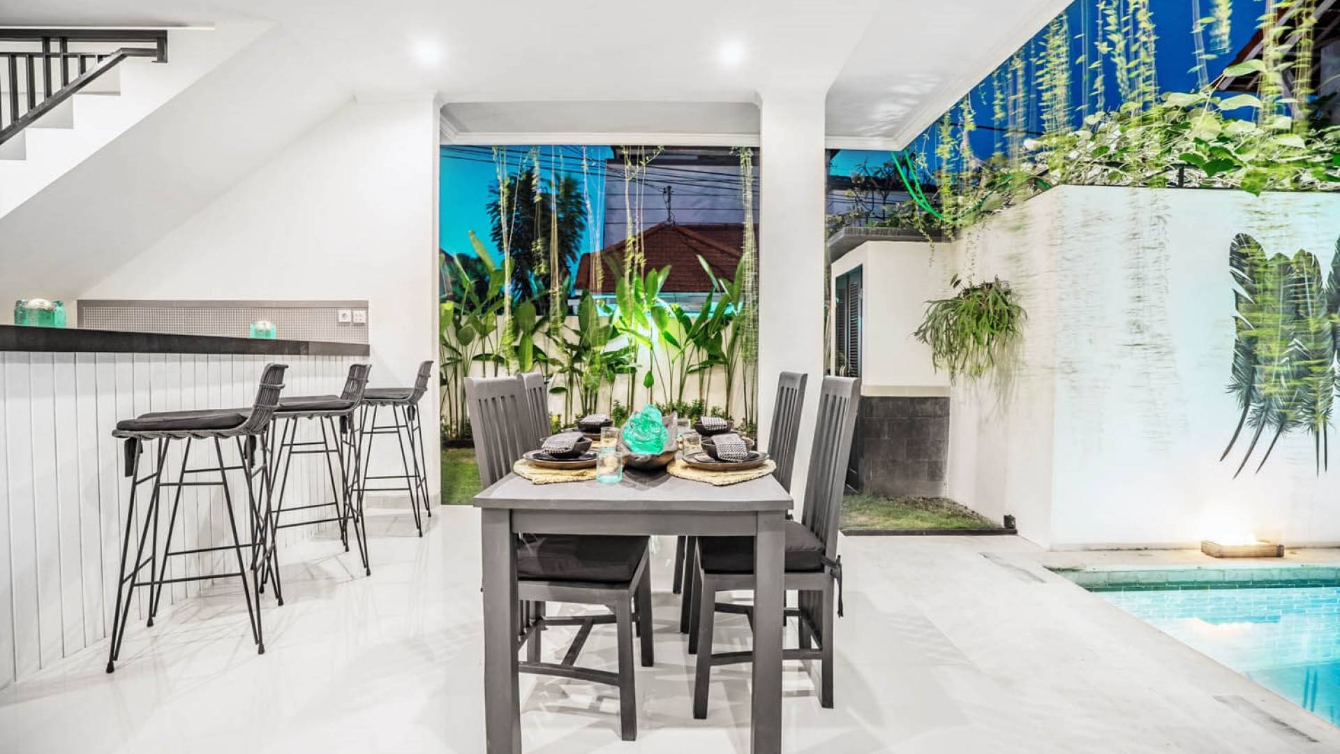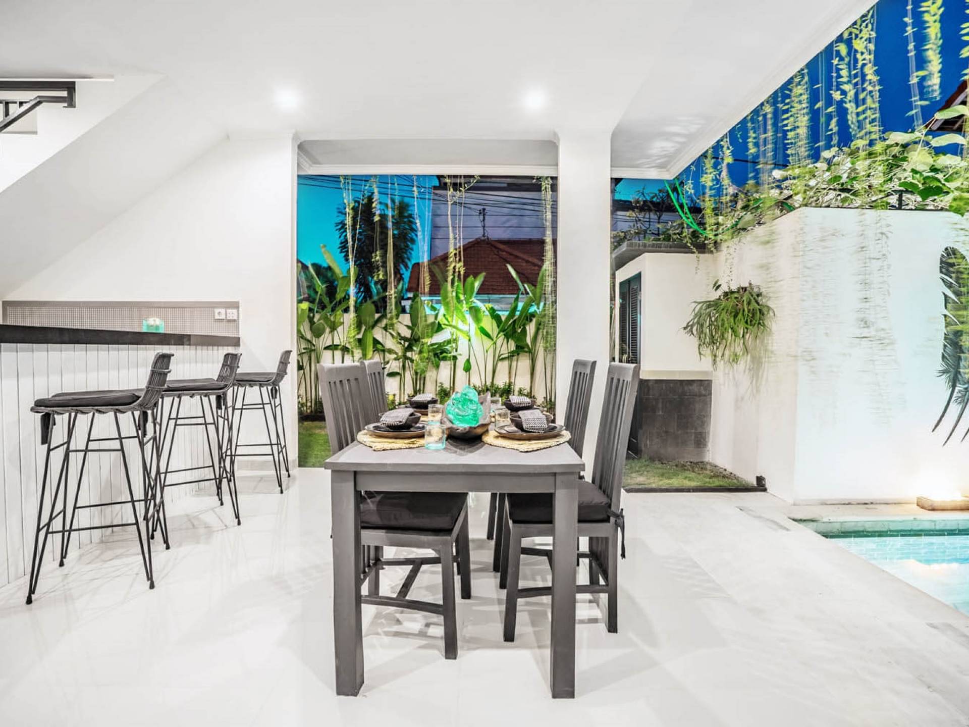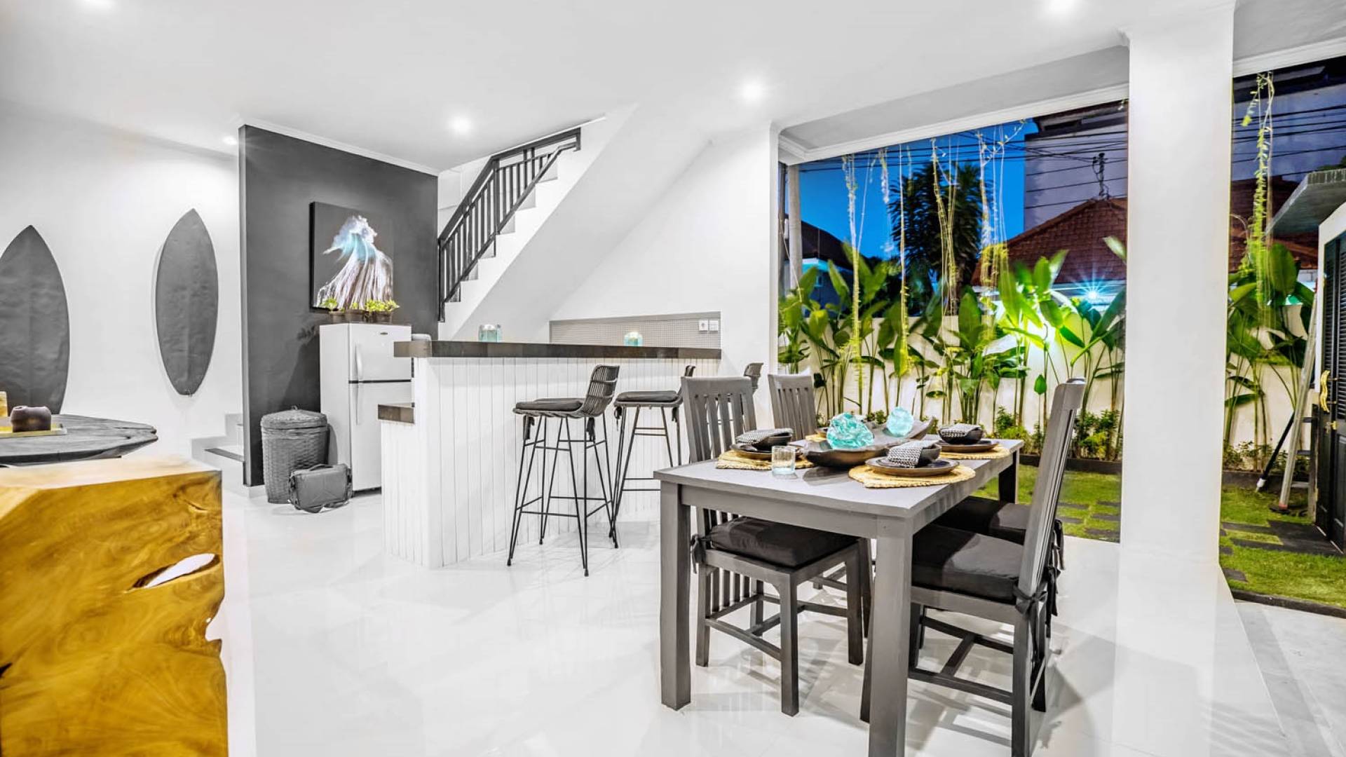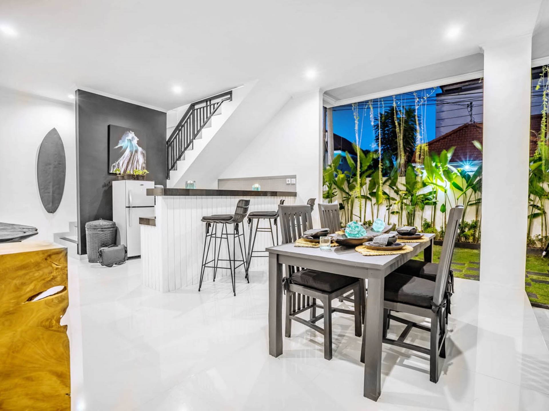 Die hellen und komfortablen Wohnbereiche der Villa Vanilla liegen im Freien und sind mit edlen Möbeln ausgestattet. Das Erdgeschoss verfügt über den Essbereich und die voll ausgestattete Küche, während sich im Obergeschoss auf der offenen Terrasse ein moderner Sitzbereich befindet. Ideal, um sich mit Ihren Lieben zu treffen, können Sie Ihre eigenen hausgemachten Mahlzeiten zubereiten oder einen Privatkoch für ein balinesisches Festessen arrangieren. Speisen Sie am Pool am dekadenten Esstisch für einen unvergesslichen Abend. Genießen Sie die tropische Brise, die an warmen Abenden durchweht, und genießen Sie die schöne Zeit mit Ihrer Familie.