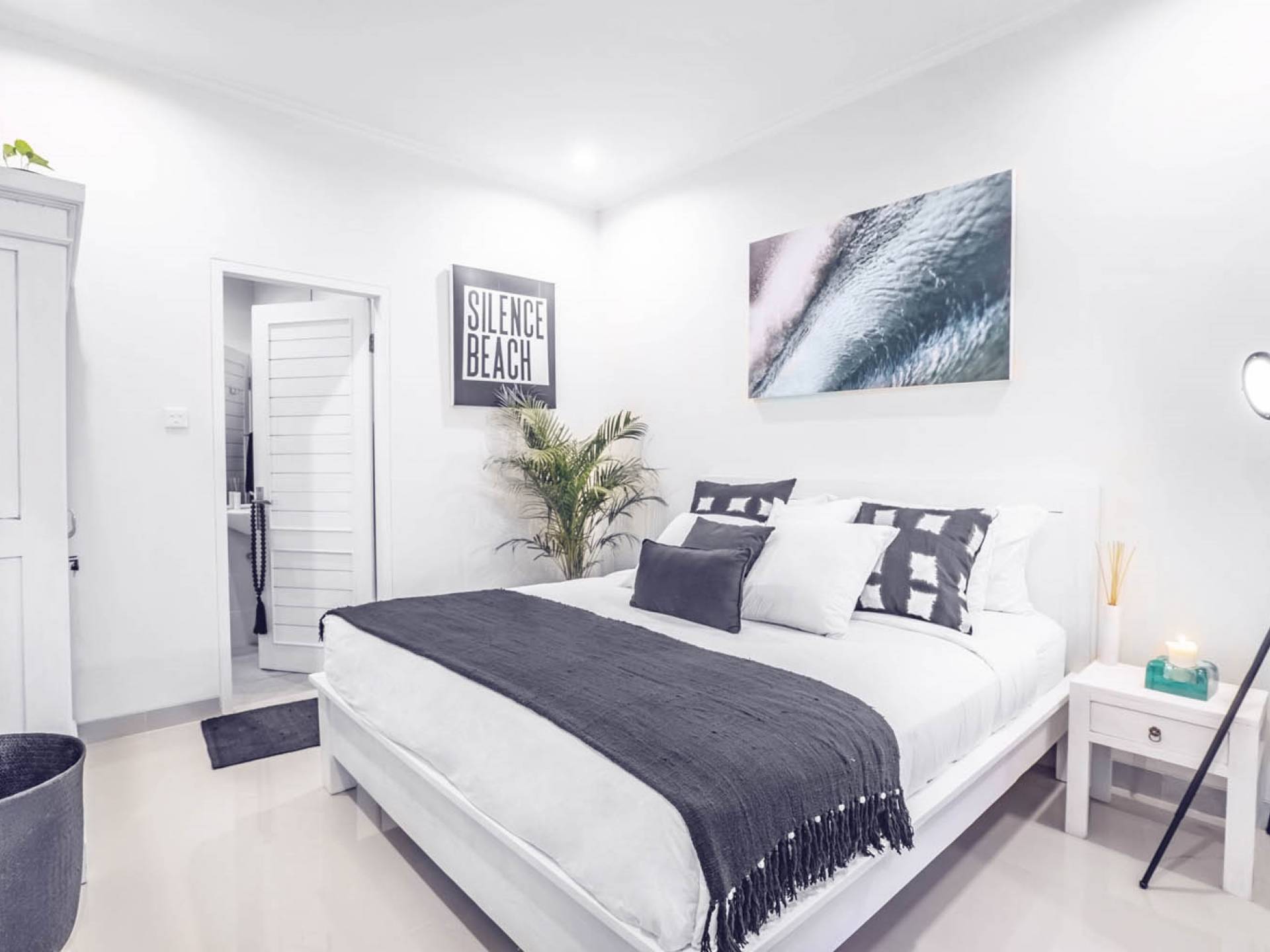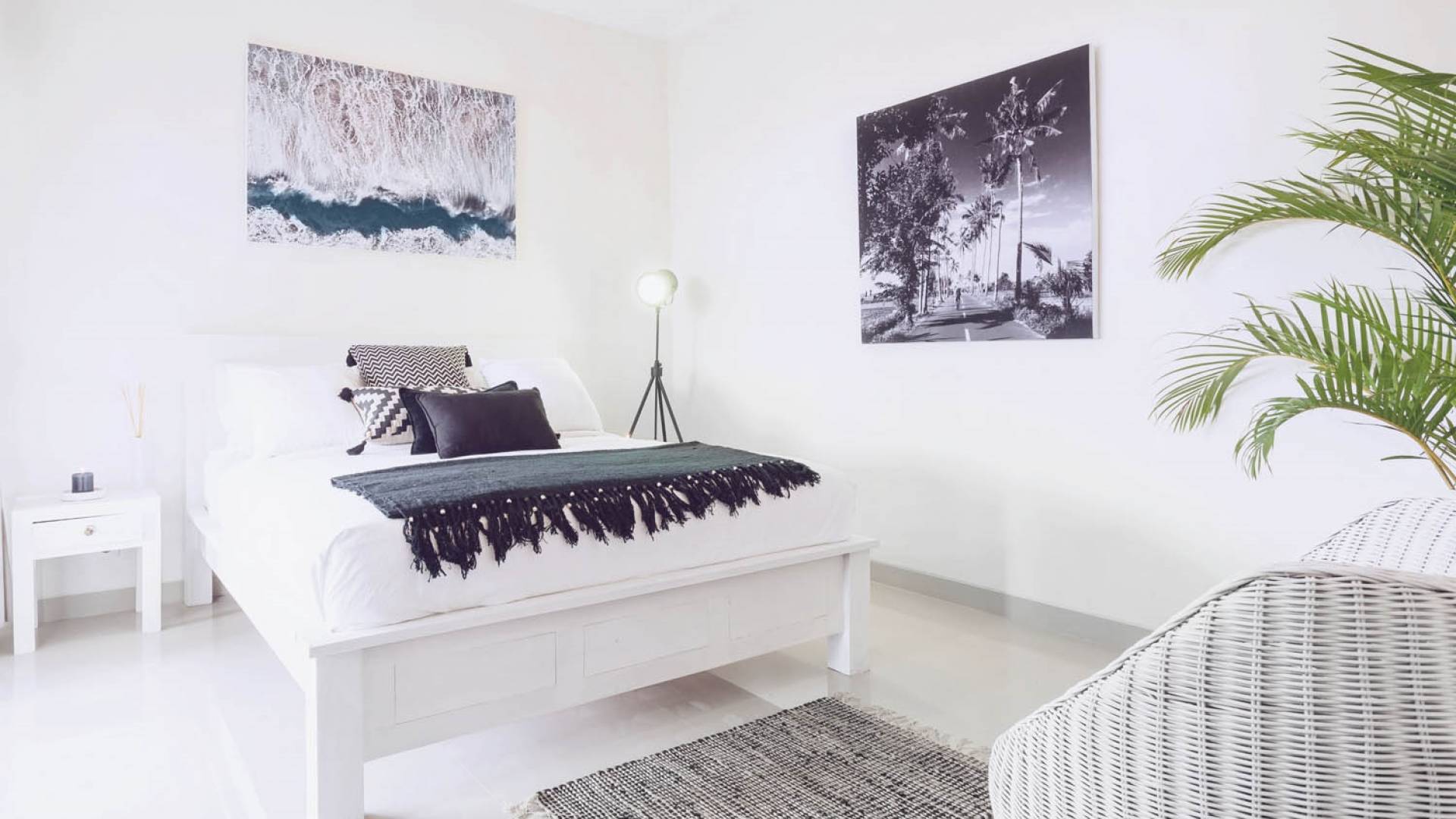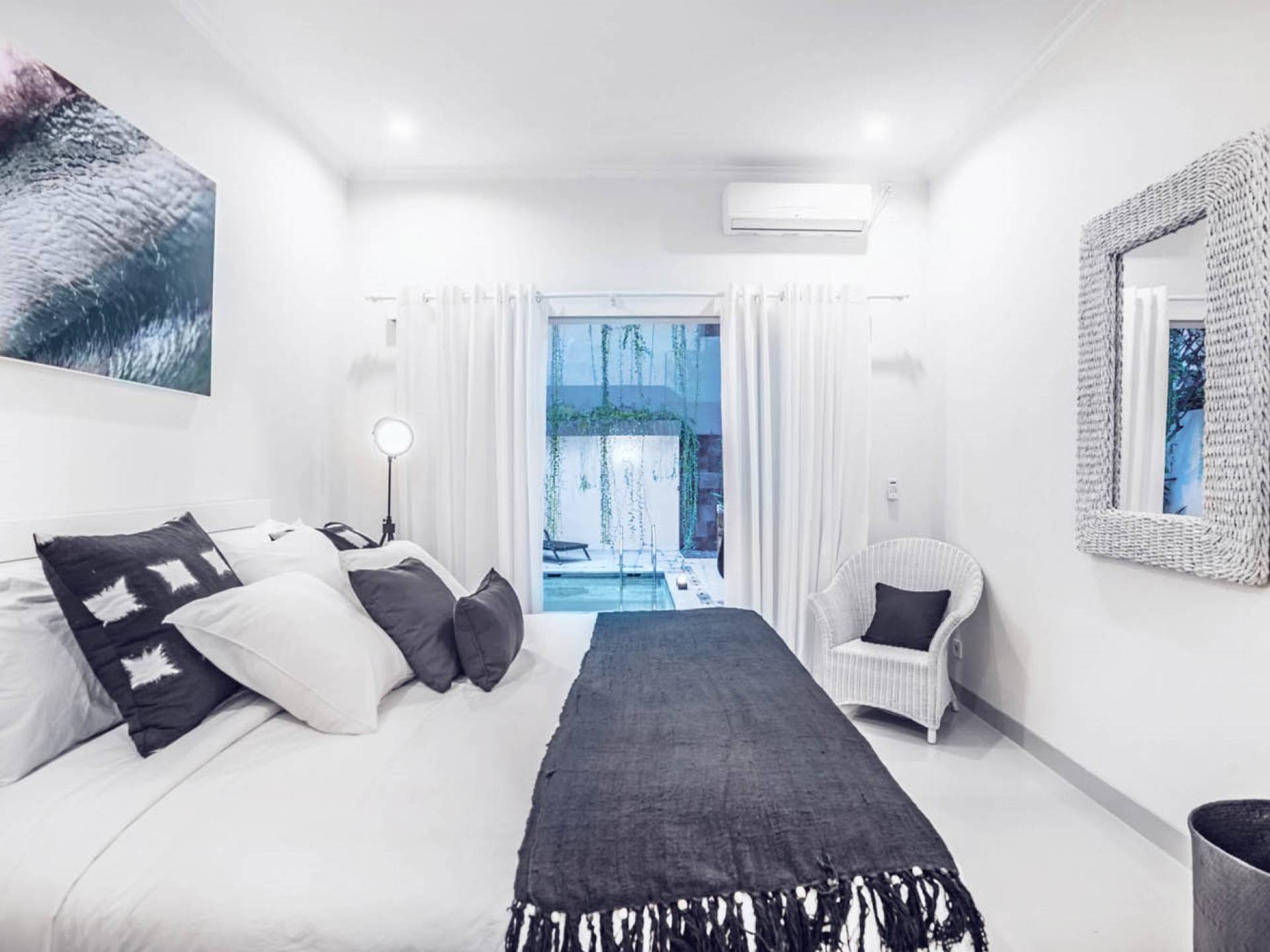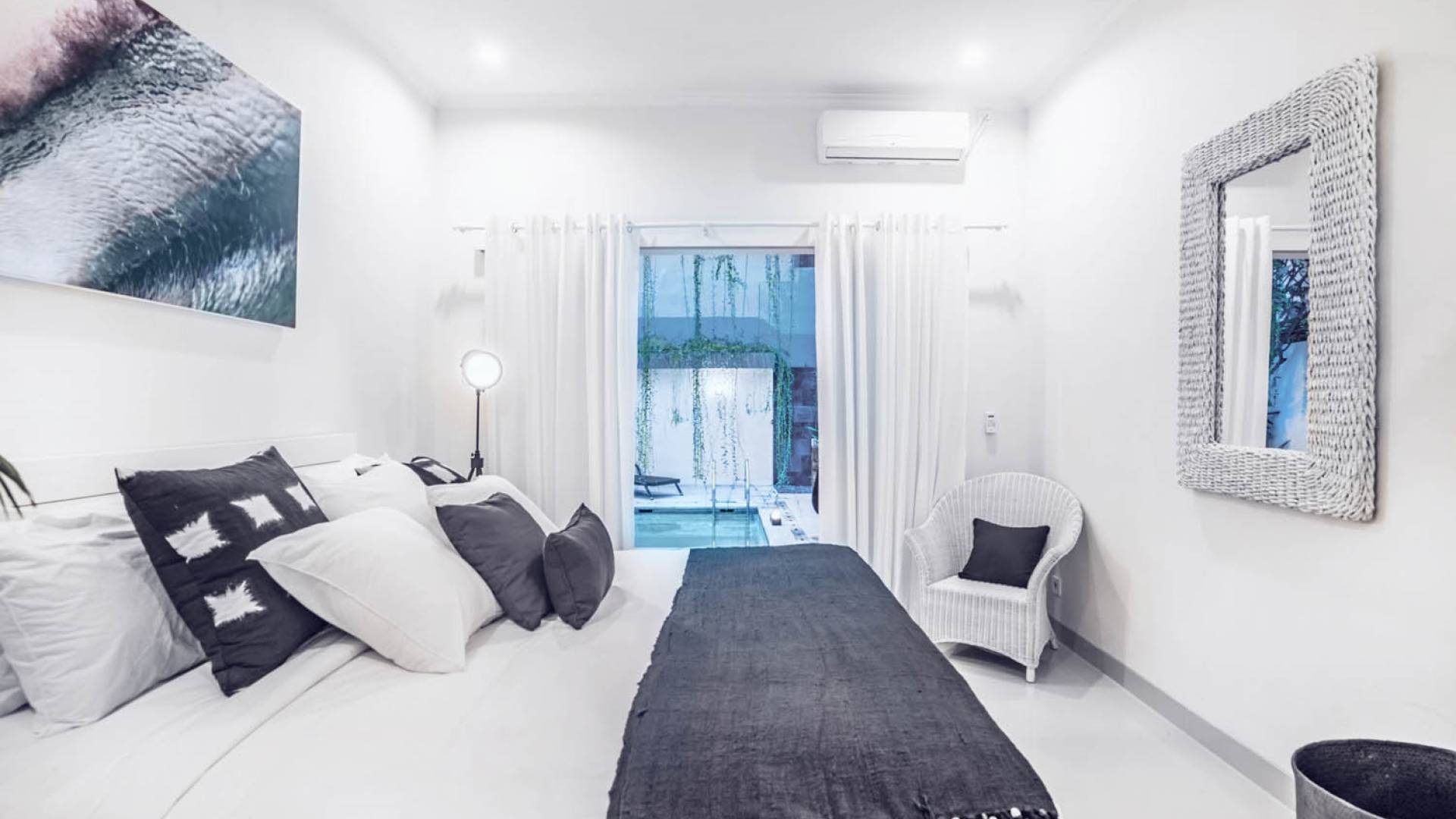 Alle drei Schlafzimmer in der Villa Vanilla sind modern, minimalistisch und komfortabel mit weichen Betten, luxuriöser Bettwäsche, weiß getünchten Kleiderschränken und eigenen Badezimmern. Sie können sich nach einem Tag draußen in der Hitze zurücklehnen und die kühle Klimaanlage genießen, ein entspannendes Mittagsschläfchen halten oder Ihr Lieblingsbuch lesen. Malerisch mit schwarzen und weißen Leinwänden und tropischem Grün dekoriert, ist es ein ruhiger Zufluchtsort. Sie werden die Villa Vanilla nie wieder verlassen wollen, um eine friedliche Nachtruhe zu gewährleisten.