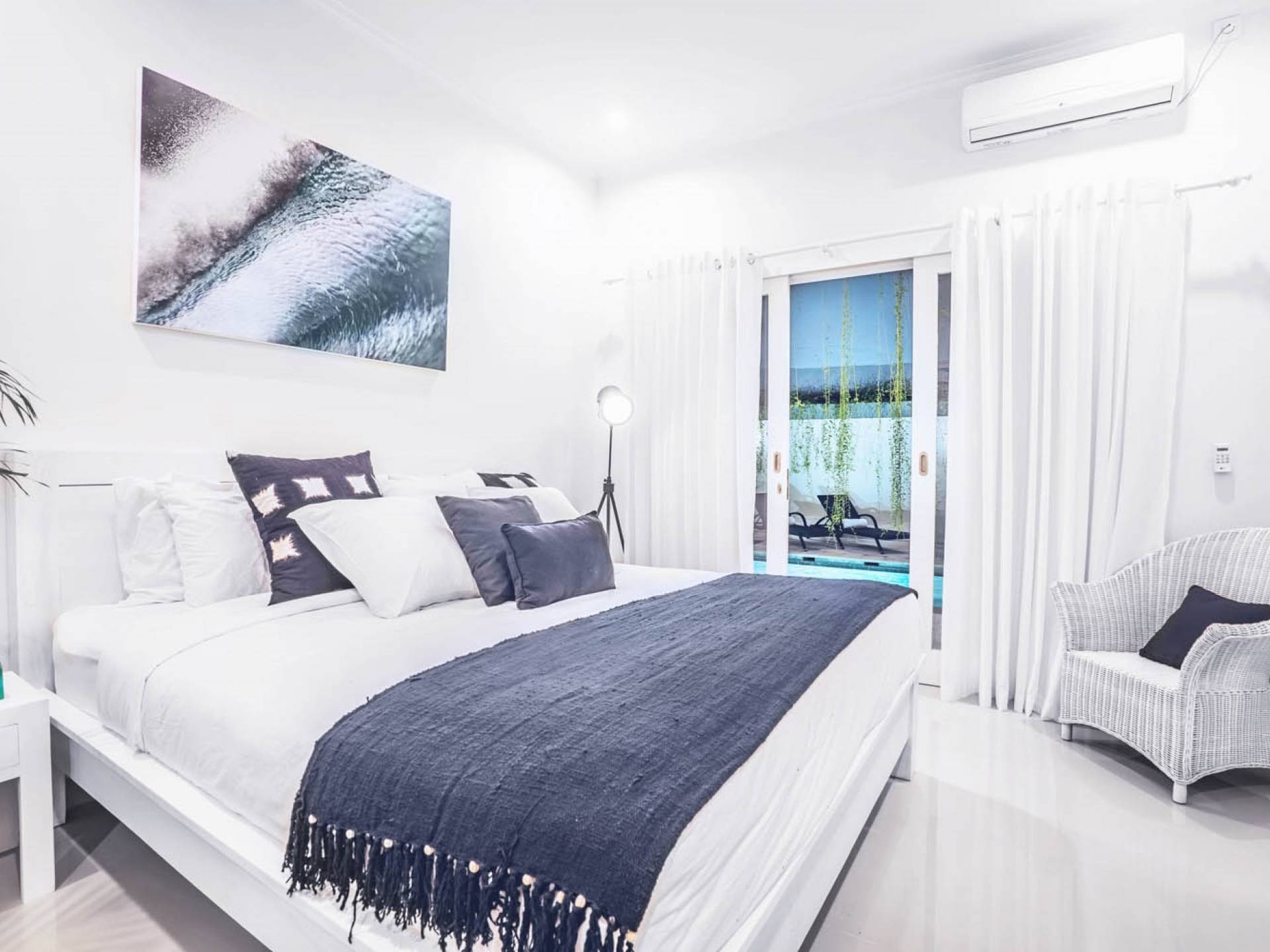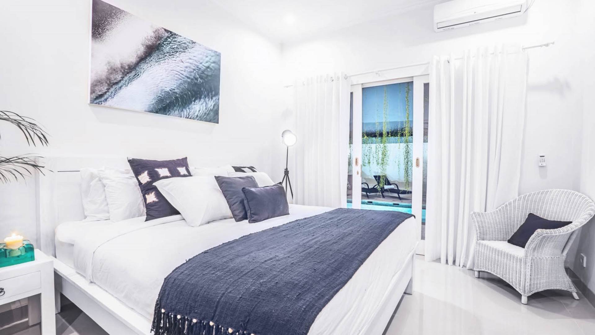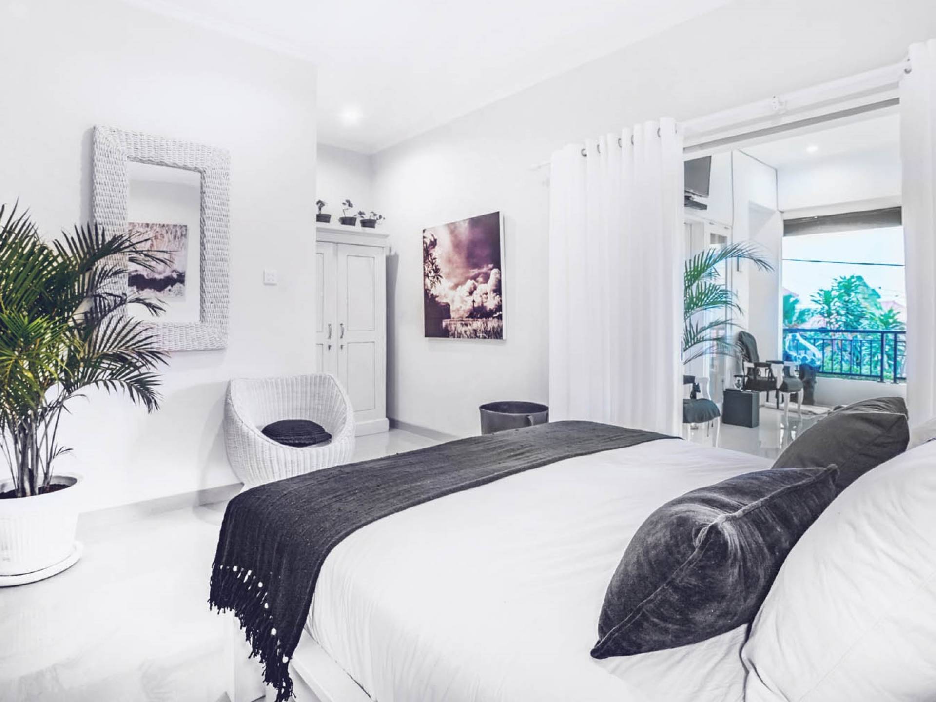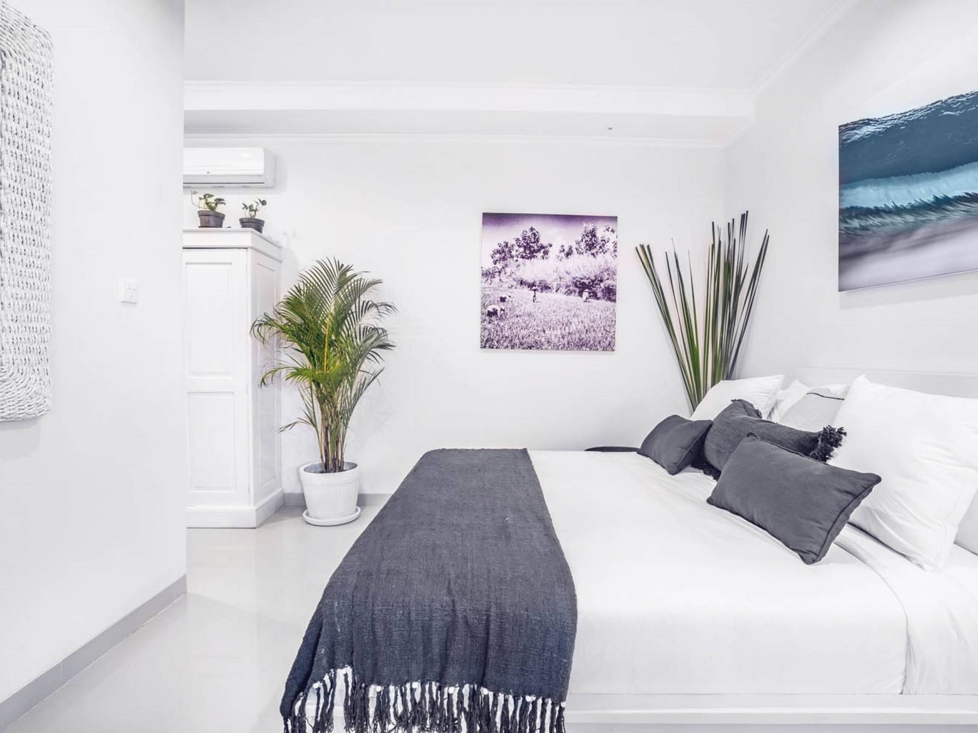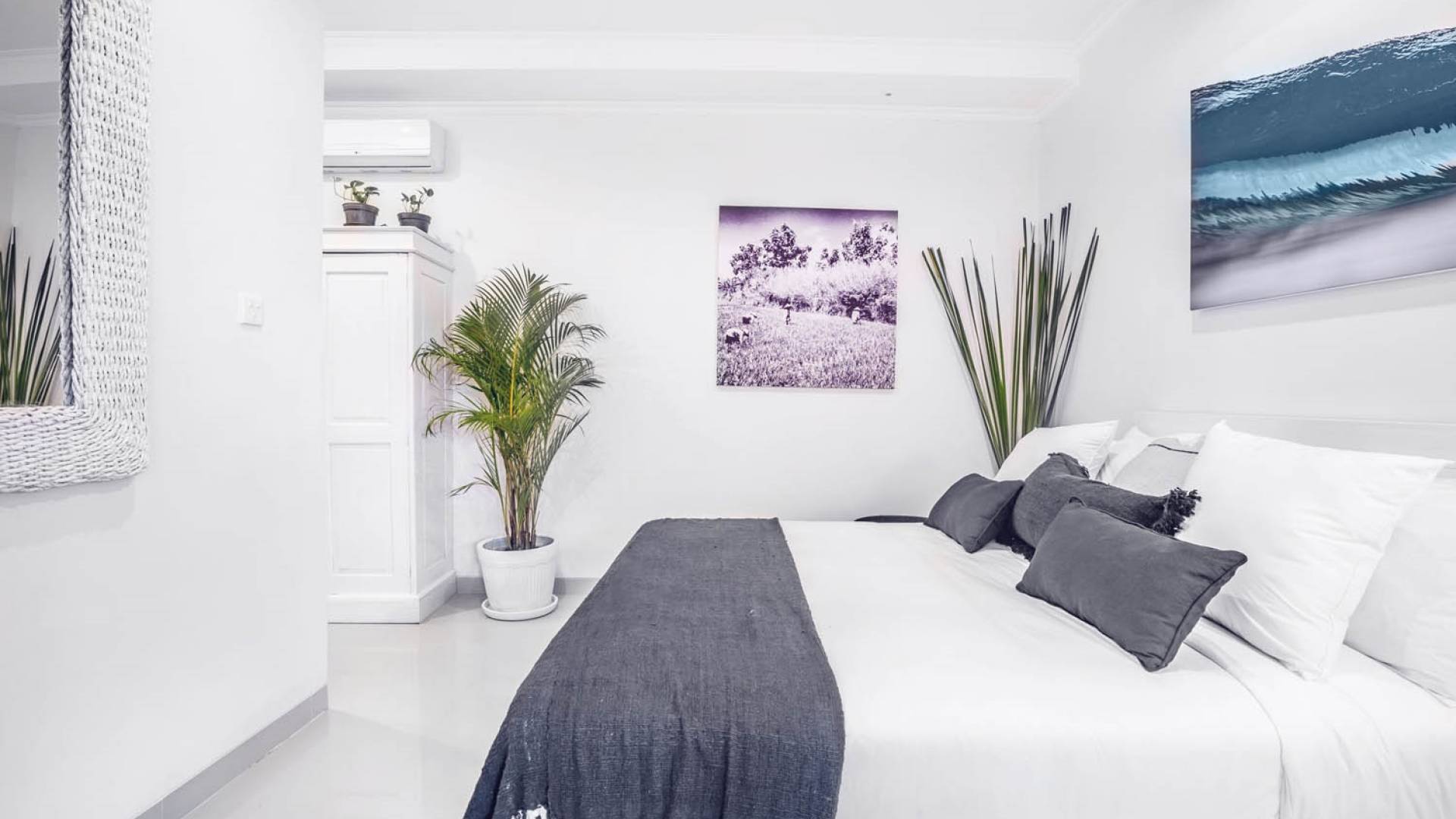 Alle drei Schlafzimmer in der Villa Vanilla sind modern, minimalistisch und komfortabel mit weichen Betten, luxuriöser Bettwäsche, weiß getünchten Kleiderschränken und eigenen Badezimmern. Sie können sich nach einem Tag draußen in der Hitze zurücklehnen und die kühle Klimaanlage genießen, ein entspannendes Mittagsschläfchen halten oder Ihr Lieblingsbuch lesen. Malerisch mit schwarzen und weißen Leinwänden und tropischem Grün dekoriert, ist es ein ruhiger Zufluchtsort. Sie werden die Villa Vanilla nie wieder verlassen wollen, um eine friedliche Nachtruhe zu gewährleisten.