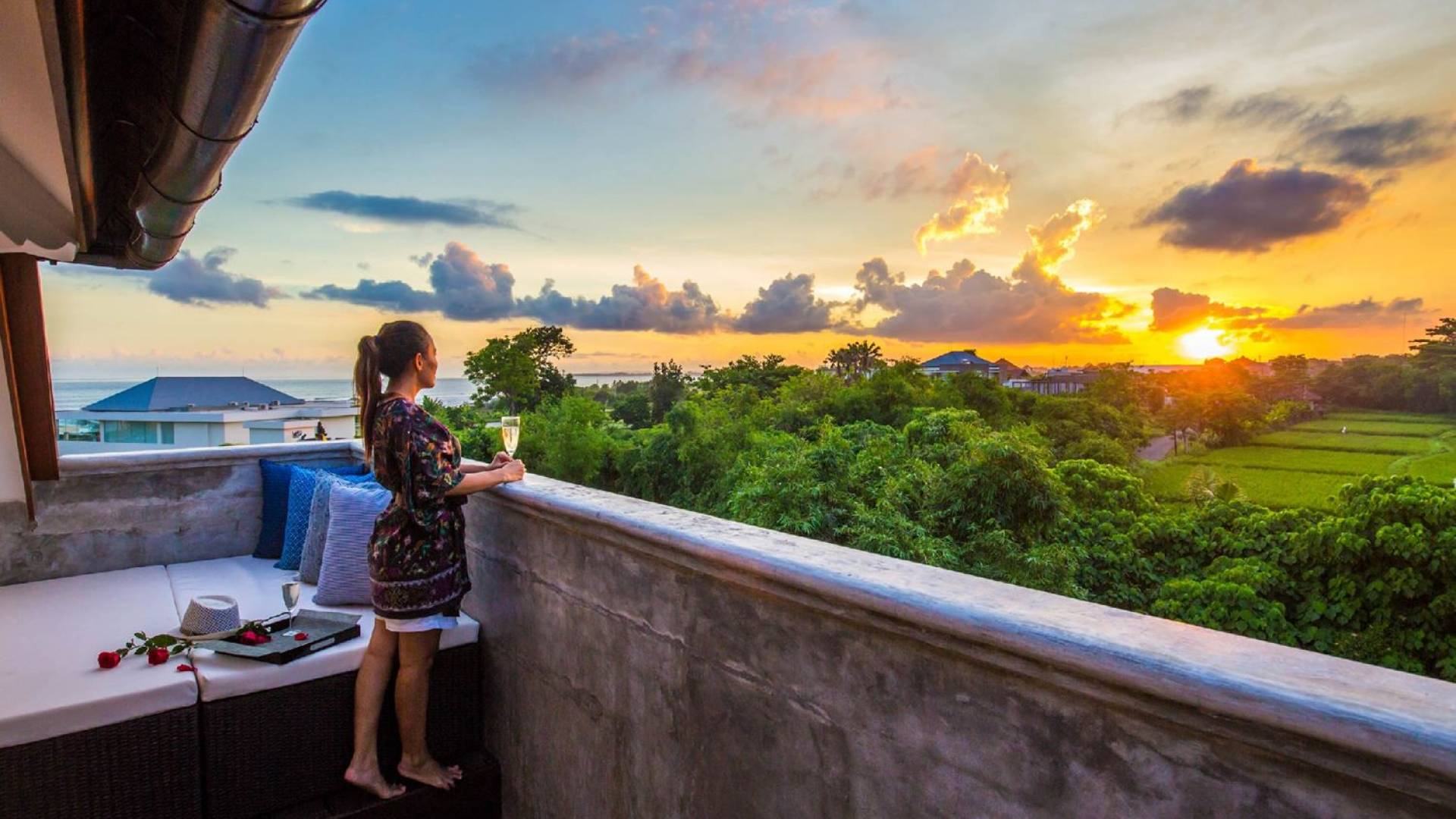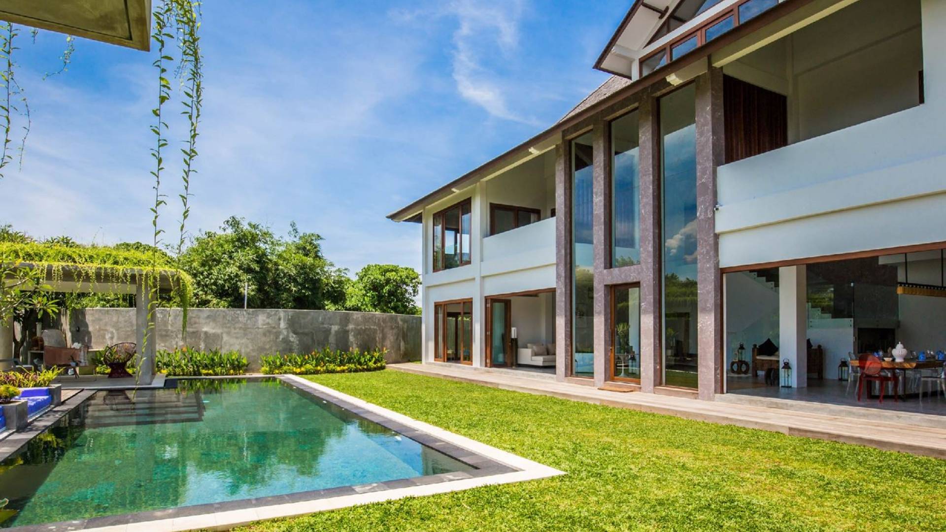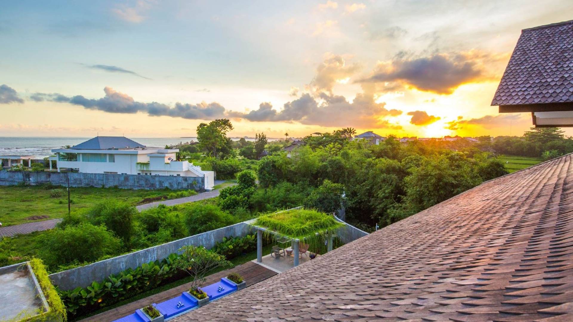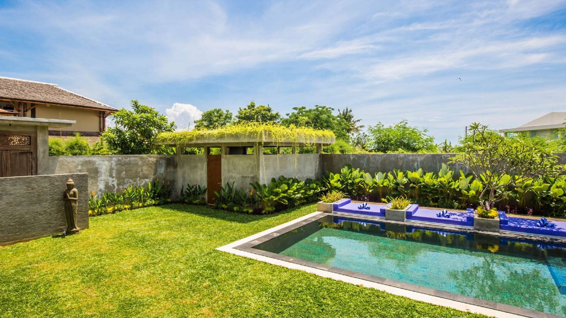 Die Freiluftterrasse auf der dritten Ebene bietet einen atemberaubenden Blick auf die üppig grüne Umgebung, den tiefblauen Ozean und den orangefarbenen Sonnenuntergangshimmel. Kommen Sie hierher, um Cocktails bei Sonnenuntergang zu genießen, und Sie werden von der Aussicht überwältigt sein. Der Garten verfügt über einen gepflegten grünen Rasen, handgeschnitzte balinesische Statuen und einen 14-Meter-Pool mit grünen Natursteinen. Blumen, tropische Pflanzen und Frangipani-Bäume wachsen rund um den Garten der Villa Delfino und bequeme Liegen stehen neben dem Pool für diejenigen, die Sonne tanken und an ihrer Bräune arbeiten möchten. Für diejenigen, die einen schattigen Lounge-Platz im Freien suchen, gibt es den Ballen, der mit bequemen Sesseln ausgestattet ist, um dort zu sitzen und ein Buch zu lesen oder Getränke am Pool zu genießen. Der Garten verfügt auch über einen Grill und einen Holzofen für ein wahres Festmahl, das Sie mit Ihren Lieben im Komfort Ihres eigenen Ferienhauses auf Bali genießen können.