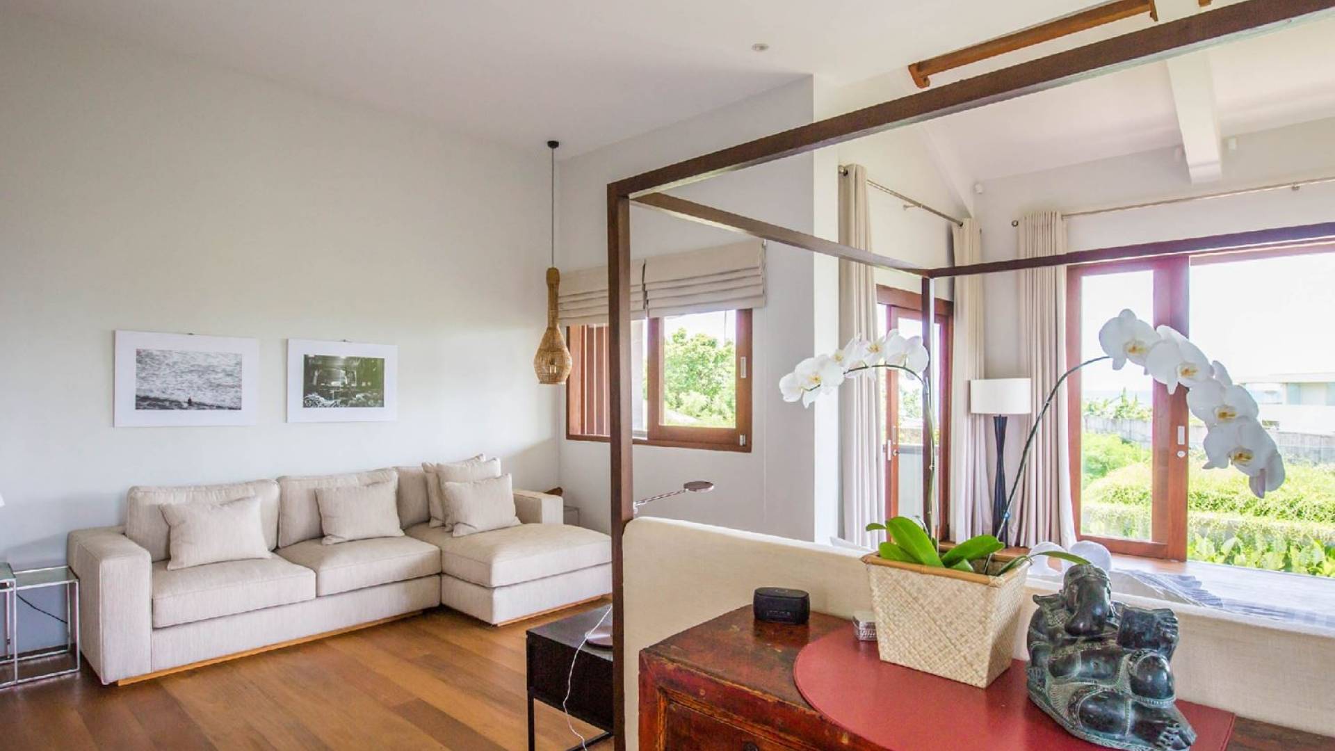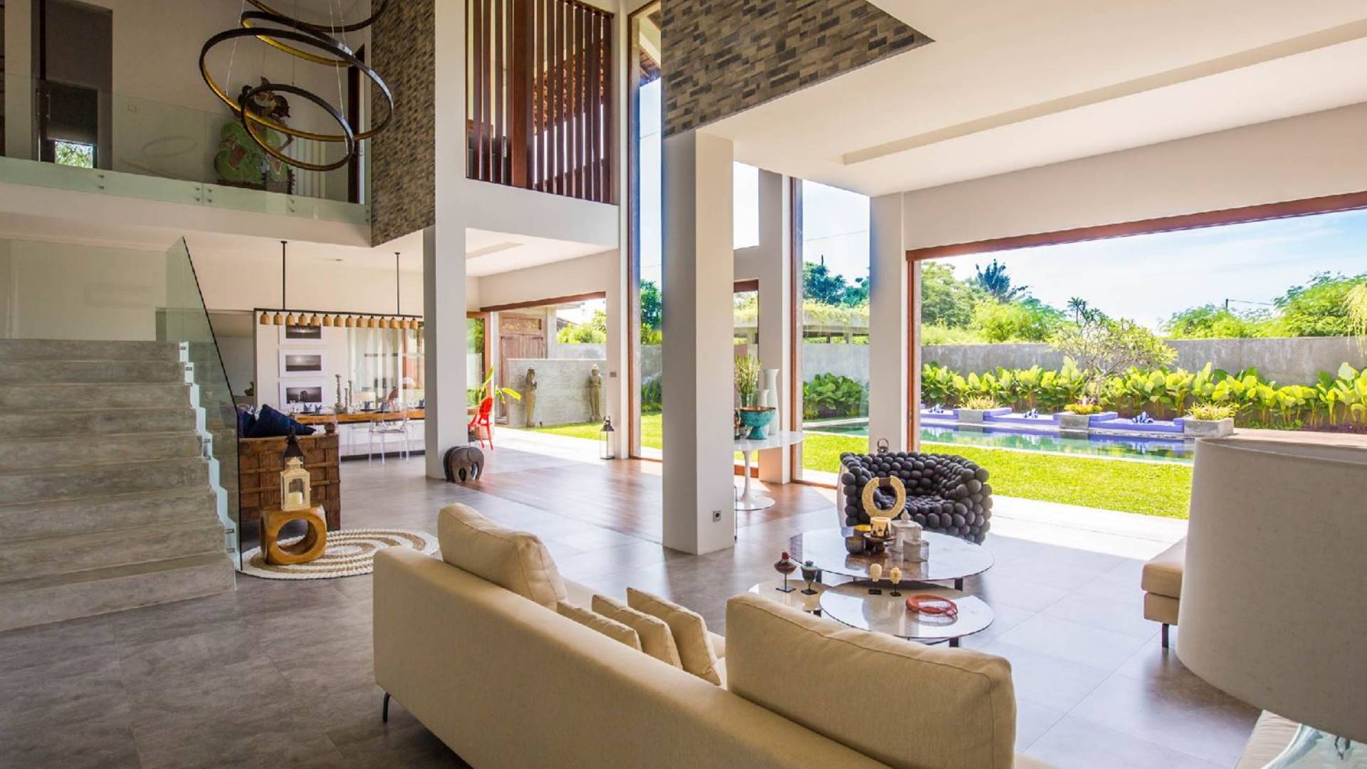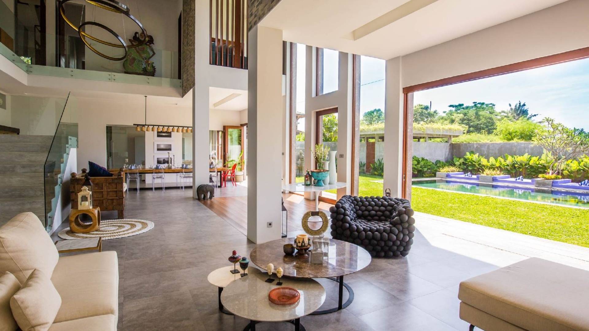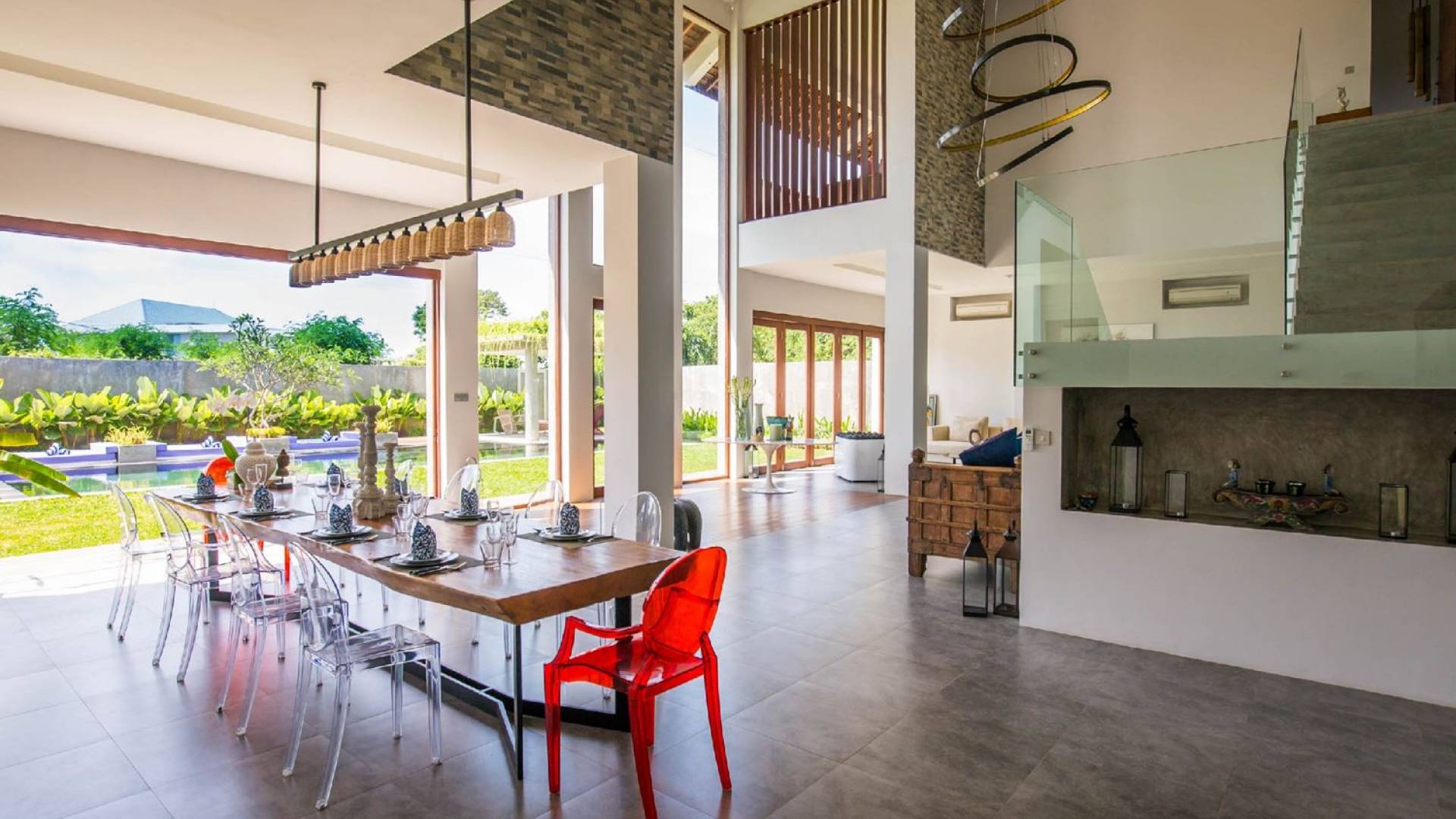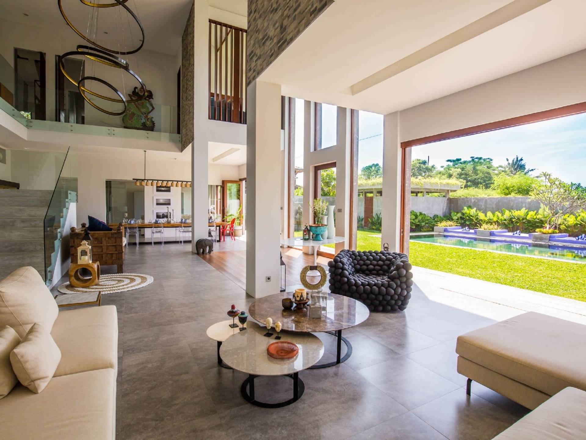 Der Wohnbereich ist von natürlichem Sonnenlicht durchflutet und die Gäste haben den Luxus, zwischen einem klimatisierten Wohnbereich und einem tropischen offenen Wohnbereich mit einfachem Zugang zum Außenbereich der Villa zu wählen. Das zeitgenössische italienische Innendesign umfasst maßgefertigte Lampen und Möbel sowie eine geschmackvolle Sammlung traditioneller Artefakte. Die Villa wurde offensichtlich mit viel Liebe und Auge fürs Detail von den Eigentümern der Villa eingerichtet. Auf der einen Seite befindet sich die Lounge-Ecke mit Sofas und Relaxsesseln, die 3 runde Kaffeetische umgeben. In der Mitte des Wohnbereichs steht ein antikes Sofa aus Teakholz und auf der anderen Seite ein langer, schöner Teakholz-Esstisch, der groß genug ist, um bis zu 10 Personen Platz zu bieten.