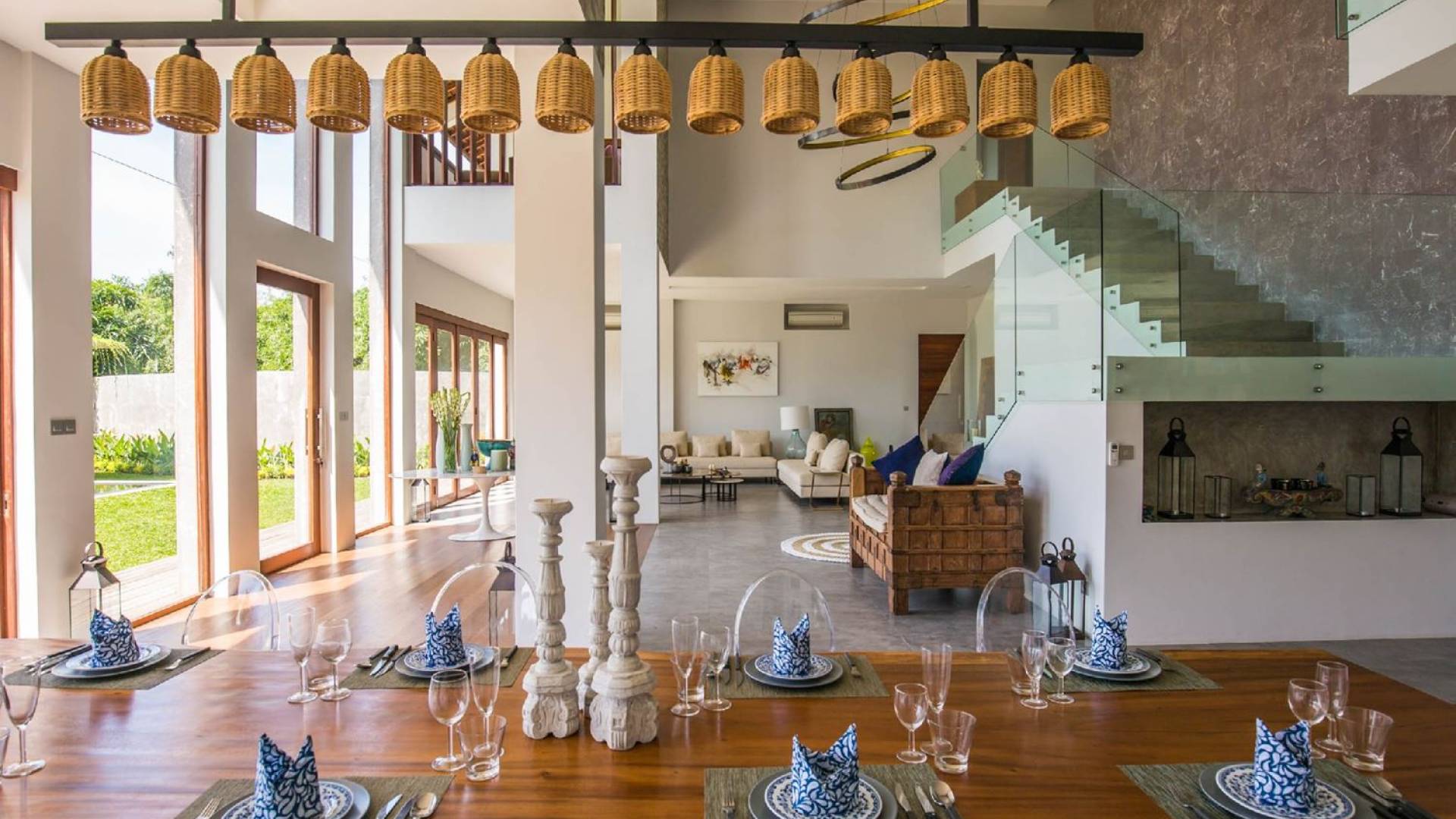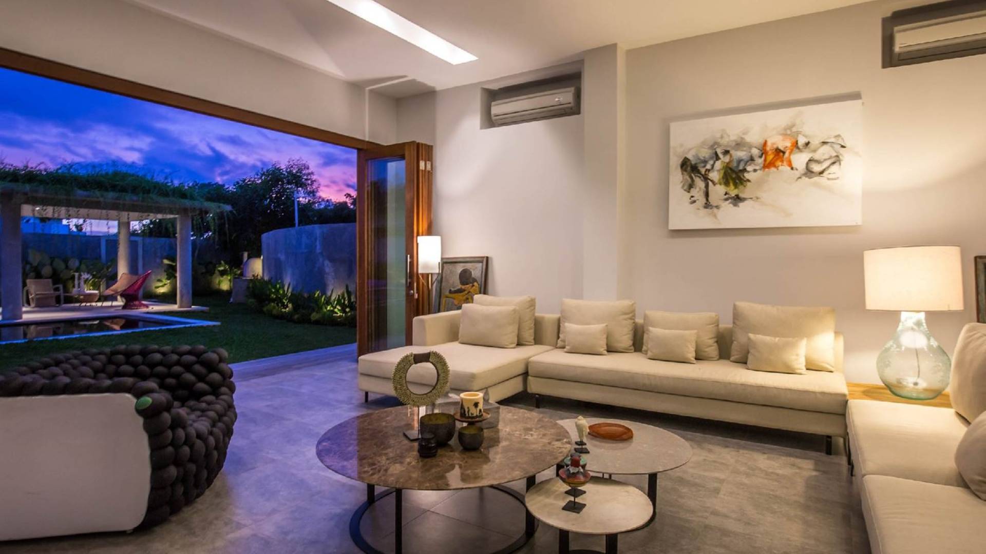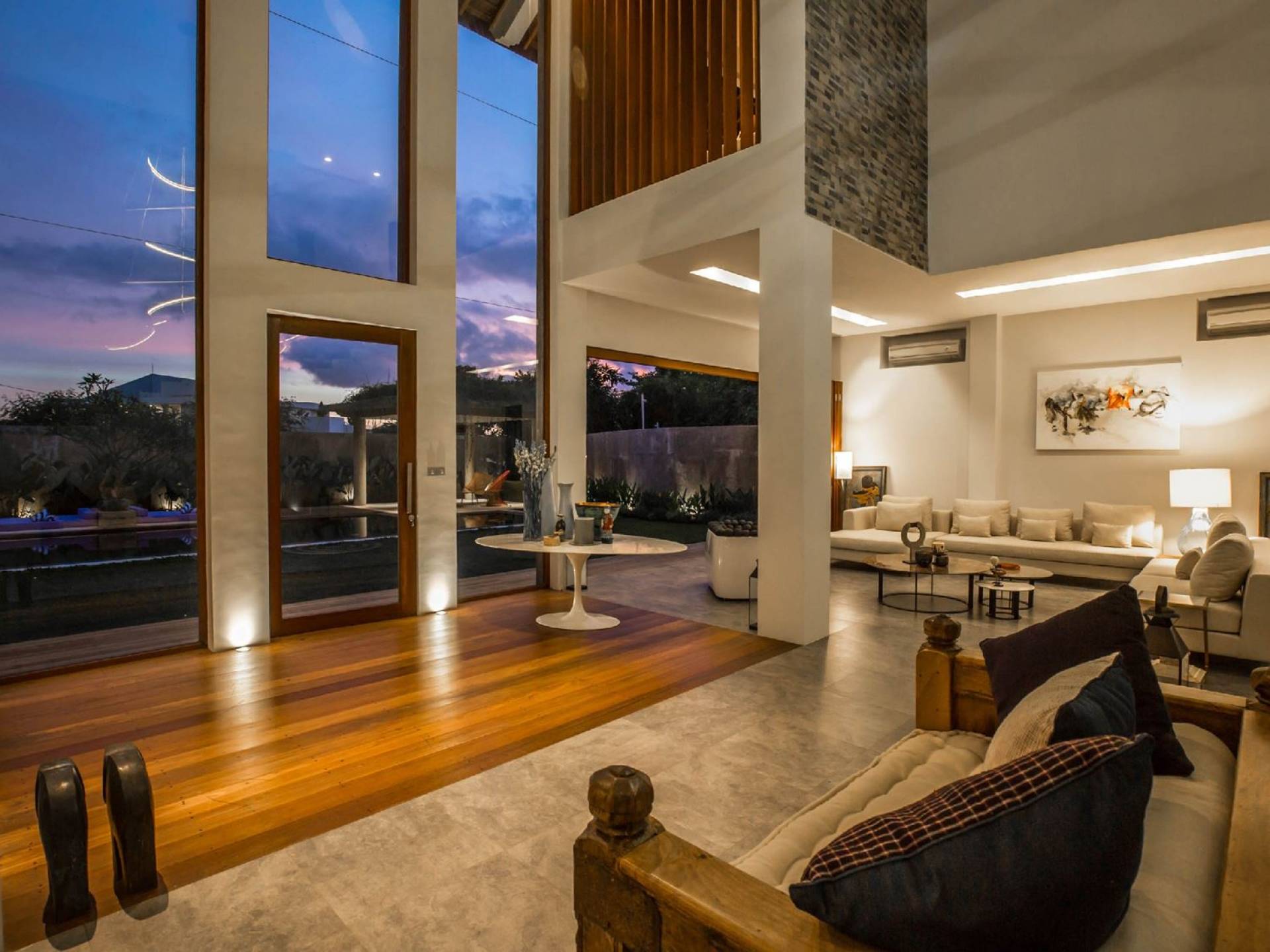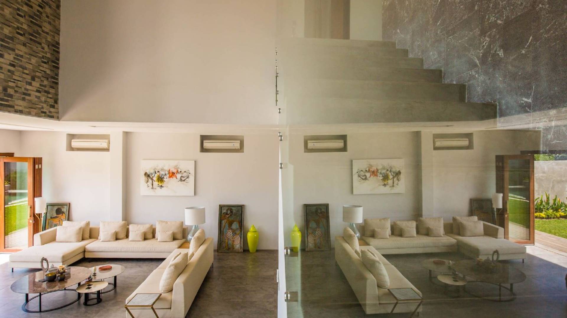 Der Wohnbereich ist von natürlichem Sonnenlicht durchflutet und die Gäste haben den Luxus, zwischen einem klimatisierten Wohnbereich und einem tropischen offenen Wohnbereich mit einfachem Zugang zum Außenbereich der Villa zu wählen. Das zeitgenössische italienische Innendesign umfasst maßgefertigte Lampen und Möbel sowie eine geschmackvolle Sammlung traditioneller Artefakte. Die Villa wurde offensichtlich mit viel Liebe und Auge fürs Detail von den Eigentümern der Villa eingerichtet. Auf der einen Seite befindet sich die Lounge-Ecke mit Sofas und Relaxsesseln, die 3 runde Kaffeetische umgeben. In der Mitte des Wohnbereichs steht ein antikes Sofa aus Teakholz und auf der anderen Seite ein langer, schöner Teakholz-Esstisch, der groß genug ist, um bis zu 10 Personen Platz zu bieten.