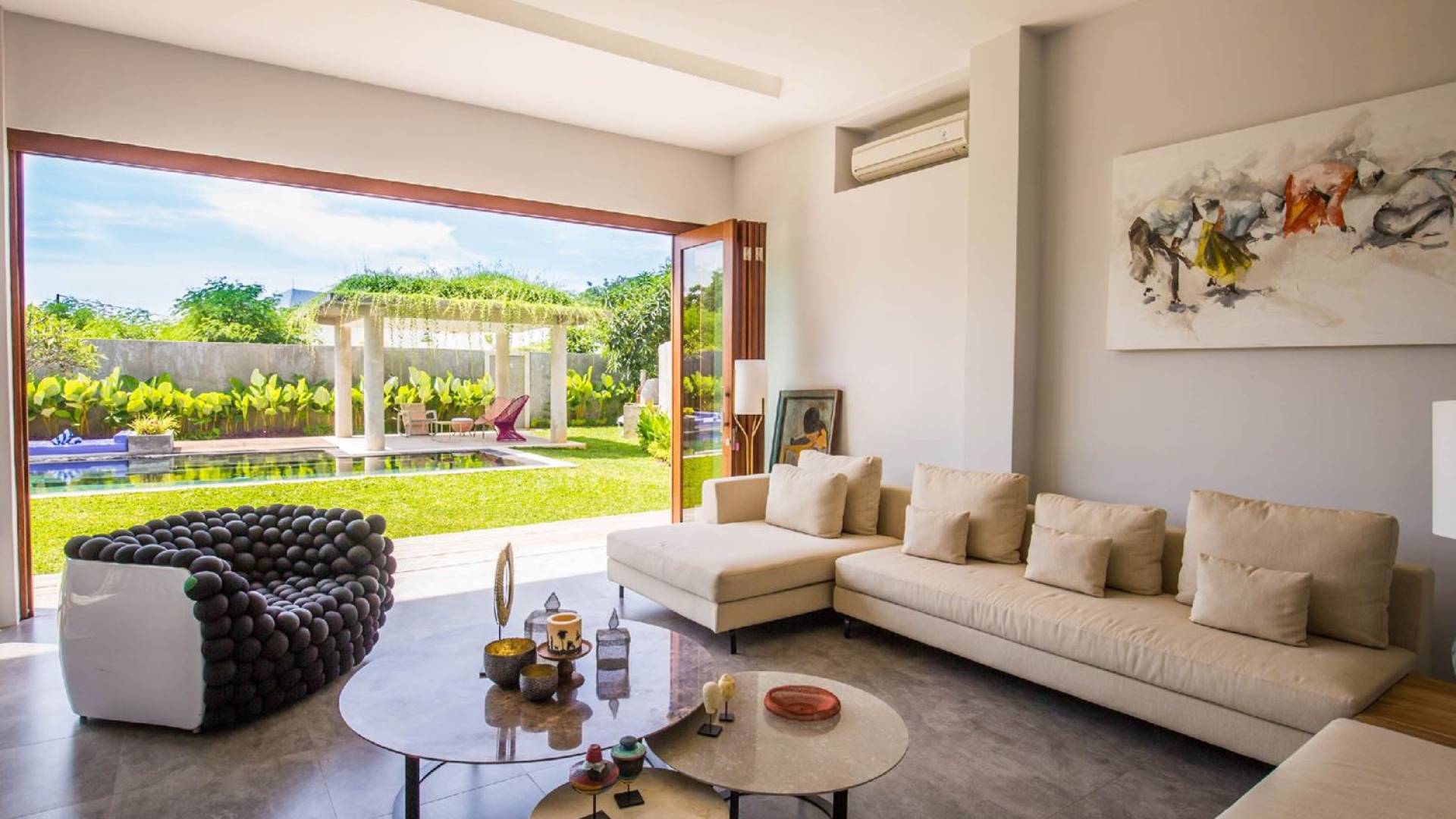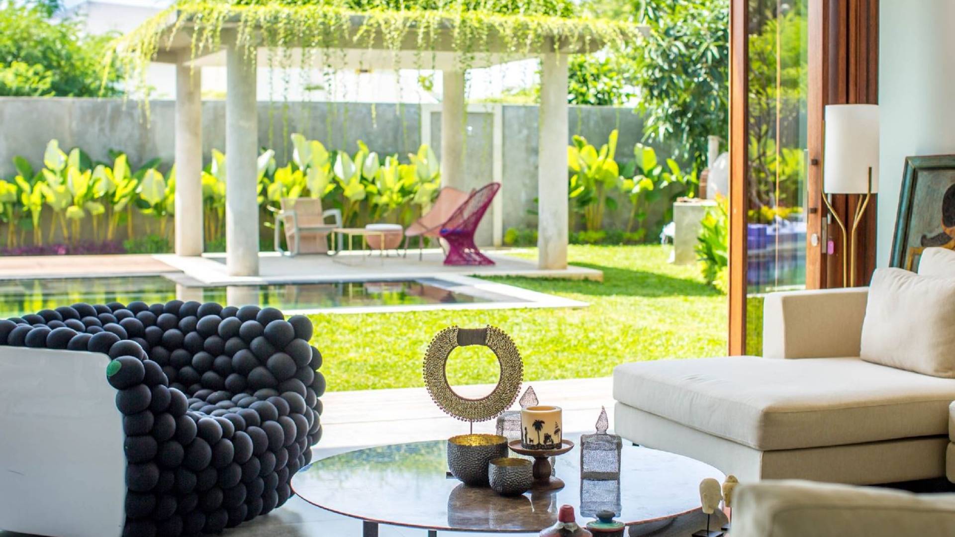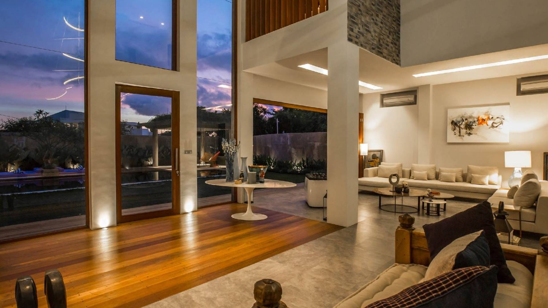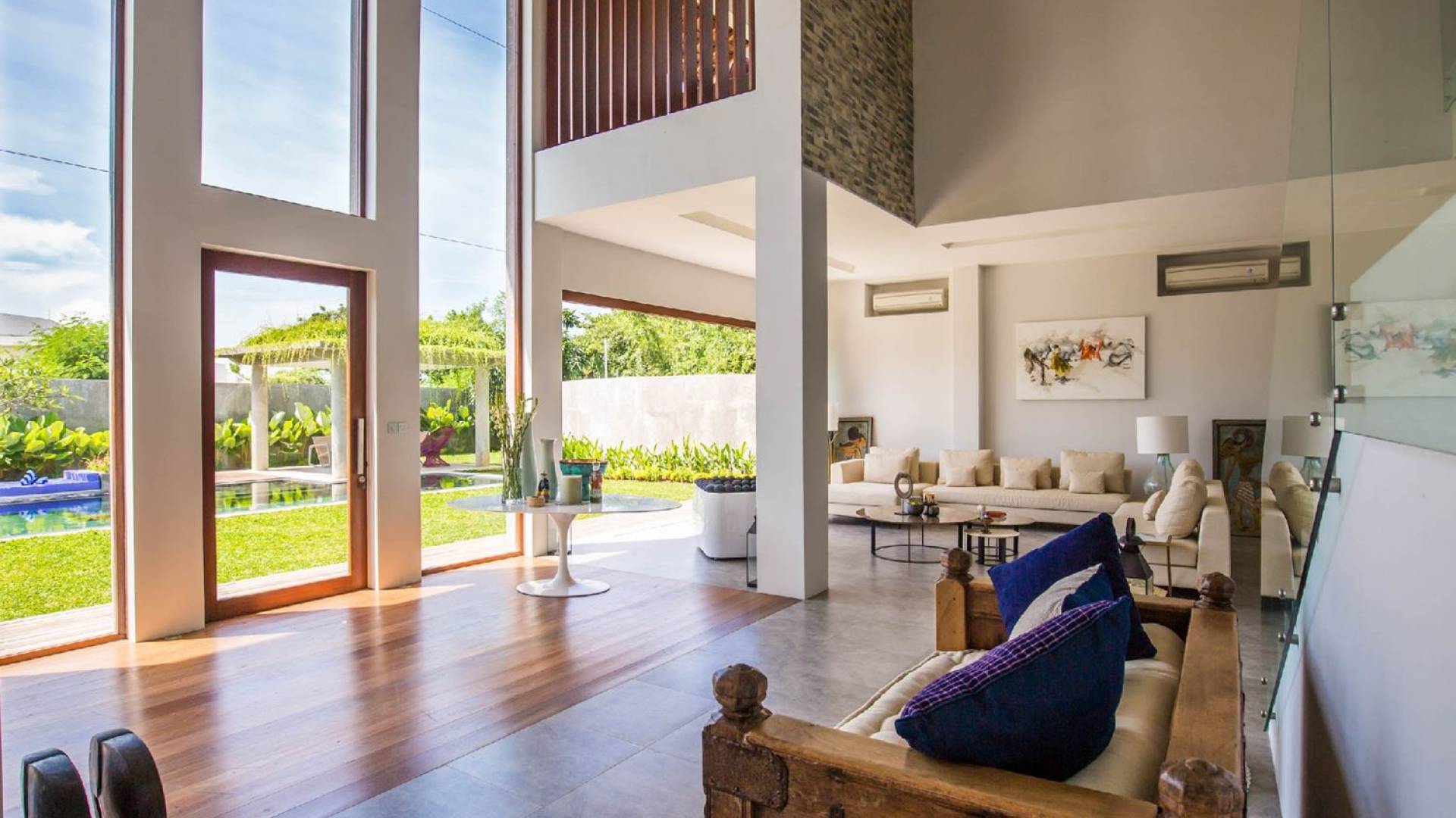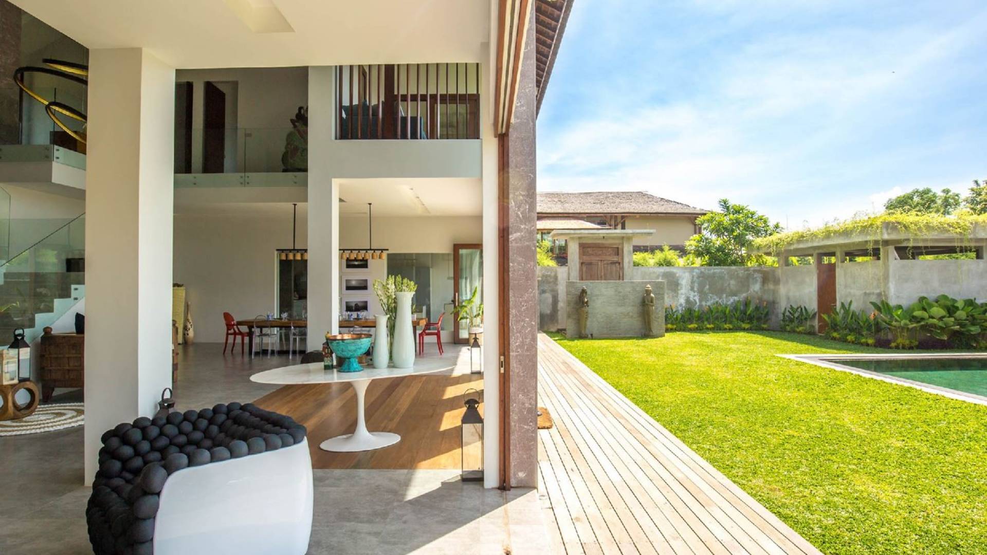 Der Wohnbereich ist von natürlichem Sonnenlicht durchflutet und die Gäste haben den Luxus, zwischen einem klimatisierten Wohnbereich und einem tropischen offenen Wohnbereich mit einfachem Zugang zum Außenbereich der Villa zu wählen. Das zeitgenössische italienische Innendesign umfasst maßgefertigte Lampen und Möbel sowie eine geschmackvolle Sammlung traditioneller Artefakte. Die Villa wurde offensichtlich mit viel Liebe und Auge fürs Detail von den Eigentümern der Villa eingerichtet. Auf der einen Seite befindet sich die Lounge-Ecke mit Sofas und Relaxsesseln, die 3 runde Kaffeetische umgeben. In der Mitte des Wohnbereichs steht ein antikes Sofa aus Teakholz und auf der anderen Seite ein langer, schöner Teakholz-Esstisch, der groß genug ist, um bis zu 10 Personen Platz zu bieten.