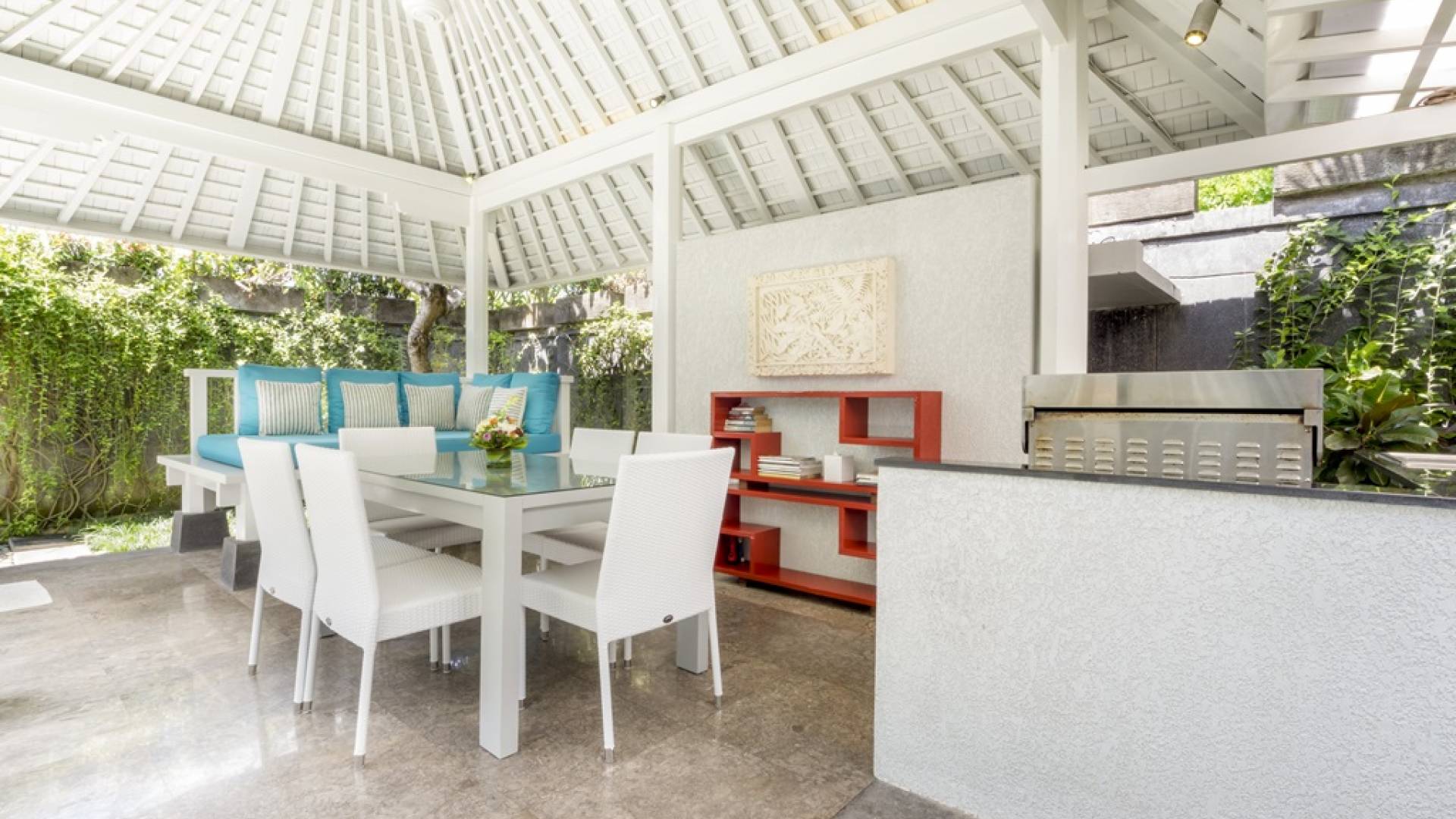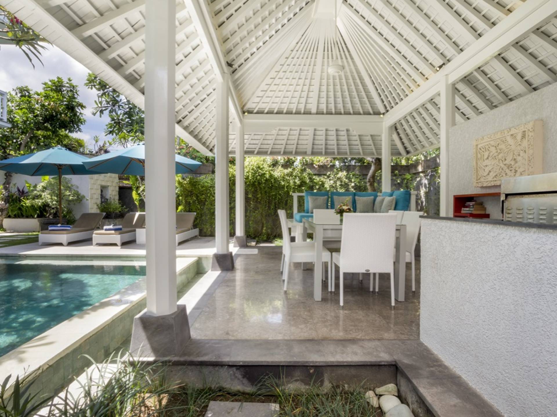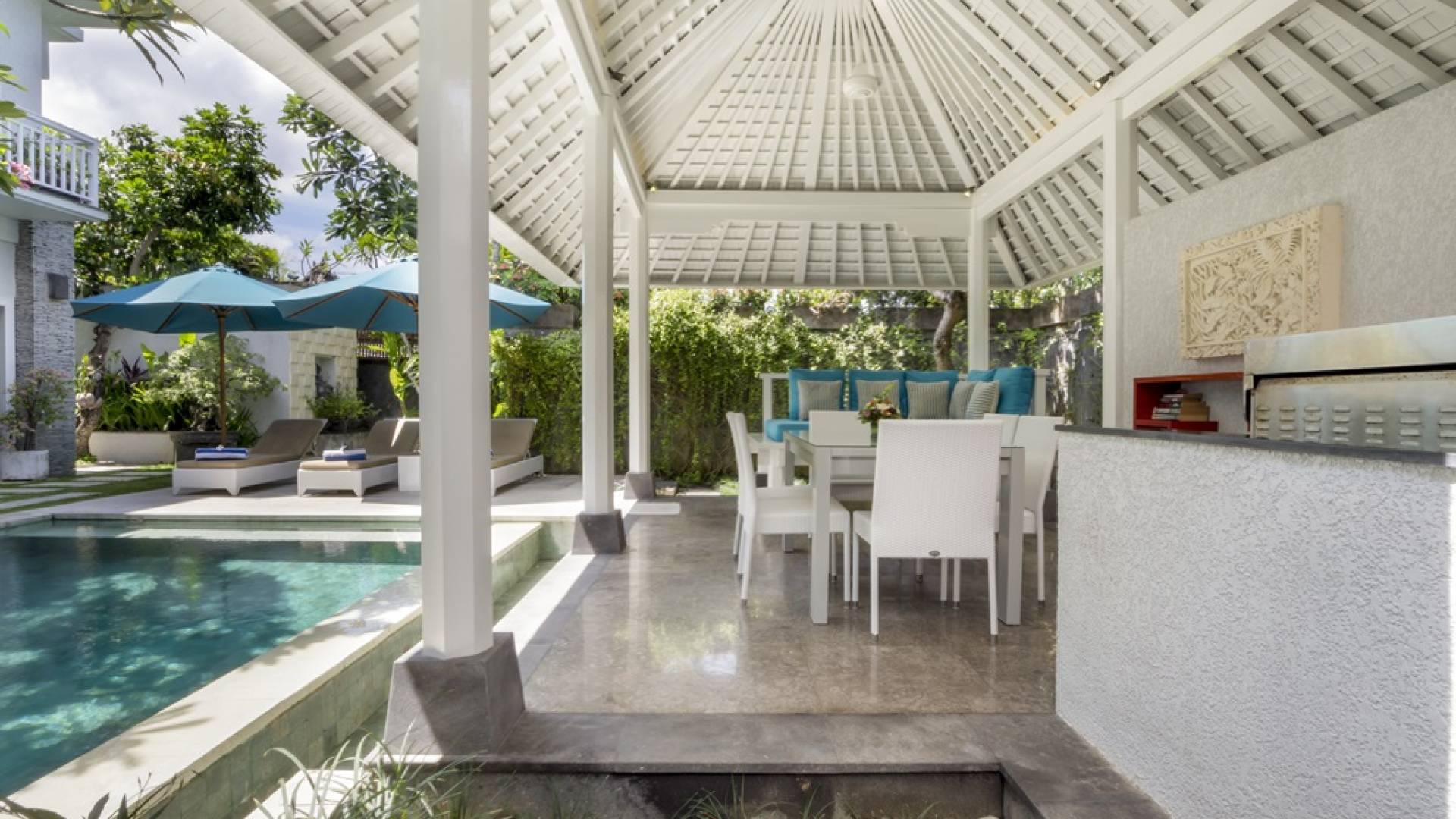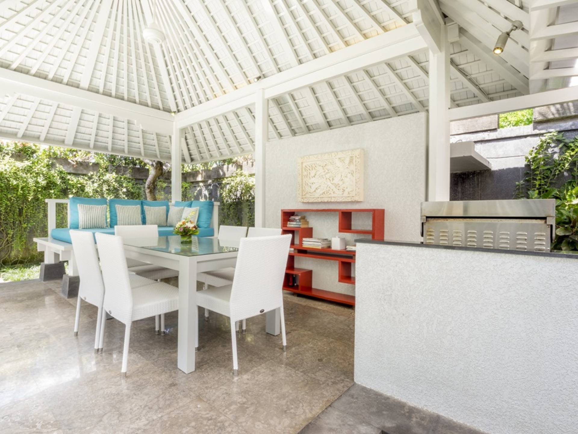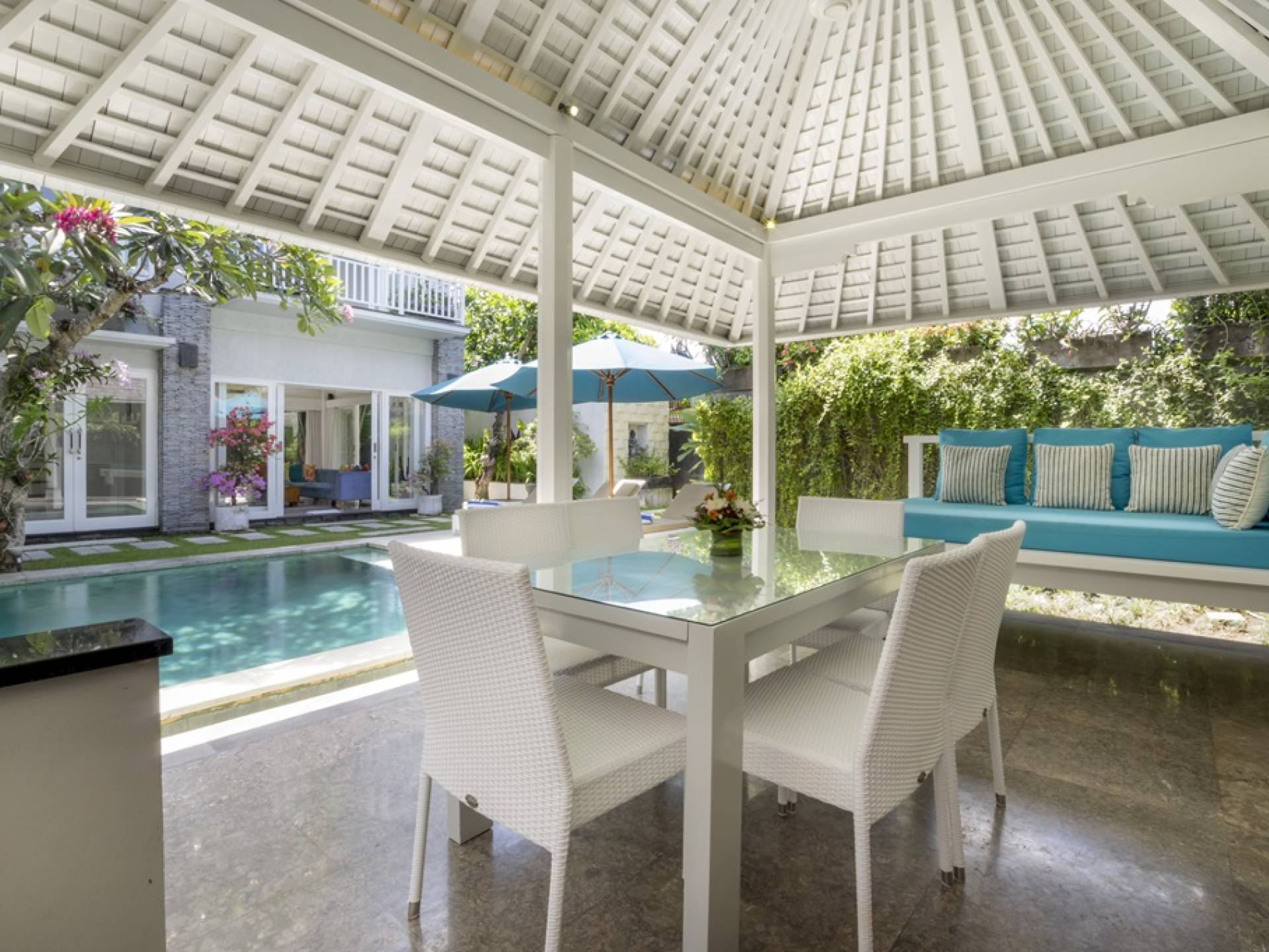 Villa Alun Seminyak strahlt gleichzeitig tropischen Charme und modernen Stil und Komfort aus. Das Anwesen verfügt über elegante ganz in Weiß gehaltene Pavillons mit balinesischen hohen Dächern, luftigen Balkonen und geschmackvoll gestalteten Innenräumen, die durch Farbthemen und asiatische Artefakte bereichert werden. Es gibt einen offenen Wohnbereich am Pool, komplett mit einer Schlafcouch, einem Sofa und einem Esstisch - perfekt für tagsüber Faulenzen und Grillfeste im Garten. Die Villa Alun verfügt auch über ein klimatisiertes Wohnzimmer mit durchgehenden Glasschiebetüren, die sich zum Garten öffnen und den Gästen die Wahl bieten, auf tropische Art zu leben oder einen gemeinsamen Mittelpunkt zu schaffen, um der tropischen Hitze von außen zu entfliehen.