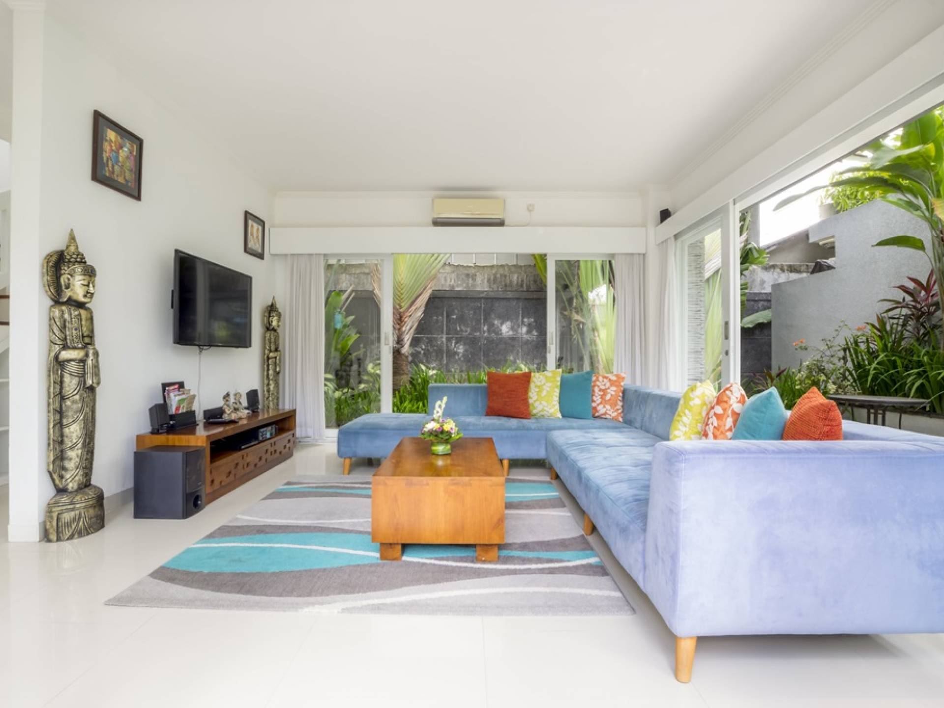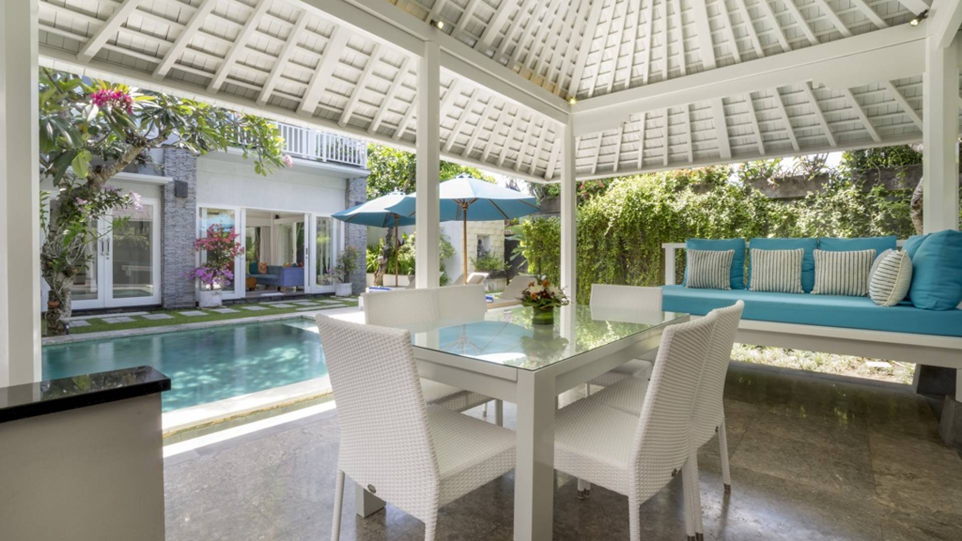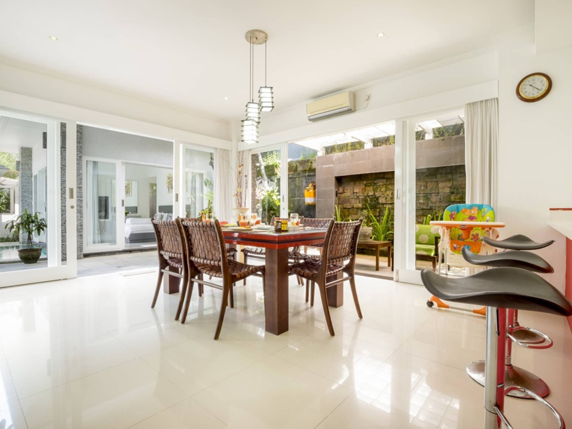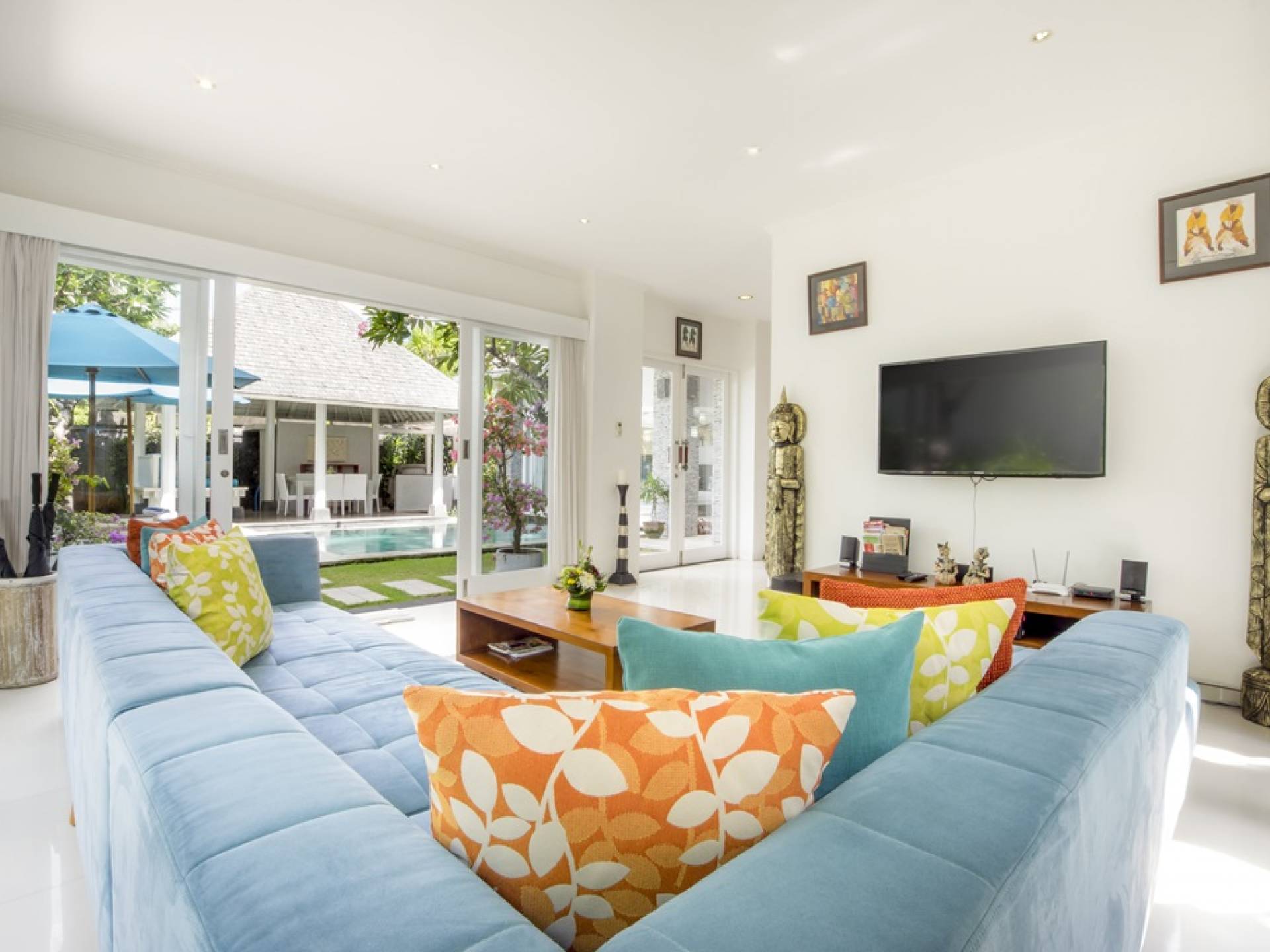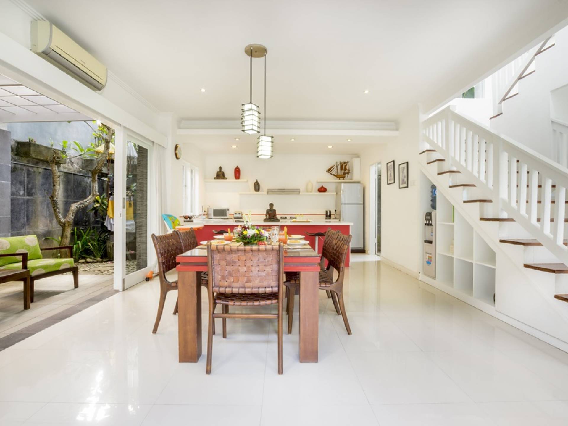 Villa Alun Seminyak strahlt gleichzeitig tropischen Charme und modernen Stil und Komfort aus. Das Anwesen verfügt über elegante ganz in Weiß gehaltene Pavillons mit balinesischen hohen Dächern, luftigen Balkonen und geschmackvoll gestalteten Innenräumen, die durch Farbthemen und asiatische Artefakte bereichert werden. Es gibt einen offenen Wohnbereich am Pool, komplett mit einer Schlafcouch, einem Sofa und einem Esstisch - perfekt für tagsüber Faulenzen und Grillfeste im Garten. Die Villa Alun verfügt auch über ein klimatisiertes Wohnzimmer mit durchgehenden Glasschiebetüren, die sich zum Garten öffnen und den Gästen die Wahl bieten, auf tropische Art zu leben oder einen gemeinsamen Mittelpunkt zu schaffen, um der tropischen Hitze von außen zu entfliehen.