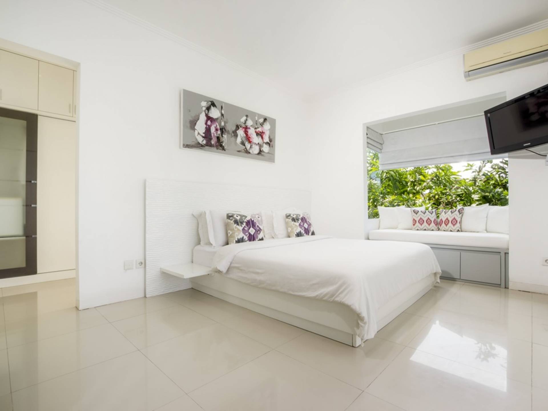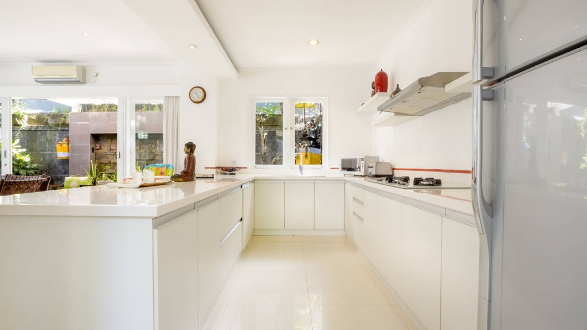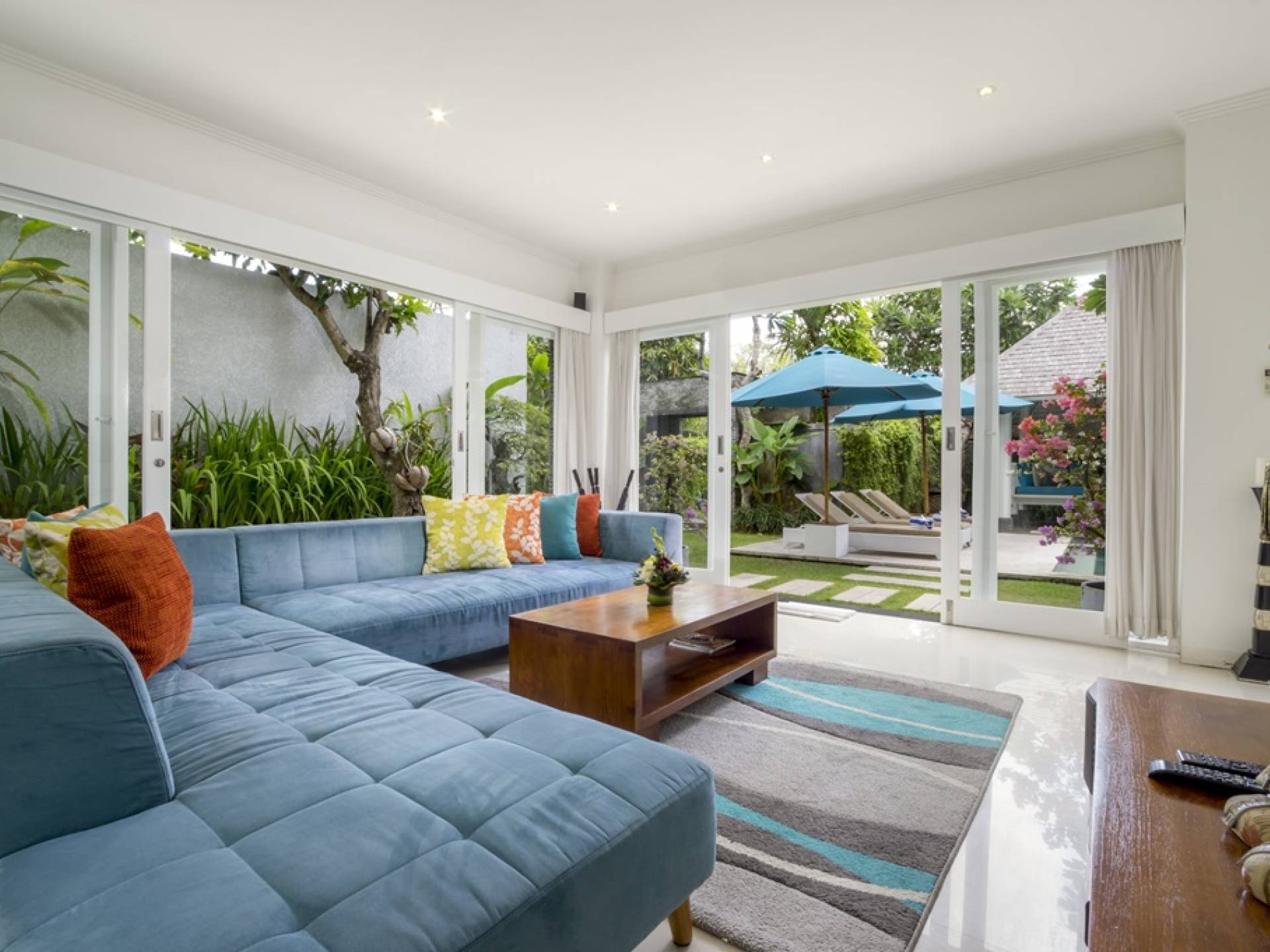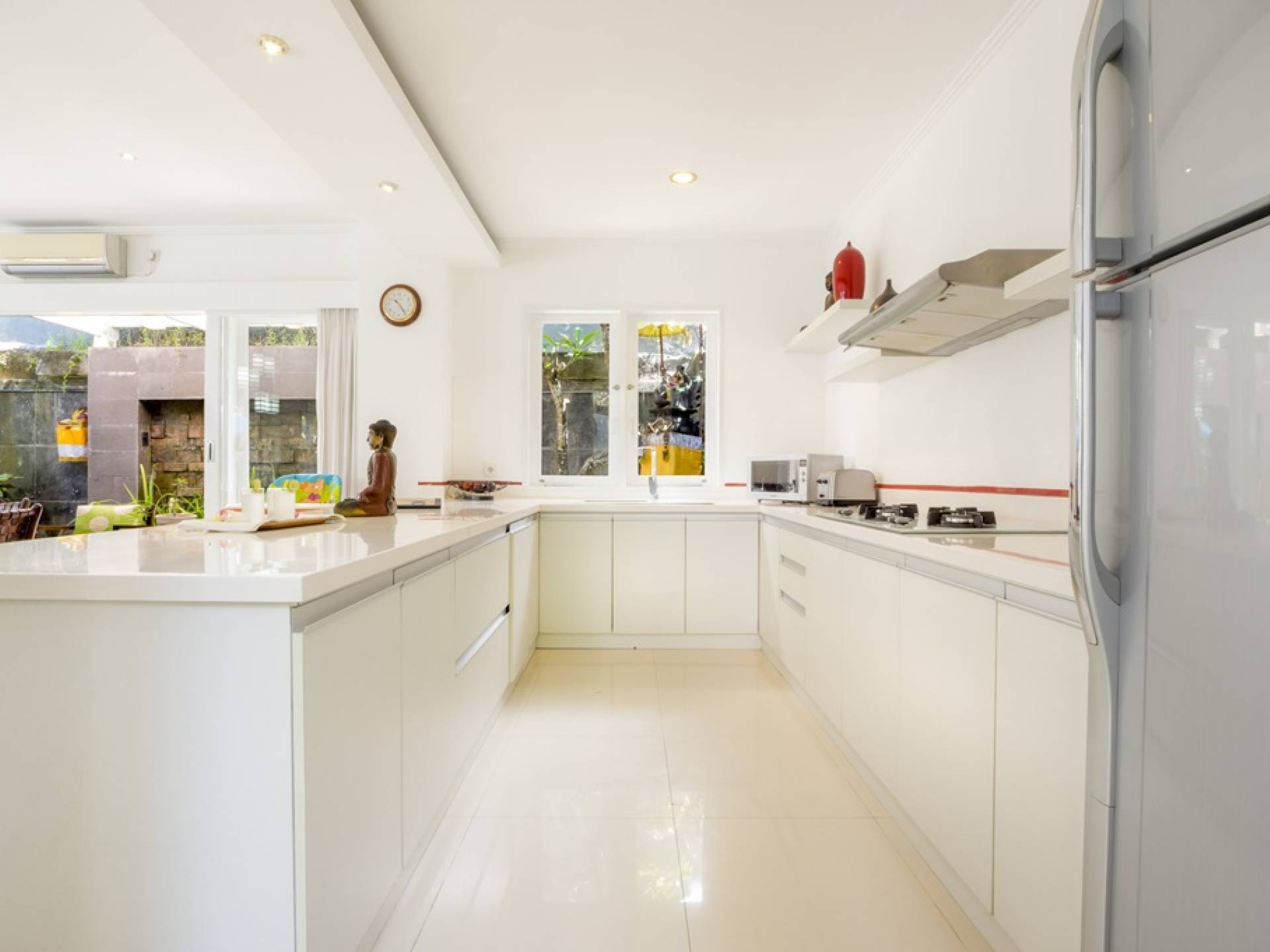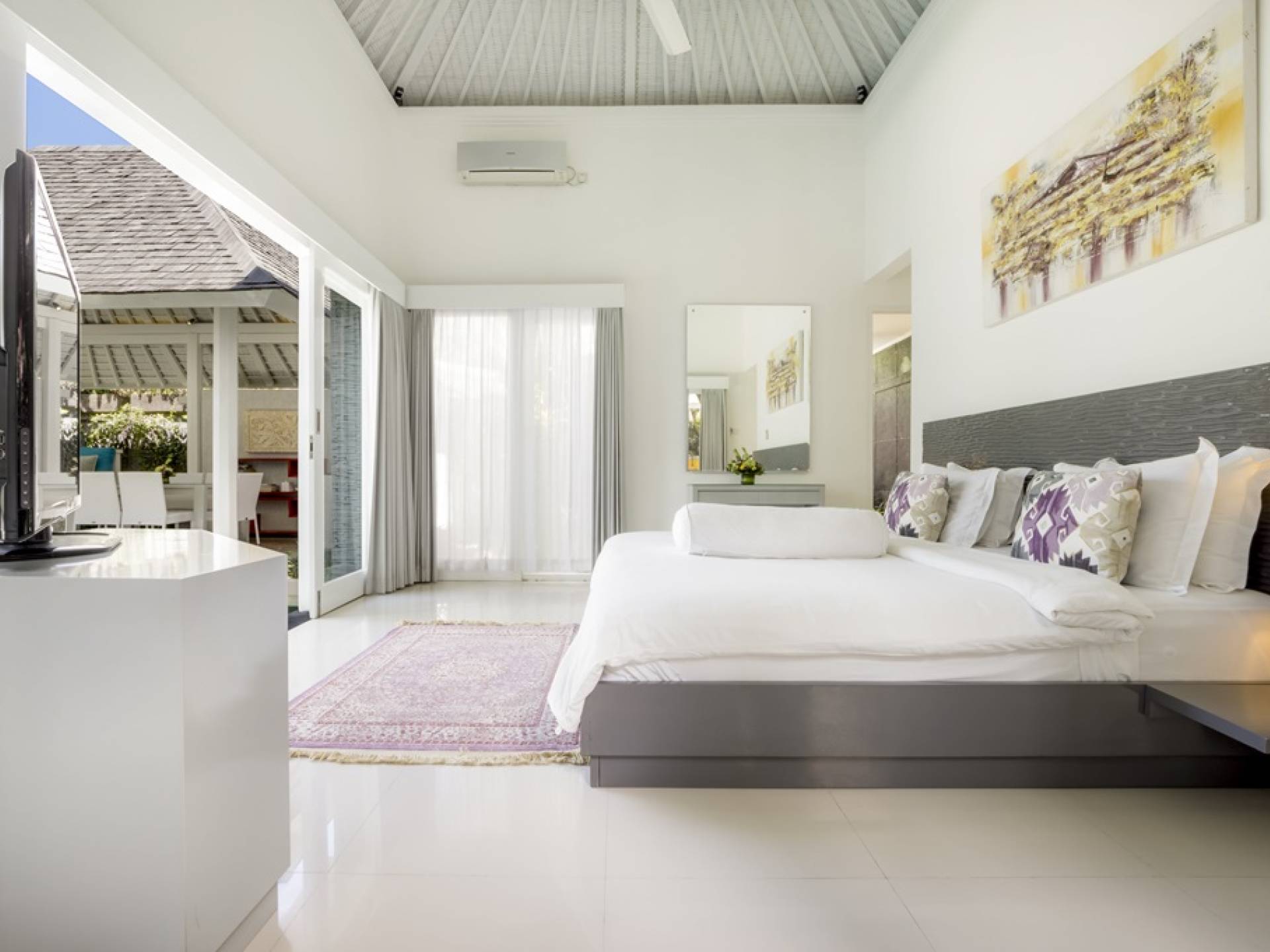 Villa Alun Seminyak strahlt gleichzeitig tropischen Charme und modernen Stil und Komfort aus. Das Anwesen verfügt über elegante ganz in Weiß gehaltene Pavillons mit balinesischen hohen Dächern, luftigen Balkonen und geschmackvoll gestalteten Innenräumen, die durch Farbthemen und asiatische Artefakte bereichert werden. Es gibt einen offenen Wohnbereich am Pool, komplett mit einer Schlafcouch, einem Sofa und einem Esstisch - perfekt für tagsüber Faulenzen und Grillfeste im Garten. Die Villa Alun verfügt auch über ein klimatisiertes Wohnzimmer mit durchgehenden Glasschiebetüren, die sich zum Garten öffnen und den Gästen die Wahl bieten, auf tropische Art zu leben oder einen gemeinsamen Mittelpunkt zu schaffen, um der tropischen Hitze von außen zu entfliehen.