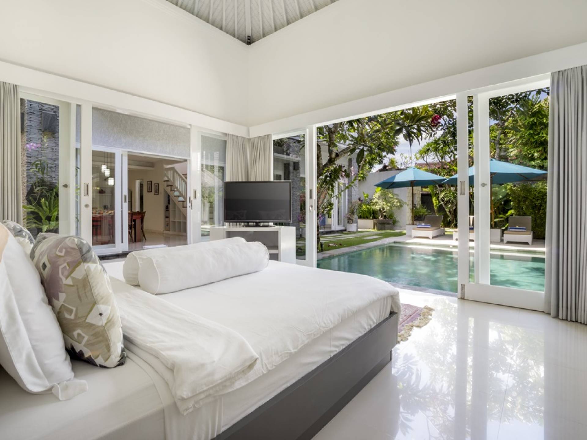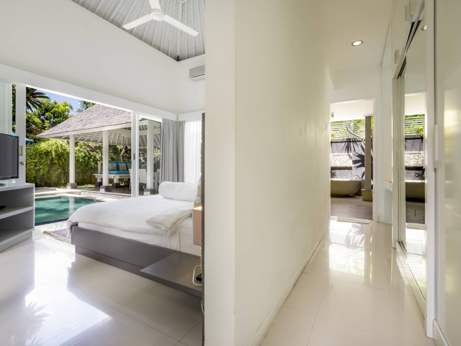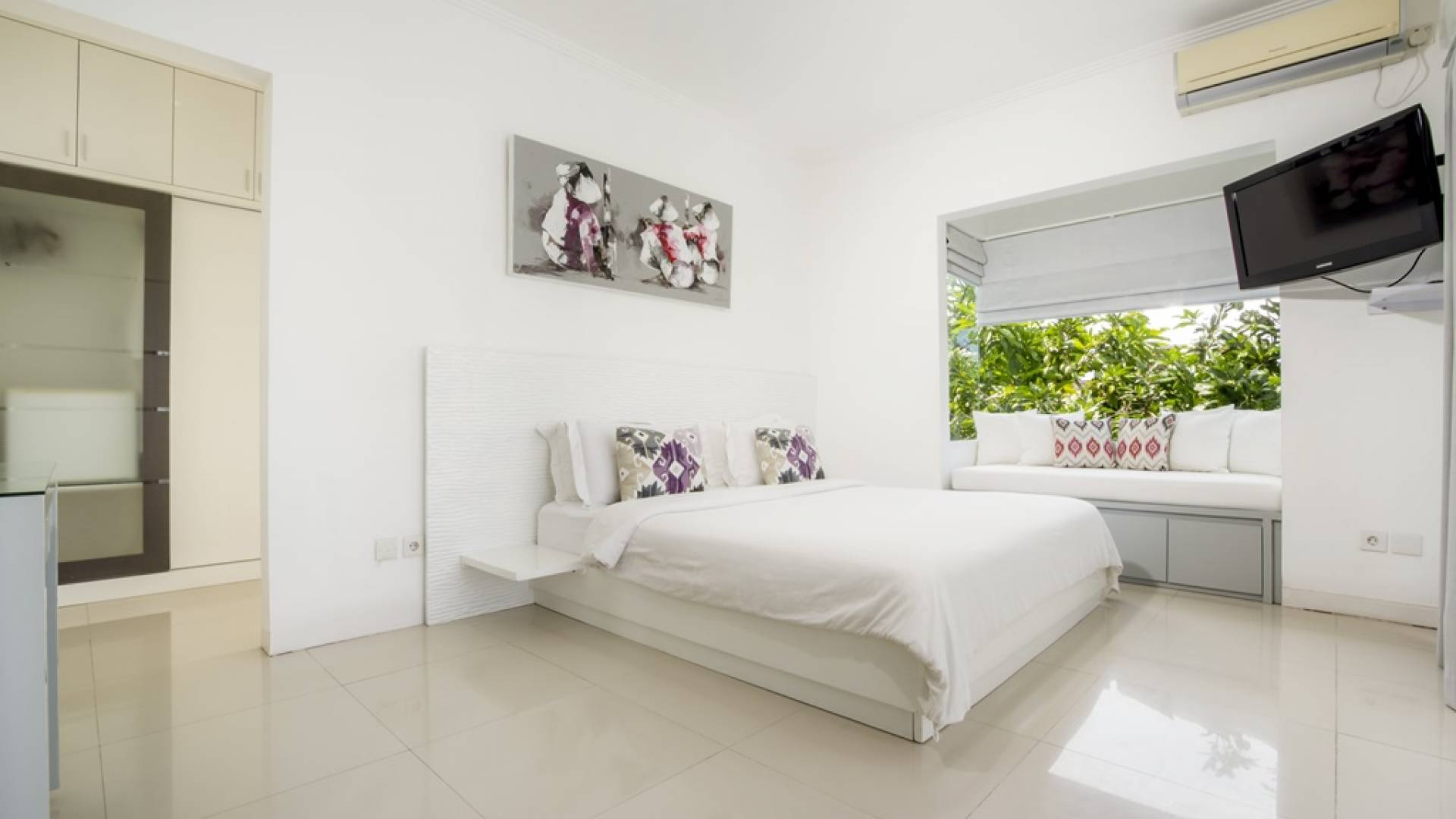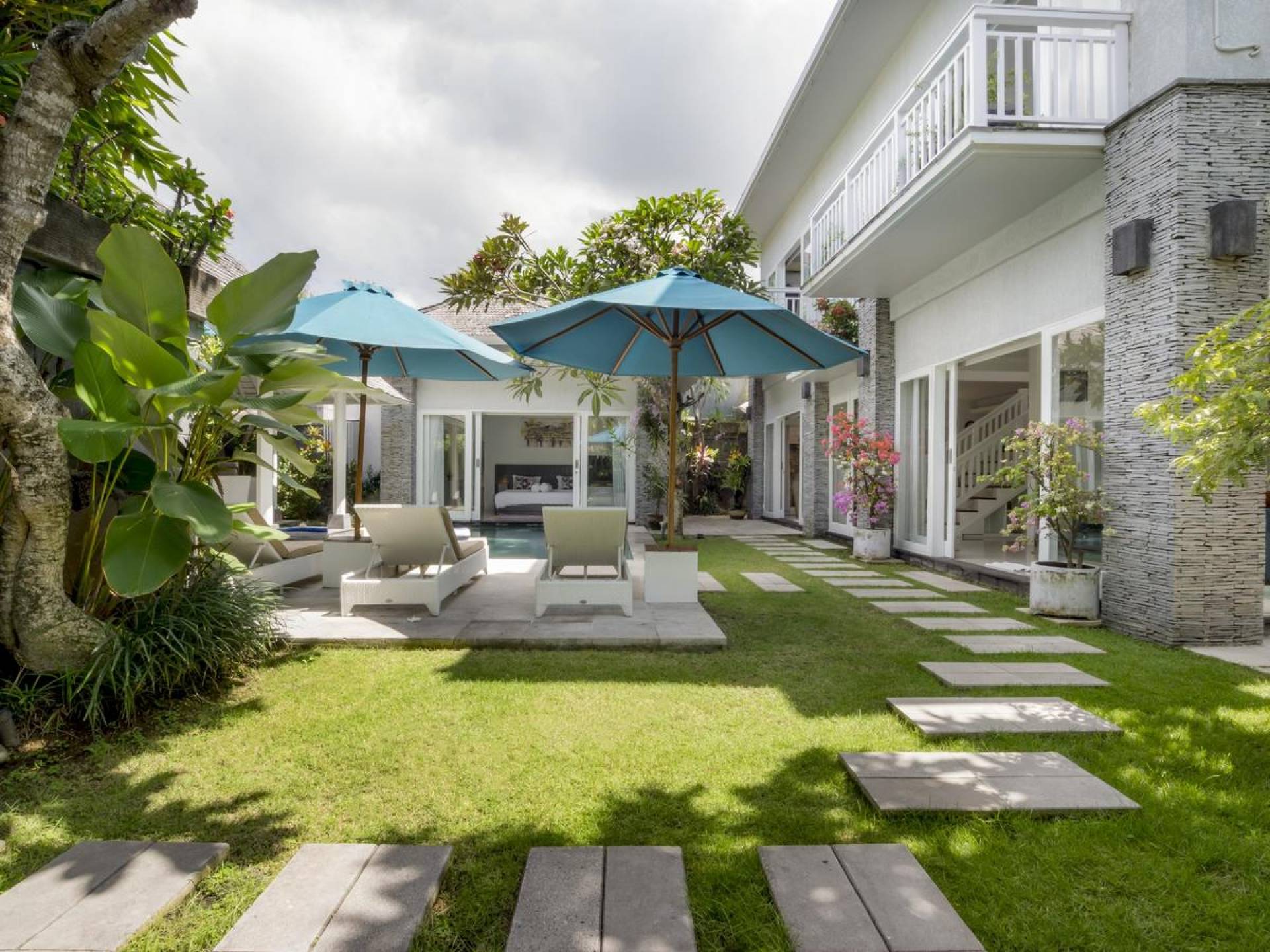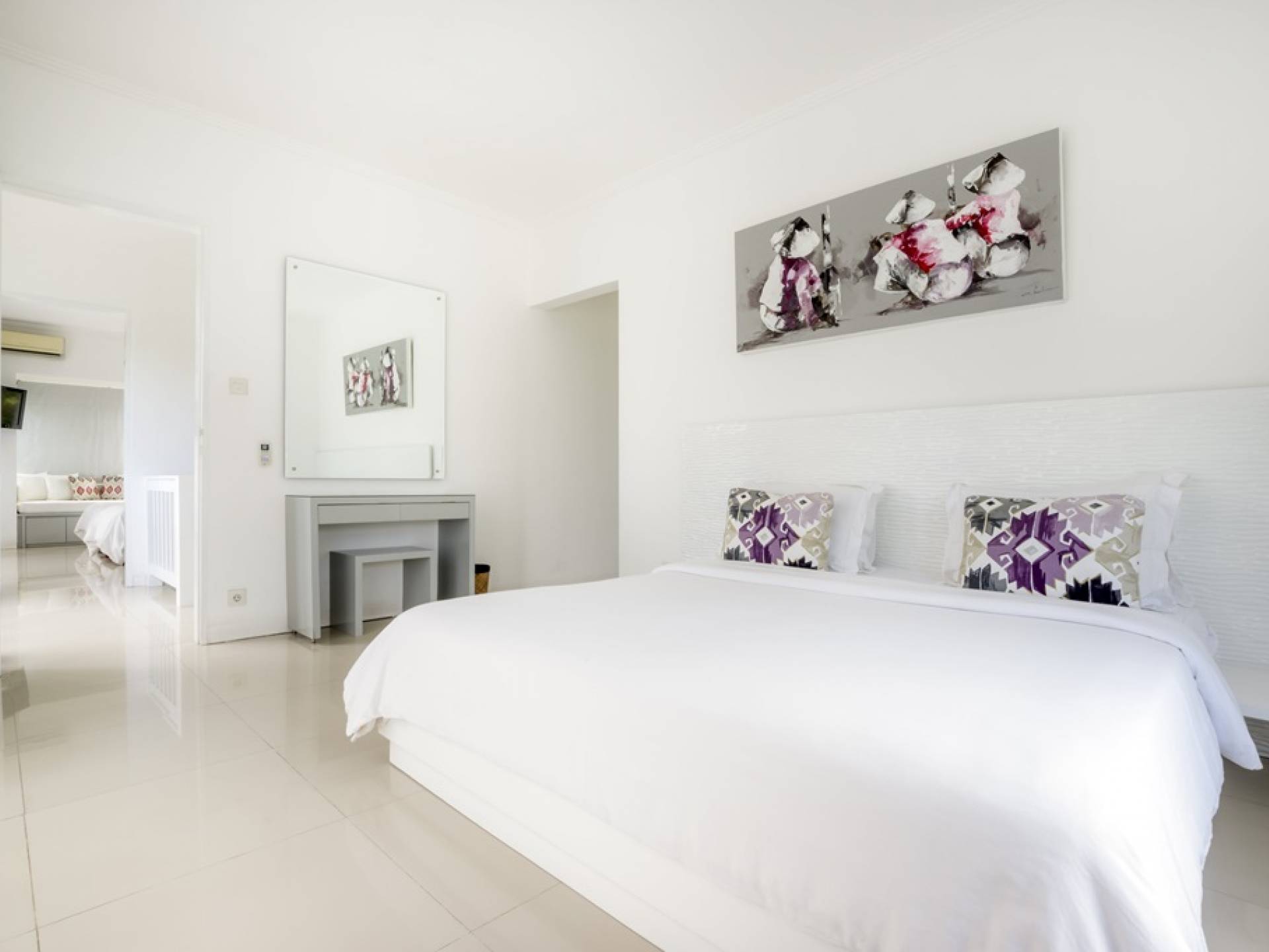 Villa Alun Seminyak strahlt gleichzeitig tropischen Charme und modernen Stil und Komfort aus. Das Anwesen verfügt über elegante ganz in Weiß gehaltene Pavillons mit balinesischen hohen Dächern, luftigen Balkonen und geschmackvoll gestalteten Innenräumen, die durch Farbthemen und asiatische Artefakte bereichert werden. Es gibt einen offenen Wohnbereich am Pool, komplett mit einer Schlafcouch, einem Sofa und einem Esstisch - perfekt für tagsüber Faulenzen und Grillfeste im Garten. Die Villa Alun verfügt auch über ein klimatisiertes Wohnzimmer mit durchgehenden Glasschiebetüren, die sich zum Garten öffnen und den Gästen die Wahl bieten, auf tropische Art zu leben oder einen gemeinsamen Mittelpunkt zu schaffen, um der tropischen Hitze von außen zu entfliehen.