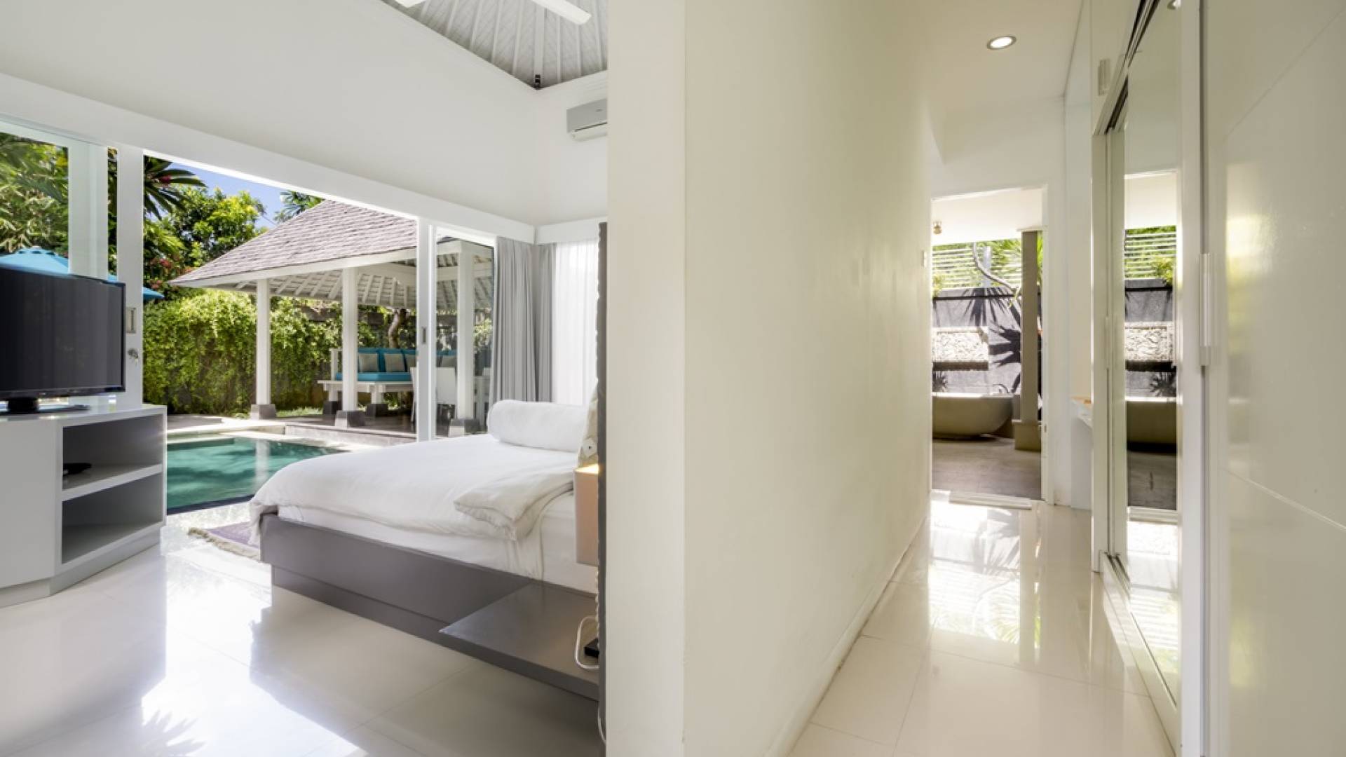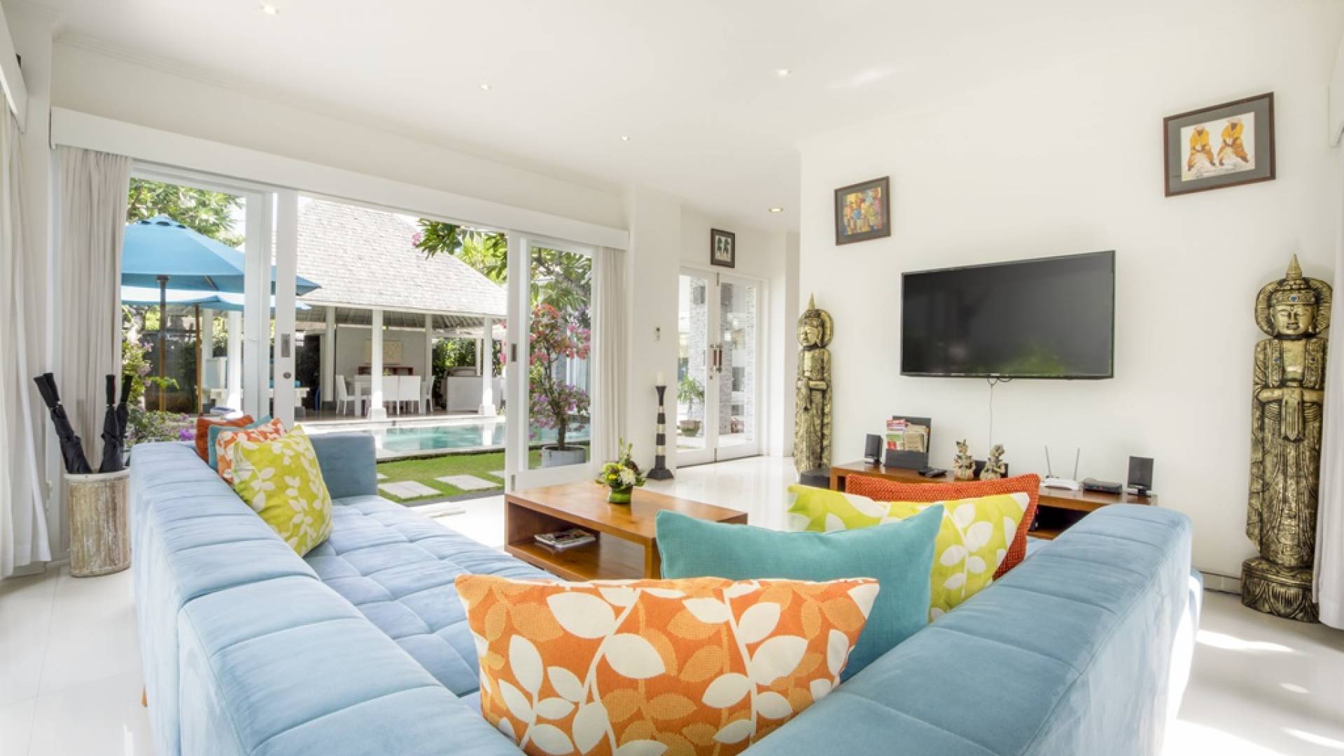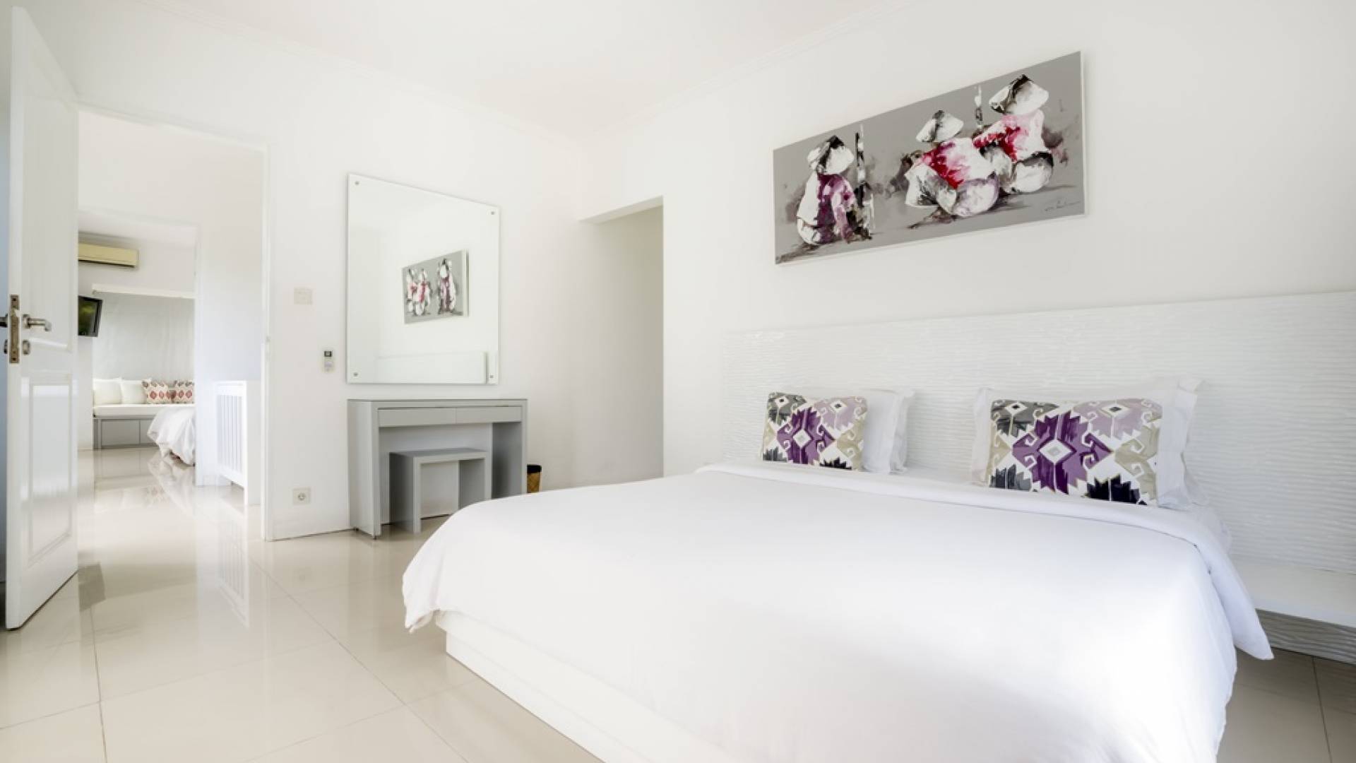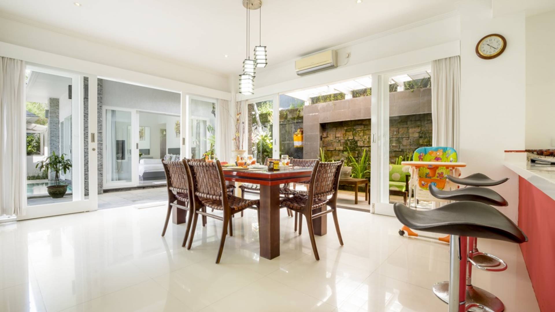 Villa Alun Seminyak strahlt gleichzeitig tropischen Charme und modernen Stil und Komfort aus. Das Anwesen verfügt über elegante ganz in Weiß gehaltene Pavillons mit balinesischen hohen Dächern, luftigen Balkonen und geschmackvoll gestalteten Innenräumen, die durch Farbthemen und asiatische Artefakte bereichert werden. Es gibt einen offenen Wohnbereich am Pool, komplett mit einer Schlafcouch, einem Sofa und einem Esstisch - perfekt für tagsüber Faulenzen und Grillfeste im Garten. Die Villa Alun verfügt auch über ein klimatisiertes Wohnzimmer mit durchgehenden Glasschiebetüren, die sich zum Garten öffnen und den Gästen die Wahl bieten, auf tropische Art zu leben oder einen gemeinsamen Mittelpunkt zu schaffen, um der tropischen Hitze von außen zu entfliehen.
