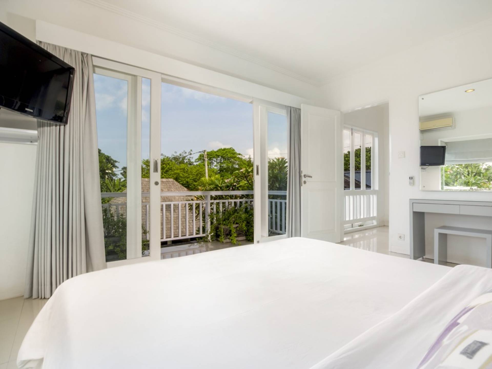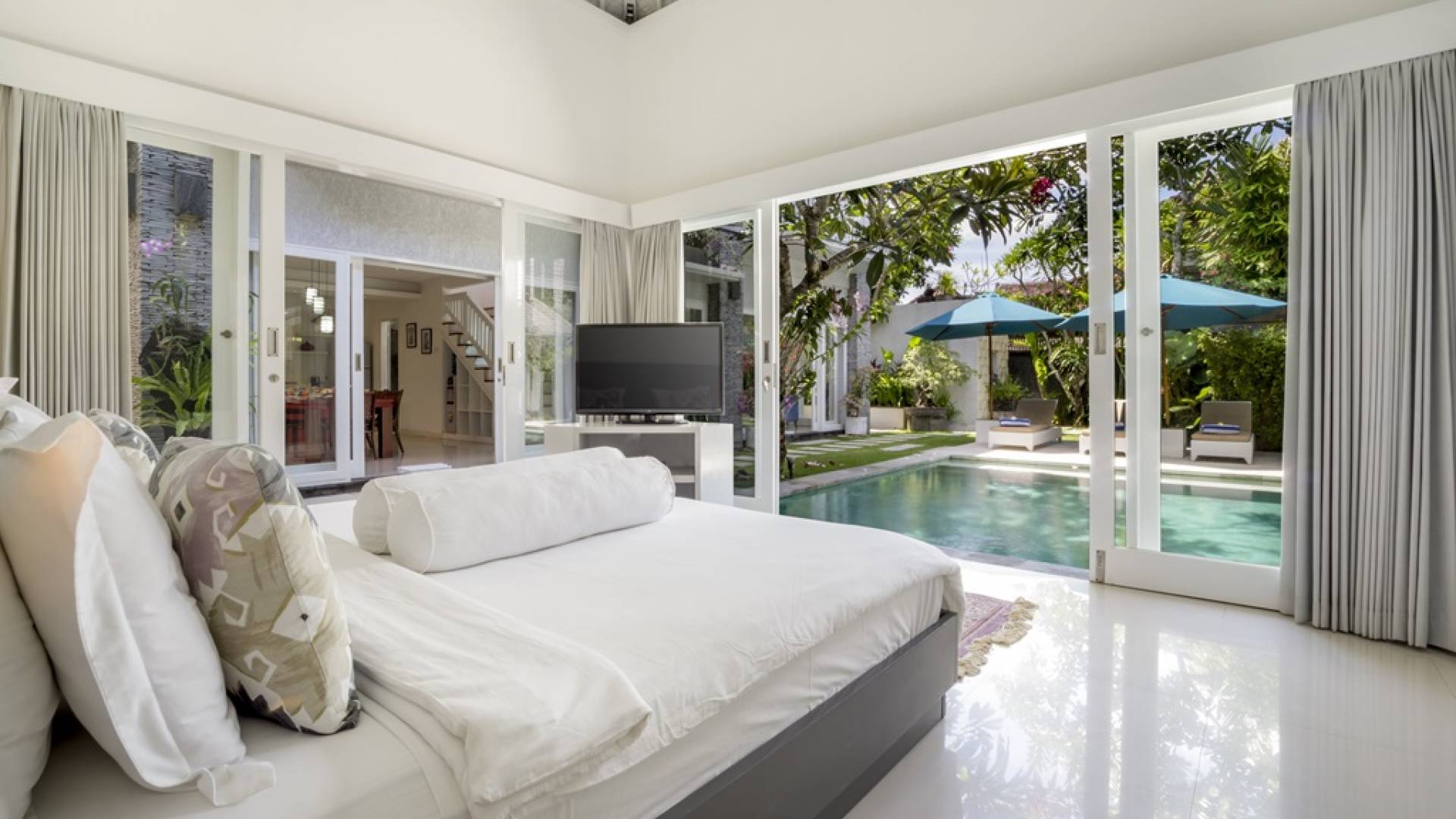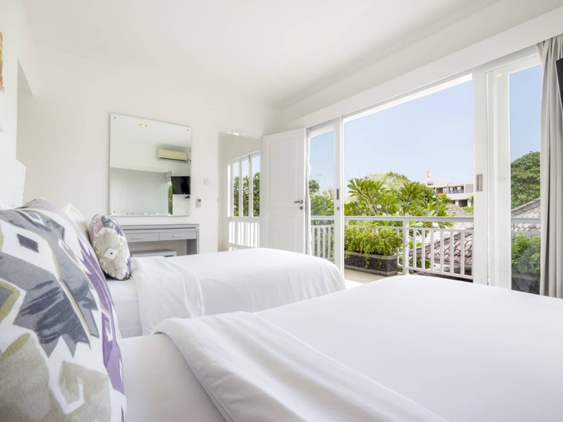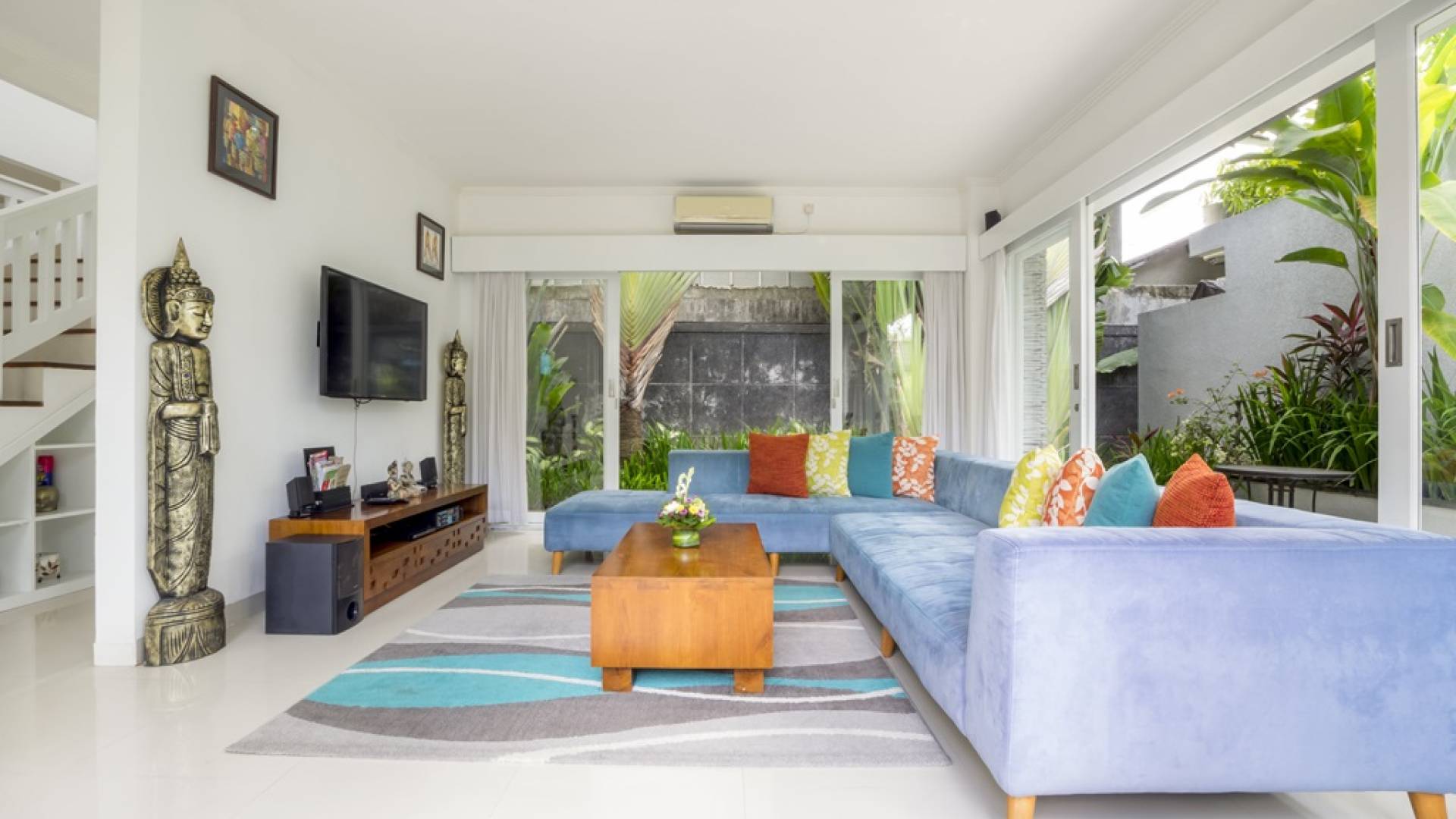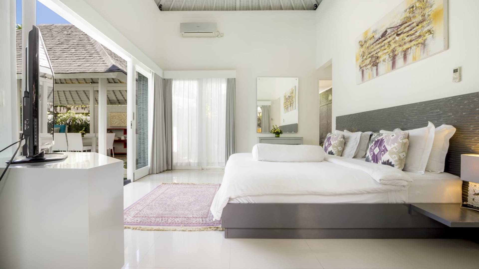 Villa Alun Seminyak strahlt gleichzeitig tropischen Charme und modernen Stil und Komfort aus. Das Anwesen verfügt über elegante ganz in Weiß gehaltene Pavillons mit balinesischen hohen Dächern, luftigen Balkonen und geschmackvoll gestalteten Innenräumen, die durch Farbthemen und asiatische Artefakte bereichert werden. Es gibt einen offenen Wohnbereich am Pool, komplett mit einer Schlafcouch, einem Sofa und einem Esstisch - perfekt für tagsüber Faulenzen und Grillfeste im Garten. Die Villa Alun verfügt auch über ein klimatisiertes Wohnzimmer mit durchgehenden Glasschiebetüren, die sich zum Garten öffnen und den Gästen die Wahl bieten, auf tropische Art zu leben oder einen gemeinsamen Mittelpunkt zu schaffen, um der tropischen Hitze von außen zu entfliehen.