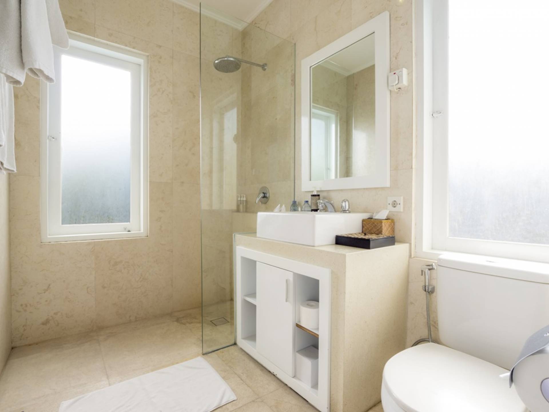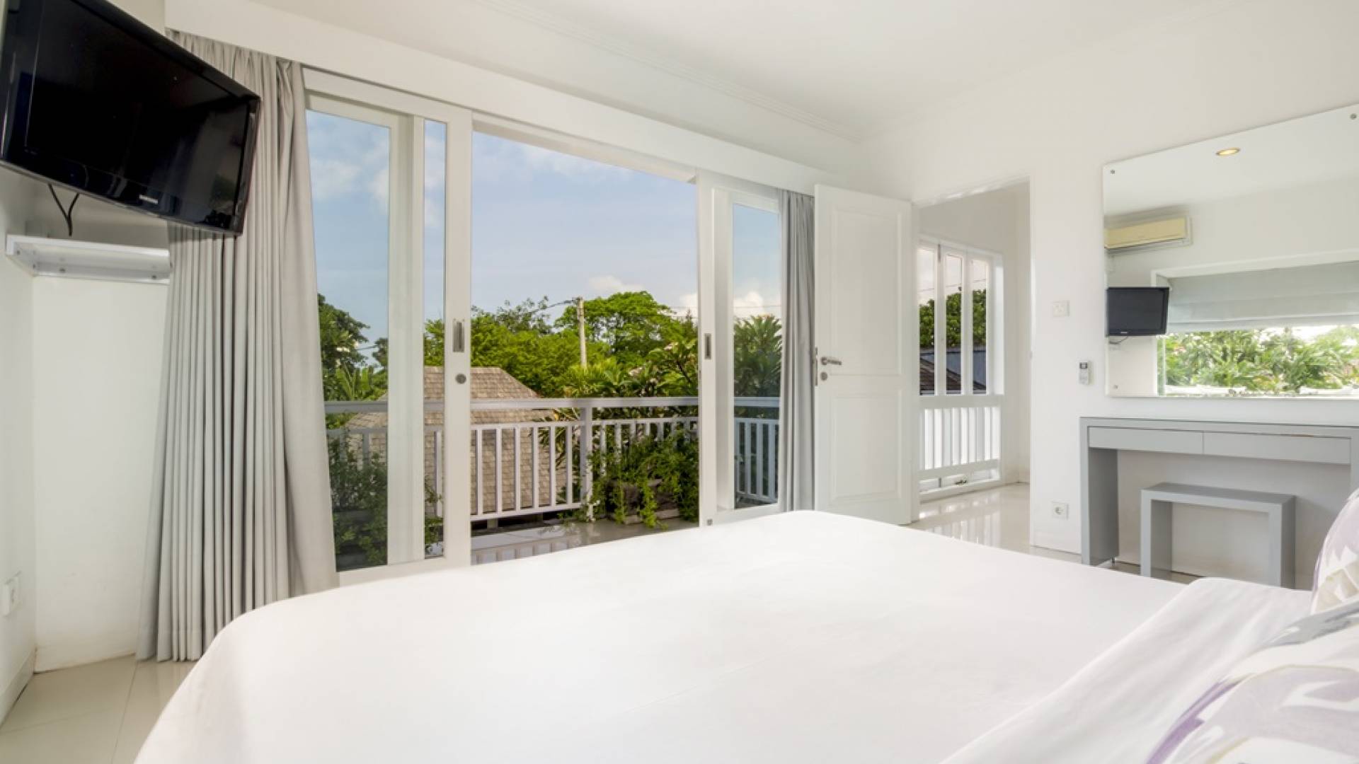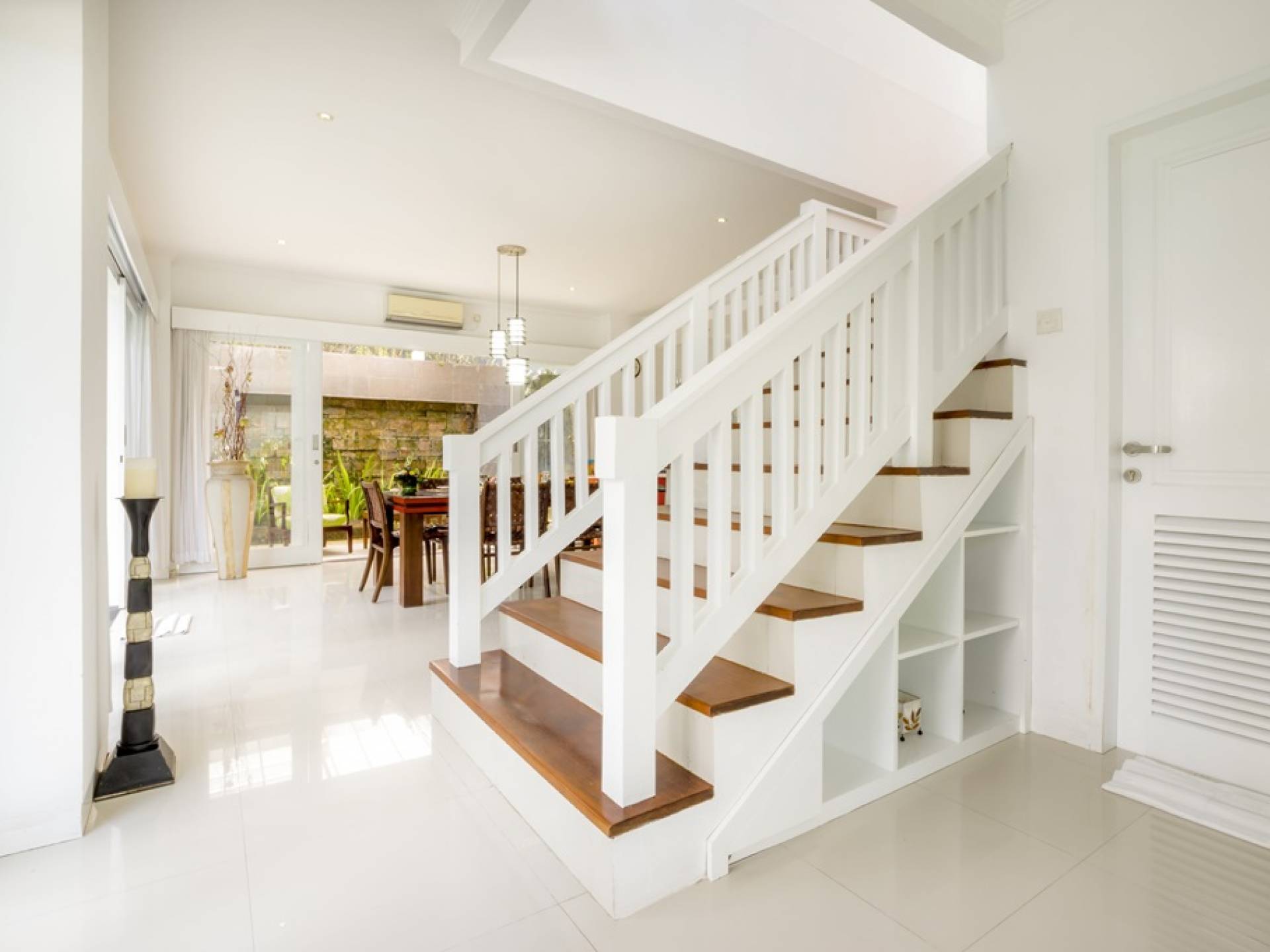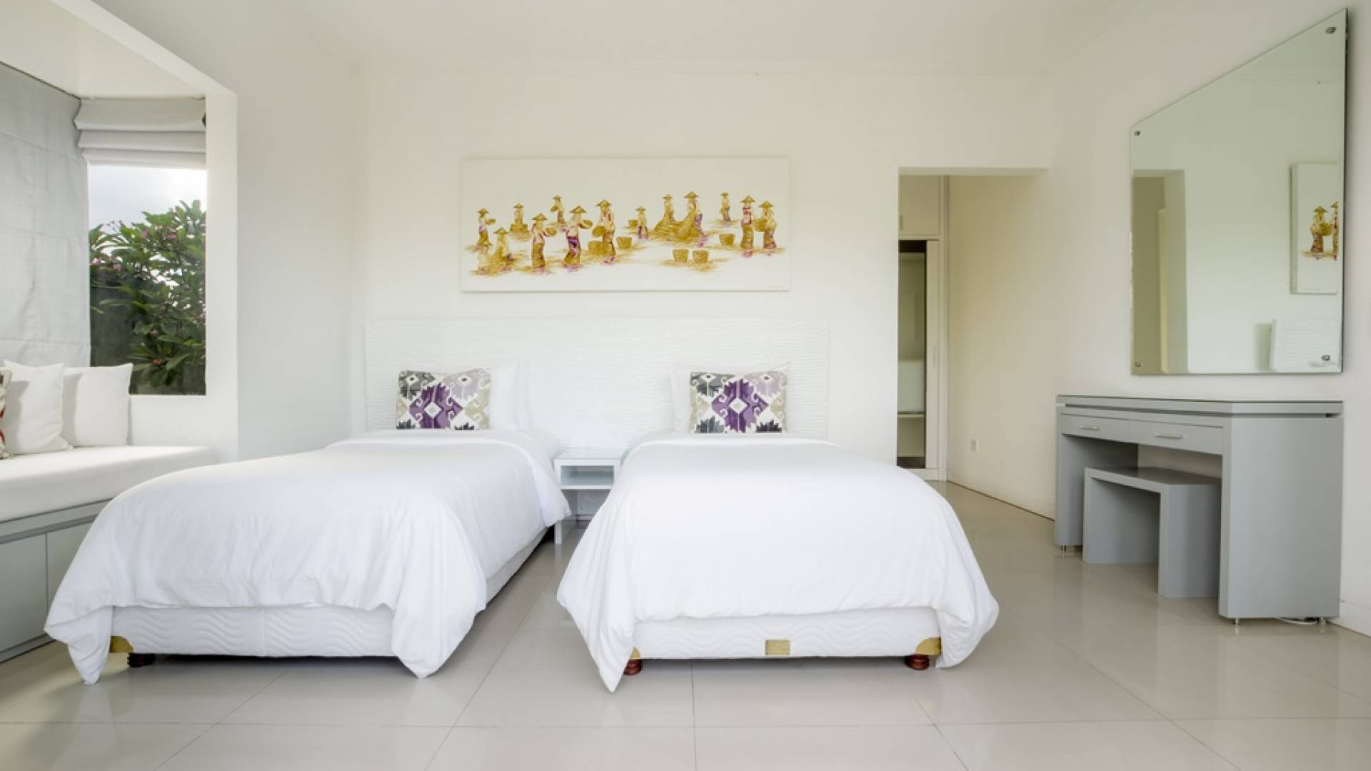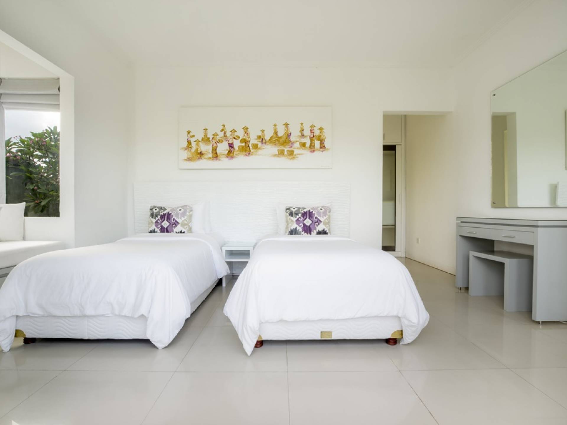 Villa Alun Seminyak strahlt gleichzeitig tropischen Charme und modernen Stil und Komfort aus. Das Anwesen verfügt über elegante ganz in Weiß gehaltene Pavillons mit balinesischen hohen Dächern, luftigen Balkonen und geschmackvoll gestalteten Innenräumen, die durch Farbthemen und asiatische Artefakte bereichert werden. Es gibt einen offenen Wohnbereich am Pool, komplett mit einer Schlafcouch, einem Sofa und einem Esstisch - perfekt für tagsüber Faulenzen und Grillfeste im Garten. Die Villa Alun verfügt auch über ein klimatisiertes Wohnzimmer mit durchgehenden Glasschiebetüren, die sich zum Garten öffnen und den Gästen die Wahl bieten, auf tropische Art zu leben oder einen gemeinsamen Mittelpunkt zu schaffen, um der tropischen Hitze von außen zu entfliehen.