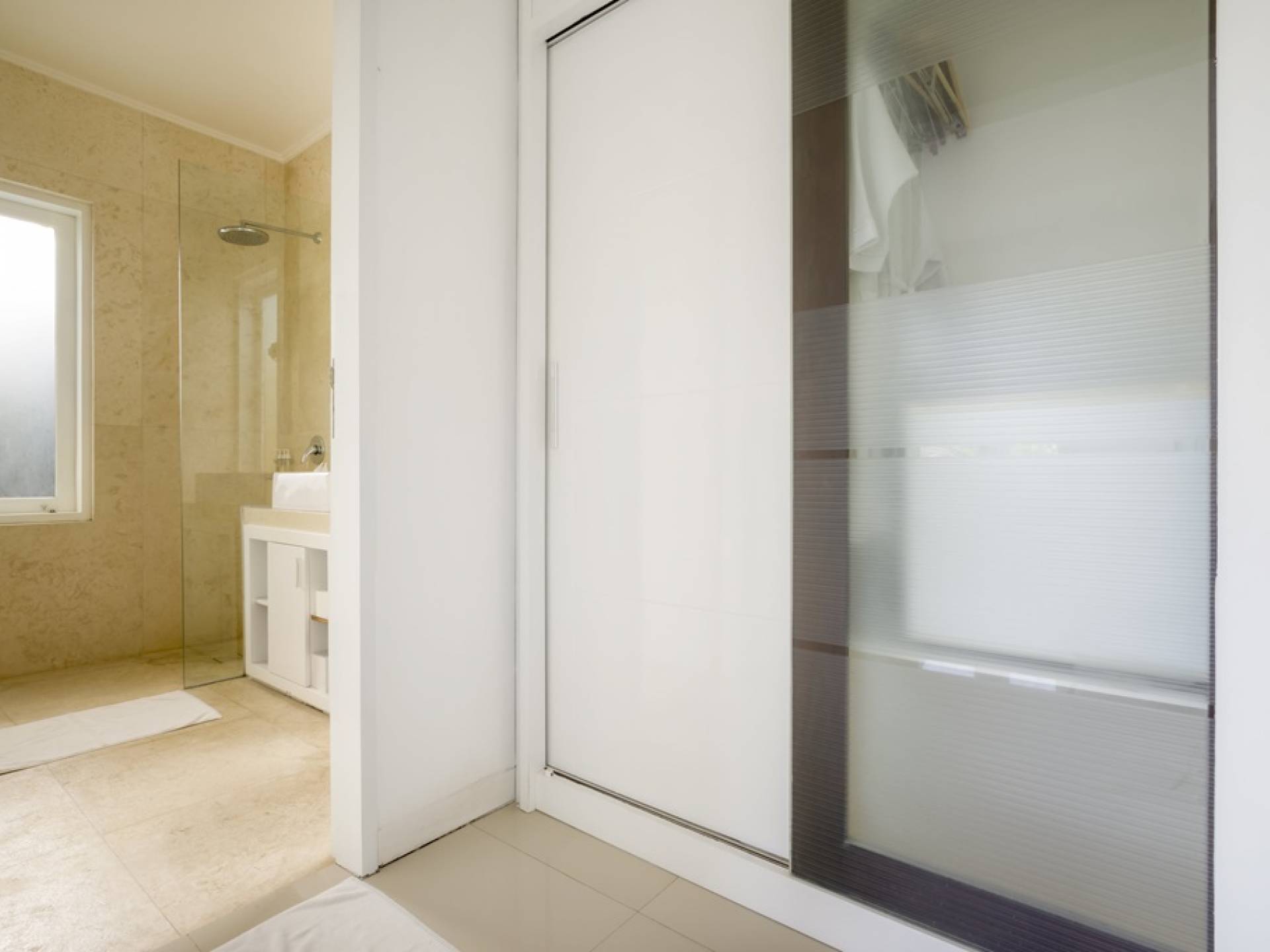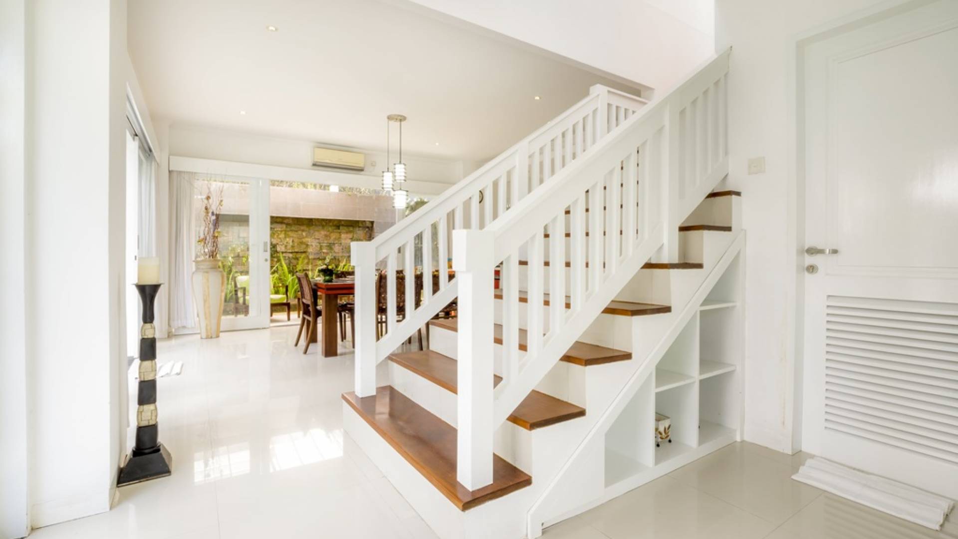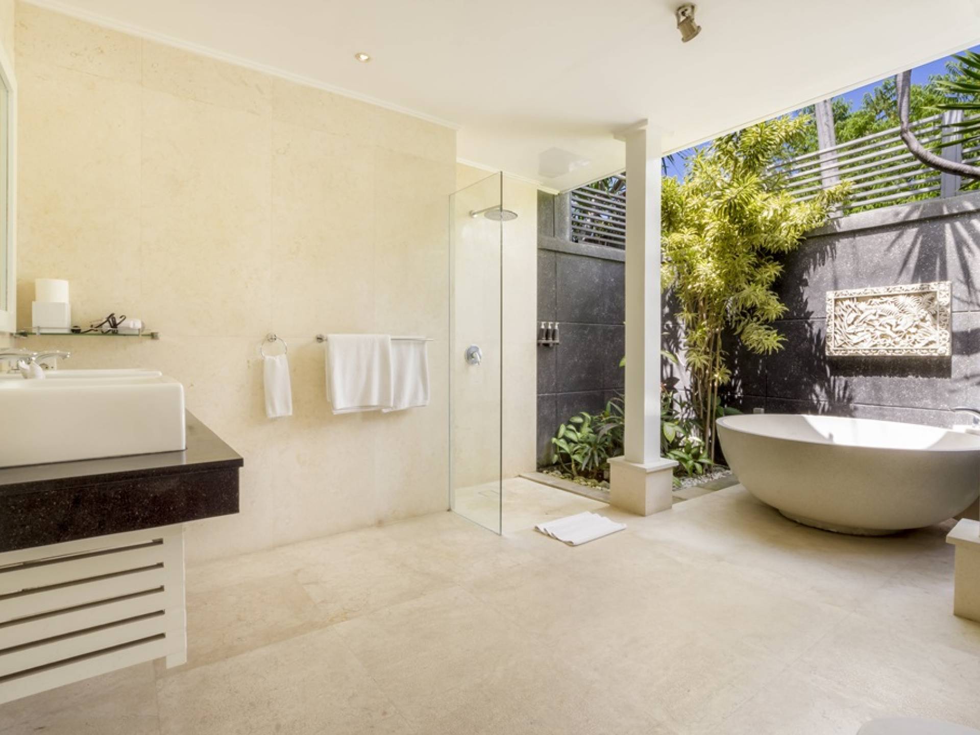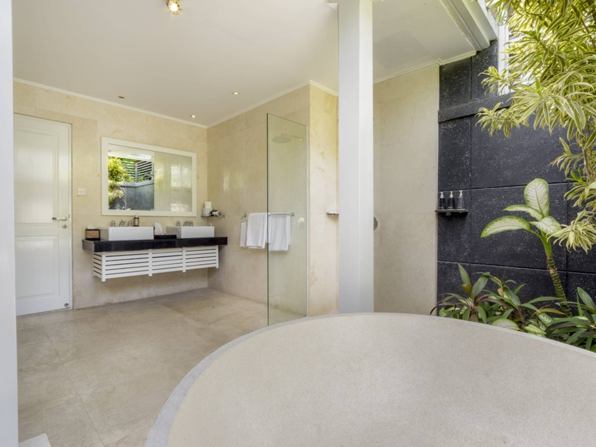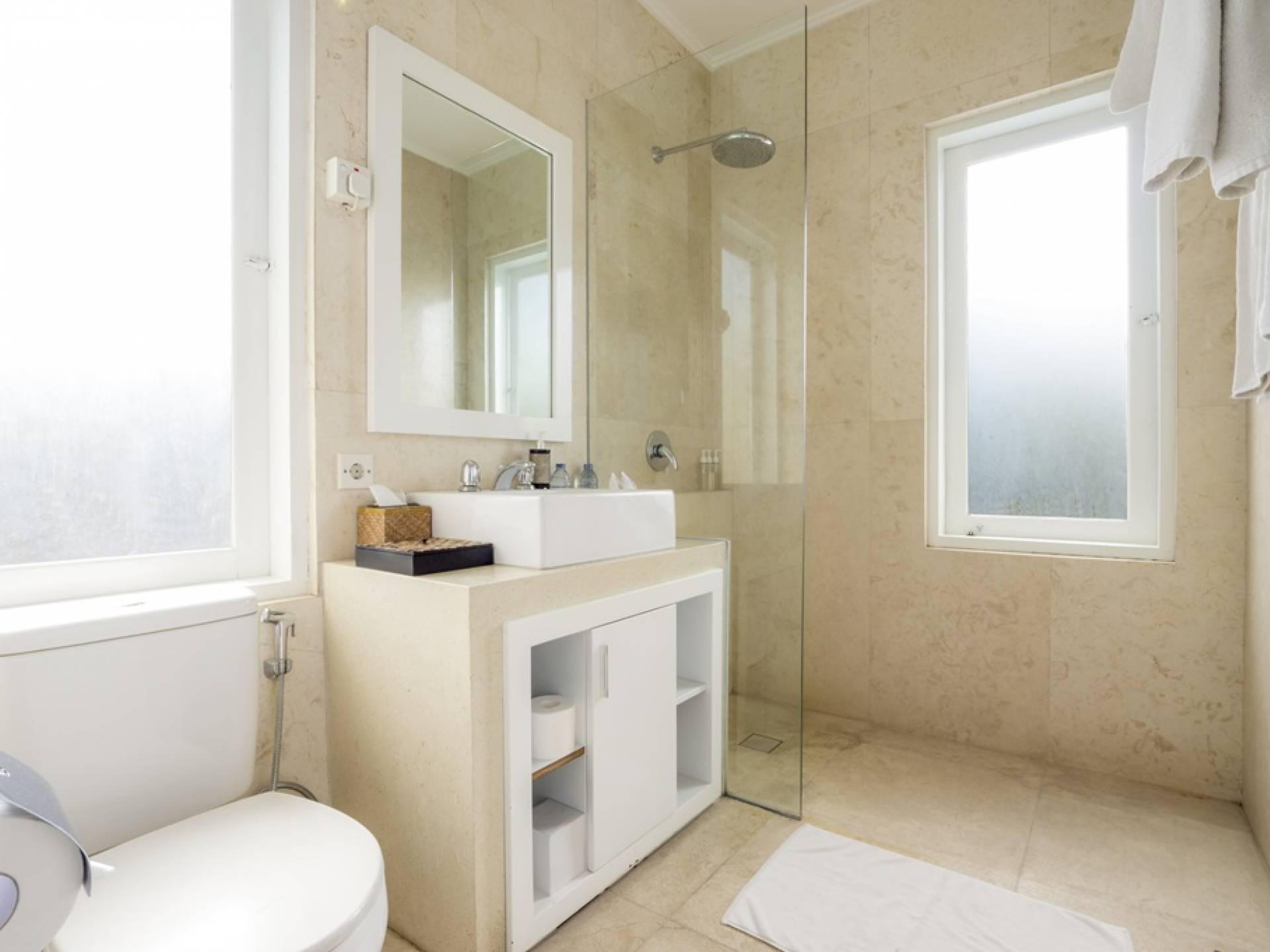 Villa Alun Seminyak strahlt gleichzeitig tropischen Charme und modernen Stil und Komfort aus. Das Anwesen verfügt über elegante ganz in Weiß gehaltene Pavillons mit balinesischen hohen Dächern, luftigen Balkonen und geschmackvoll gestalteten Innenräumen, die durch Farbthemen und asiatische Artefakte bereichert werden. Es gibt einen offenen Wohnbereich am Pool, komplett mit einer Schlafcouch, einem Sofa und einem Esstisch - perfekt für tagsüber Faulenzen und Grillfeste im Garten. Die Villa Alun verfügt auch über ein klimatisiertes Wohnzimmer mit durchgehenden Glasschiebetüren, die sich zum Garten öffnen und den Gästen die Wahl bieten, auf tropische Art zu leben oder einen gemeinsamen Mittelpunkt zu schaffen, um der tropischen Hitze von außen zu entfliehen.