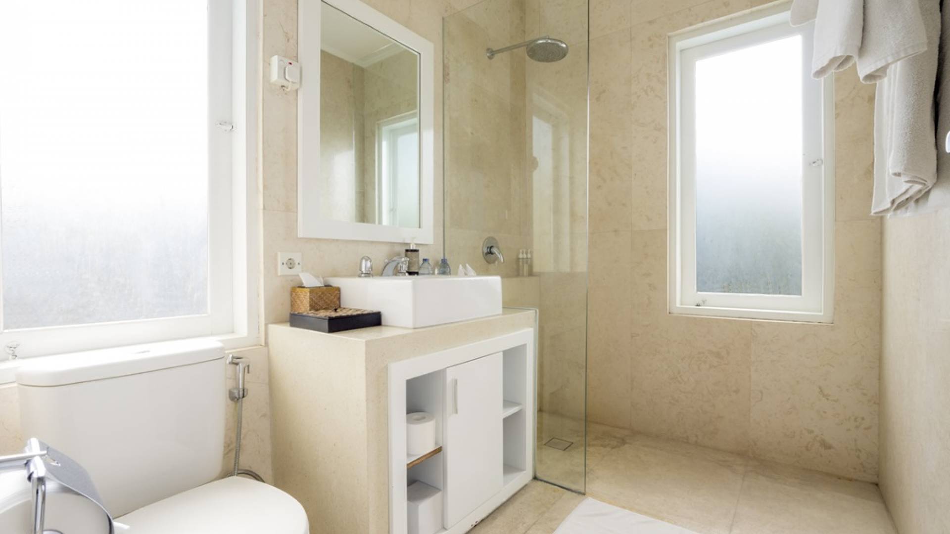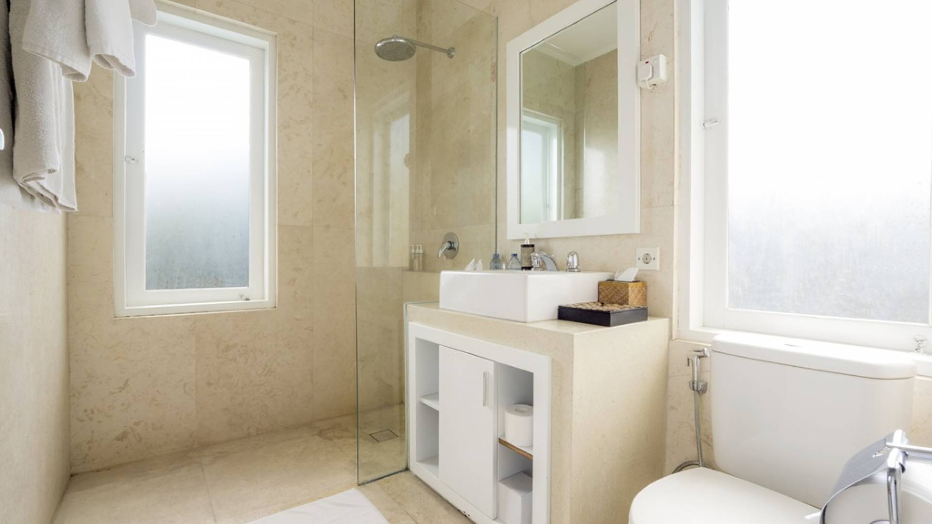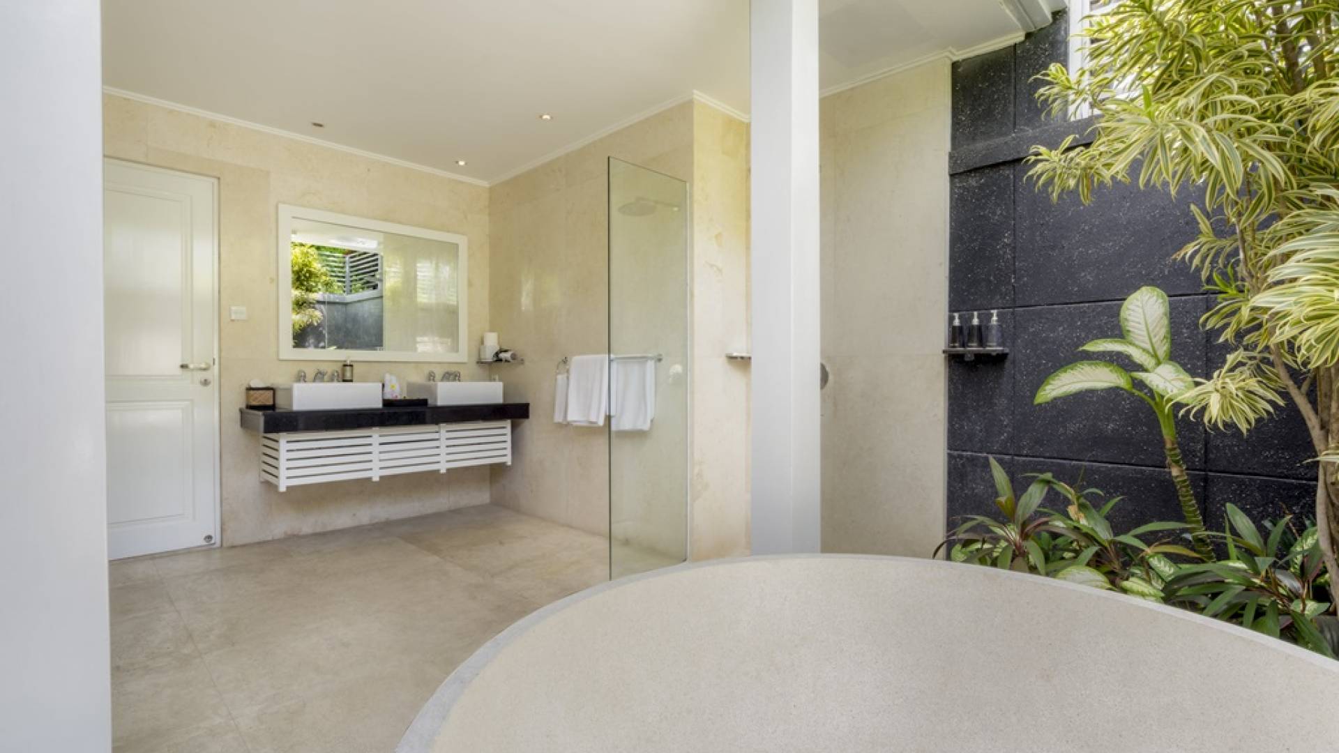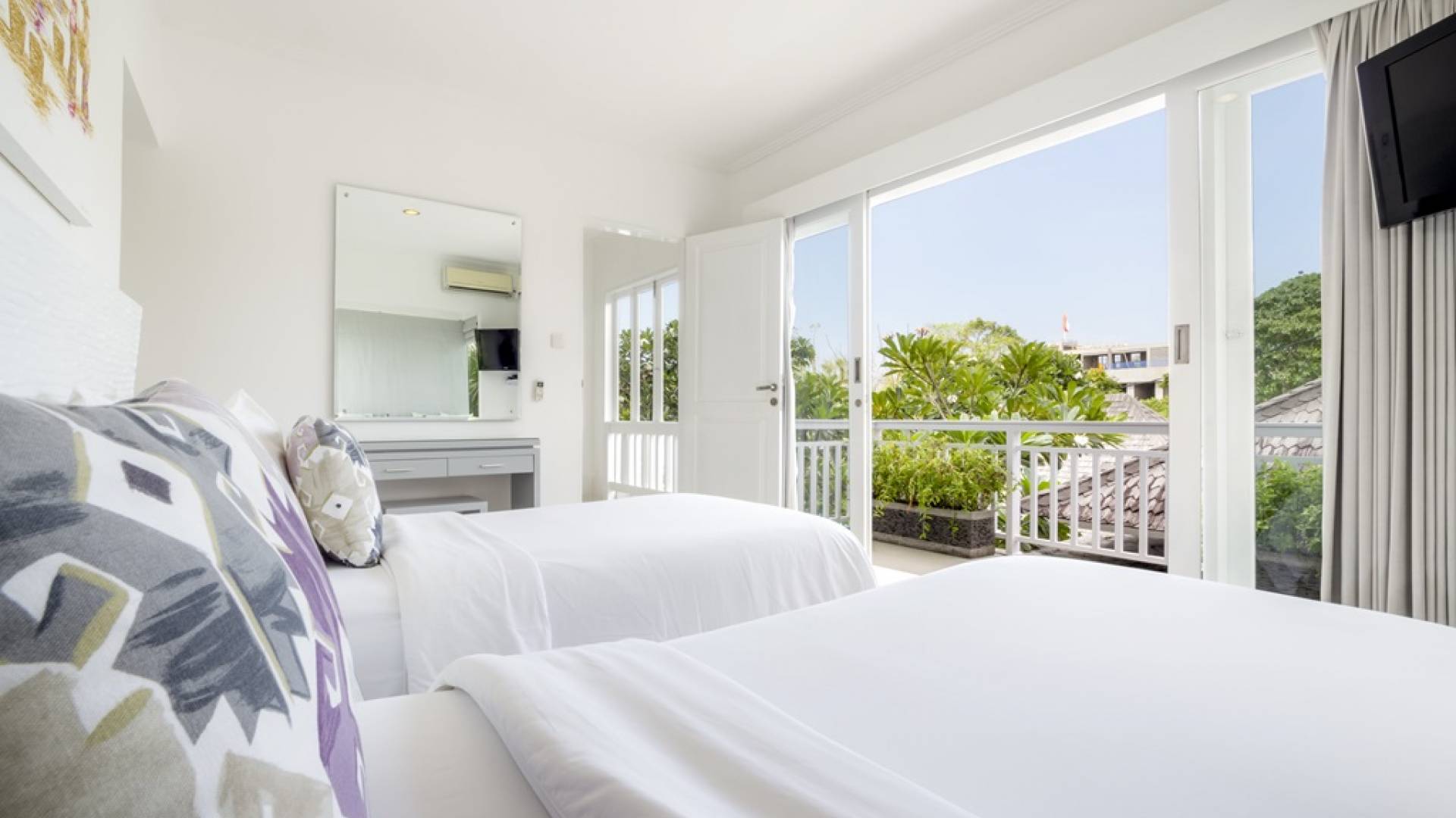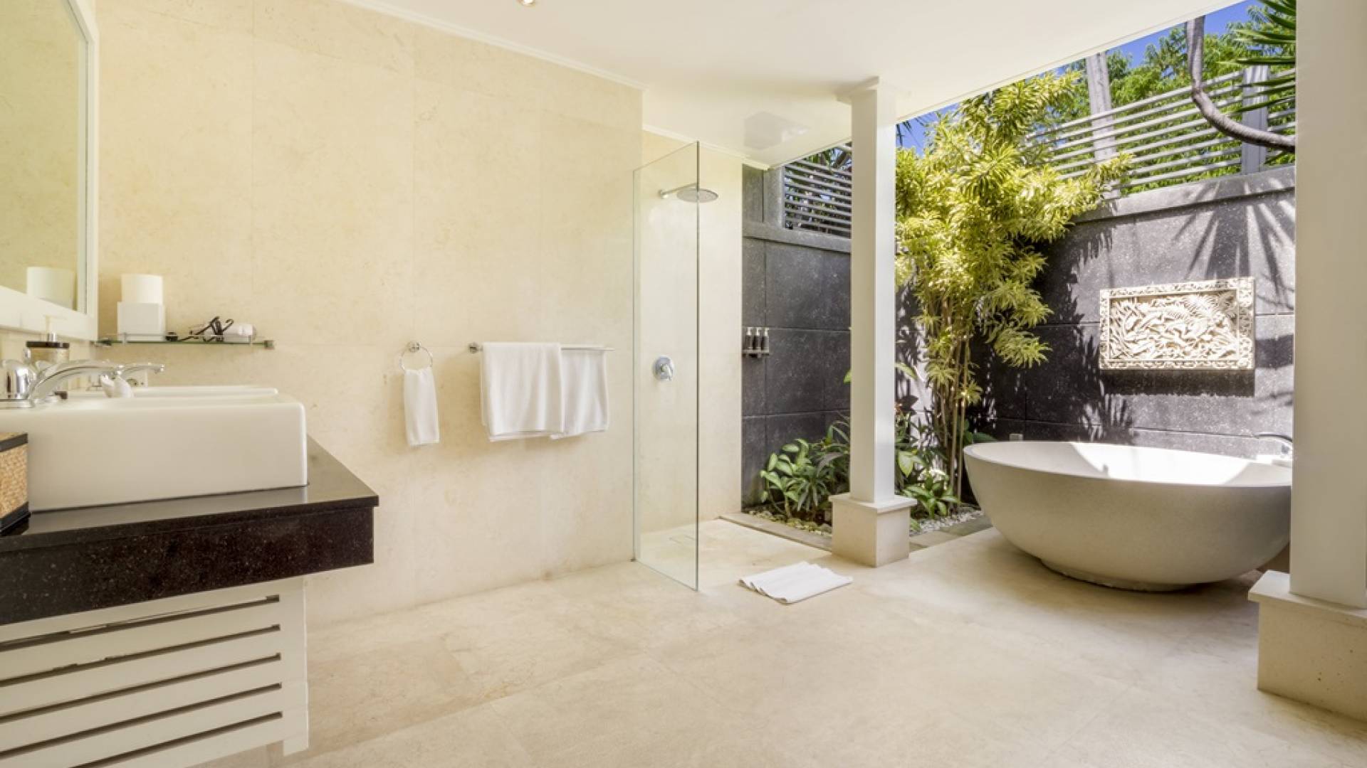 Villa Alun Seminyak strahlt gleichzeitig tropischen Charme und modernen Stil und Komfort aus. Das Anwesen verfügt über elegante ganz in Weiß gehaltene Pavillons mit balinesischen hohen Dächern, luftigen Balkonen und geschmackvoll gestalteten Innenräumen, die durch Farbthemen und asiatische Artefakte bereichert werden. Es gibt einen offenen Wohnbereich am Pool, komplett mit einer Schlafcouch, einem Sofa und einem Esstisch - perfekt für tagsüber Faulenzen und Grillfeste im Garten. Die Villa Alun verfügt auch über ein klimatisiertes Wohnzimmer mit durchgehenden Glasschiebetüren, die sich zum Garten öffnen und den Gästen die Wahl bieten, auf tropische Art zu leben oder einen gemeinsamen Mittelpunkt zu schaffen, um der tropischen Hitze von außen zu entfliehen.