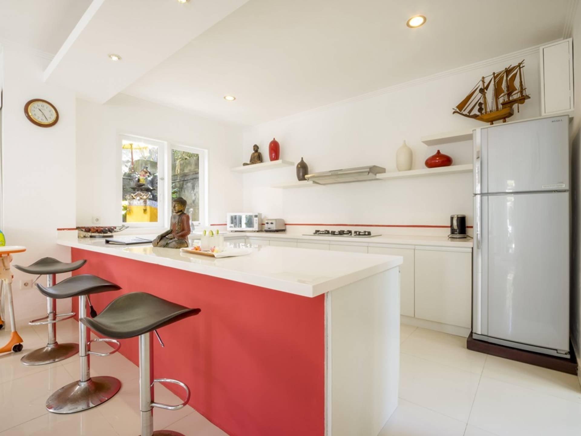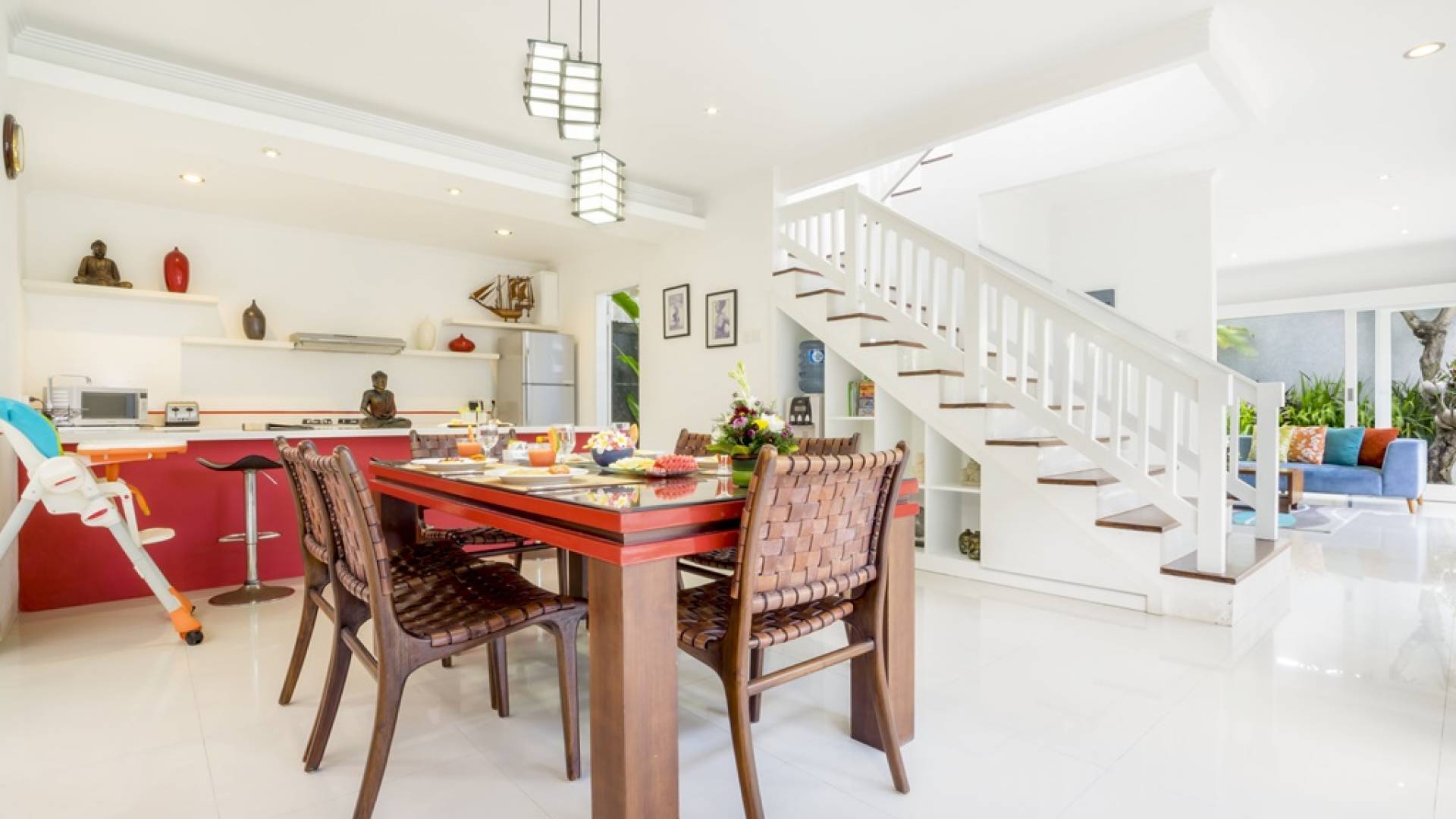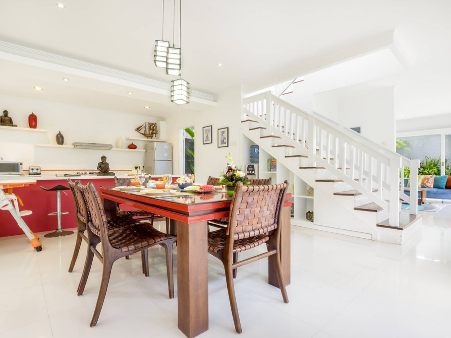 Die Lounge verfügt über ein wunderschönes, super bequemes blaues Sofa, auf dem Sie sich zu jeder Tageszeit entspannen, ein Buch lesen oder einen Film auf dem Hightech-Fernseher mit Surround-Sound-Lautsprechern ansehen können. Der Speiseflügel wird von schicken roten Farben beherrscht, mit einem roten Esstisch mit Glasplatte für sechs Personen und einer hochmodernen Küche mit Frühstückstheke und Hockern. Ein Garten ist ein exotischer Ort mit einem Fischteich, einer Buddha-Skulptur, duftenden Frangipani-Bäumen und einem besonderen Bonsai-Tamarinde-Baum. Im Herzen, wenn der Garten schimmert, der private, klar blaue Swimmingpool, flankiert von einer steinernen Sonnenterrasse mit Liegestühlen und großen blauen Sonnenschirmen.