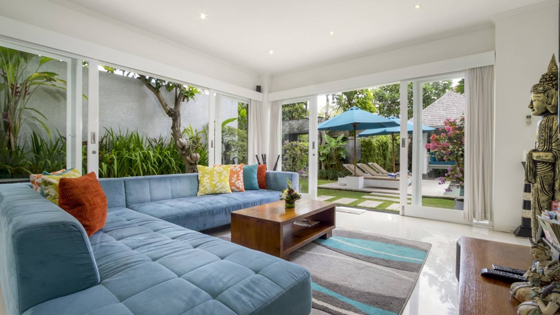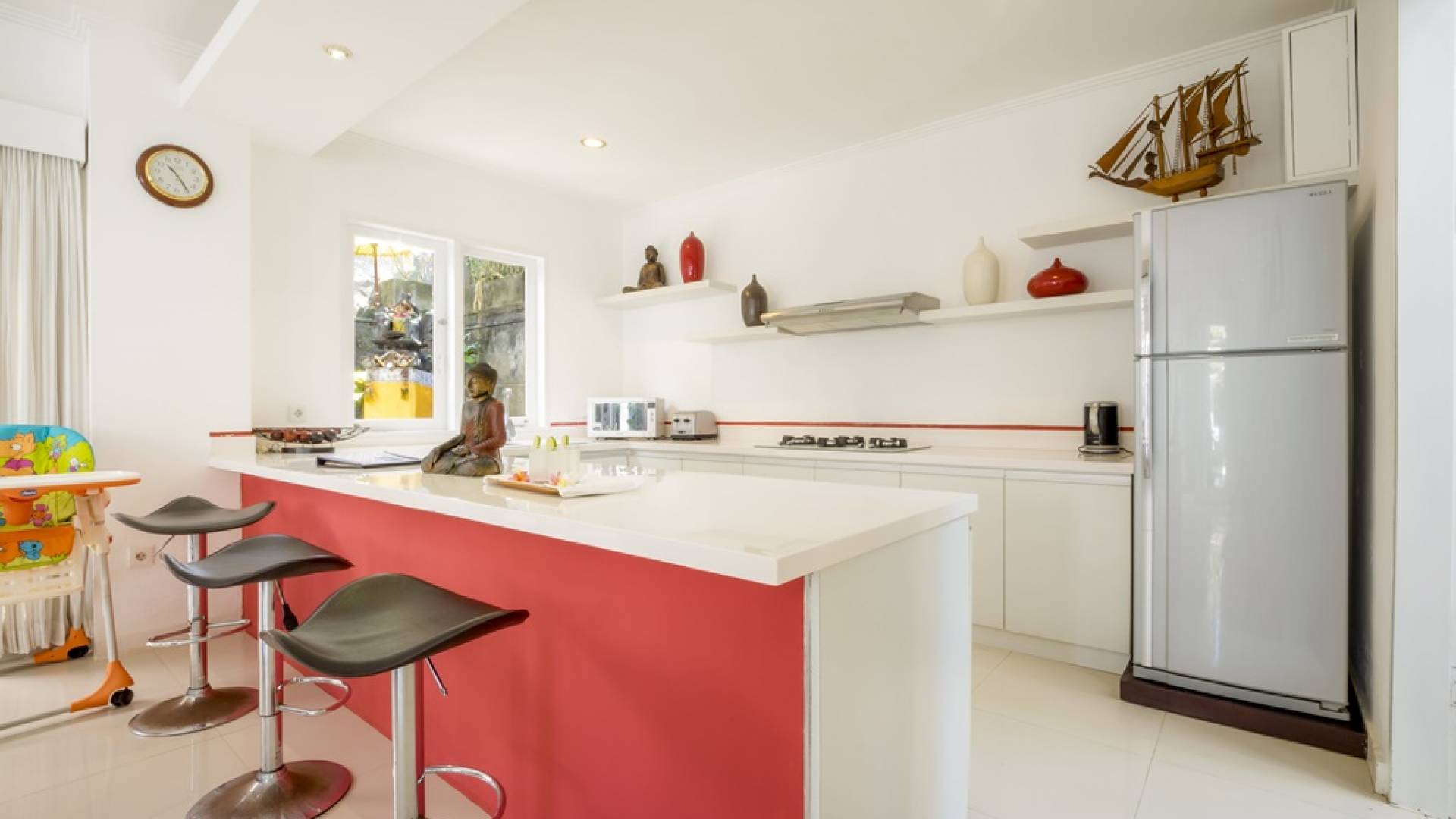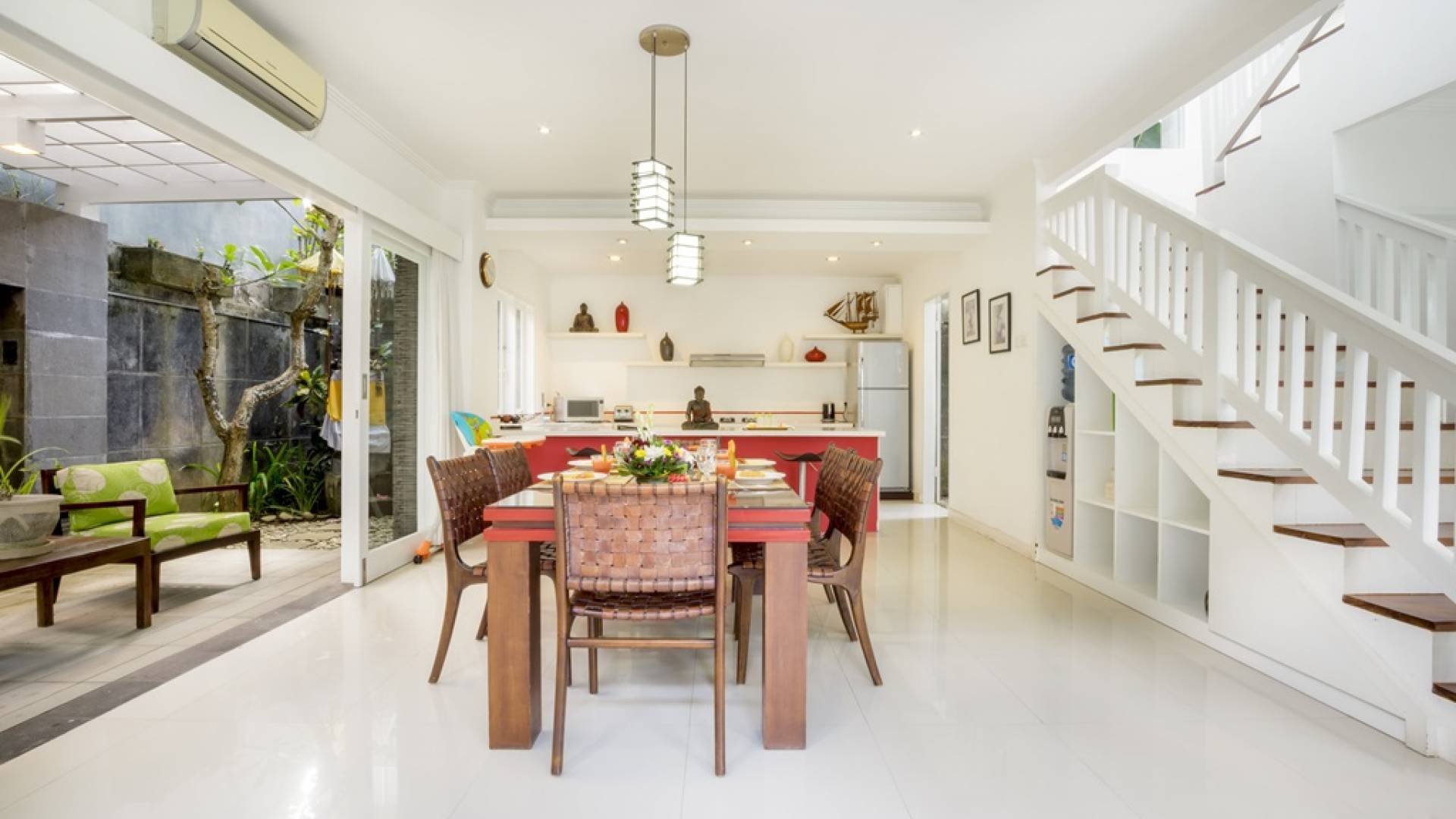 Die Lounge verfügt über ein wunderschönes, super bequemes blaues Sofa, auf dem Sie sich zu jeder Tageszeit entspannen, ein Buch lesen oder einen Film auf dem Hightech-Fernseher mit Surround-Sound-Lautsprechern ansehen können. Der Speiseflügel wird von schicken roten Farben beherrscht, mit einem roten Esstisch mit Glasplatte für sechs Personen und einer hochmodernen Küche mit Frühstückstheke und Hockern. Ein Garten ist ein exotischer Ort mit einem Fischteich, einer Buddha-Skulptur, duftenden Frangipani-Bäumen und einem besonderen Bonsai-Tamarinde-Baum. Im Herzen, wenn der Garten schimmert, der private, klar blaue Swimmingpool, flankiert von einer steinernen Sonnenterrasse mit Liegestühlen und großen blauen Sonnenschirmen.