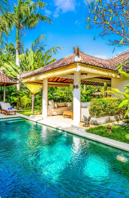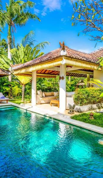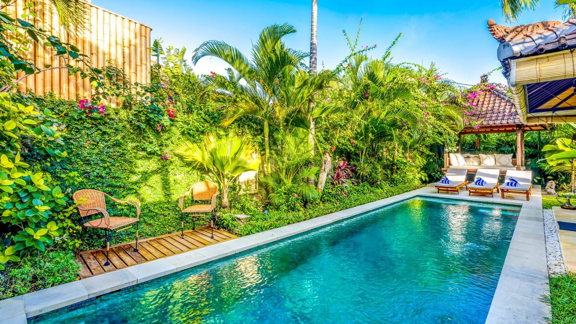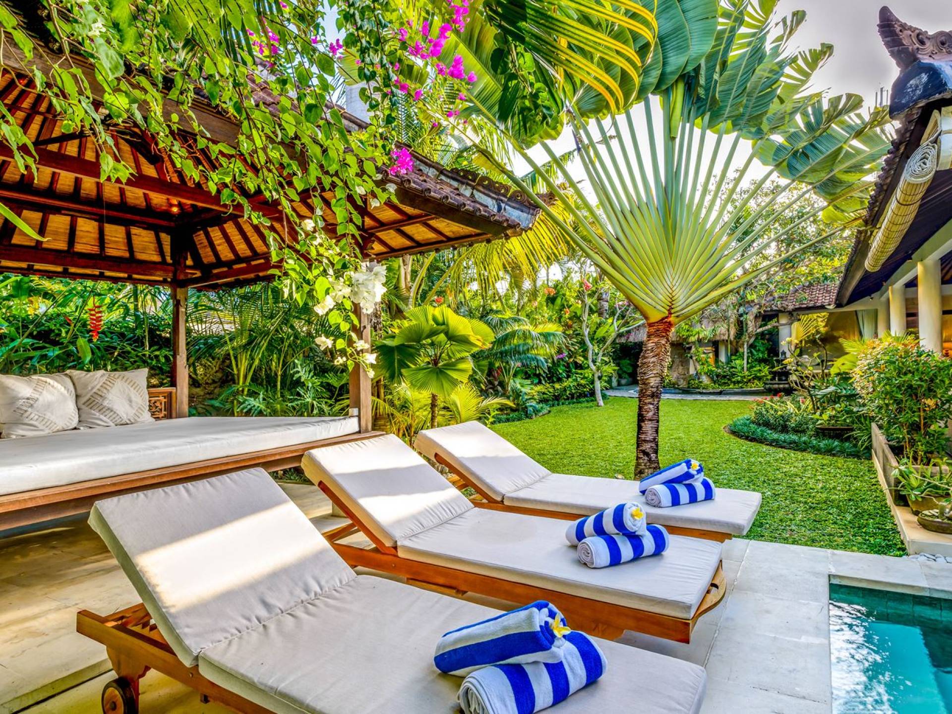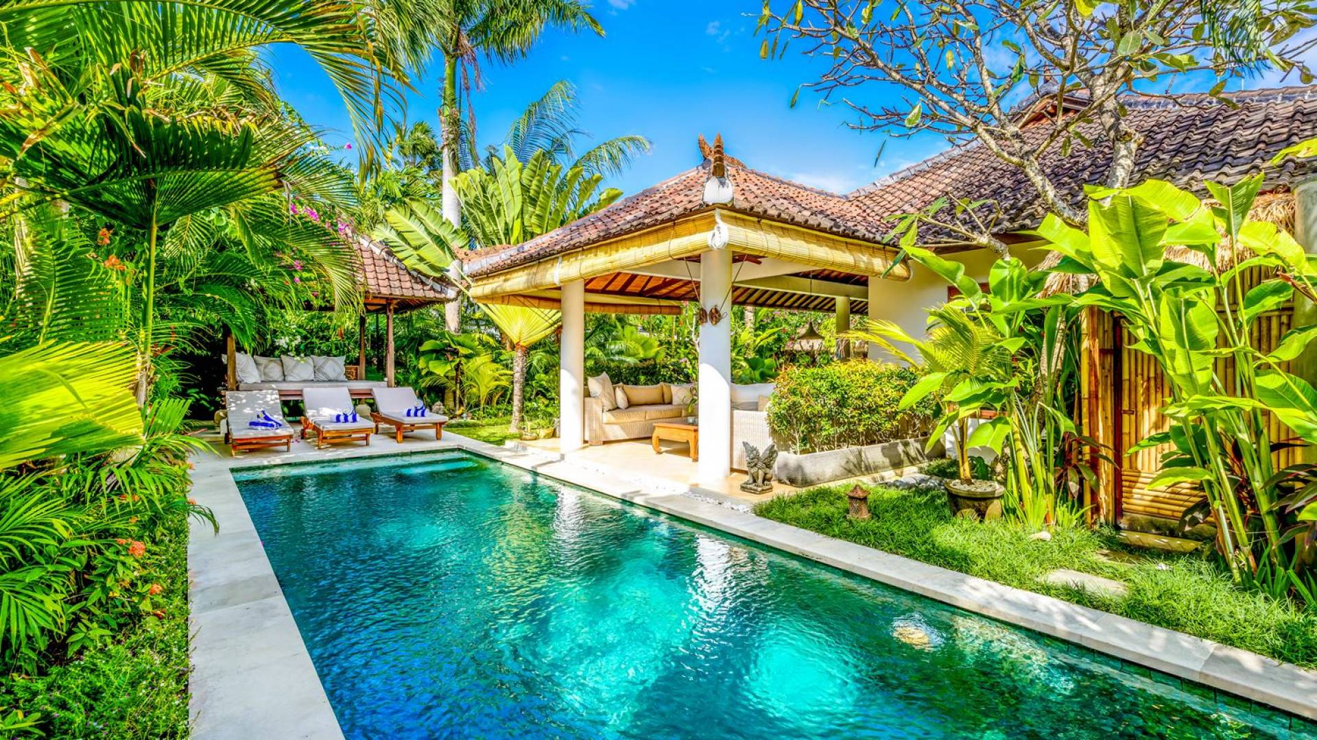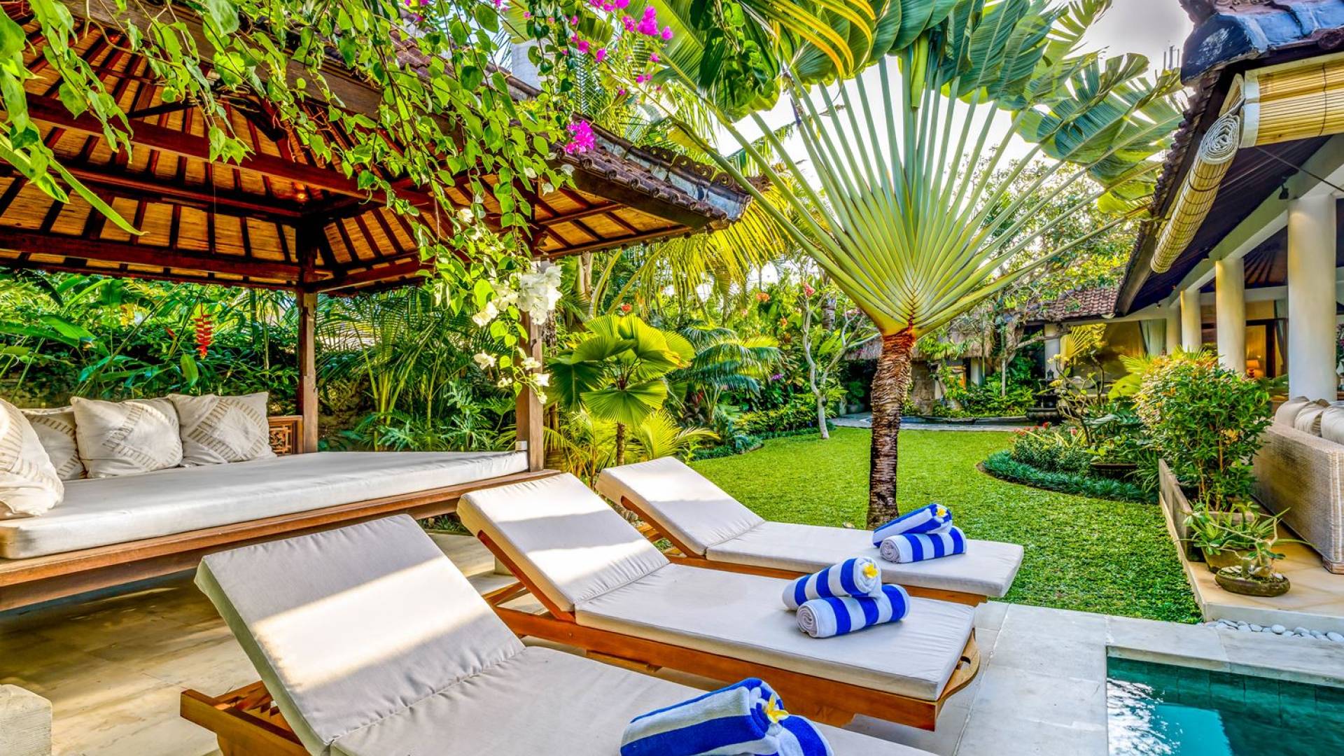 Diese Villa mit 3 Schlafzimmern liegt nur wenige Gehminuten vom Strand von Seminyak entfernt und verfügt über einen Wohnbereich im Freien, der an einen Essbereich angrenzt, sowie eine gut ausgestattete Küche. Draußen gibt es einen großen gepflegten Rasen und Grün, das einen privaten Pool mit Liegestühlen am Pool, Außenstühlen und einem großen Pavillon / Ballen umgibt, der sich ideal für ein Nickerchen oder Entspannung am Nachmittag eignet. Alle Zimmer auf einer Ebene und eine Rasenfläche mit einem üppigen tropischen Garten machen diese Villa zu einer perfekten Wahl für ältere Menschen und eine Familie, die mit Kindern reist.