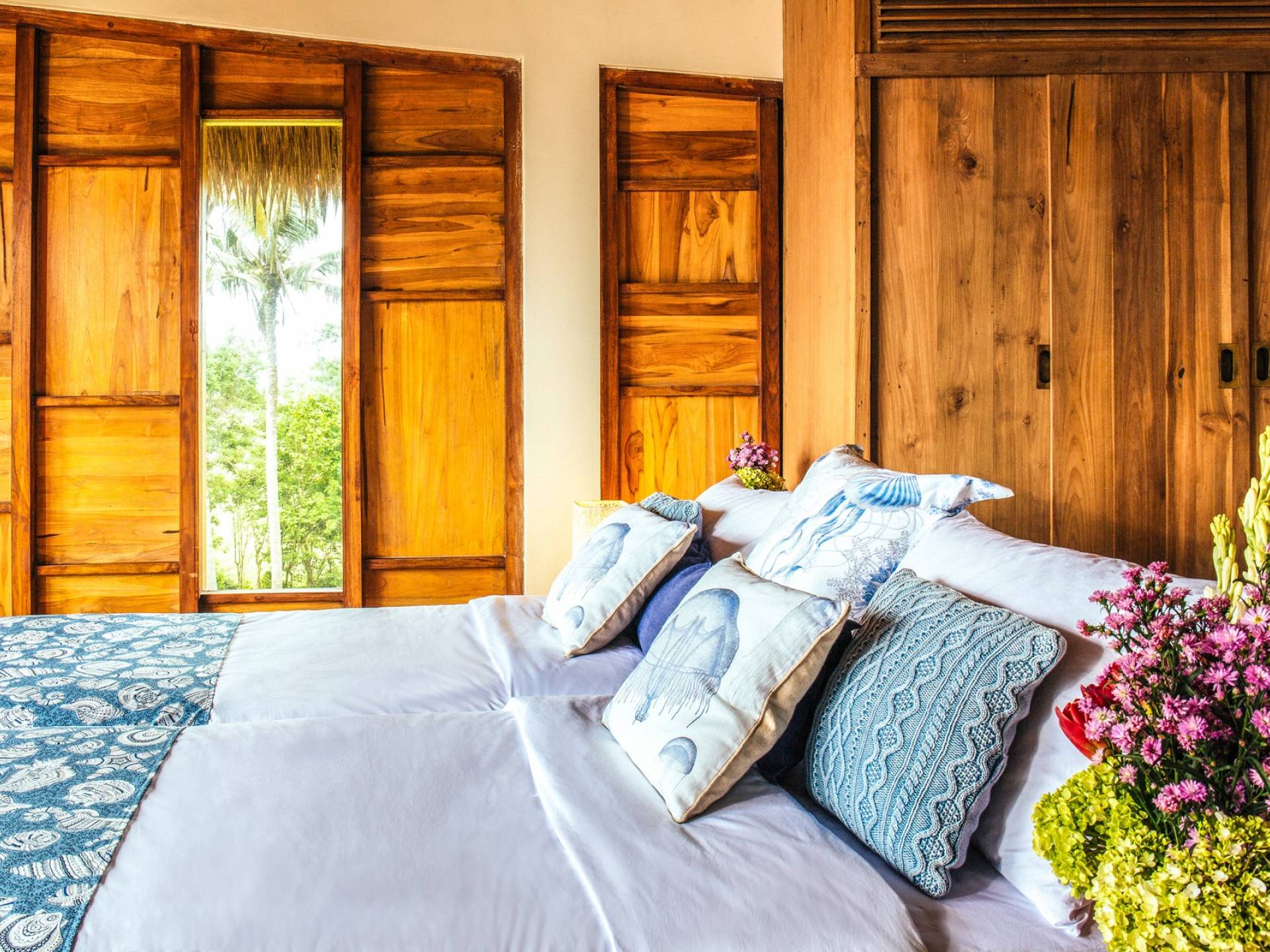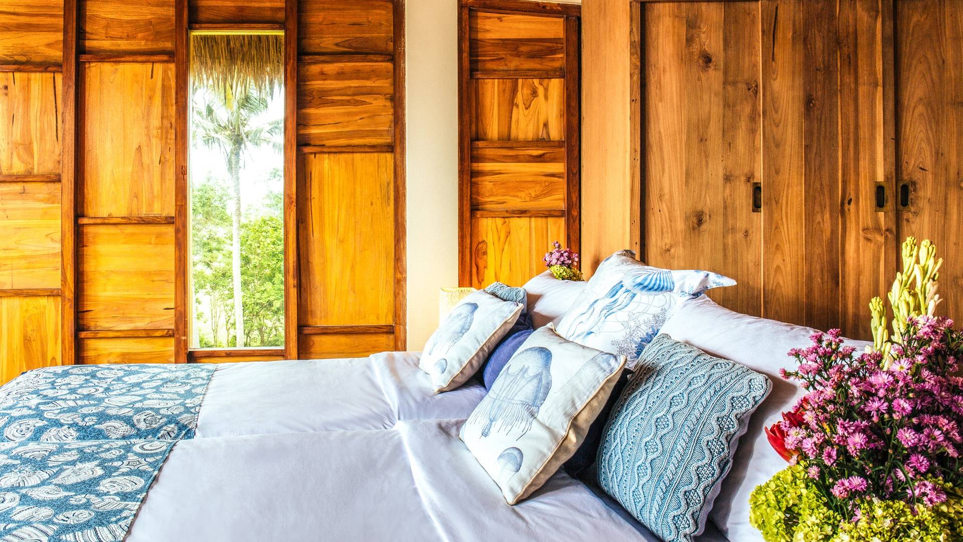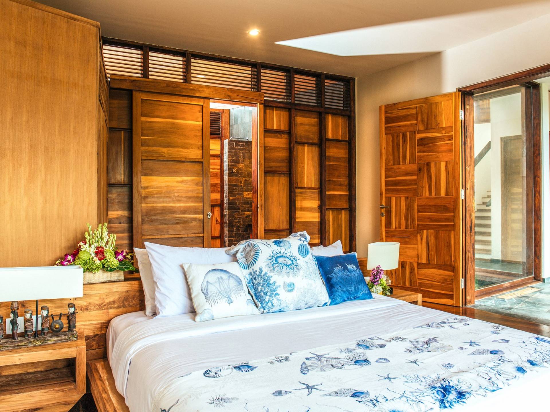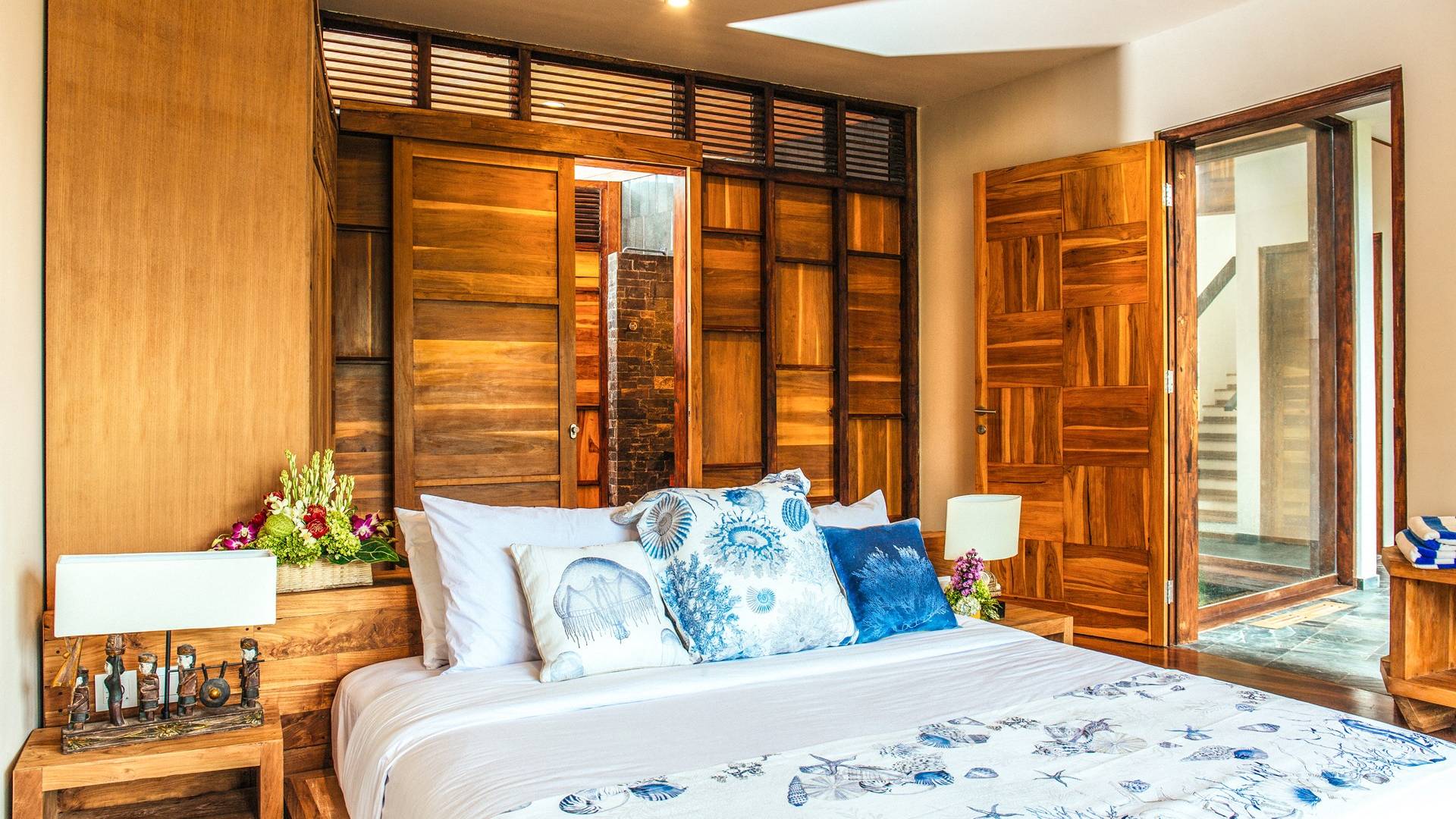 Das Cove Bali verfügt über 4 Schlafzimmer im Haupthaus und ein separates Gästehaus mit einem Schlafzimmer in der Nähe des Pools. Jedes Schlafzimmer hat seine eigene Terrasse oder Deck mit Blick auf das Meer und bietet den Gästen von jedem Zimmer aus einen wunderschönen Meerblick. Die Schlafzimmer haben eine komfortable Größe mit einer gemütlichen Atmosphäre. Jedes verfügt über eine eigene Klimaanlage und einen Deckenventilator für maximalen Komfort.