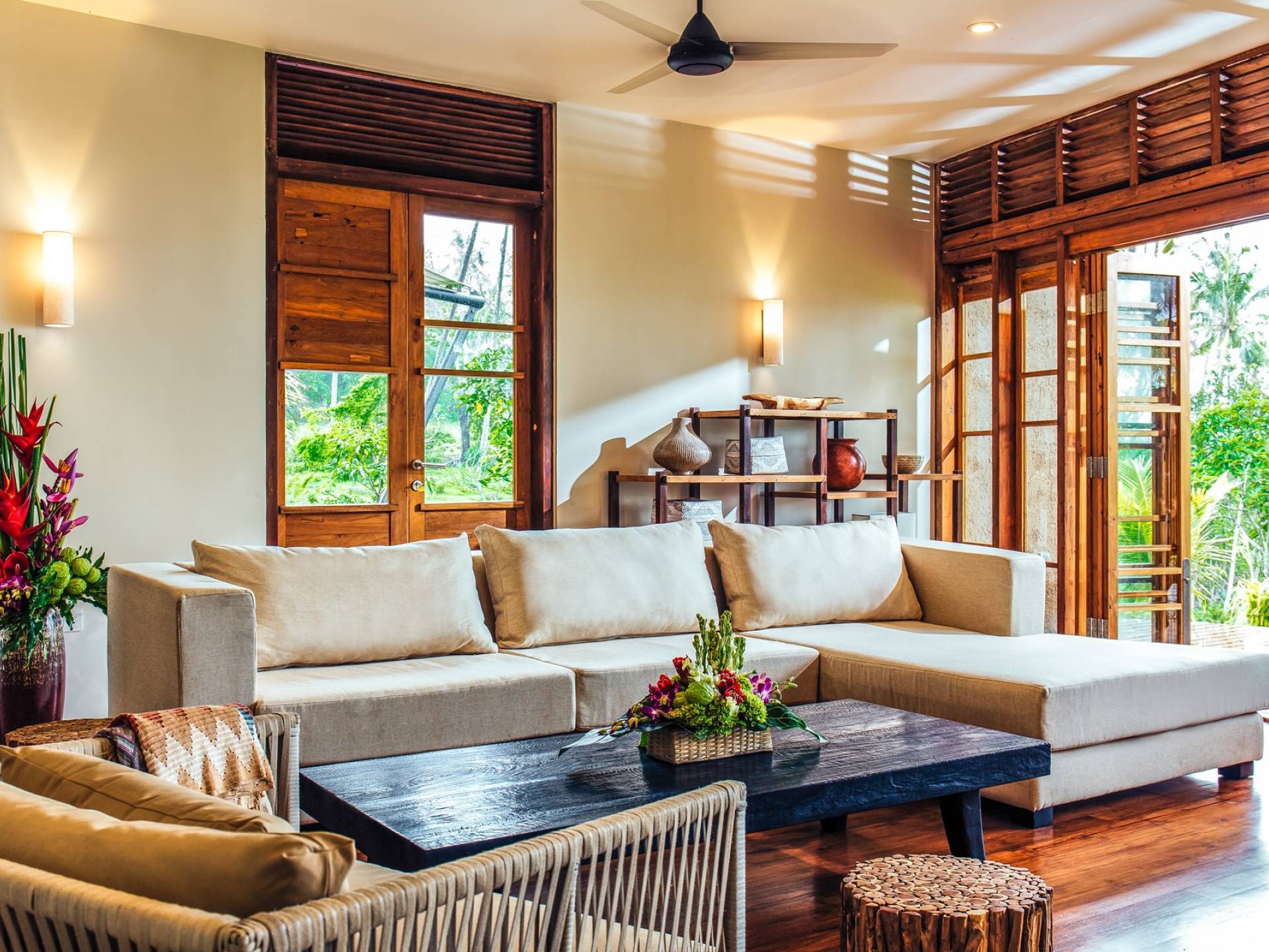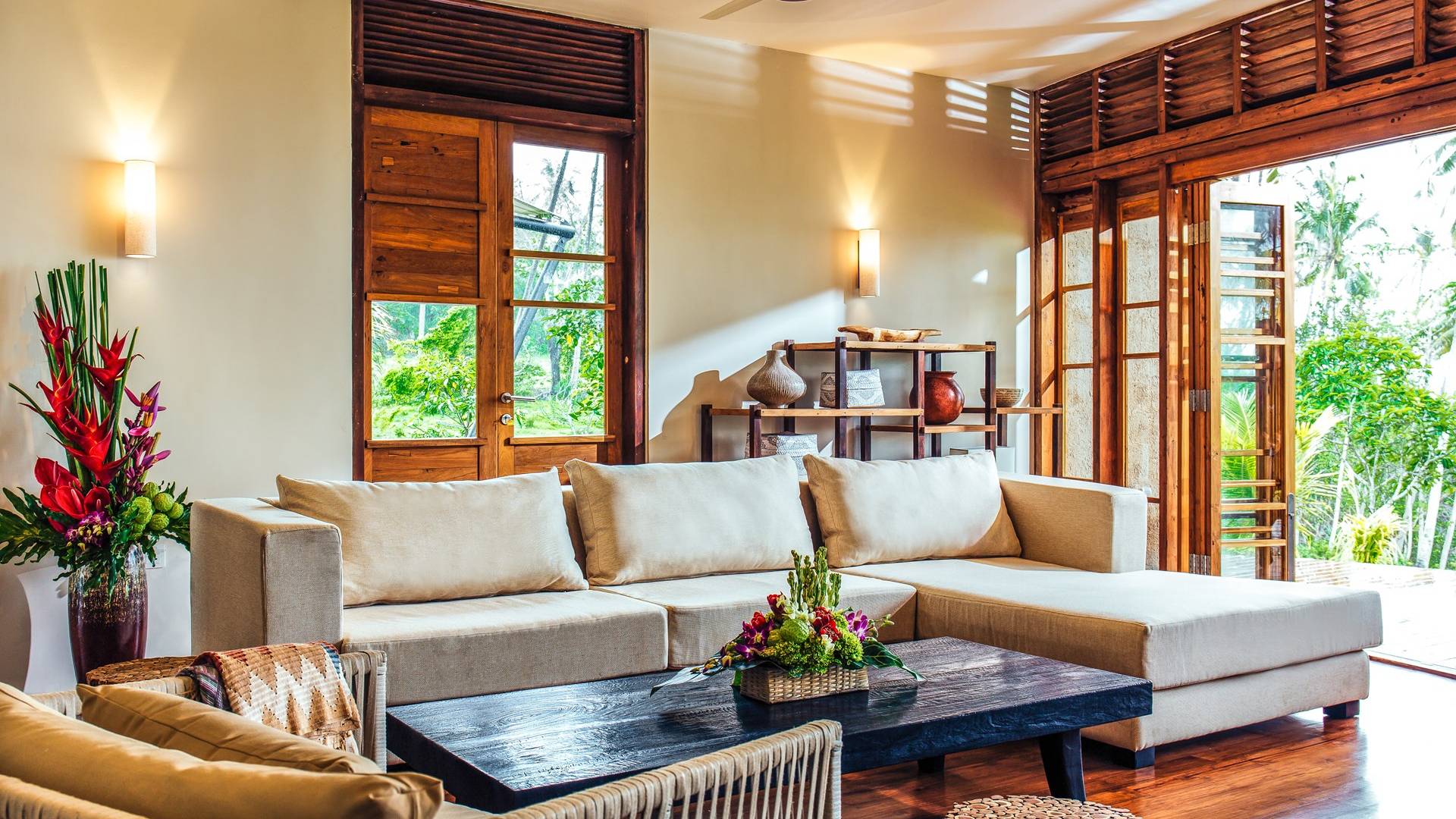 In The Cove Bali können die Gäste auch in den Wohnbereichen der Villa die tropische Atmosphäre Balis genießen, mit Türen von Wand zu Wand und atemberaubenden Ausblicken, die einen nahtlosen Übergang zwischen Innen- und Außenbereich bieten. Nutzen Sie das Essen im Freien, die Loungebereiche und das Wohnzimmer mit bequemen Sofas und einem Filmprojektor.