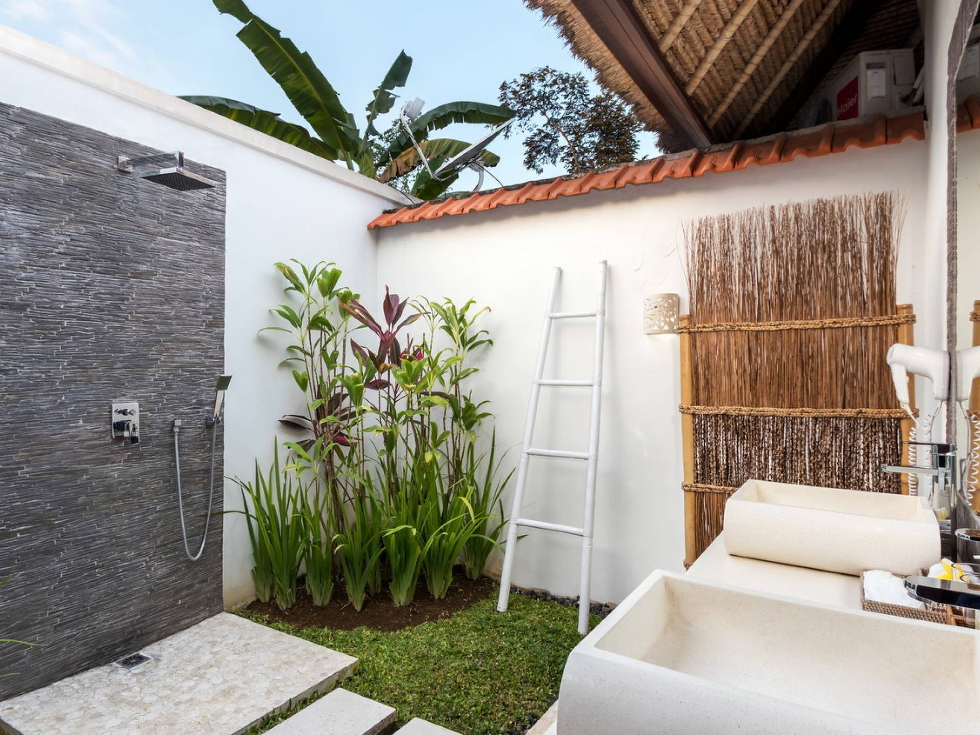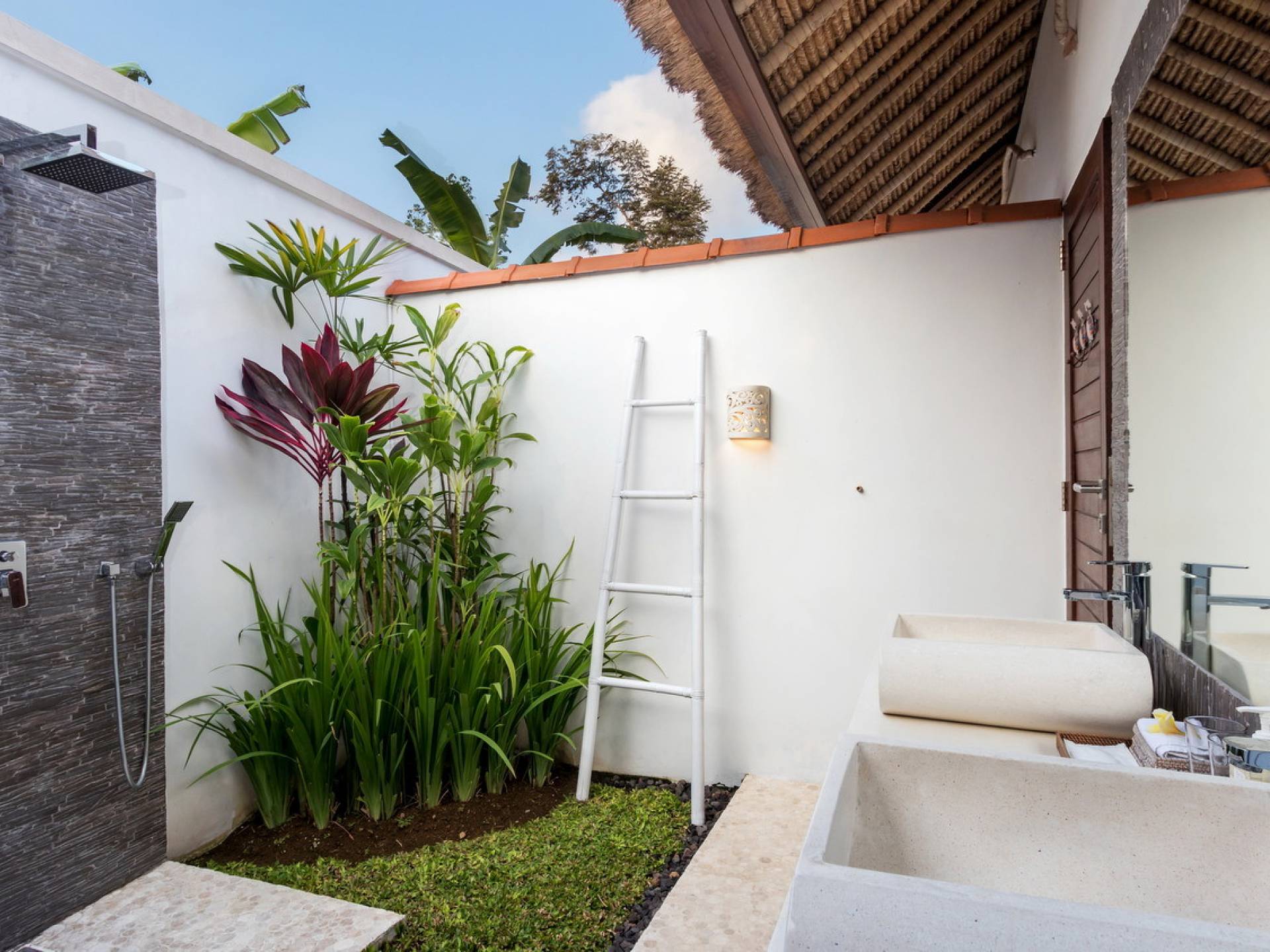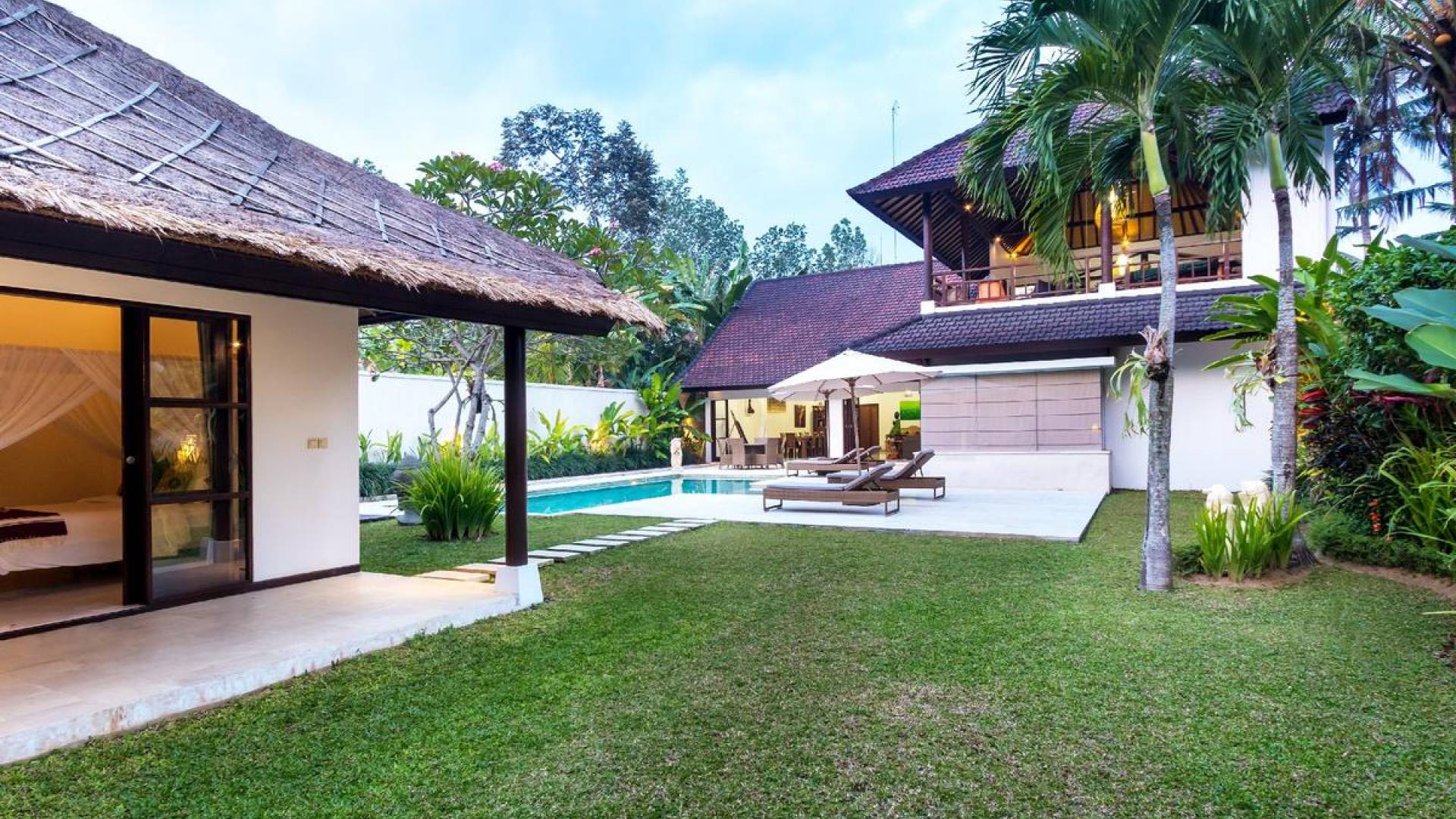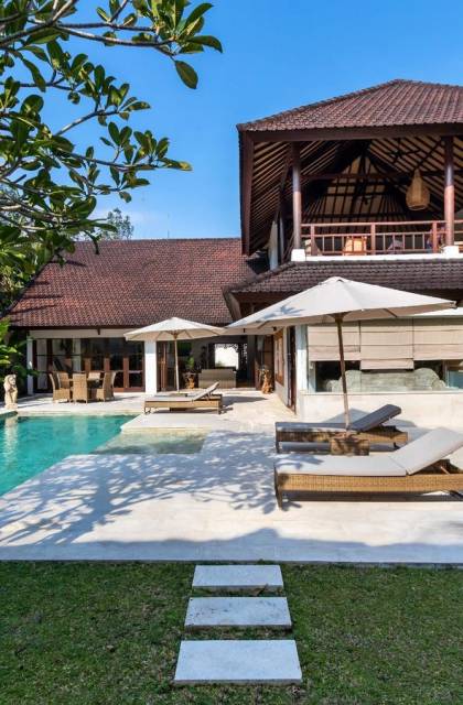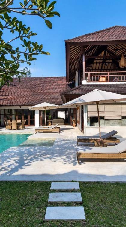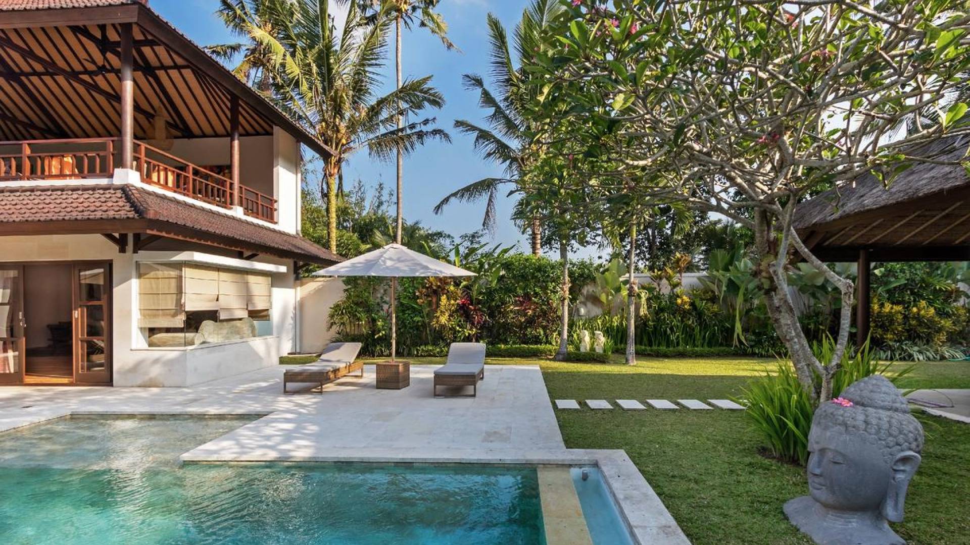 Eine kunstvoll geschnitzte Holztür führt in den üppigen tropischen Garten der Villa Candi Kecil Empat. Eine Oase der Weite und Ruhe, in der Koi-Teiche, Springbrunnen und ein einladend glitzernder Swimmingpool mit flachem Planschbecken für die Kinder warten. Auf dem steinernen Sonnendeck wurden bequeme Liegestühle zum Entspannen im Schatten eines großen weißen Sonnenschirms oder zum Sonnenbaden aufgestellt, um an der wunderschönen tropischen Inselbräune zu arbeiten, die Sie mit nach Hause nehmen können. Kinder können sicher auf dem gepflegten Rasen des Gartens spielen, während die Eltern im strohgedeckten Pavillon eine traditionelle balinesische Massage genießen. An einem Ende des Pools, in der Nähe des Statuenbrunnens, der eine wunderbar friedliche Atmosphäre schafft, steht ein Esstisch im Freien, an dem die Gäste ihr Frühstück, Nachmittagscocktails oder Candlelight-Dinner unter den Sternen genießen können.