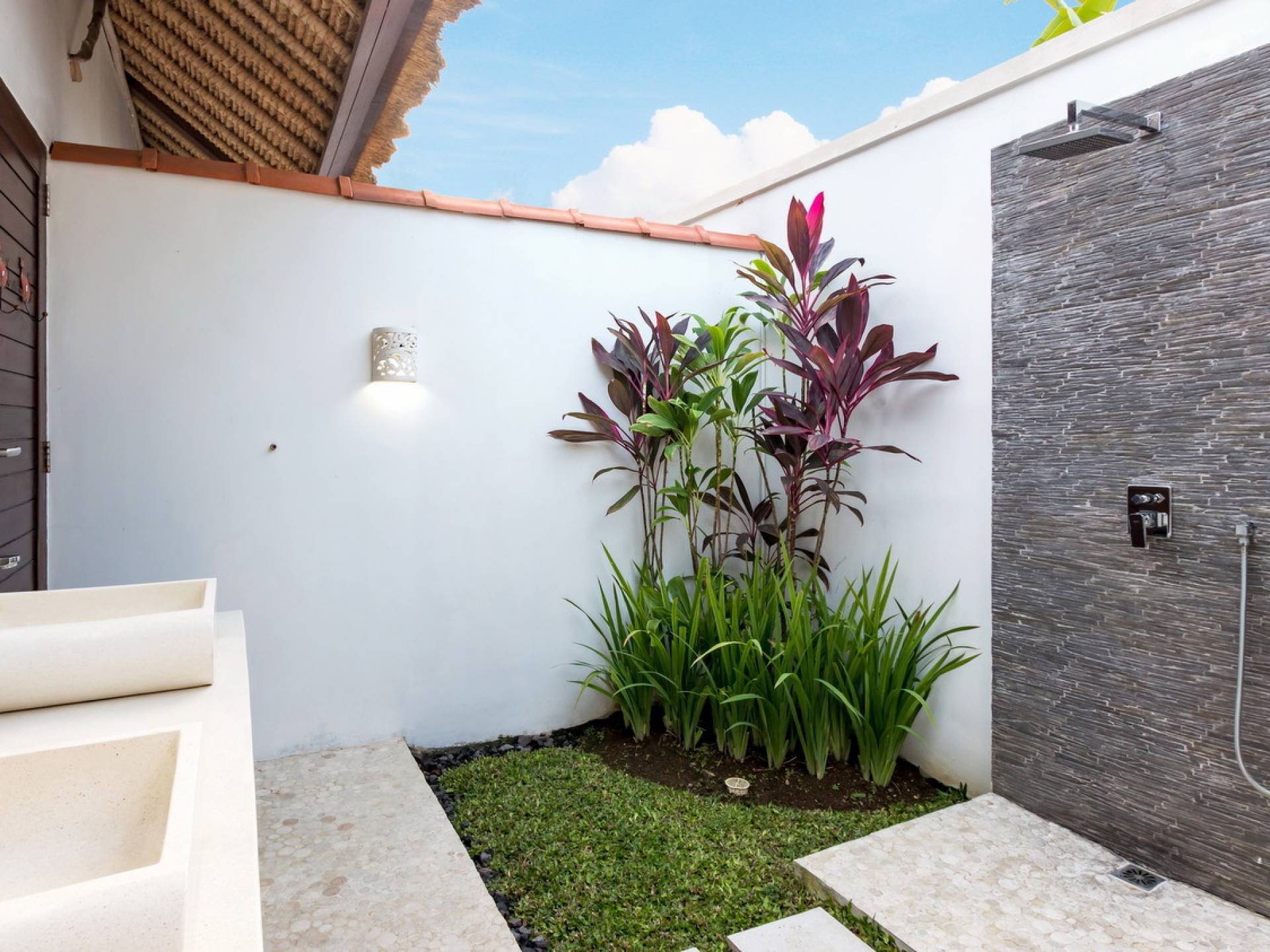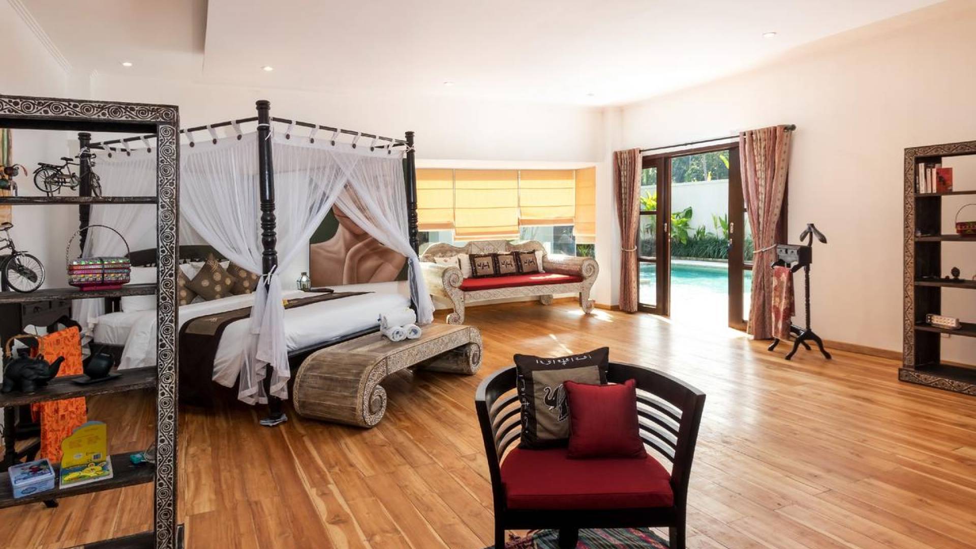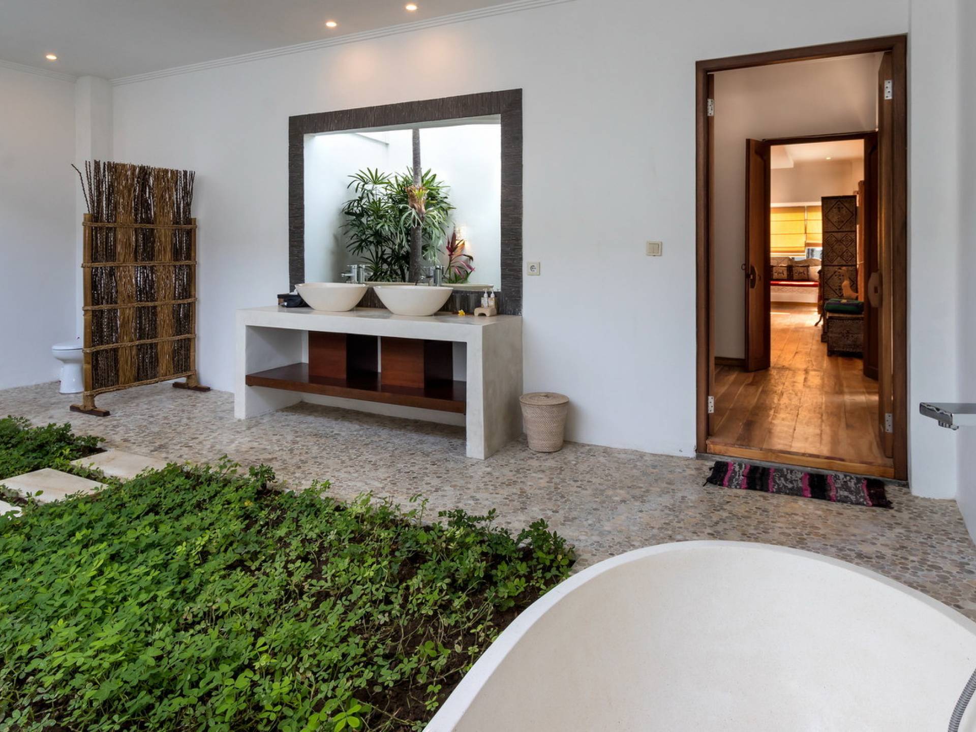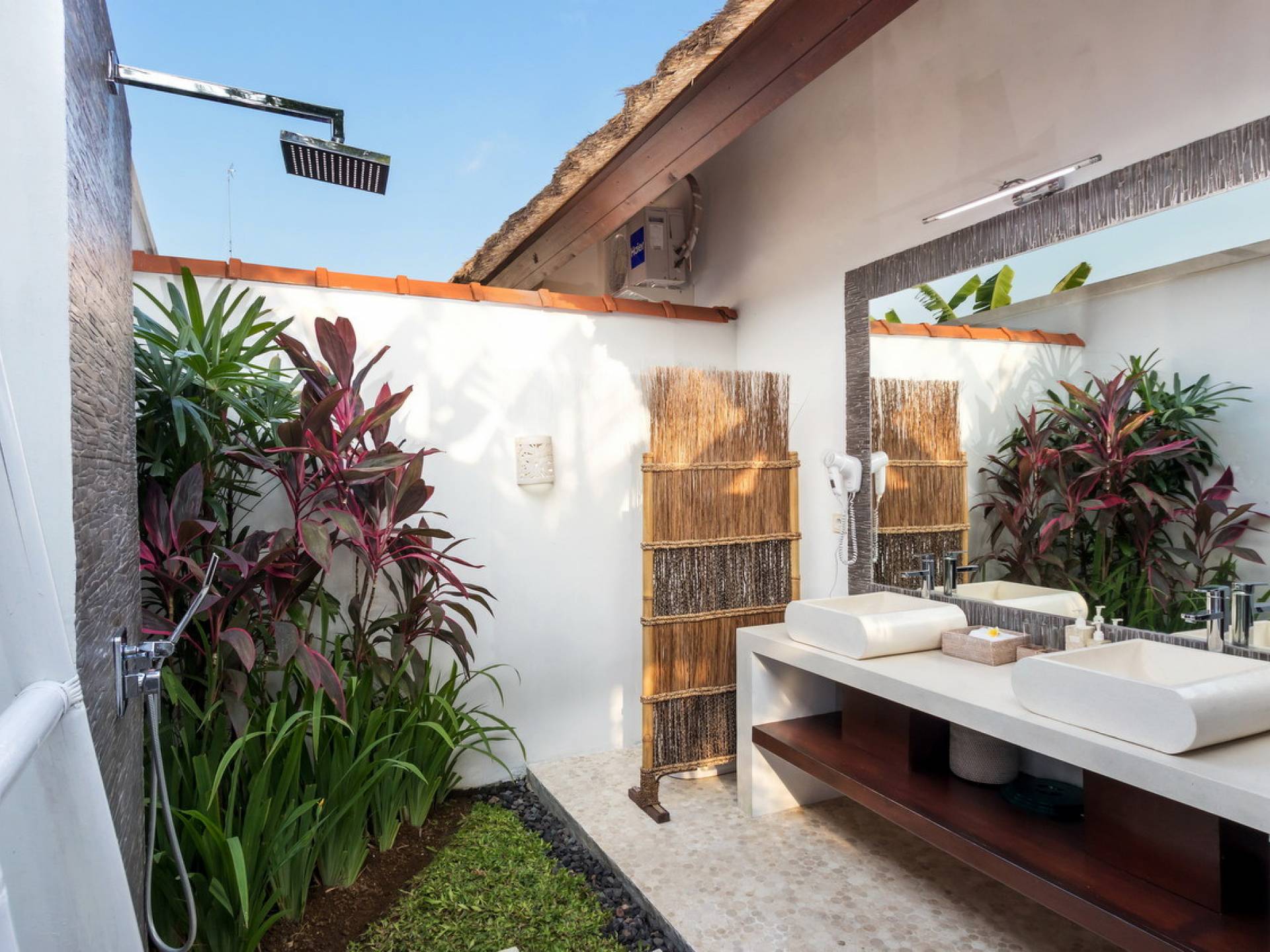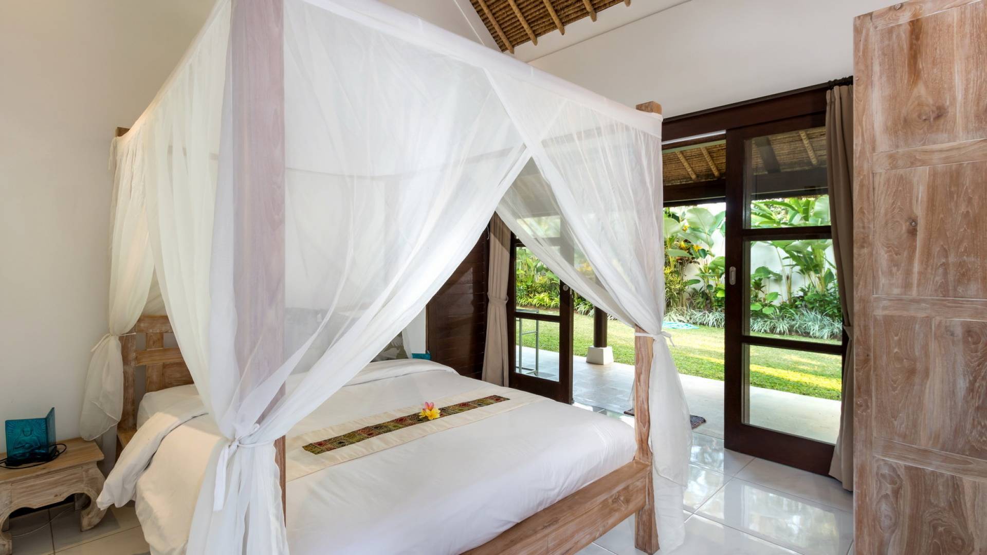 Eine kunstvoll geschnitzte Holztür führt in den üppigen tropischen Garten der Villa Candi Kecil Empat. Eine Oase der Weite und Ruhe, in der Koi-Teiche, Springbrunnen und ein einladend glitzernder Swimmingpool mit flachem Planschbecken für die Kinder warten. Auf dem steinernen Sonnendeck wurden bequeme Liegestühle zum Entspannen im Schatten eines großen weißen Sonnenschirms oder zum Sonnenbaden aufgestellt, um an der wunderschönen tropischen Inselbräune zu arbeiten, die Sie mit nach Hause nehmen können. Kinder können sicher auf dem gepflegten Rasen des Gartens spielen, während die Eltern im strohgedeckten Pavillon eine traditionelle balinesische Massage genießen. An einem Ende des Pools, in der Nähe des Statuenbrunnens, der eine wunderbar friedliche Atmosphäre schafft, steht ein Esstisch im Freien, an dem die Gäste ihr Frühstück, Nachmittagscocktails oder Candlelight-Dinner unter den Sternen genießen können.