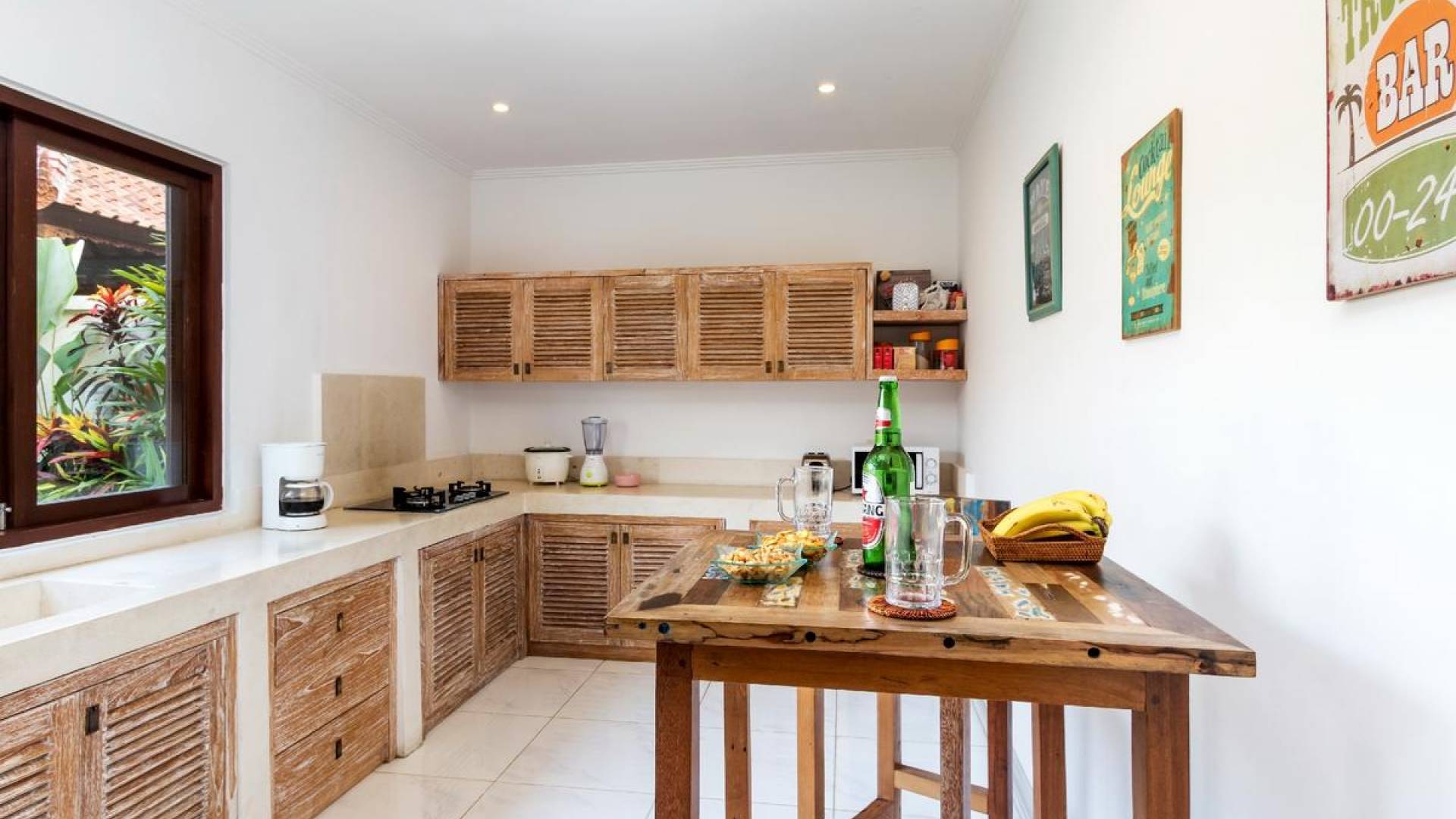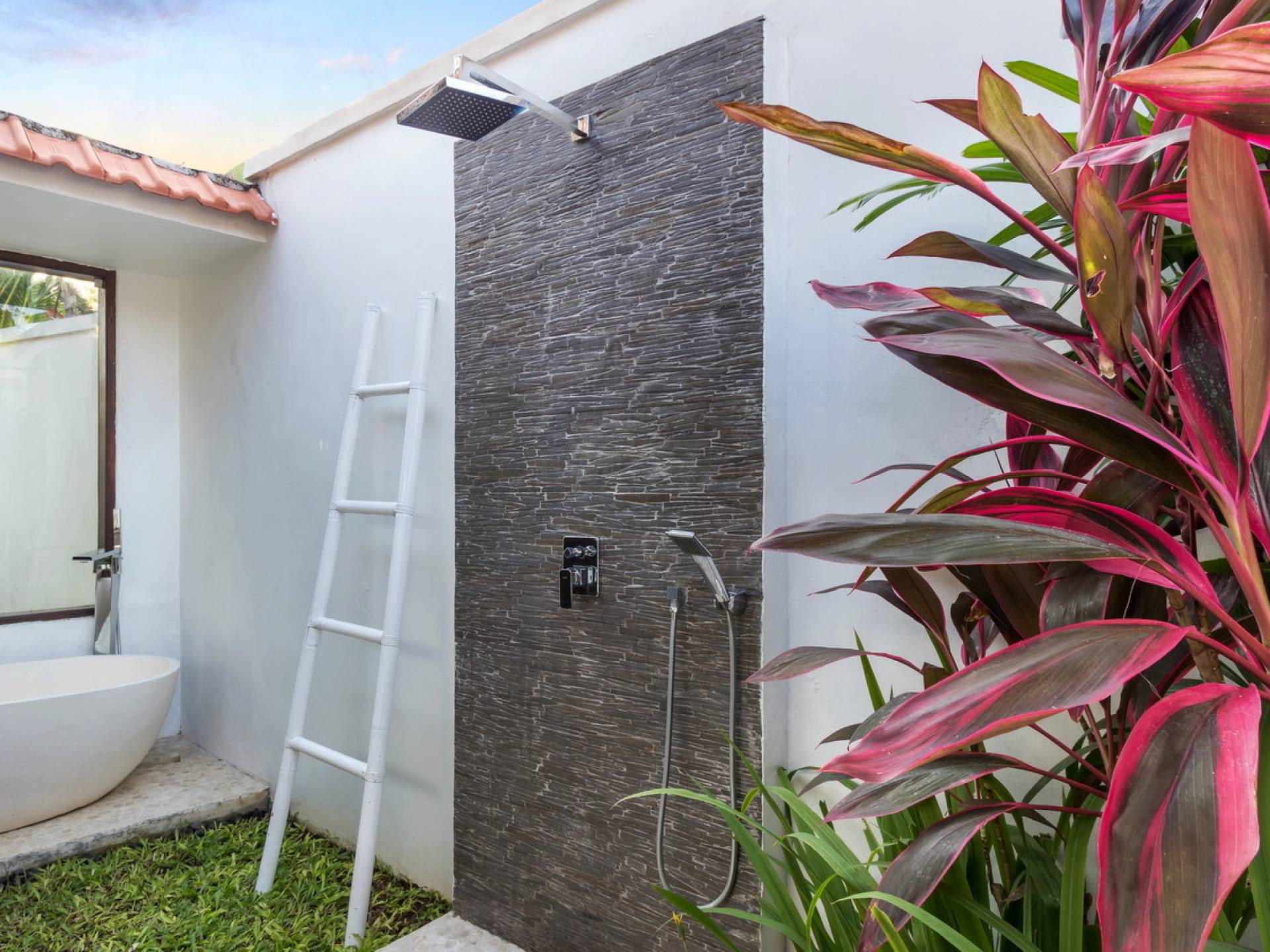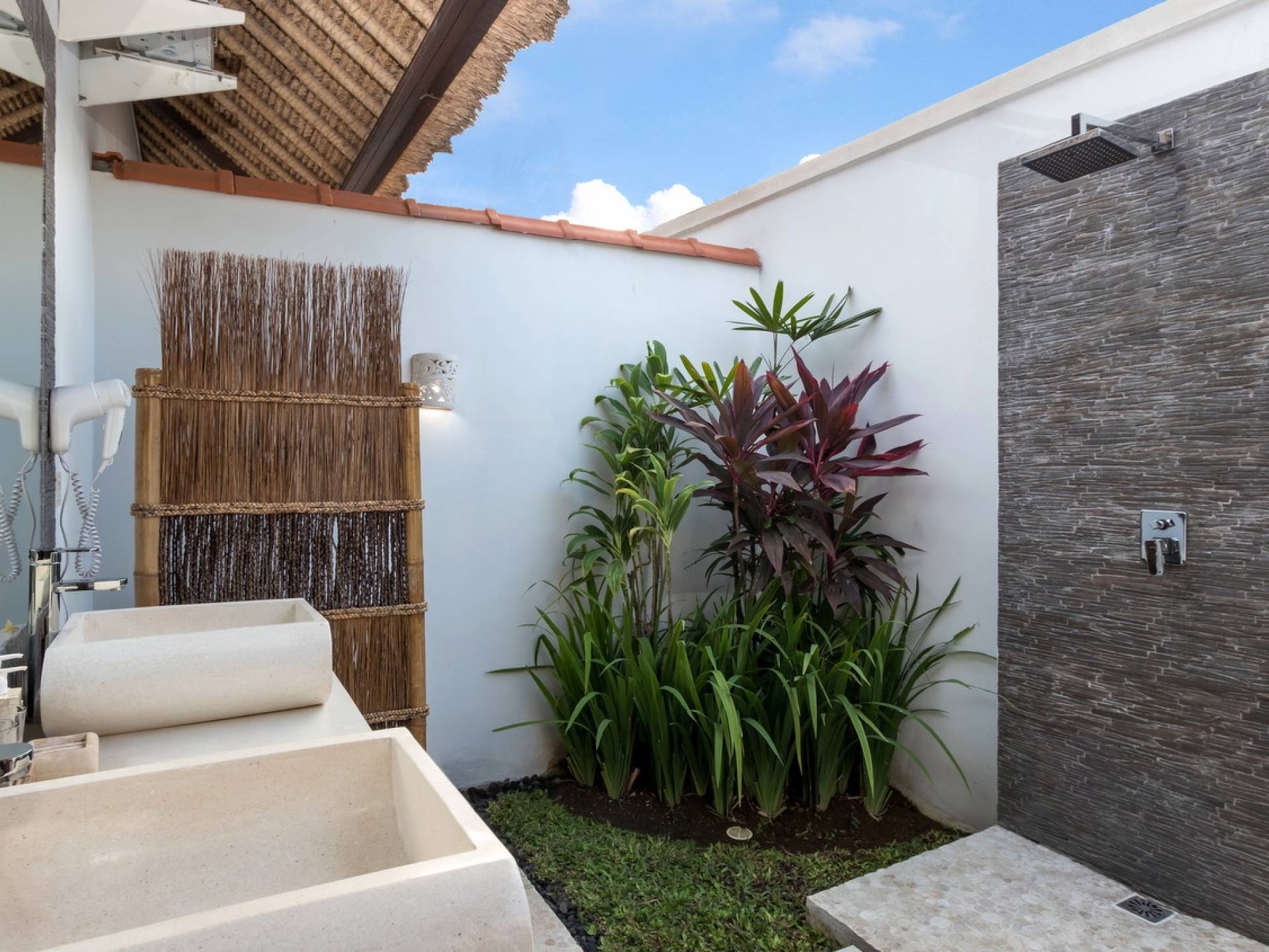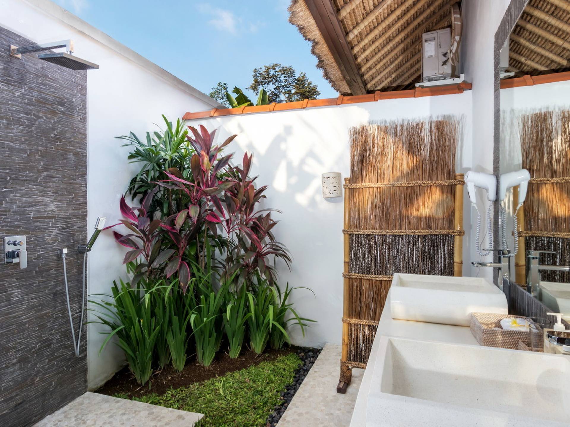Eine kunstvoll geschnitzte Holztür führt in den üppigen tropischen Garten der Villa Candi Kecil Empat. Eine Oase der Weite und Ruhe, in der Koi-Teiche, Springbrunnen und ein einladend glitzernder Swimmingpool mit flachem Planschbecken für die Kinder warten. Auf dem steinernen Sonnendeck wurden bequeme Liegestühle zum Entspannen im Schatten eines großen weißen Sonnenschirms oder zum Sonnenbaden aufgestellt, um an der wunderschönen tropischen Inselbräune zu arbeiten, die Sie mit nach Hause nehmen können. Kinder können sicher auf dem gepflegten Rasen des Gartens spielen, während die Eltern im strohgedeckten Pavillon eine traditionelle balinesische Massage genießen. An einem Ende des Pools, in der Nähe des Statuenbrunnens, der eine wunderbar friedliche Atmosphäre schafft, steht ein Esstisch im Freien, an dem die Gäste ihr Frühstück, Nachmittagscocktails oder Candlelight-Dinner unter den Sternen genießen können.