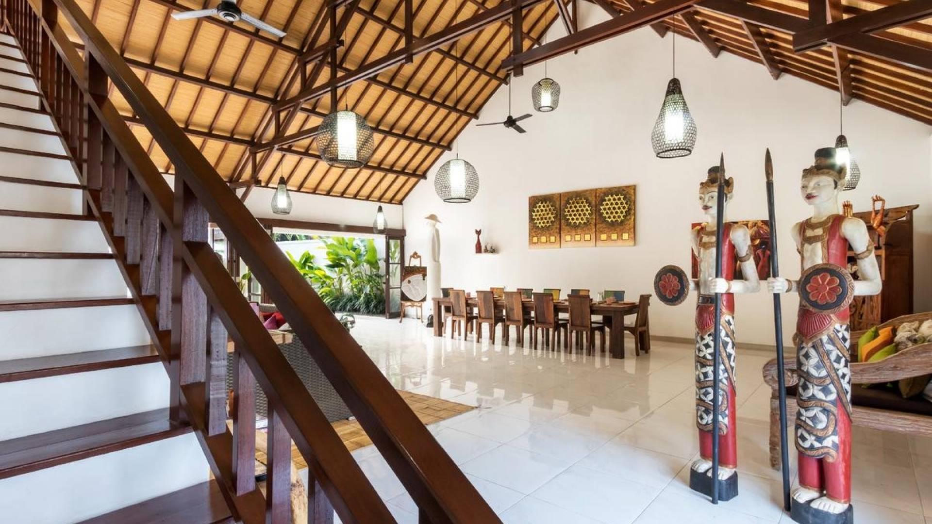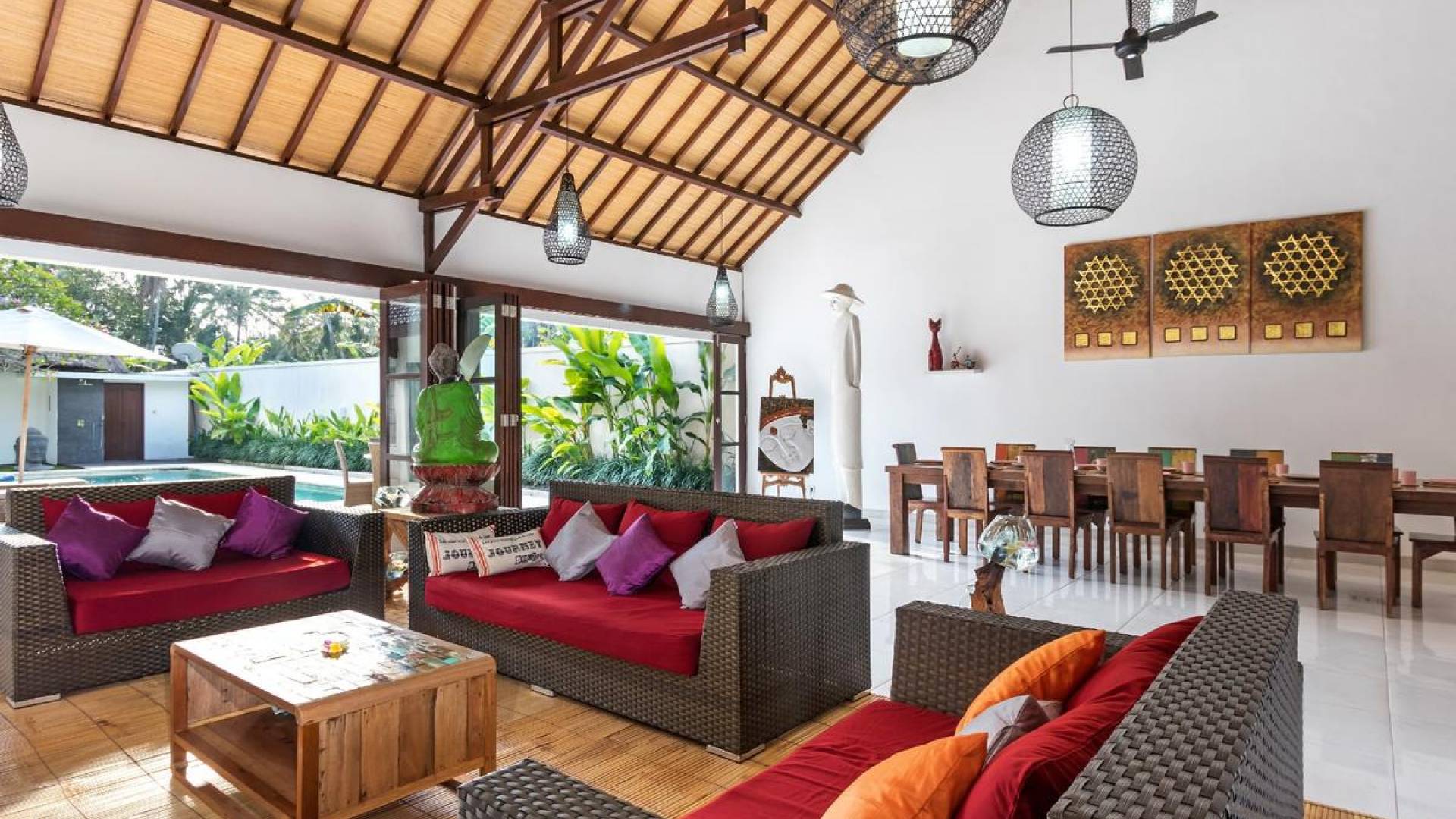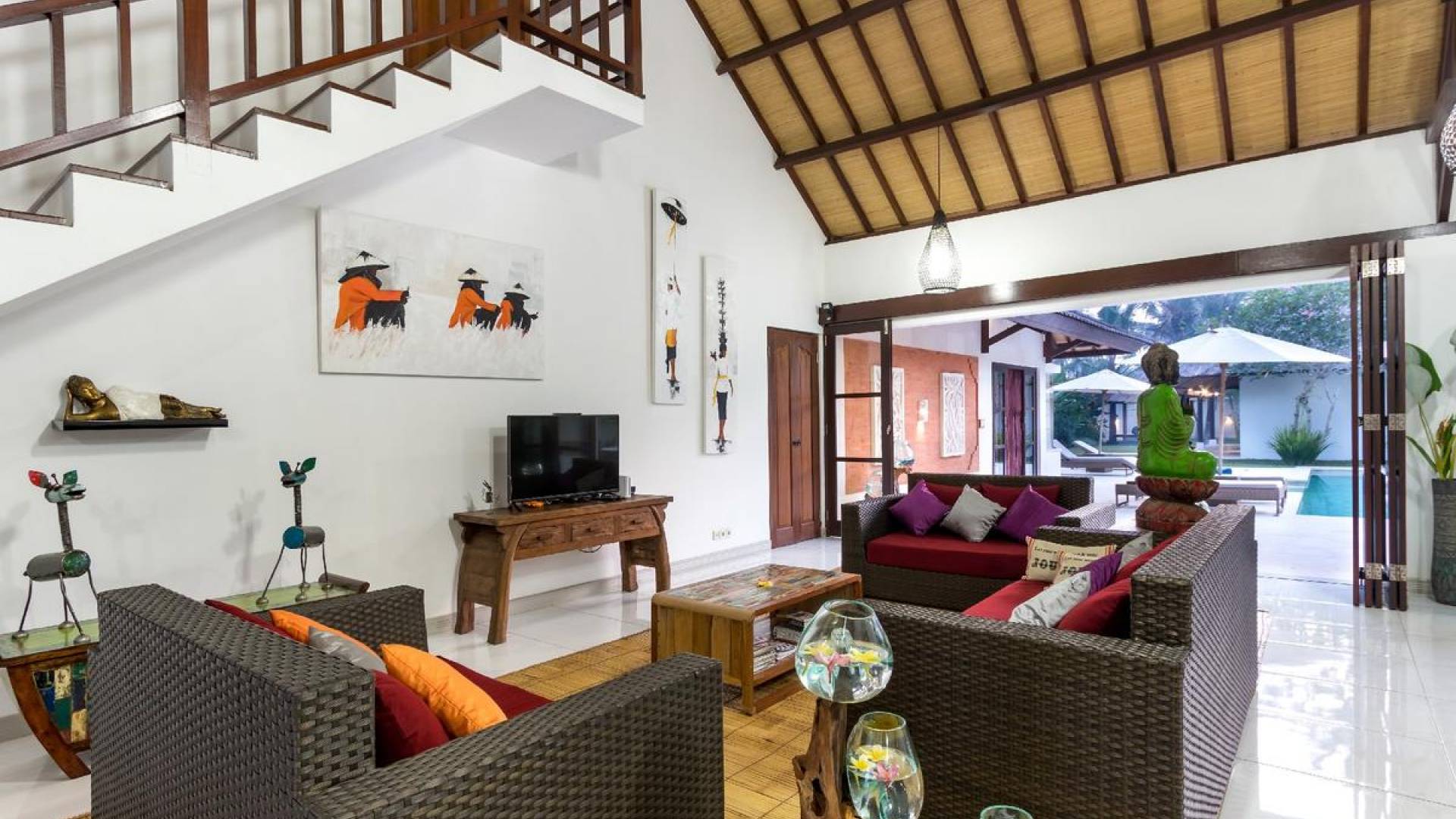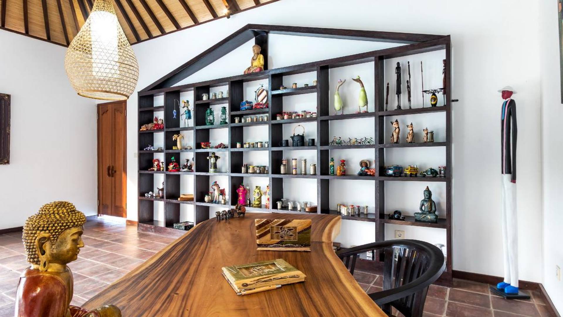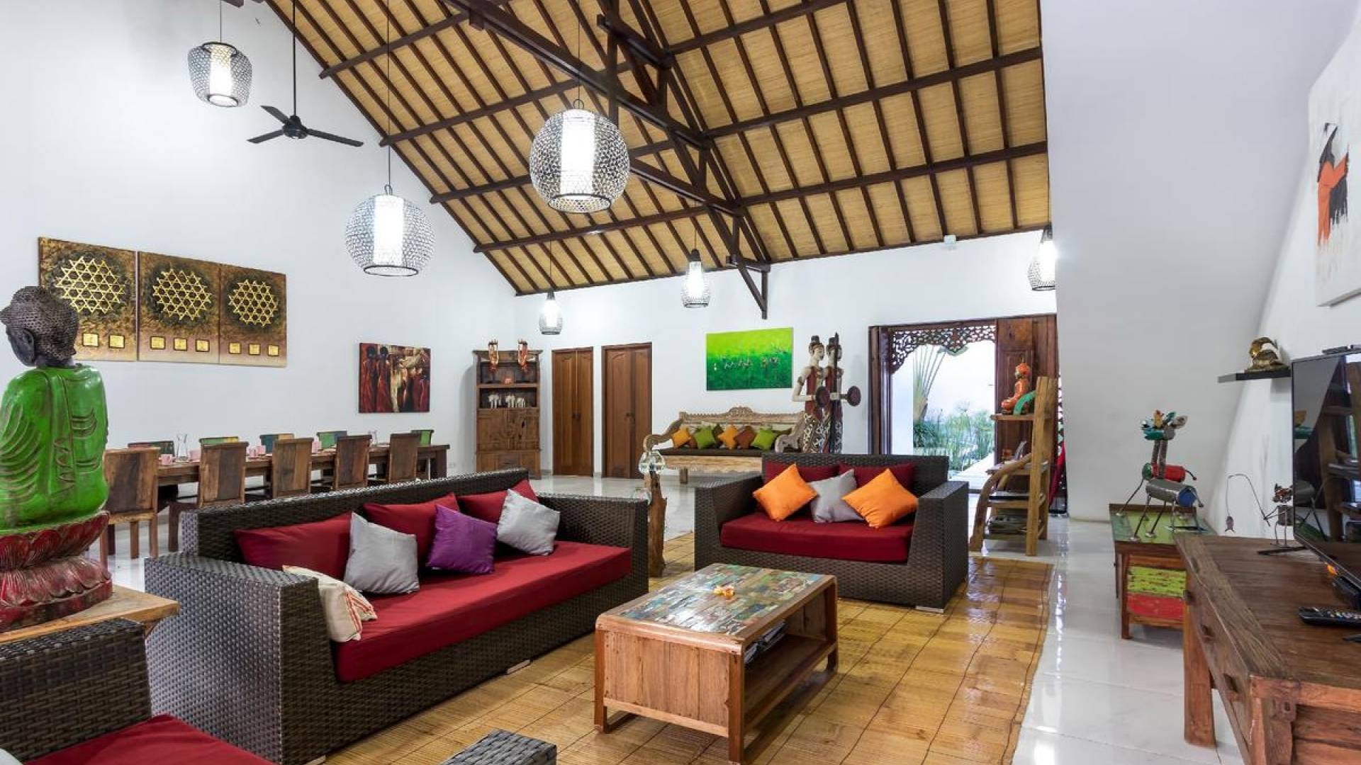 Der Wohnpavillon verfügt über ein traditionelles, hoch aufragendes Dach, das ein großartiges Gefühl von Offenheit und Raum vermittelt und gleichzeitig natürliches Licht durch die raumhohen Glastüren lässt, die sich zum Garten öffnen lassen, um ein tropisches offenes Wohnen zu schaffen Zimmer. Das Wohnzimmer verfügt über ein elegantes natürliches Innendesign, das von Teakholz, Rattan, Bambus und einer geschmackvollen Sammlung primitiver Kunstwerke und Skulpturen beherrscht wird. Der lange Esstisch aus Teakholz, gefertigt aus recyceltem Holz, das von den traditionellen balinesischen Fischerbooten stammt, ist ein großartiger Ort für Familien, um eine schöne Zeit miteinander zu verbringen, zu essen und am Abend vielleicht ein paar Karten zu spielen. Die TV-Lounge bietet bequeme Rattansofas, Bambusteppiche und farbenfrohe Bodenkissen, ideal für einen gemütlichen Filmabend in der Villa.