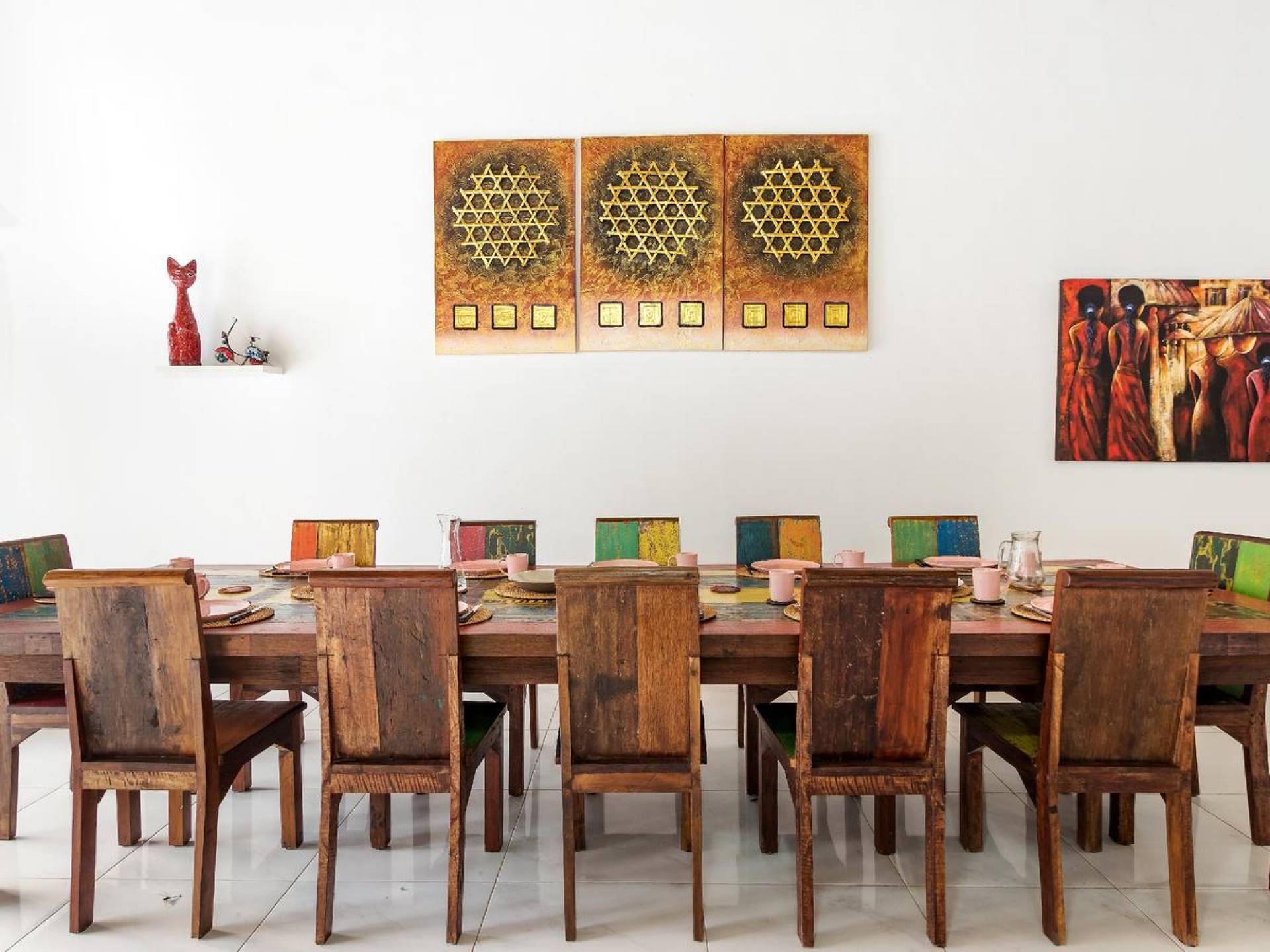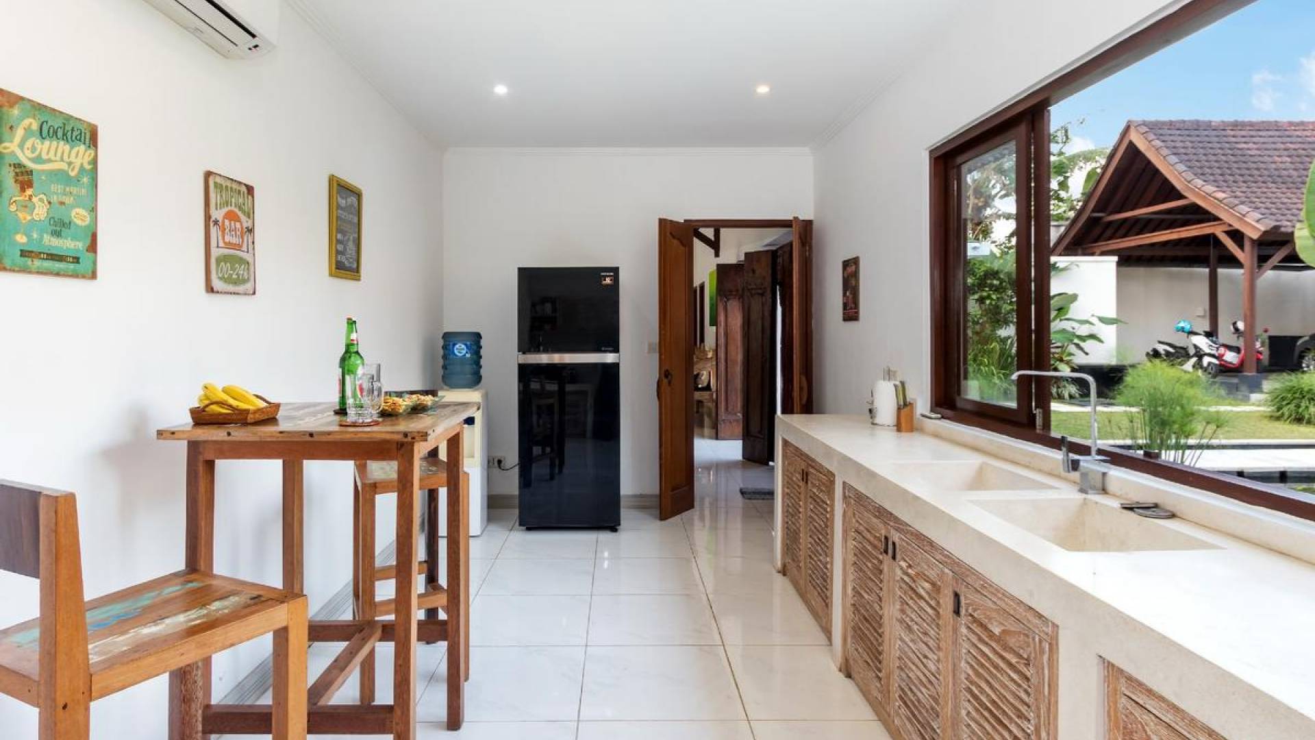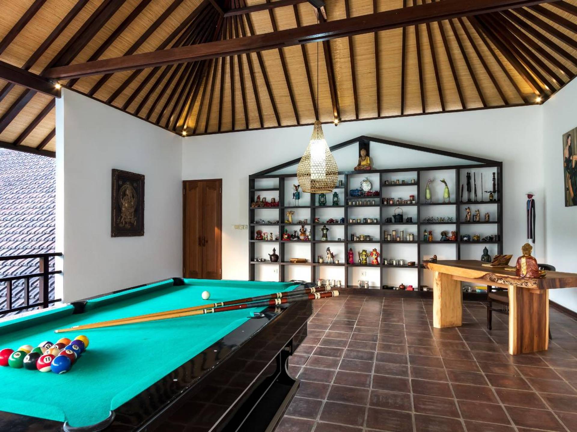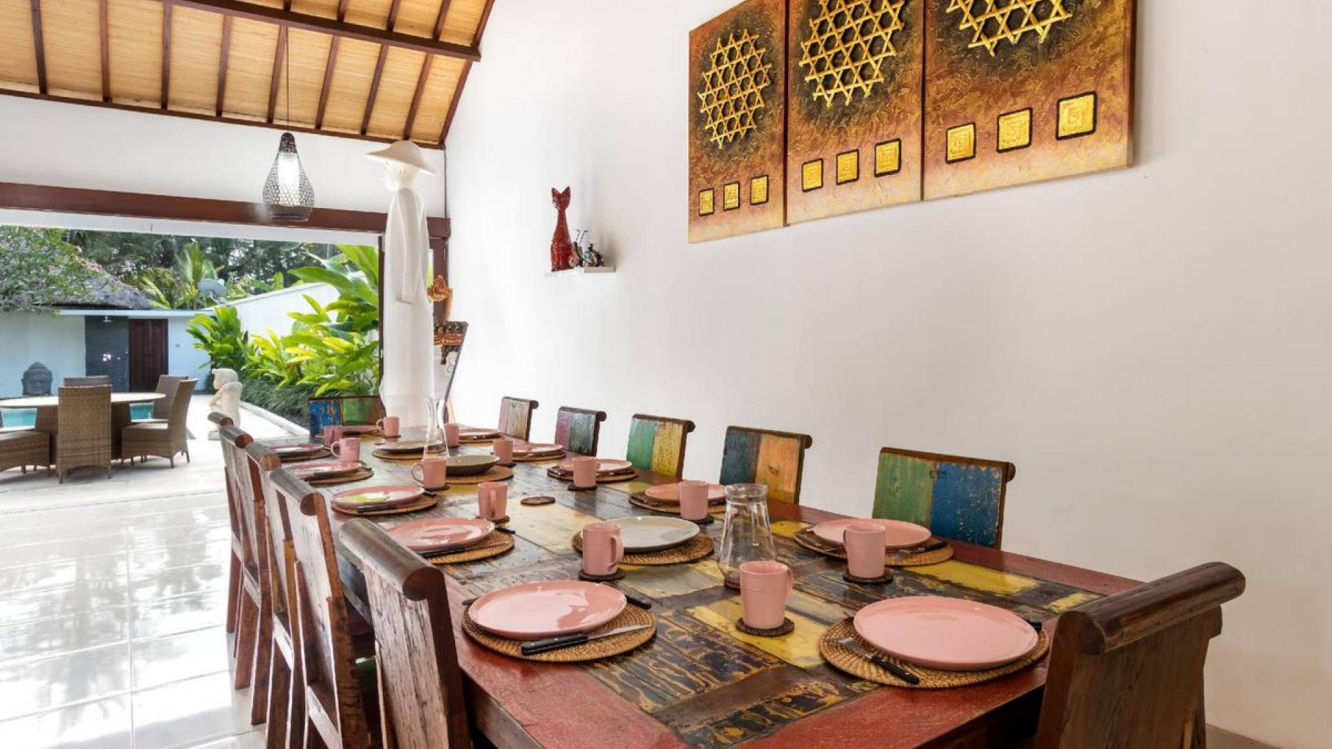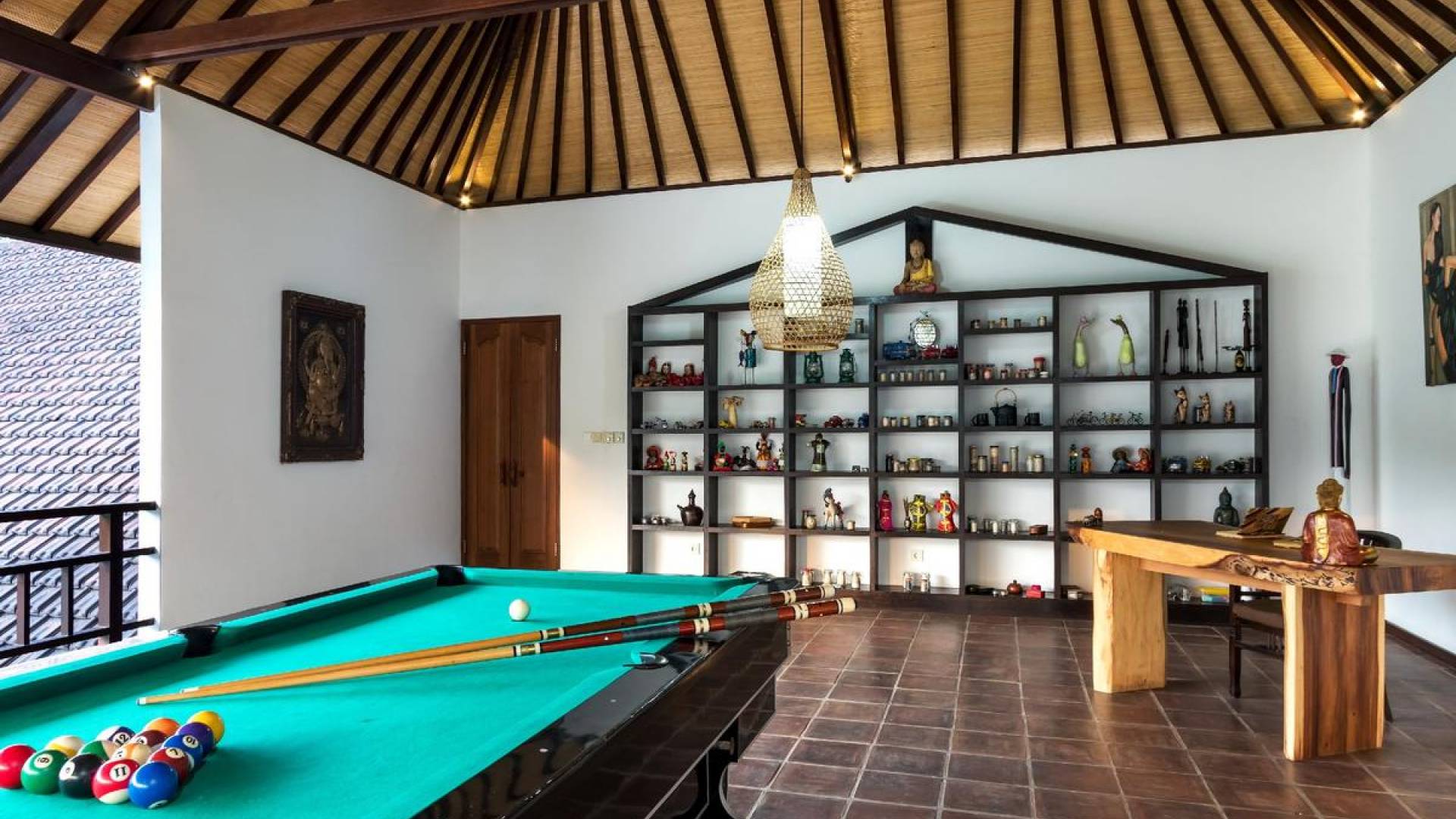 Der Wohnpavillon verfügt über ein traditionelles, hoch aufragendes Dach, das ein großartiges Gefühl von Offenheit und Raum vermittelt und gleichzeitig natürliches Licht durch die raumhohen Glastüren lässt, die sich zum Garten öffnen lassen, um ein tropisches offenes Wohnen zu schaffen Zimmer. Das Wohnzimmer verfügt über ein elegantes natürliches Innendesign, das von Teakholz, Rattan, Bambus und einer geschmackvollen Sammlung primitiver Kunstwerke und Skulpturen beherrscht wird. Der lange Esstisch aus Teakholz, gefertigt aus recyceltem Holz, das von den traditionellen balinesischen Fischerbooten stammt, ist ein großartiger Ort für Familien, um eine schöne Zeit miteinander zu verbringen, zu essen und am Abend vielleicht ein paar Karten zu spielen. Die TV-Lounge bietet bequeme Rattansofas, Bambusteppiche und farbenfrohe Bodenkissen, ideal für einen gemütlichen Filmabend in der Villa.
