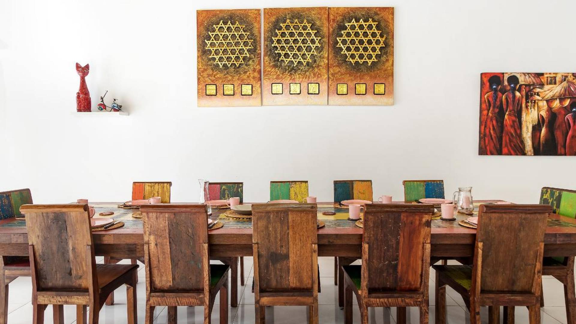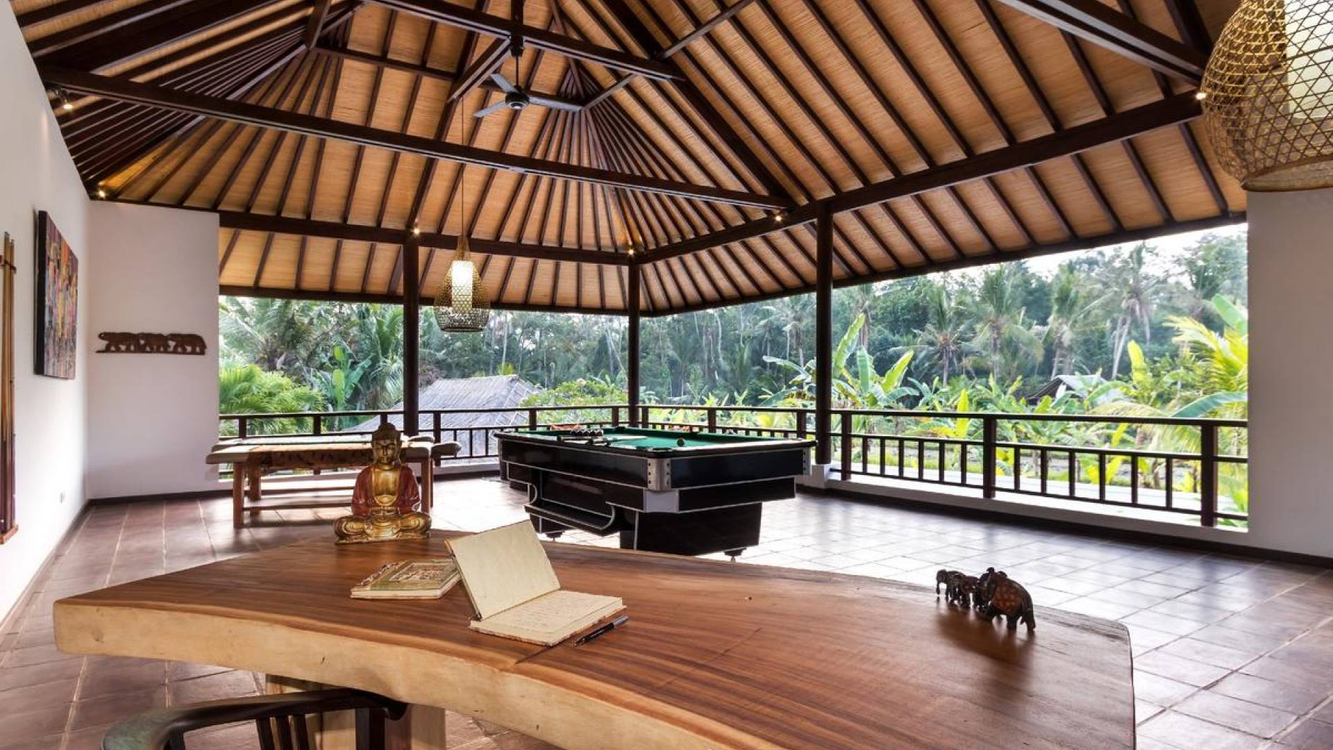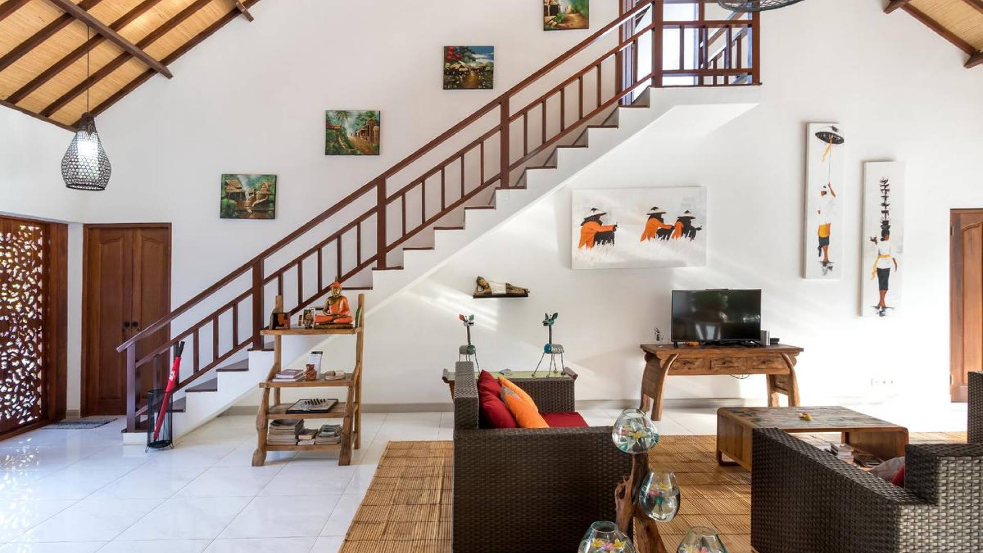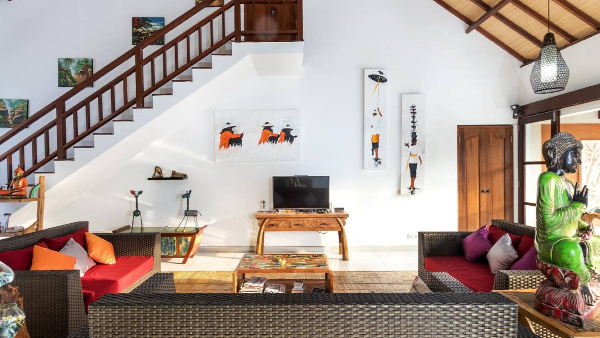 Wenn Sie der offenen Treppe vom Wohnzimmer folgen, gelangen Sie in den zweiten Stock, wo die Gäste einen großen, offenen Wohnbereich finden, der sich perfekt für Yoga, Meditation und Familienfeiern eignet. Der Blick über die tropische Landschaft rund um das Anwesen ist atemberaubend und der Raum ist mit einem wunderschönen handgewebten Teppich und vielen Sitzsäcken ausgestattet, die leicht für eine Yoga-Praxis zur Seite gelegt werden können.