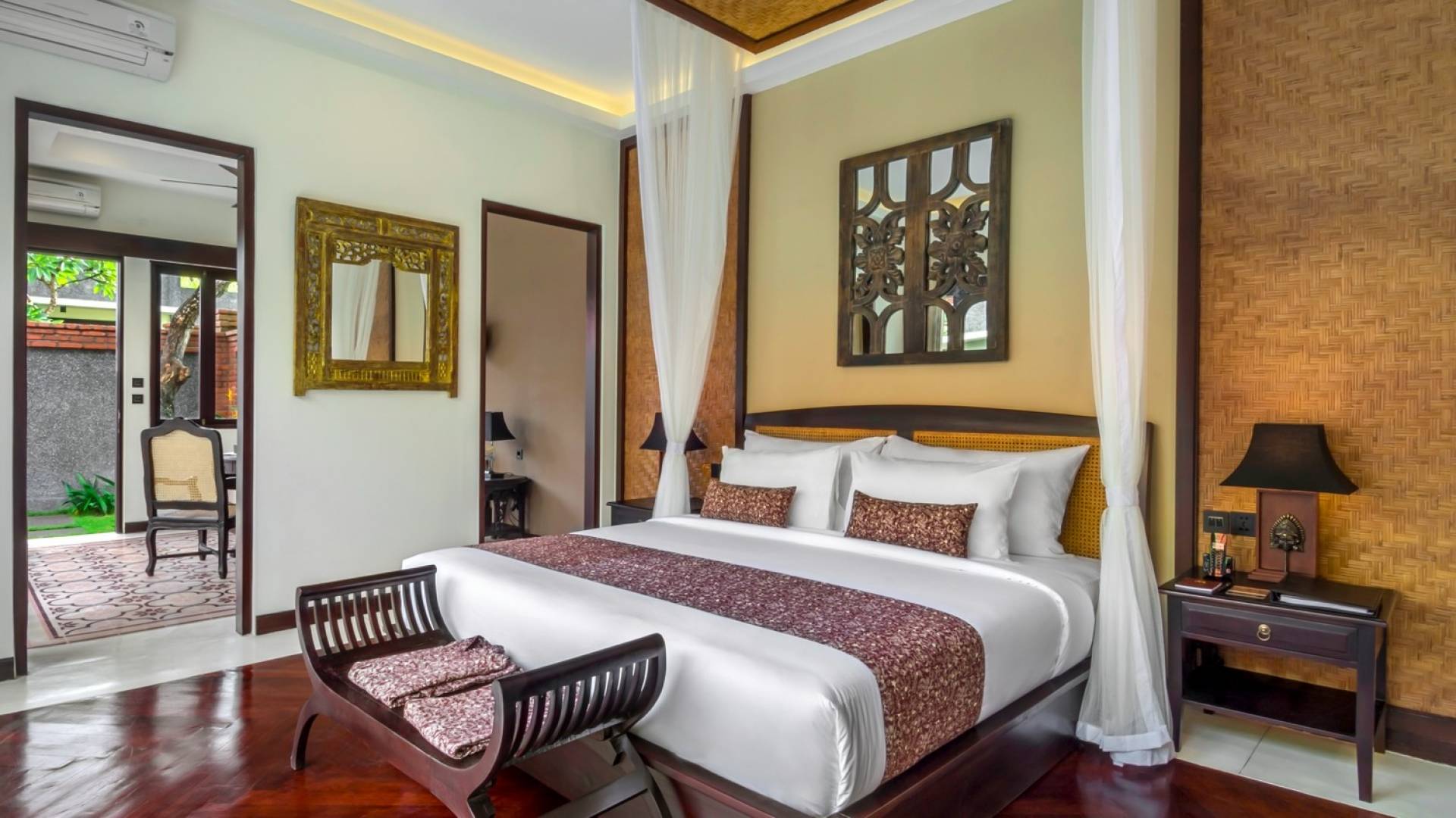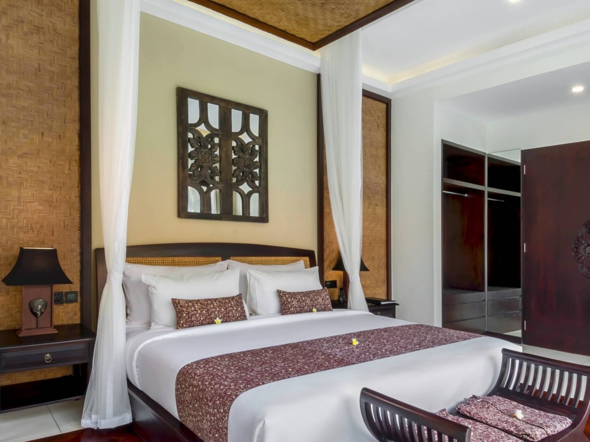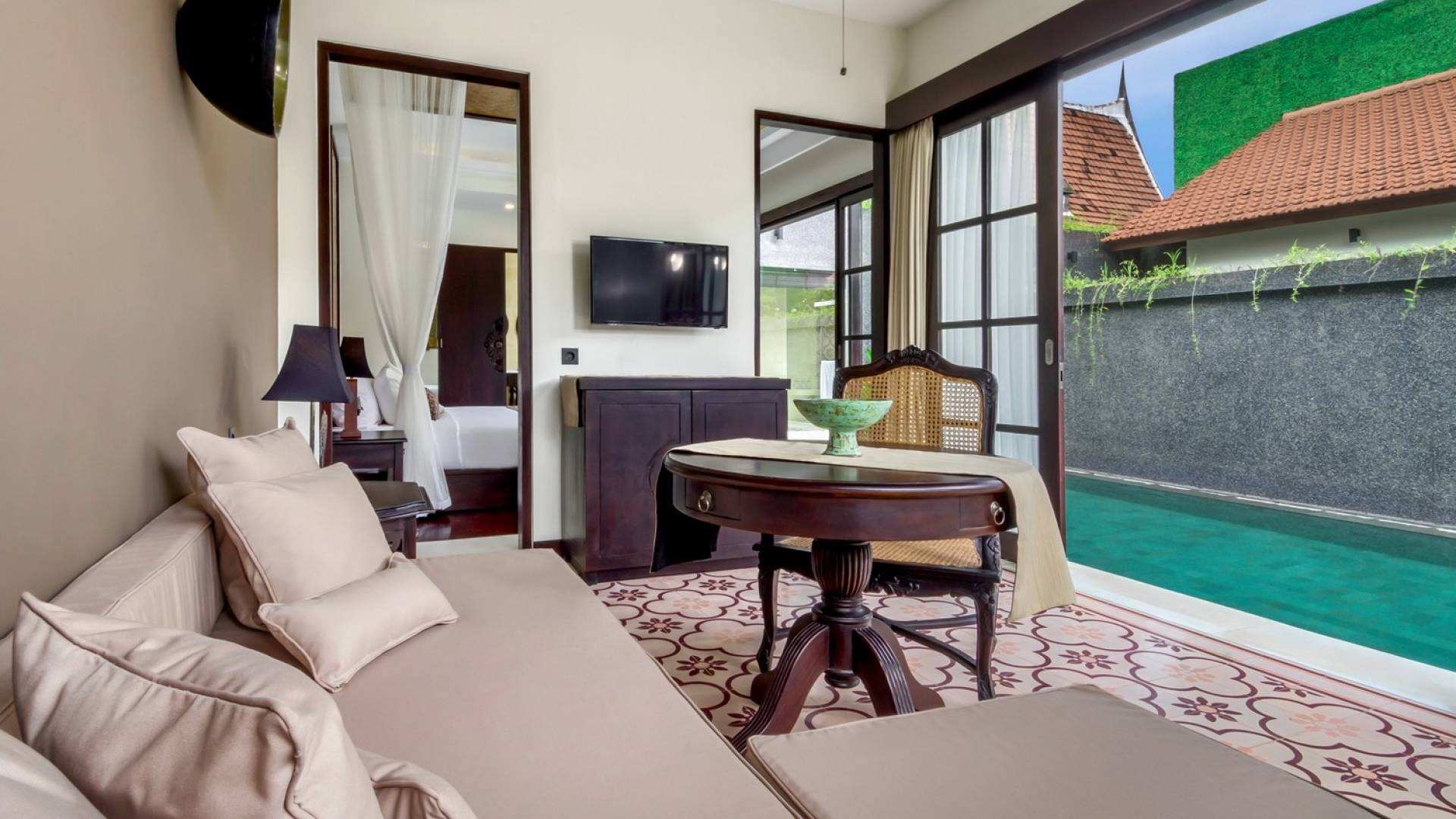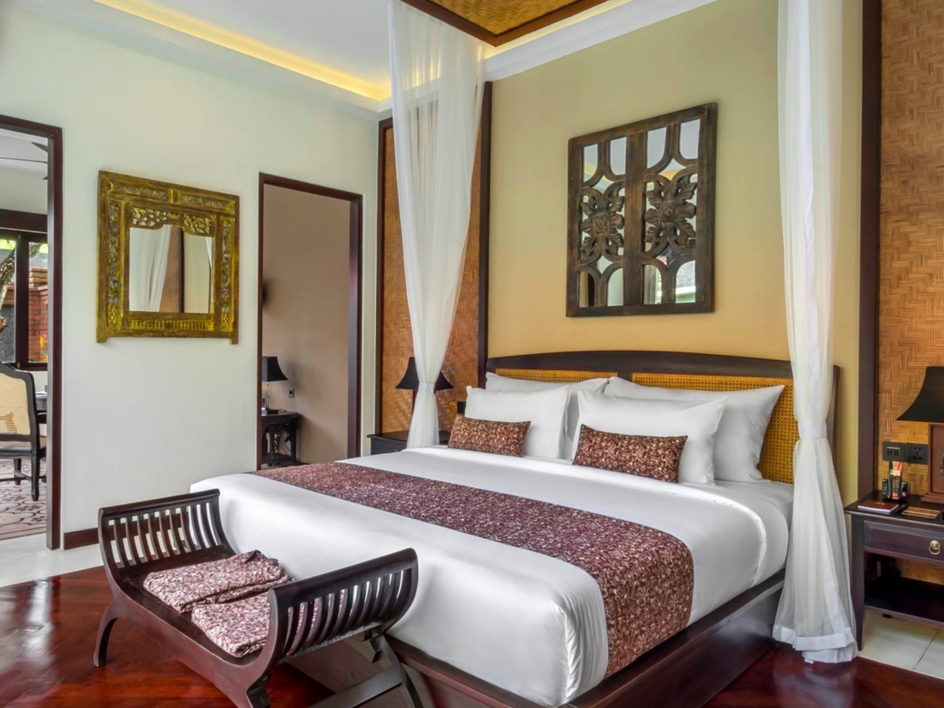 Villa Angsoka verfügt über einen weitläufigen tropischen Garten mit privatem Pool, ein Wohnzimmer mit Klimaanlage, ein bequemes Schlafzimmer mit Kingsize-Bett und ein opulentes Bad. Alle Zimmer verfügen über Glastüren, die sich zum Pool des Gartens öffnen. Der Raum ist von natürlichem Sonnenlicht durchflutet und verfügt über ein elegantes Innendesign, das von handbemalten Bodenfliesen, dunklen Hölzern und einigen geschmackvollen Artefakten beherrscht wird. Während die Klimaanlage eingeschaltet ist, ist das Wohnzimmer der Villa Angsoka eine großartige Flucht vor der tropischen Hitze draußen, während Sie immer noch den Blick auf den Garten und den Pool genießen können. Sie können es sich auf dem Sofa gemütlich machen, ein Buch lesen und fernsehen oder im bequemen Sessel sitzen und Kaffee trinken.