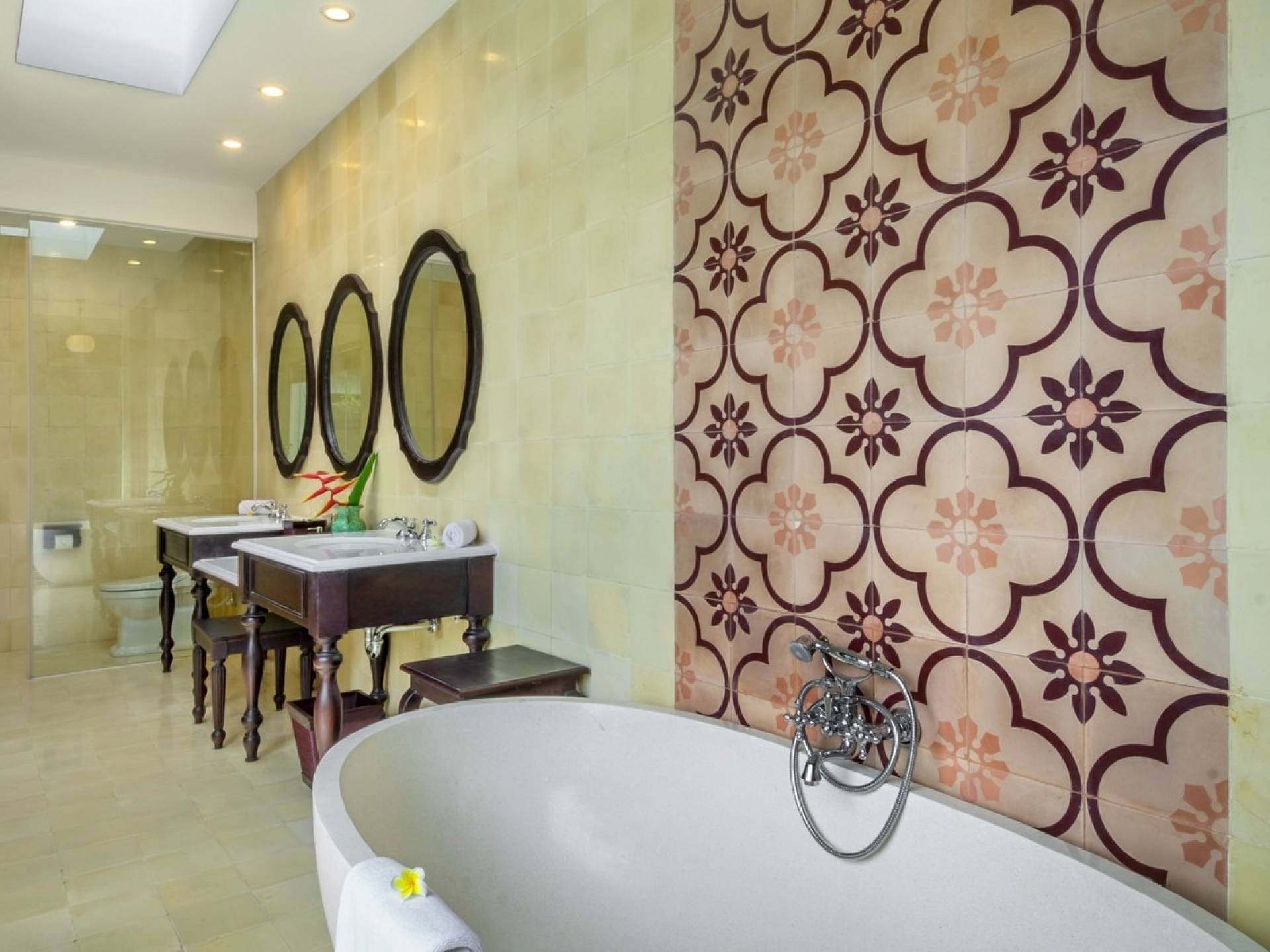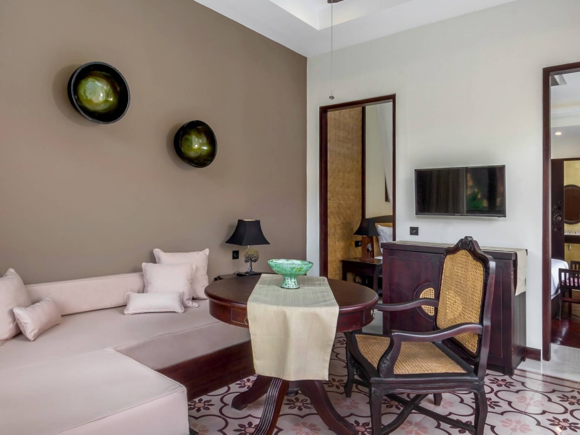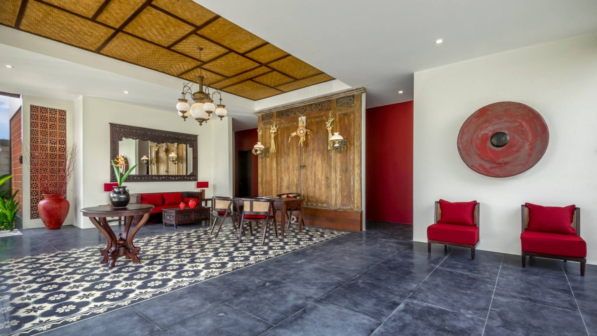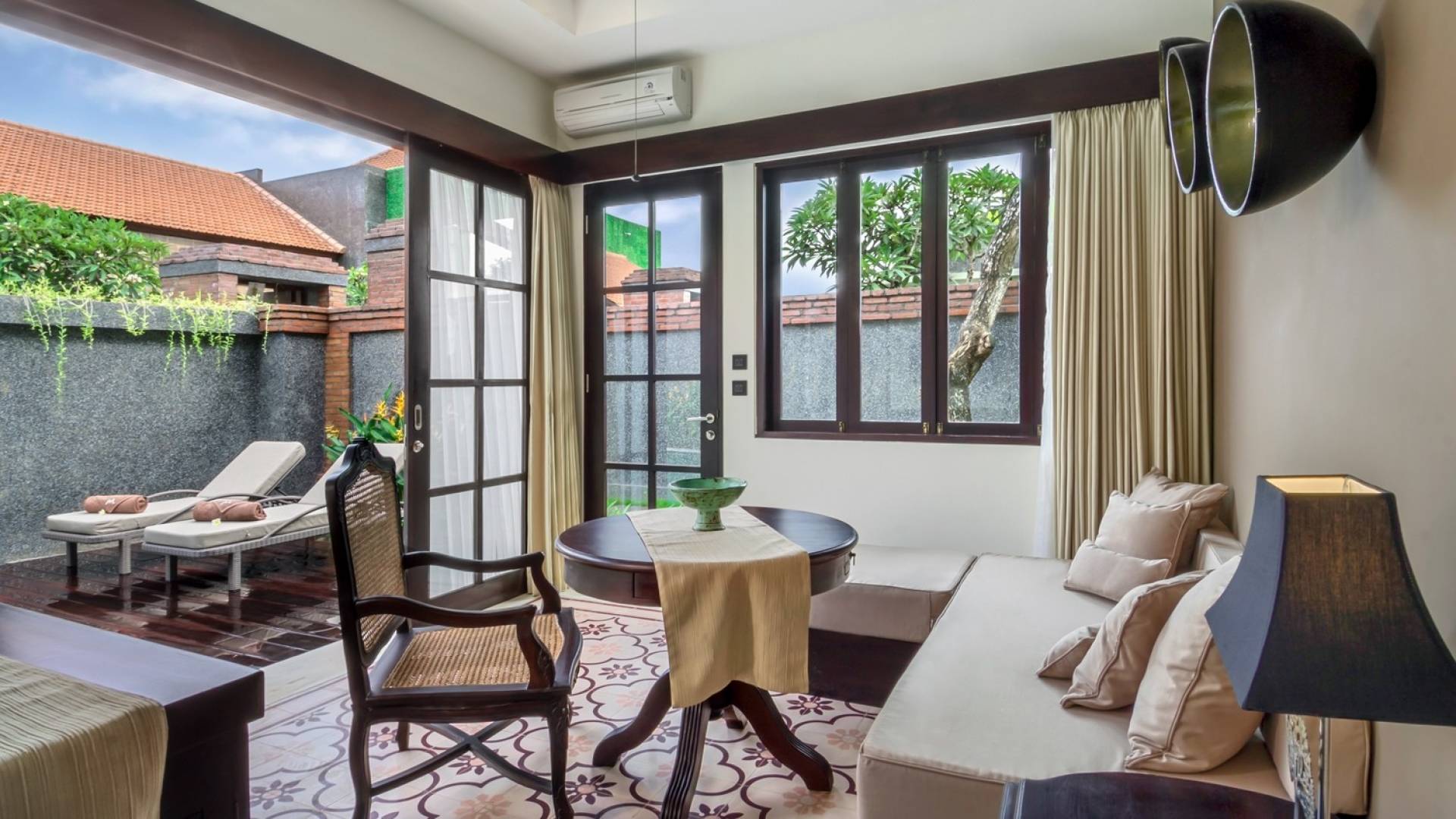 Villa Angsoka verfügt über einen weitläufigen tropischen Garten mit privatem Pool, ein Wohnzimmer mit Klimaanlage, ein bequemes Schlafzimmer mit Kingsize-Bett und ein opulentes Bad. Alle Zimmer verfügen über Glastüren, die sich zum Pool des Gartens öffnen. Der Raum ist von natürlichem Sonnenlicht durchflutet und verfügt über ein elegantes Innendesign, das von handbemalten Bodenfliesen, dunklen Hölzern und einigen geschmackvollen Artefakten beherrscht wird. Während die Klimaanlage eingeschaltet ist, ist das Wohnzimmer der Villa Angsoka eine großartige Flucht vor der tropischen Hitze draußen, während Sie immer noch den Blick auf den Garten und den Pool genießen können. Sie können es sich auf dem Sofa gemütlich machen, ein Buch lesen und fernsehen oder im bequemen Sessel sitzen und Kaffee trinken.