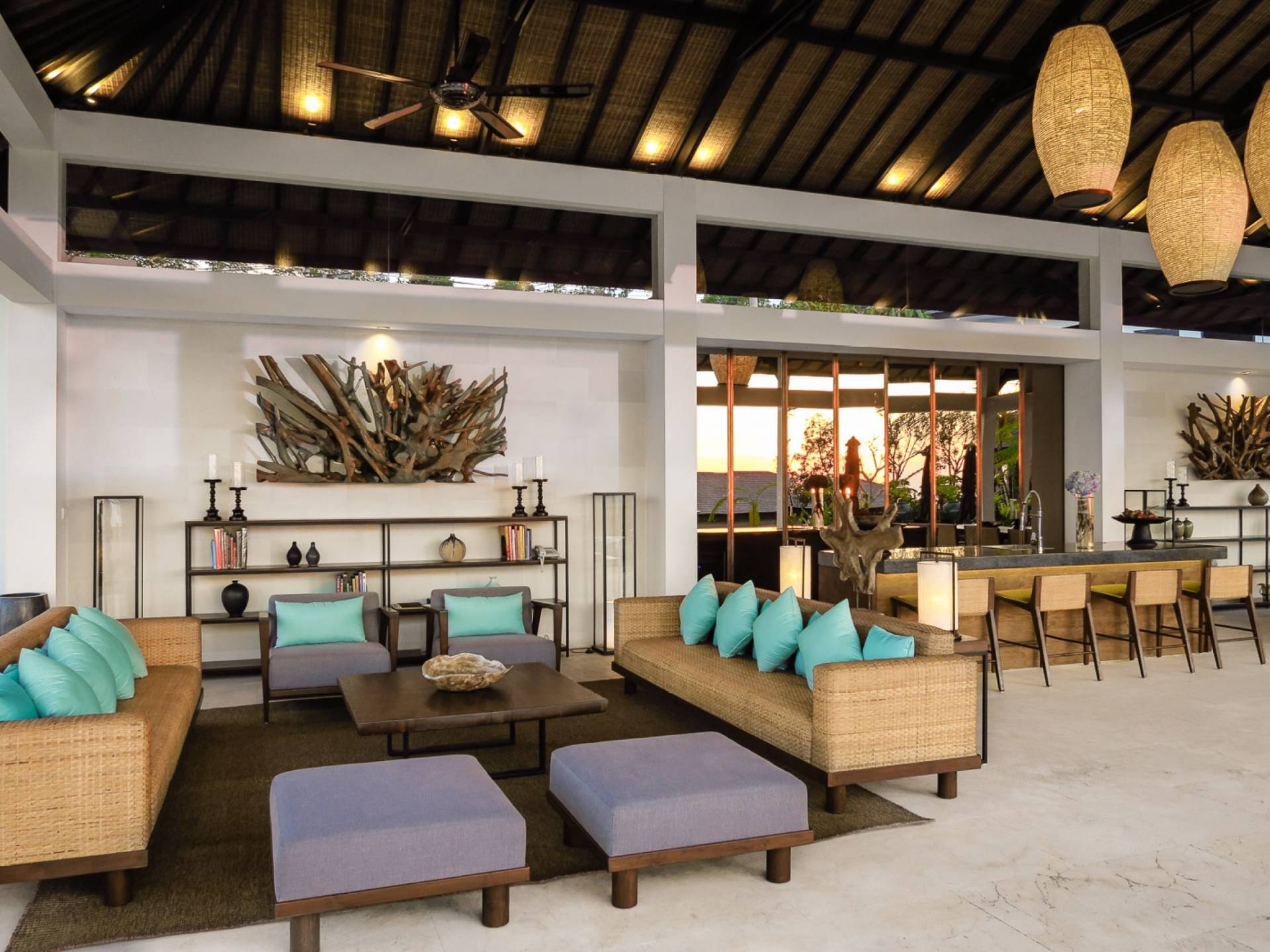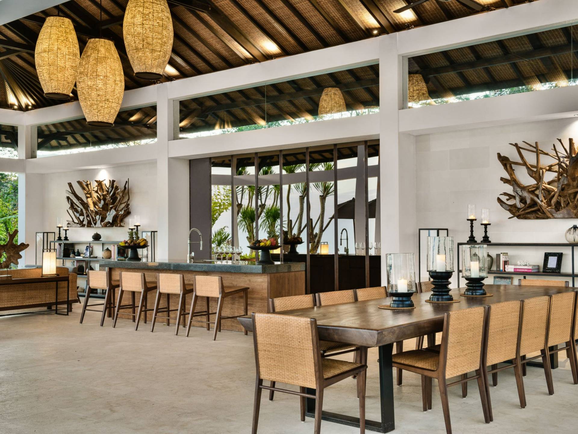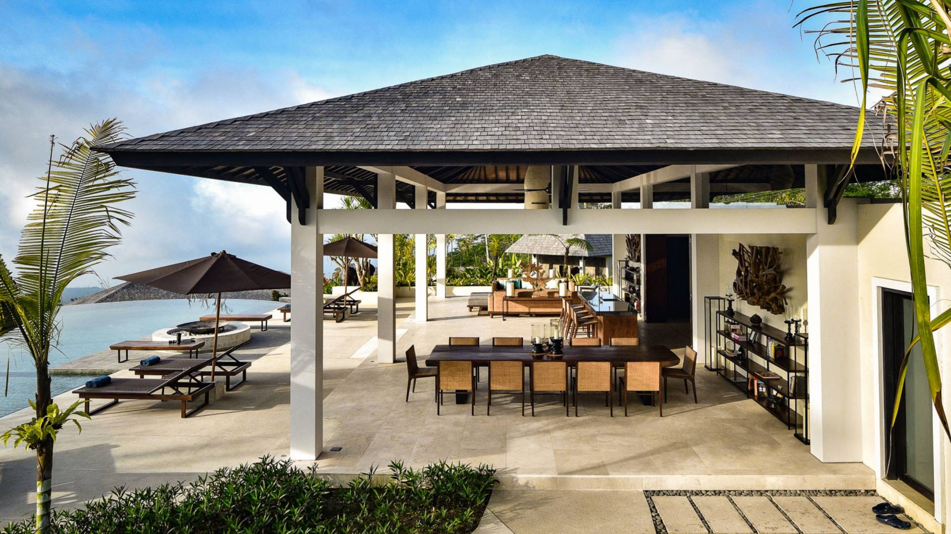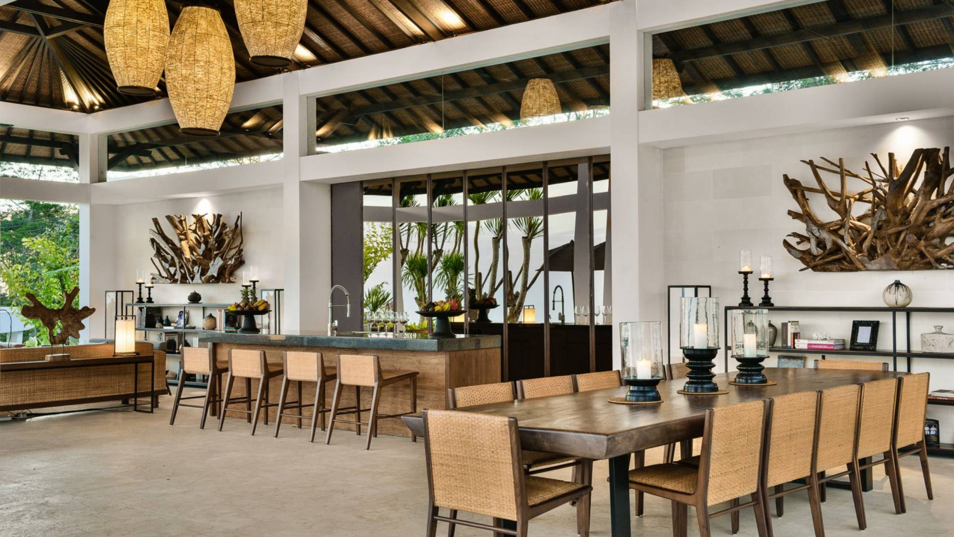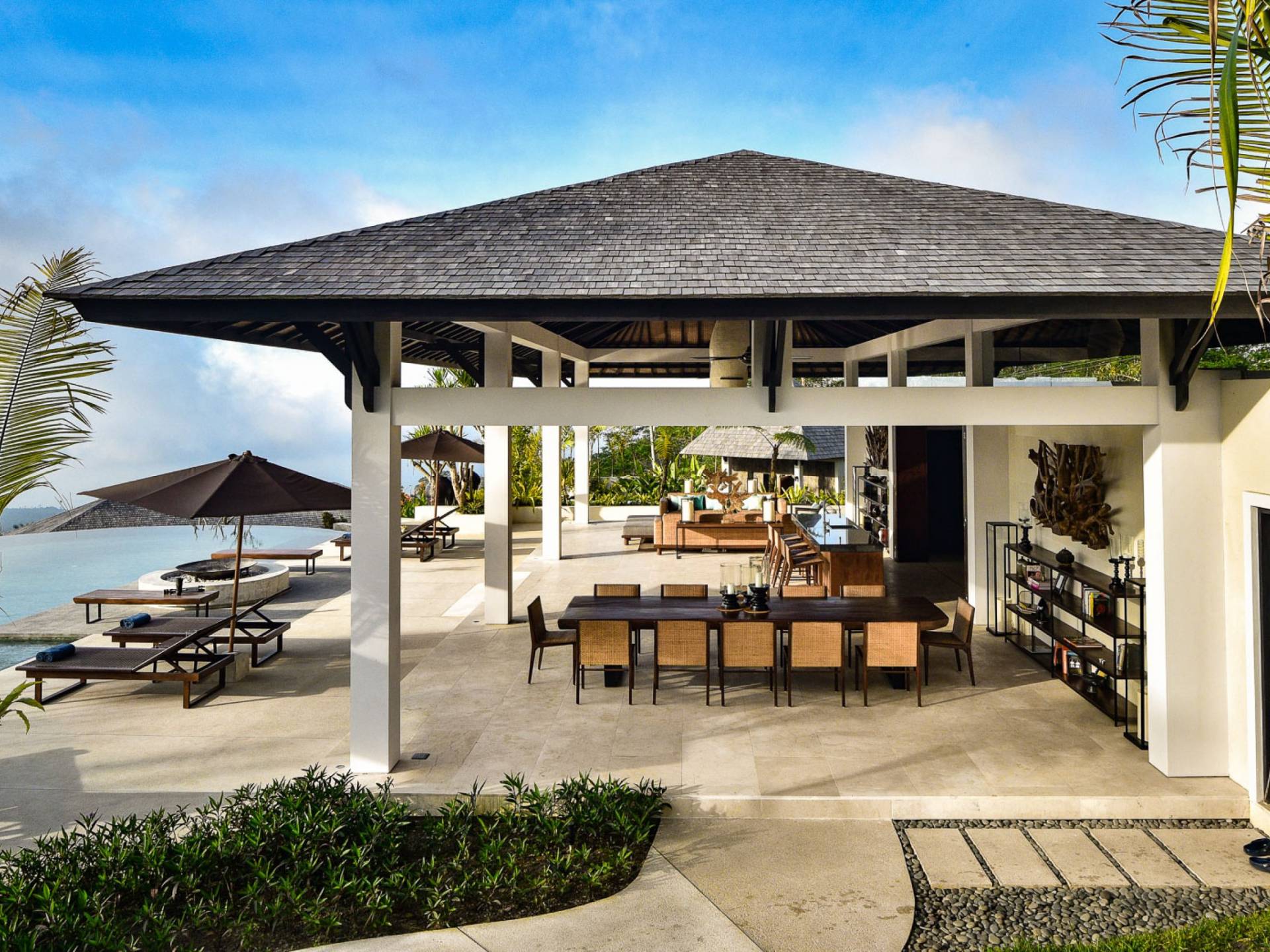 Der offene Wohnpavillon von 100 Quadratmetern ist von drei Seiten für kühle Brisen geöffnet und besteht aus einer luxuriösen Lounge, einem eleganten Esszimmer mit einem Esstisch aus Naturholzblock und einer langen Bar, hinter der sich eine voll ausgestattete Küche befindet. Der Wohnbereich bietet ein luxuriöses Ambiente mit Marmorböden, Palimanan-Wänden und allen maßgeschneiderten Designermöbeln und Lampen. Die überdimensionale zentrale Bartheke ist ein natürlicher, informeller Treffpunkt und eine Kneipe für die Gäste. Die achtflügelige Falttür, die den Wohnraum und die Küche im geschlossenen Zustand trennt, präsentiert eine Reihe von raumhohen Bronzespiegeln, in denen Bergblick und herrliche Sonnenuntergänge über das Pooldeck zurück in den Wohnraum reflektiert werden.