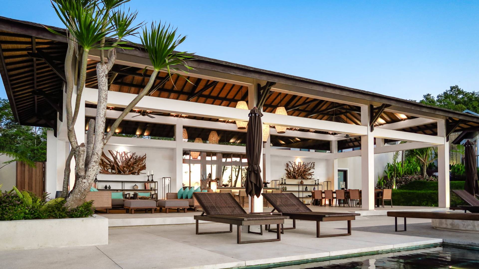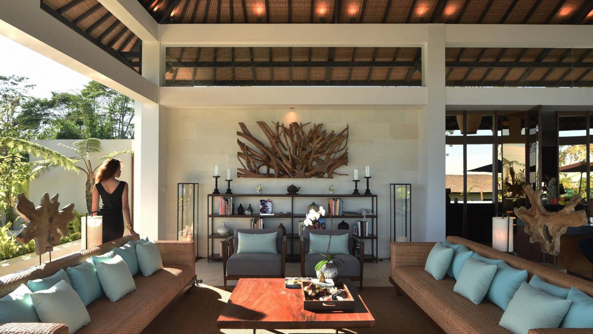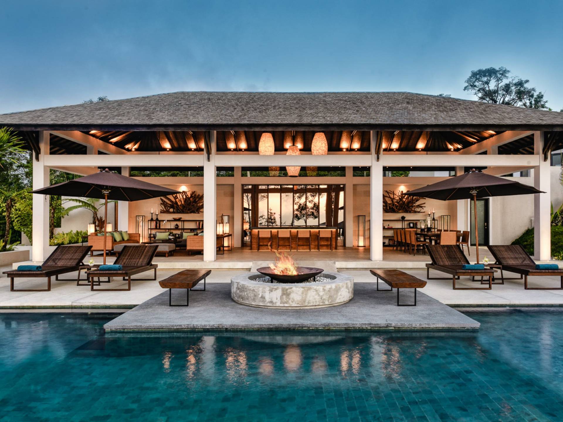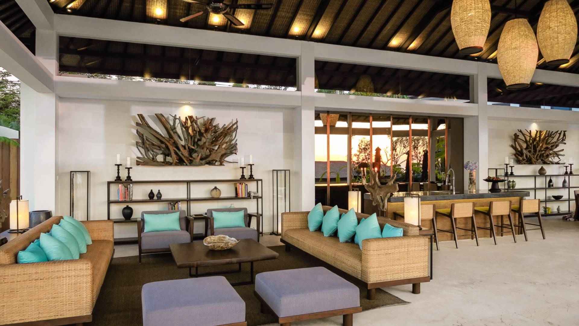 Der offene Wohnpavillon von 100 Quadratmetern ist von drei Seiten für kühle Brisen geöffnet und besteht aus einer luxuriösen Lounge, einem eleganten Esszimmer mit einem Esstisch aus Naturholzblock und einer langen Bar, hinter der sich eine voll ausgestattete Küche befindet. Der Wohnbereich bietet ein luxuriöses Ambiente mit Marmorböden, Palimanan-Wänden und allen maßgeschneiderten Designermöbeln und Lampen. Die überdimensionale zentrale Bartheke ist ein natürlicher, informeller Treffpunkt und eine Kneipe für die Gäste. Die achtflügelige Falttür, die den Wohnraum und die Küche im geschlossenen Zustand trennt, präsentiert eine Reihe von raumhohen Bronzespiegeln, in denen Bergblick und herrliche Sonnenuntergänge über das Pooldeck zurück in den Wohnraum reflektiert werden.